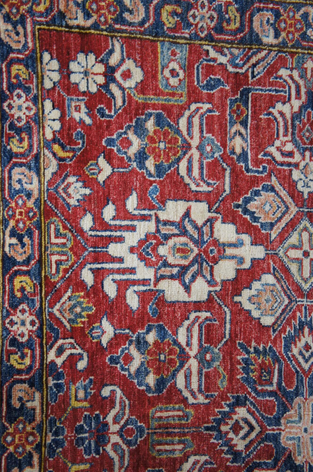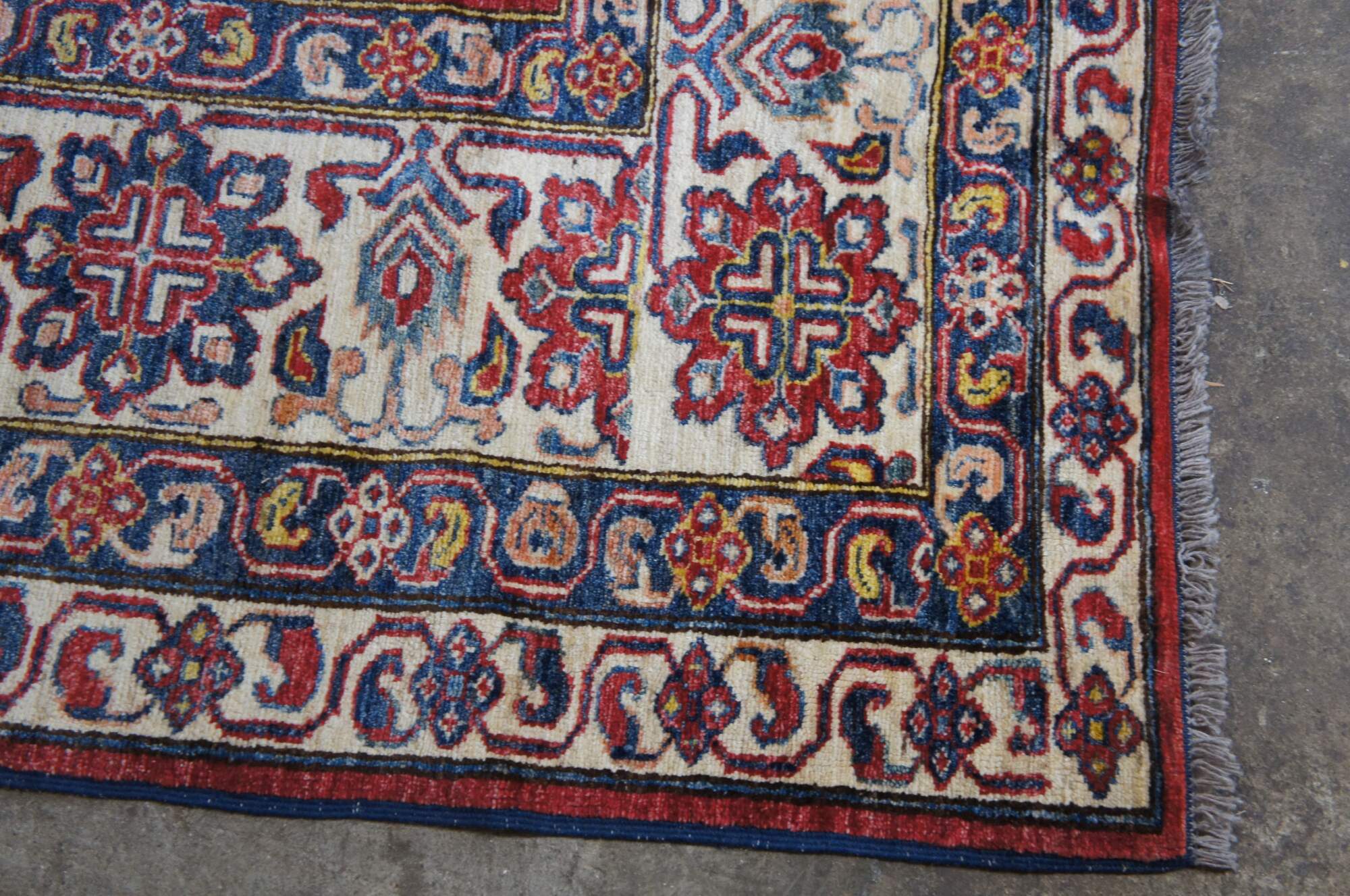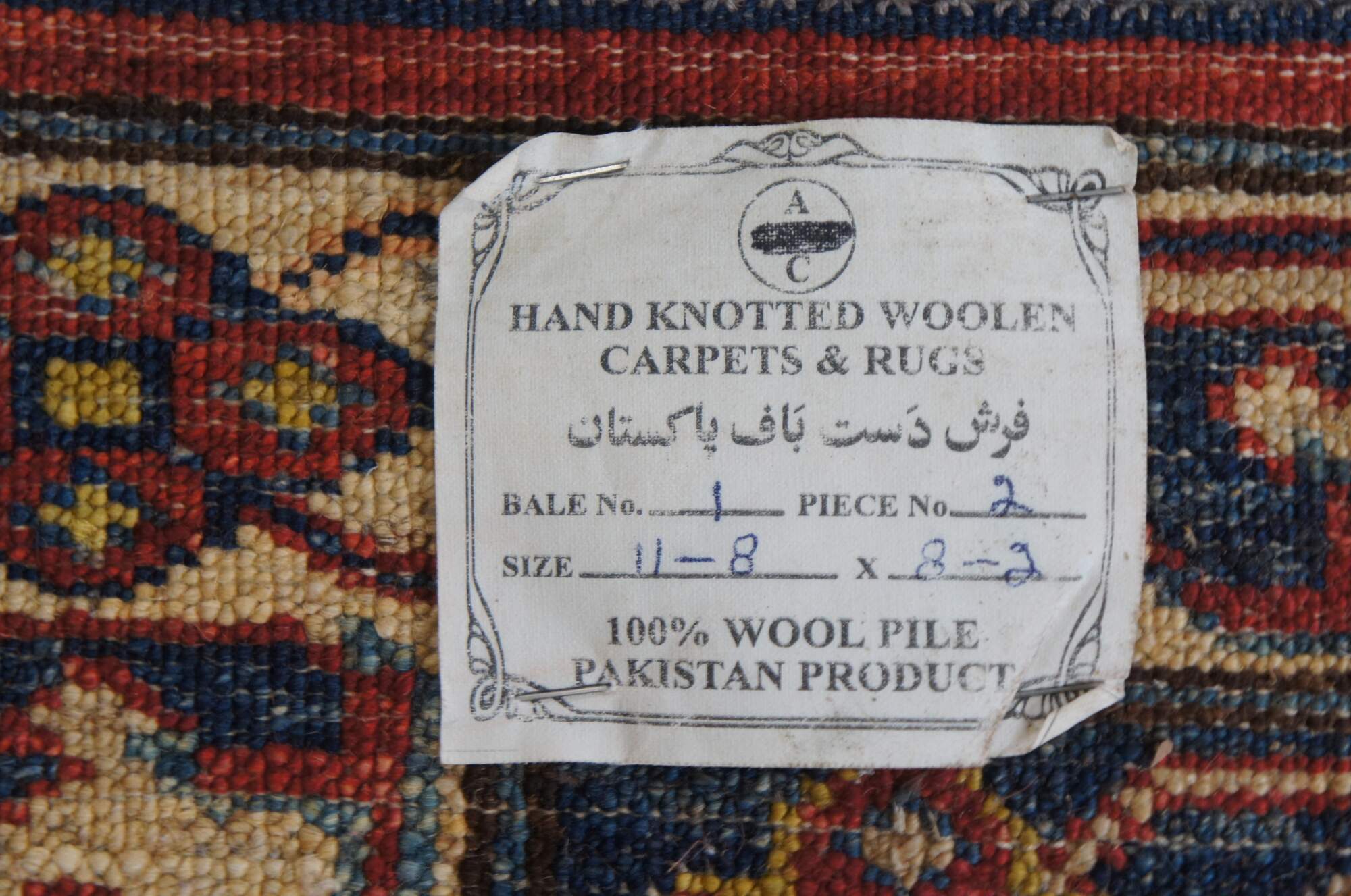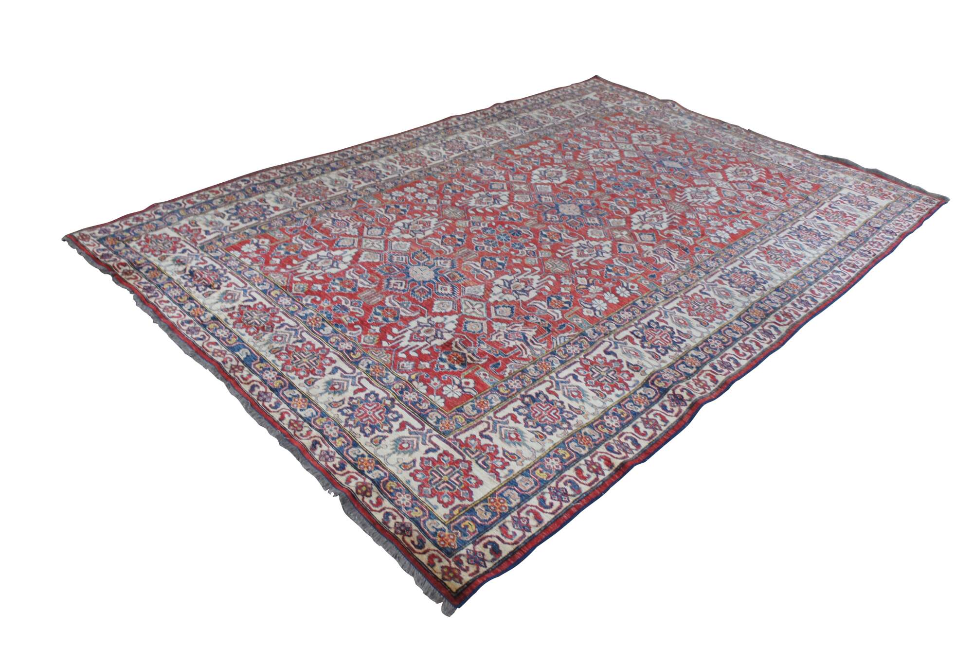 A large and Impressive oriental geometric woold area rug. Features a hand knotted pile with geometric foliate designs. The foreground of the rug is red with blue, beige and teal accents.