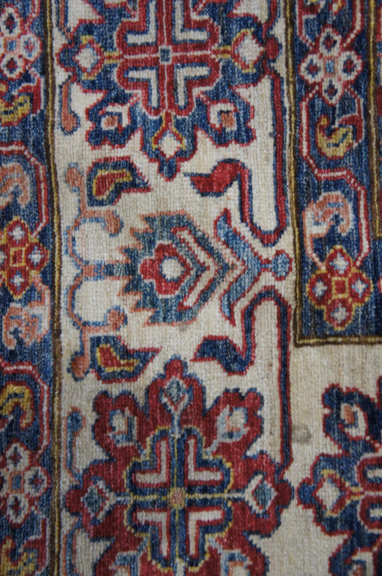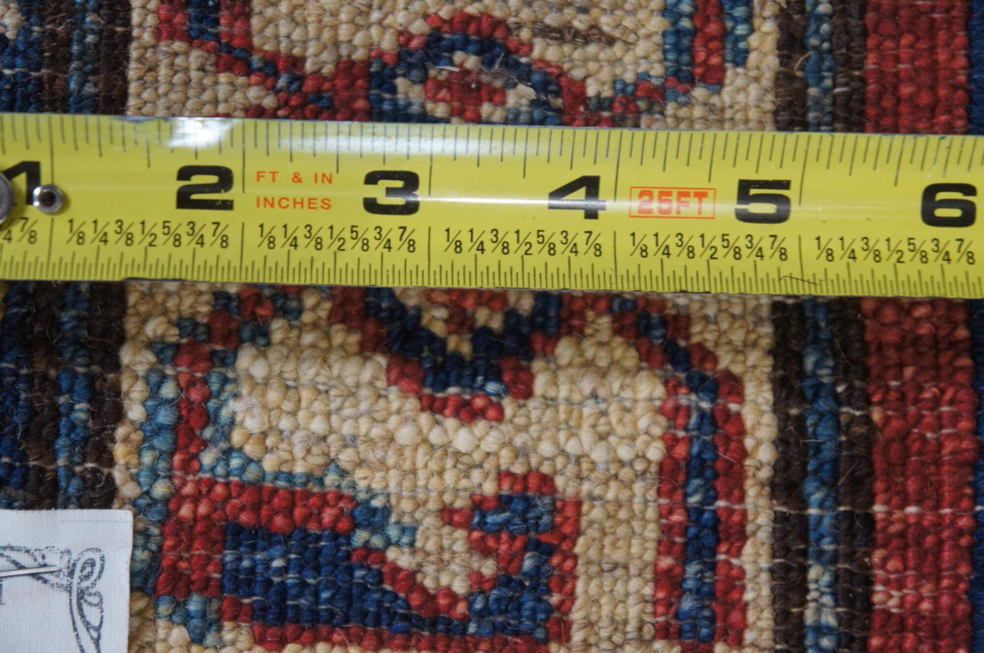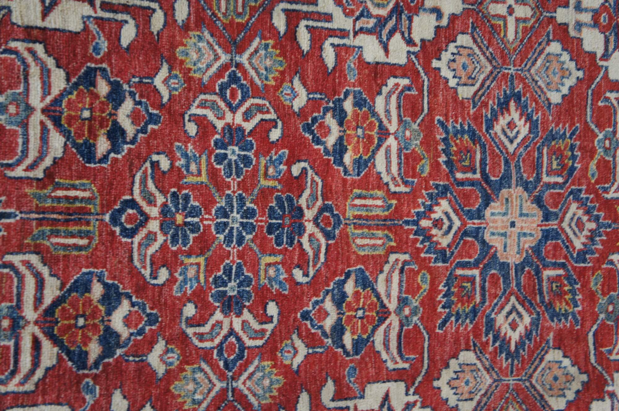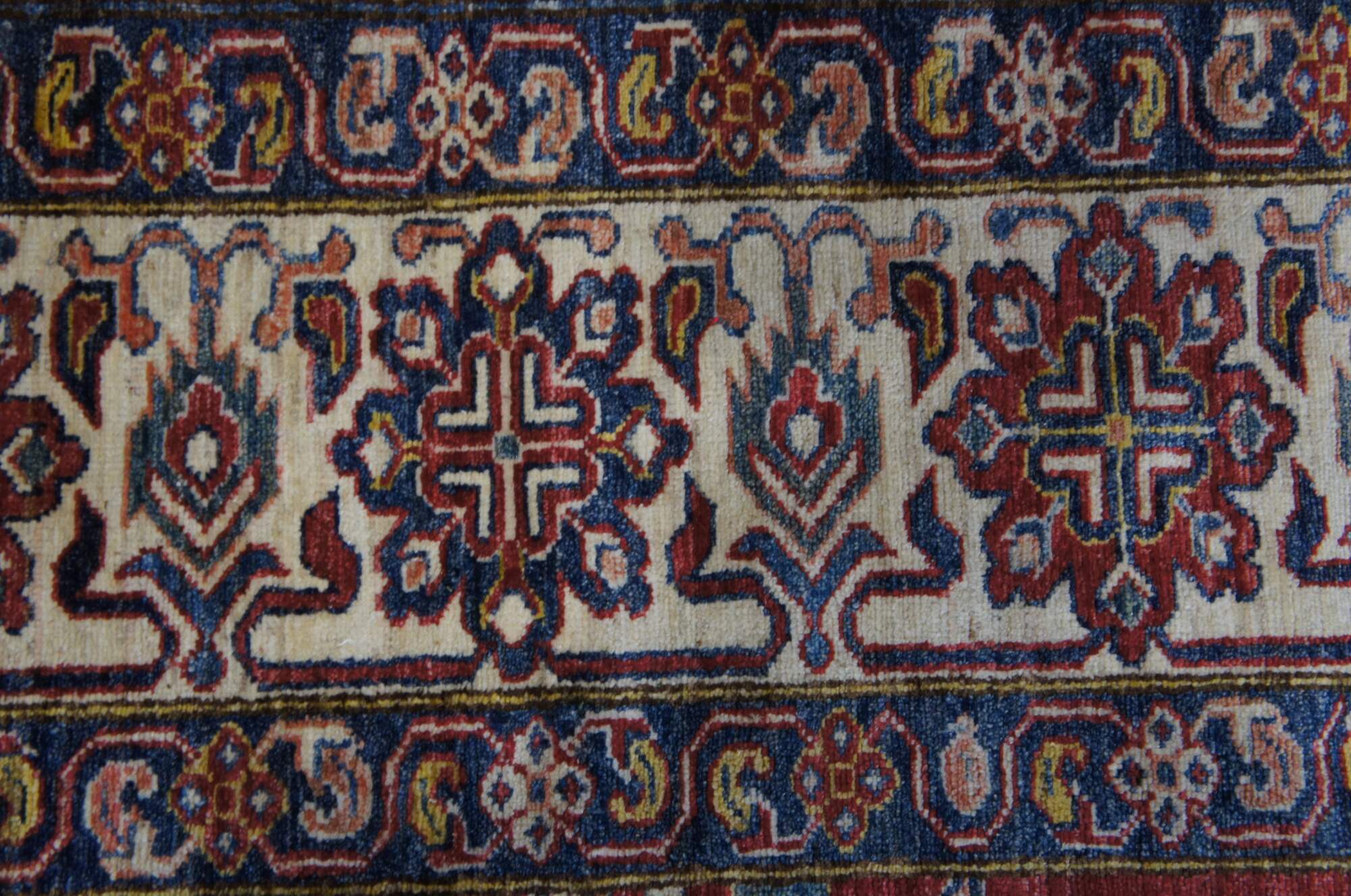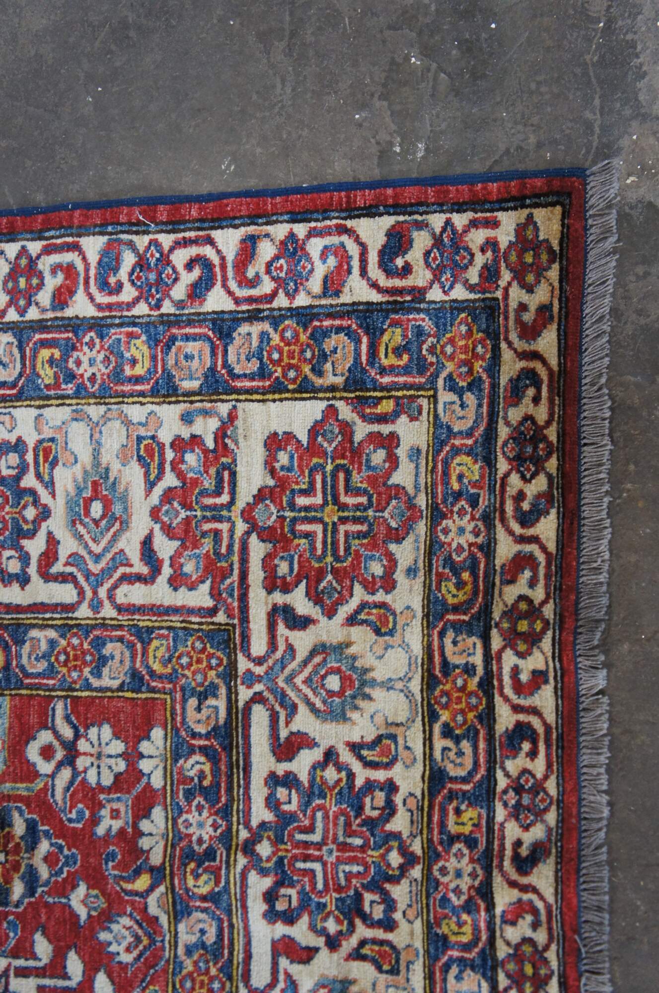 A large and Impressive oriental geometric woold area rug. Features a hand knotted pile with geometric foliate designs. The foreground of the rug is red with blue, beige and teal accents.