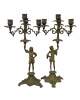Two vintage brass candelabras / candle sticks featuring two figures in Renaissance attire holding a torchiere with four candlesticks. Supported by a tripod base.