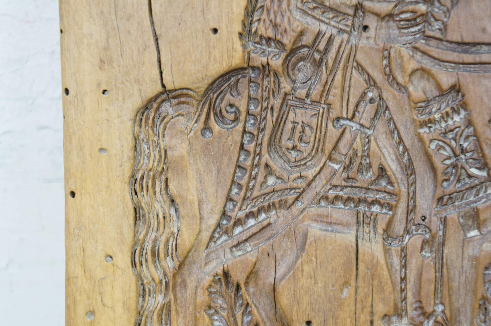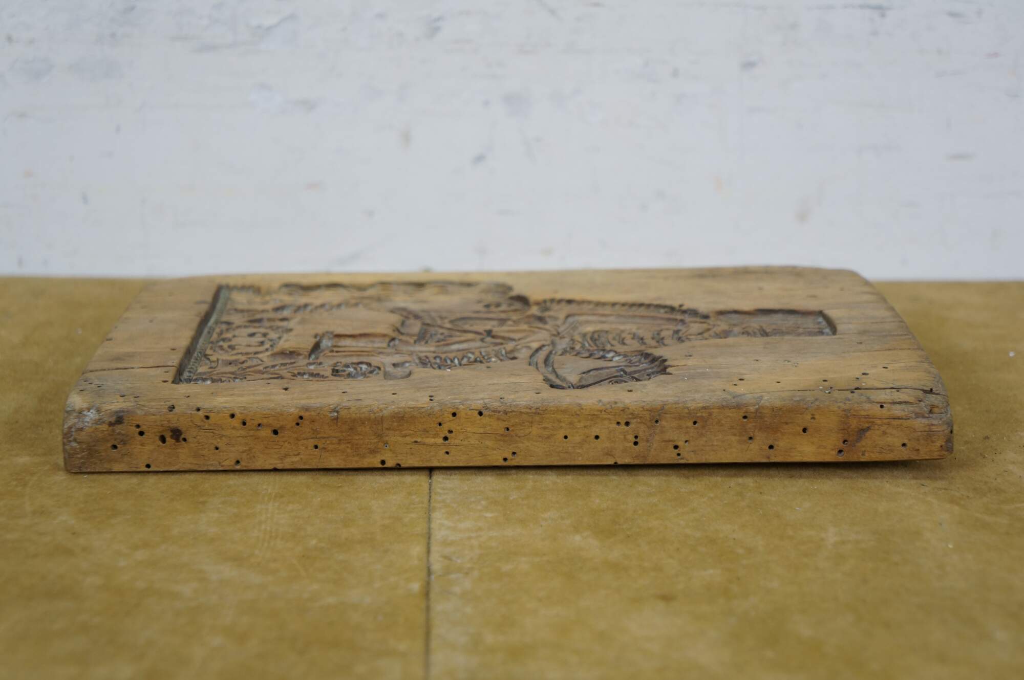 Antique Mid-19th Century carved wood gingerbread / cookie / Marzipan mold. Hardwood sheet carved with the image of a nobleman/soldier on a horse in a field of flowers with the initials "SP" at the bottom center. Hooks have been added for wall display.