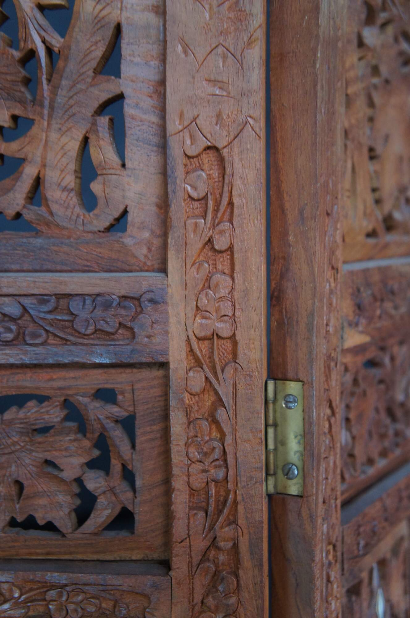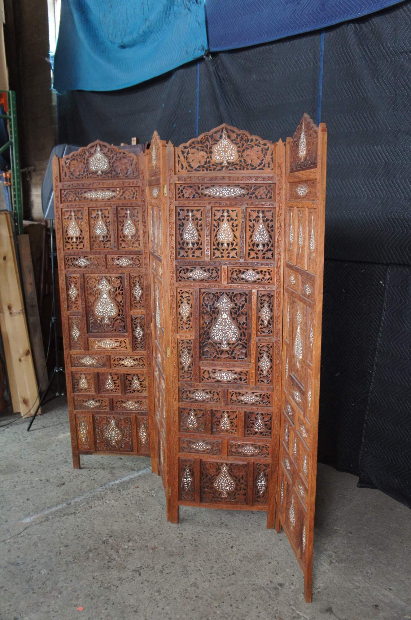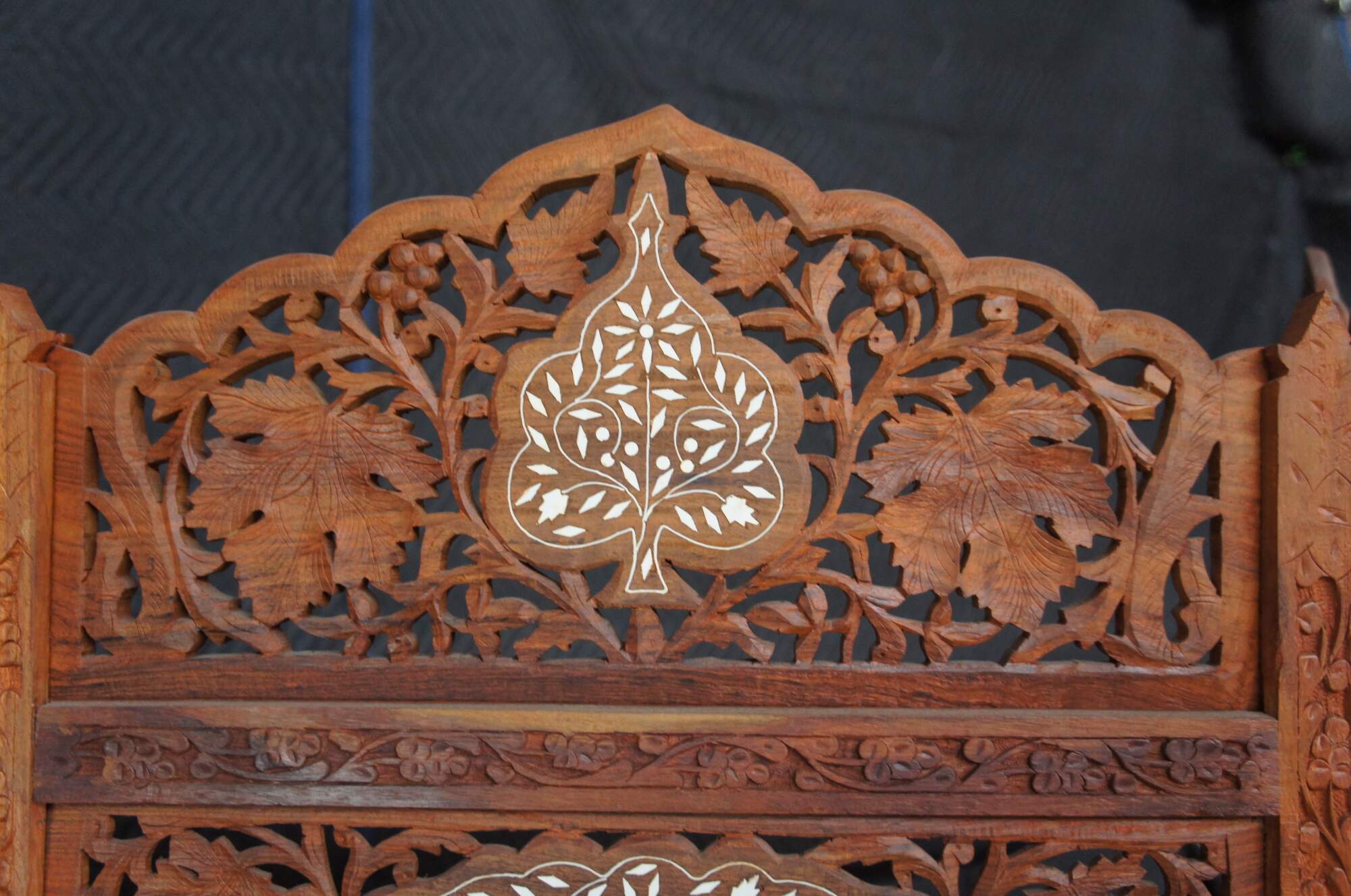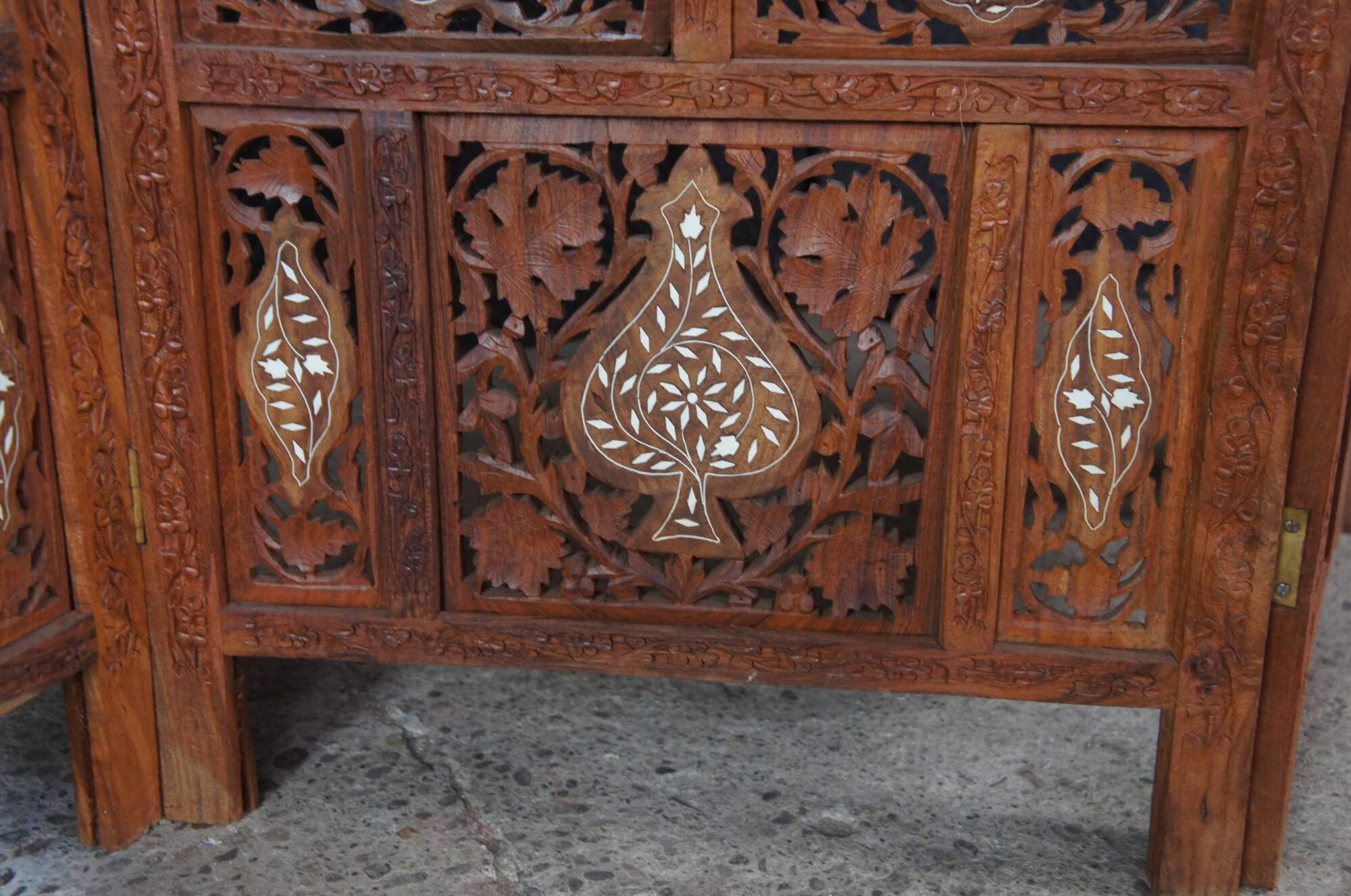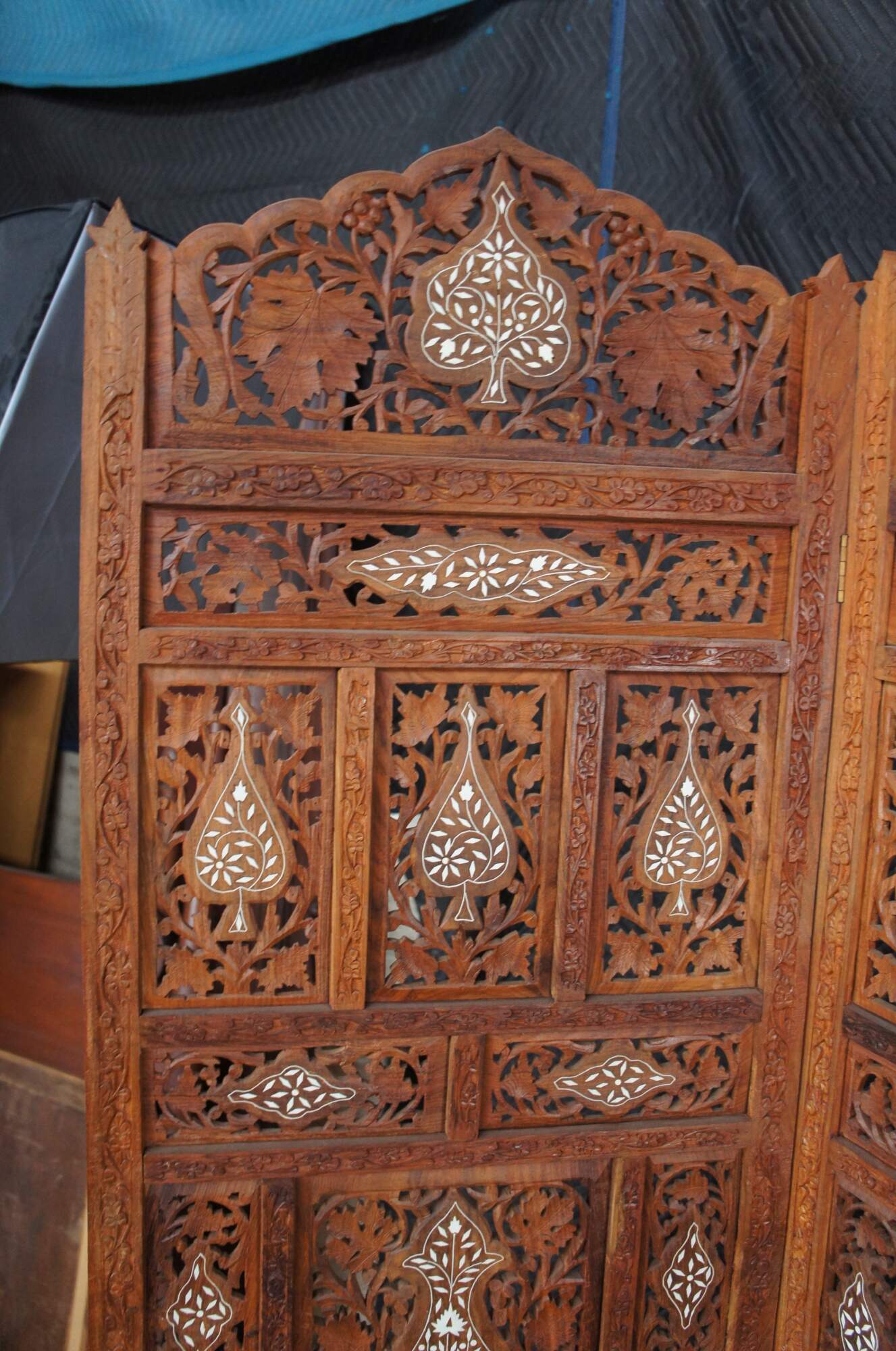 Mid-20th Century Anglo-Indian Camel Bone inlaid folding screen. Features a teak frame intricately carved and pierced with scrolling foliate and leaves. The camel bone inlay sections are spade and diamond shaped. A very solid well made piece that will make a great addition to any space. Made in India