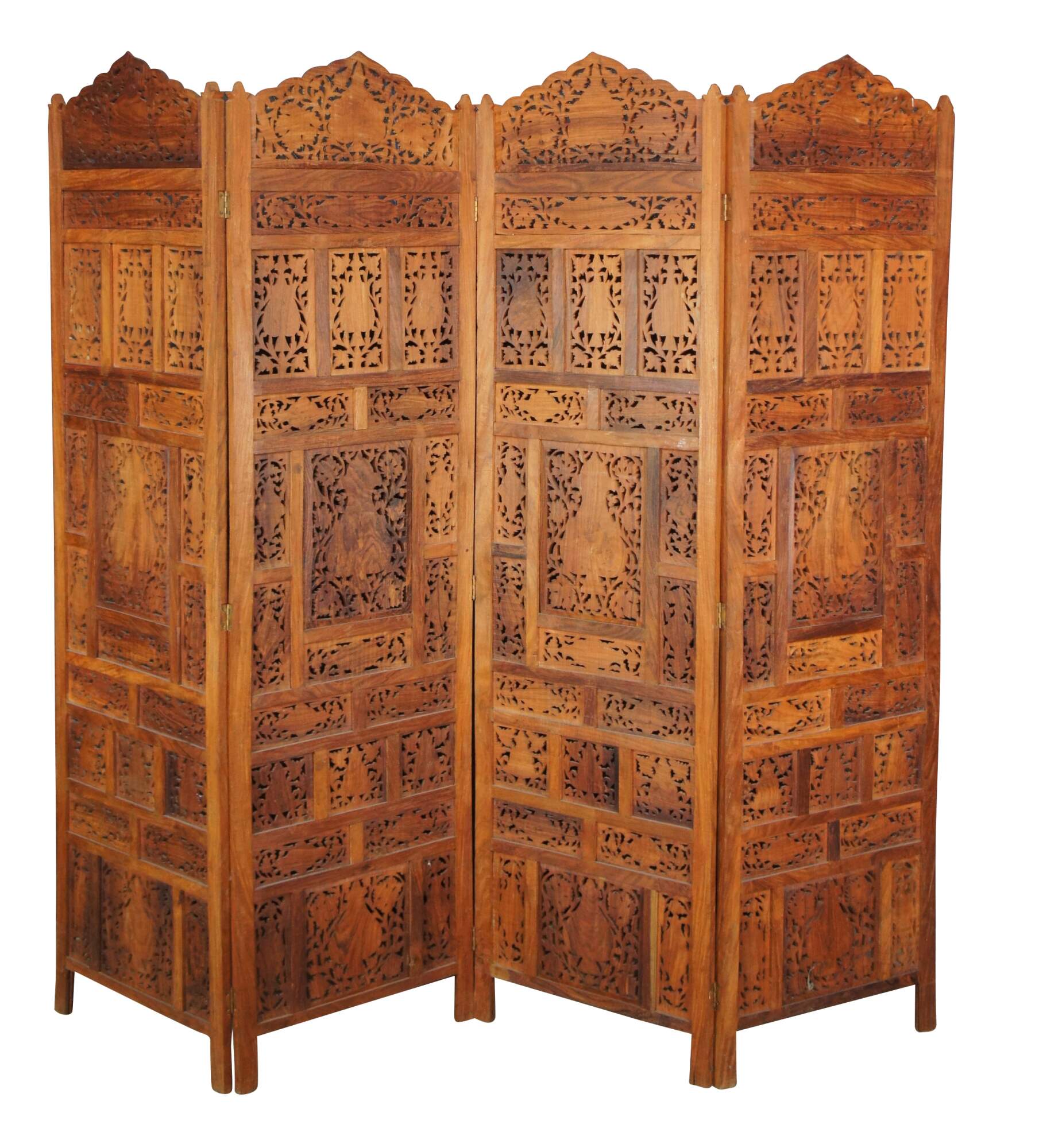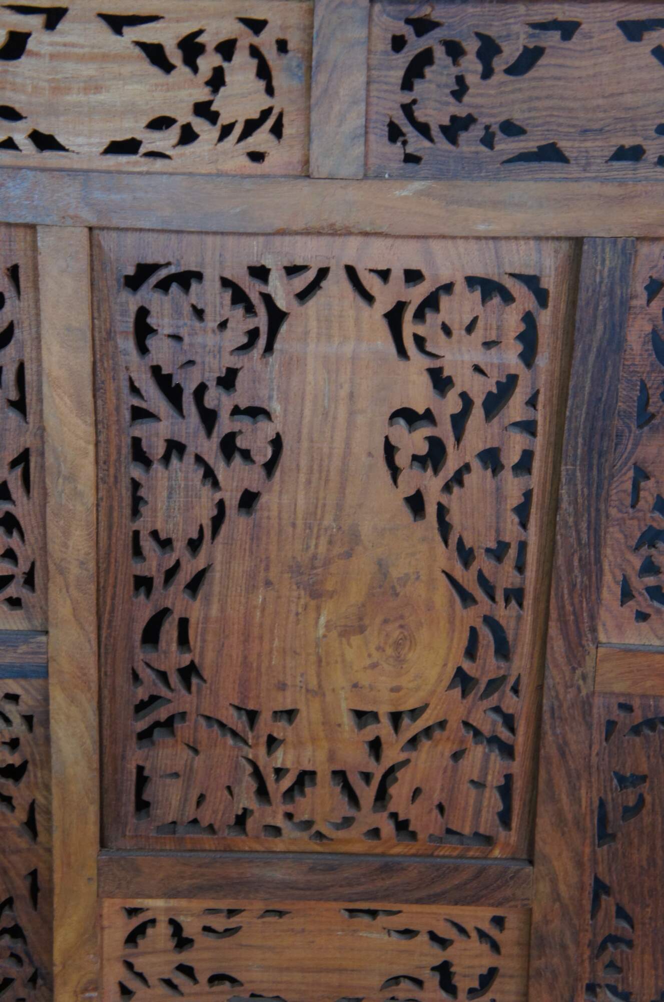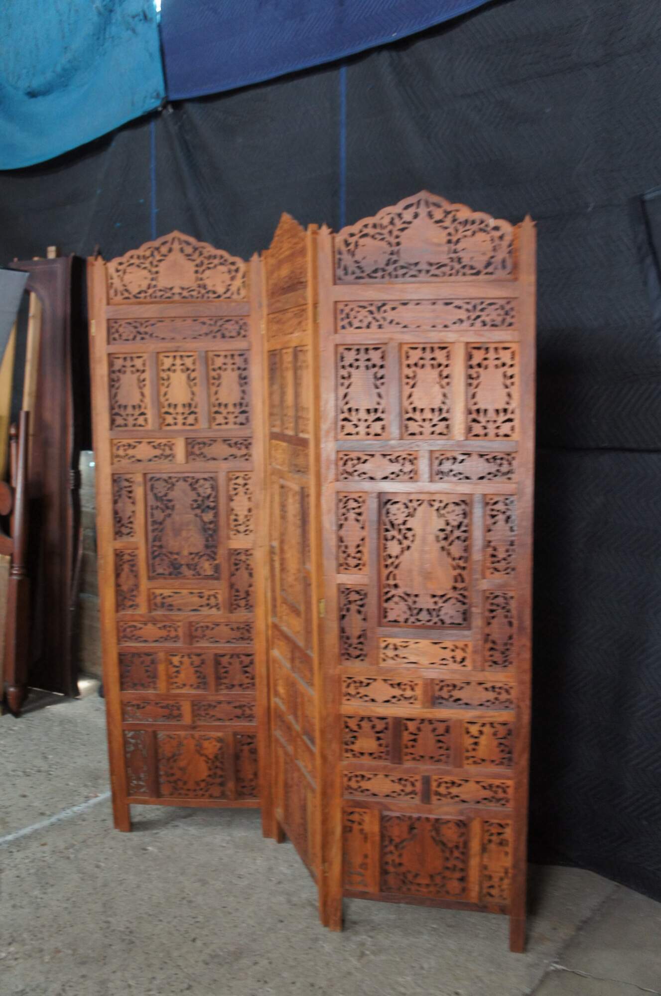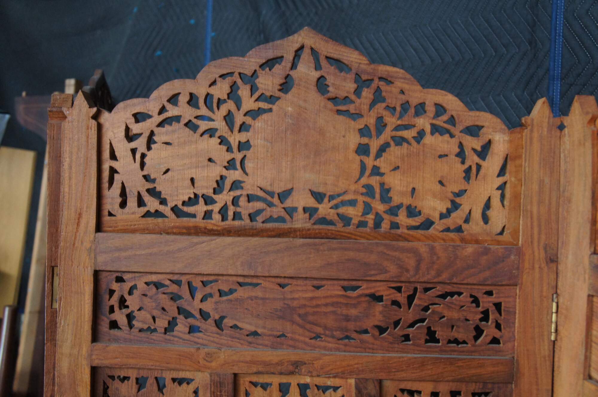 Mid-20th Century Anglo-Indian Camel Bone inlaid folding screen. Features a teak frame intricately carved and pierced with scrolling foliate and leaves. The camel bone inlay sections are spade and diamond shaped. A very solid well made piece that will make a great addition to any space. Made in India