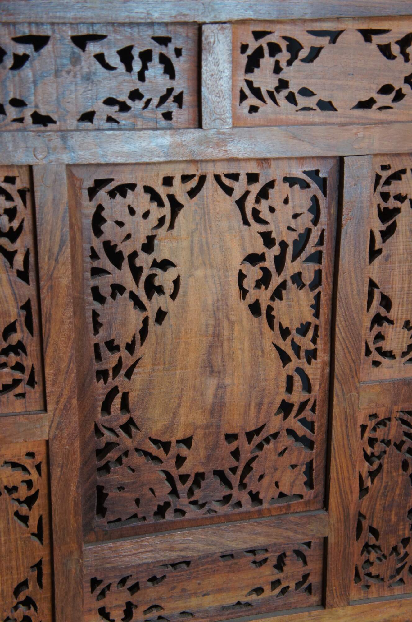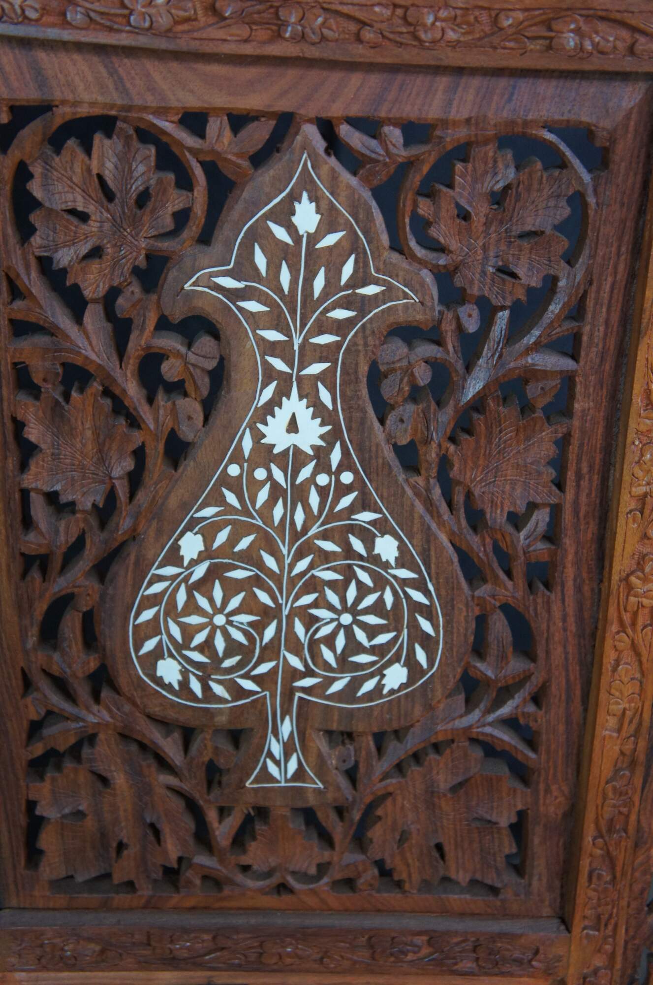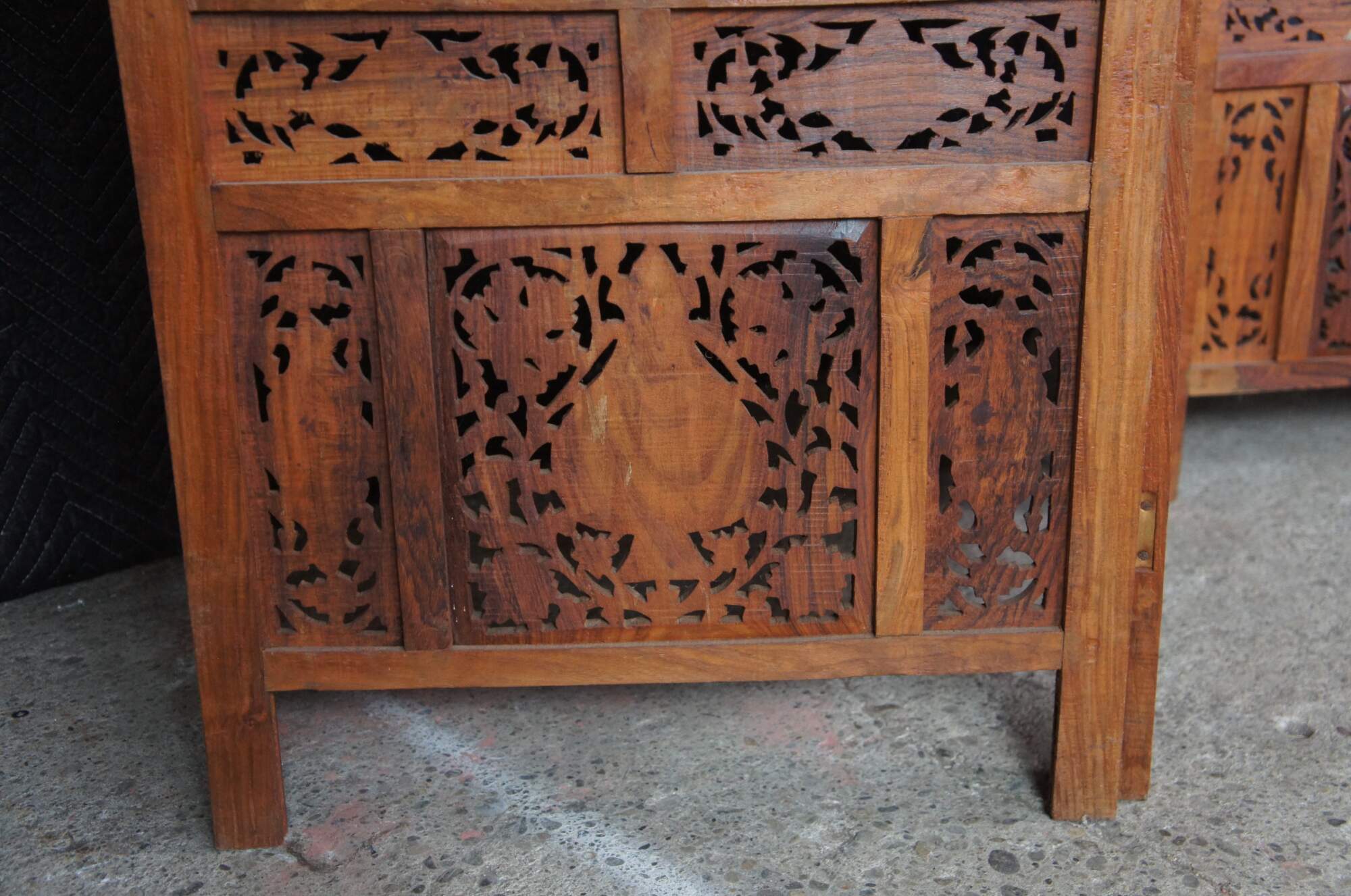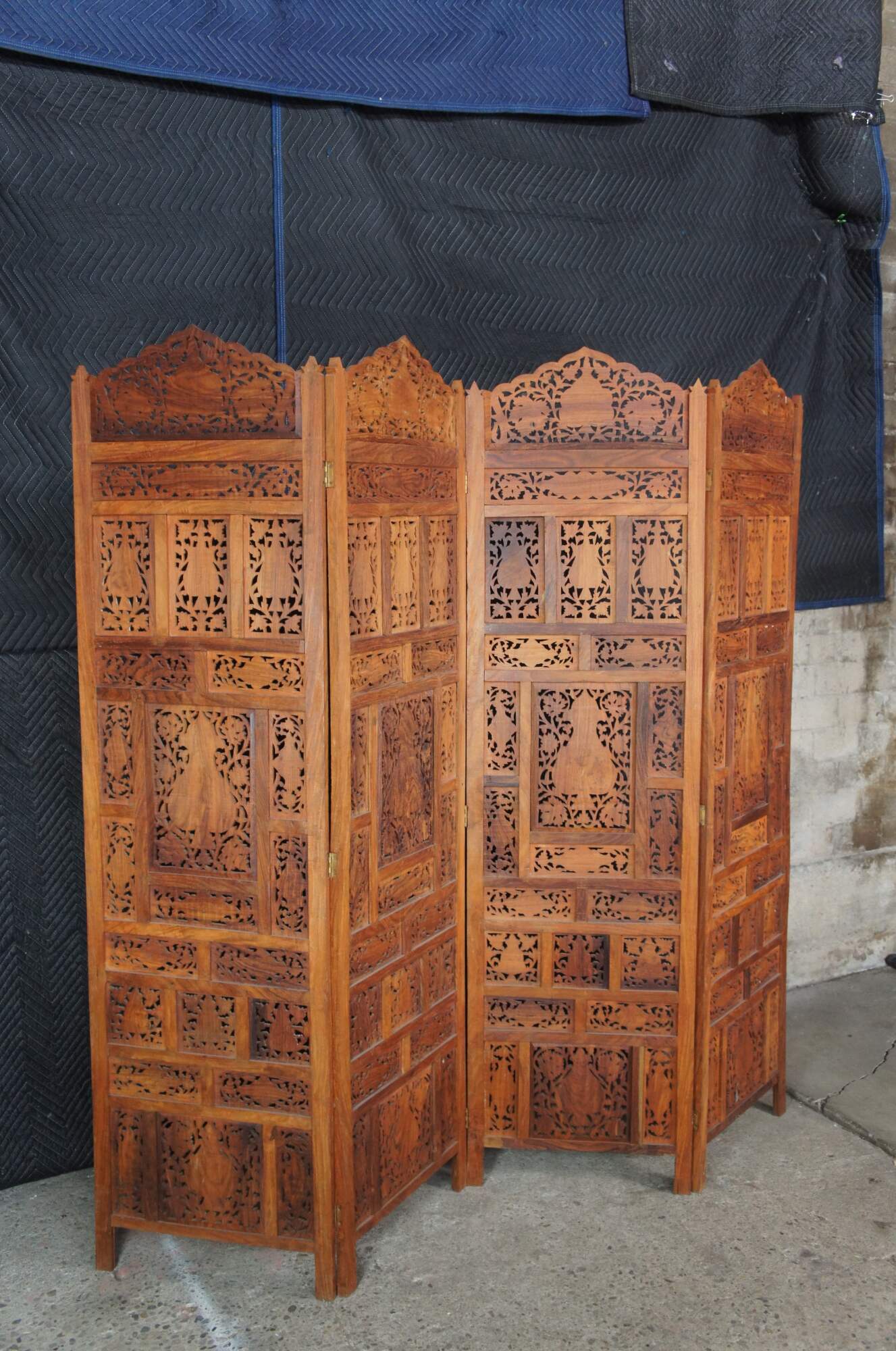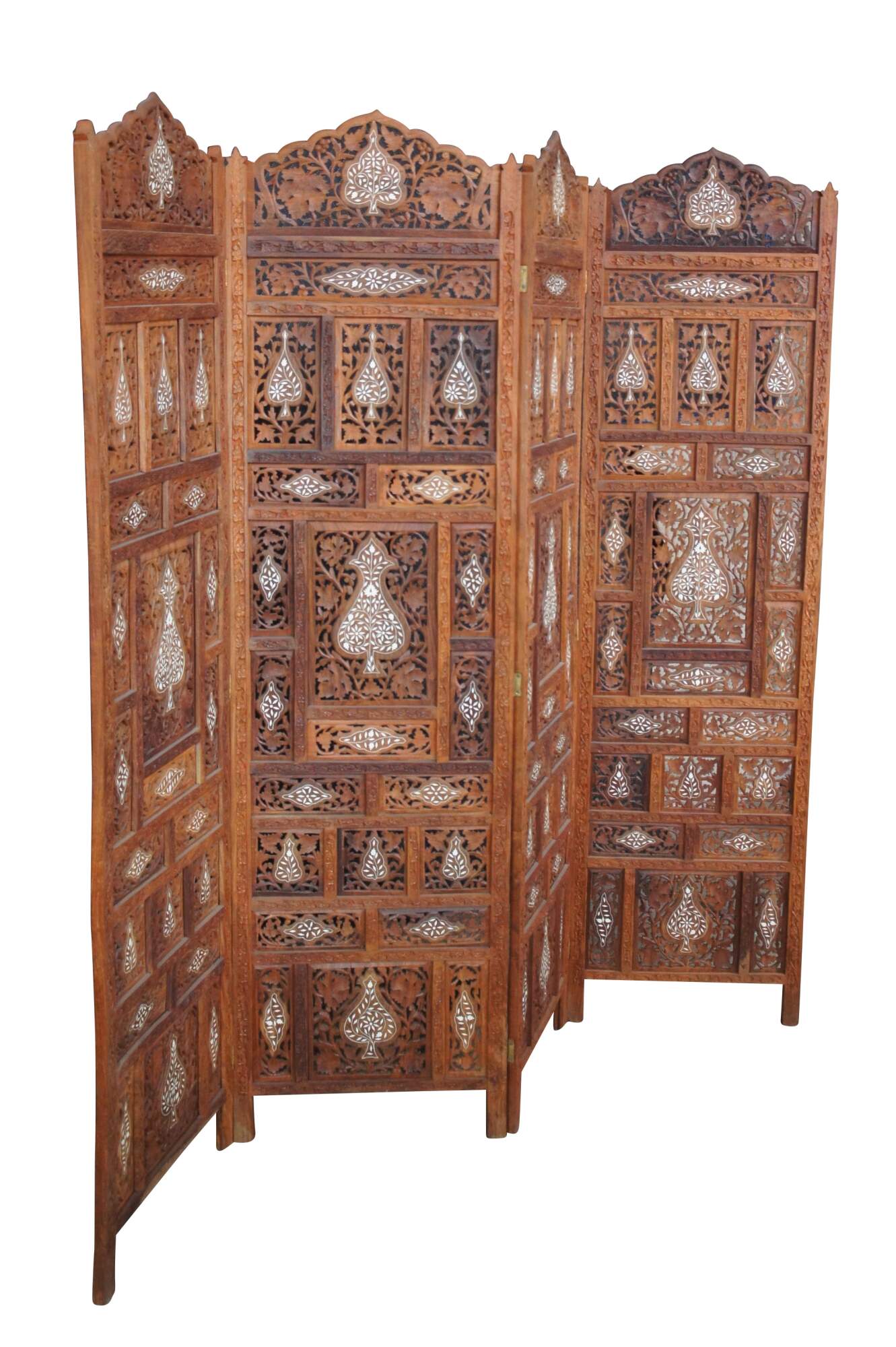 Mid-20th Century Anglo-Indian Camel Bone inlaid folding screen. Features a teak frame intricately carved and pierced with scrolling foliate and leaves. The camel bone inlay sections are spade and diamond shaped. A very solid well made piece that will make a great addition to any space. Made in India