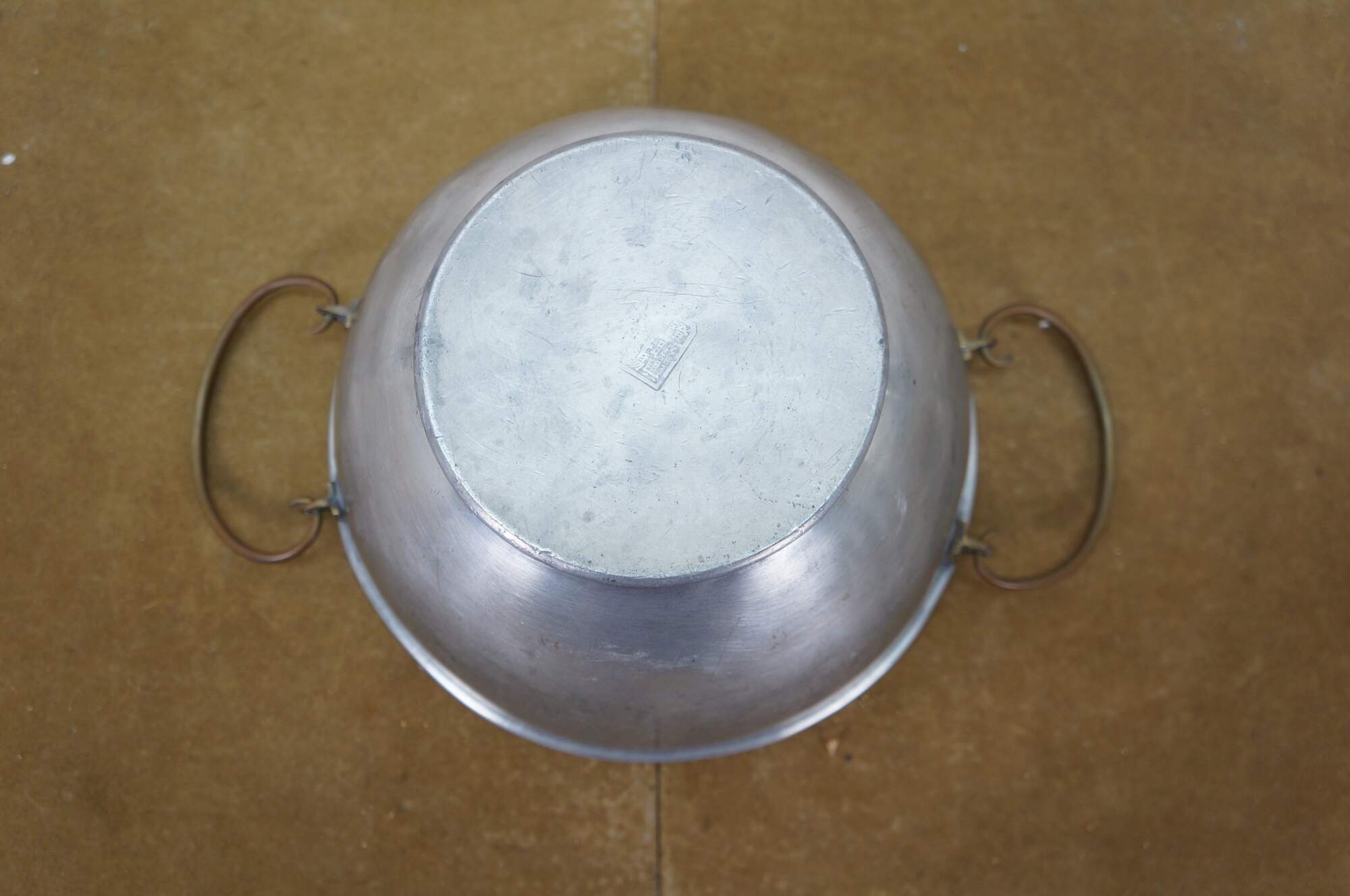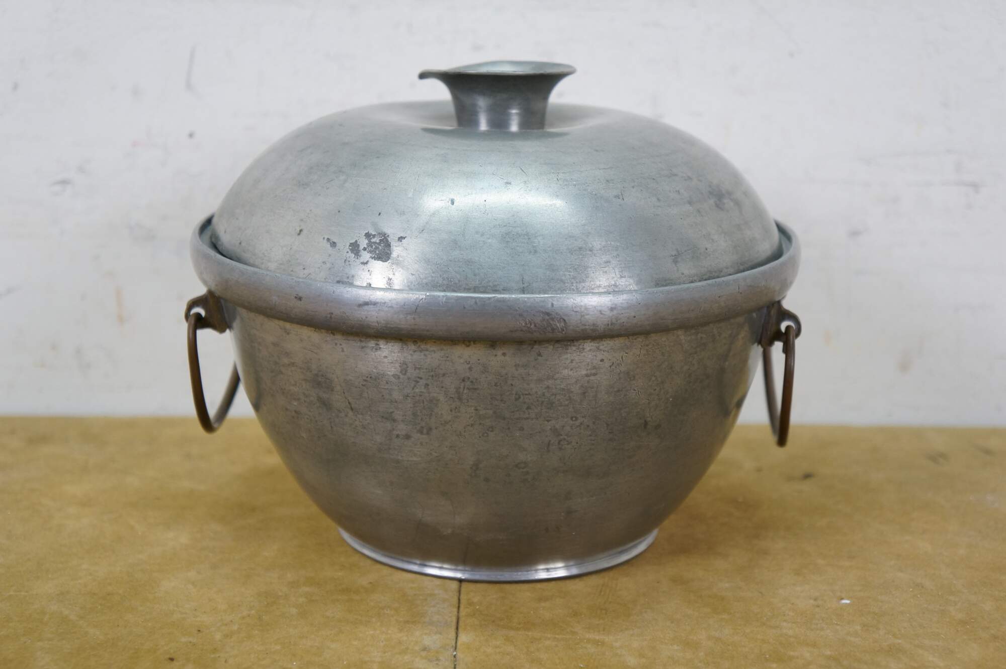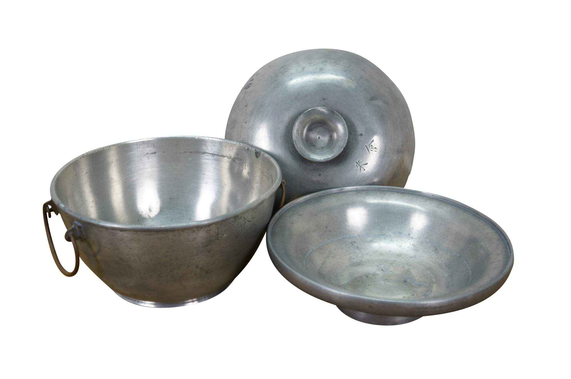 Vintage Chinese hot pot / food warmer consisting of three pieces - Round tapered base for filling with hot coals with two copper bail handles, footed plate / low bowl that sits on the upper rim of the base, and lid.