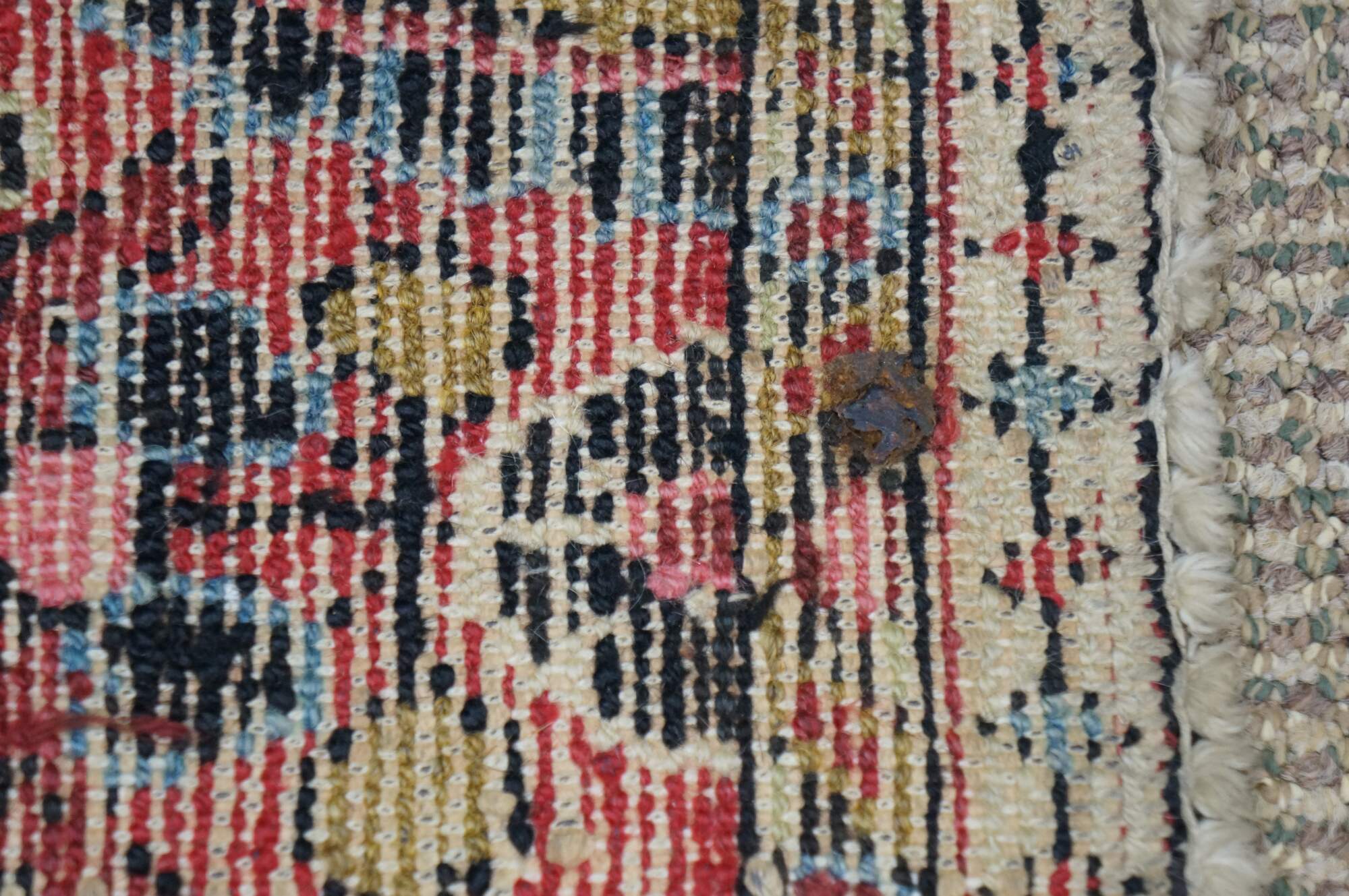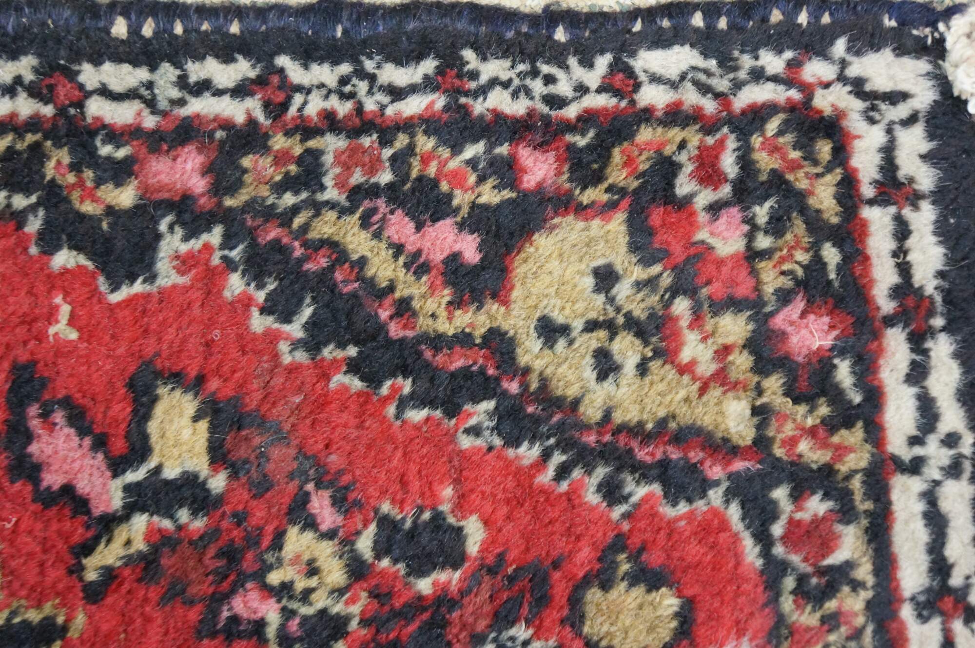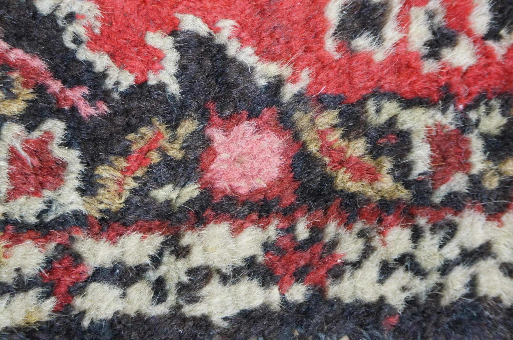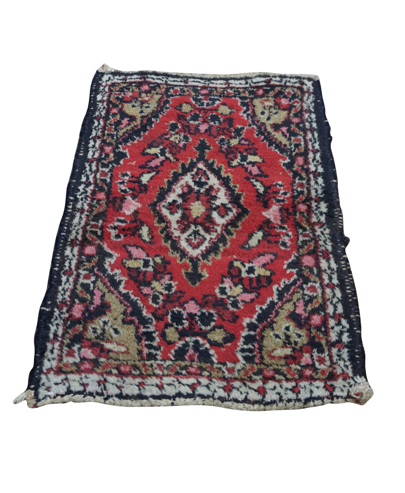 Vintage hand knotted small wool rug / mat featuring a floral and diamond design in red, pink.beige and navy.