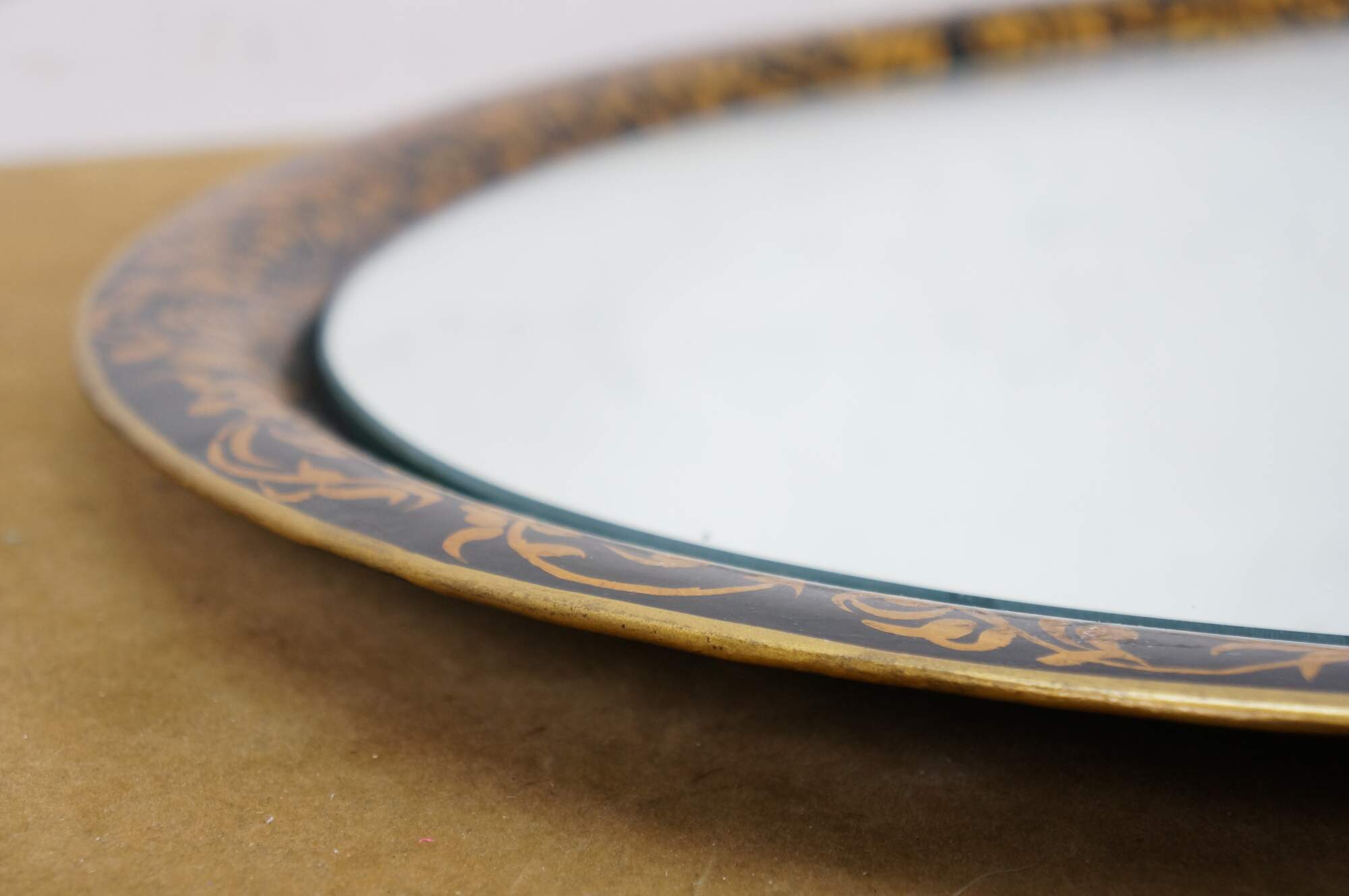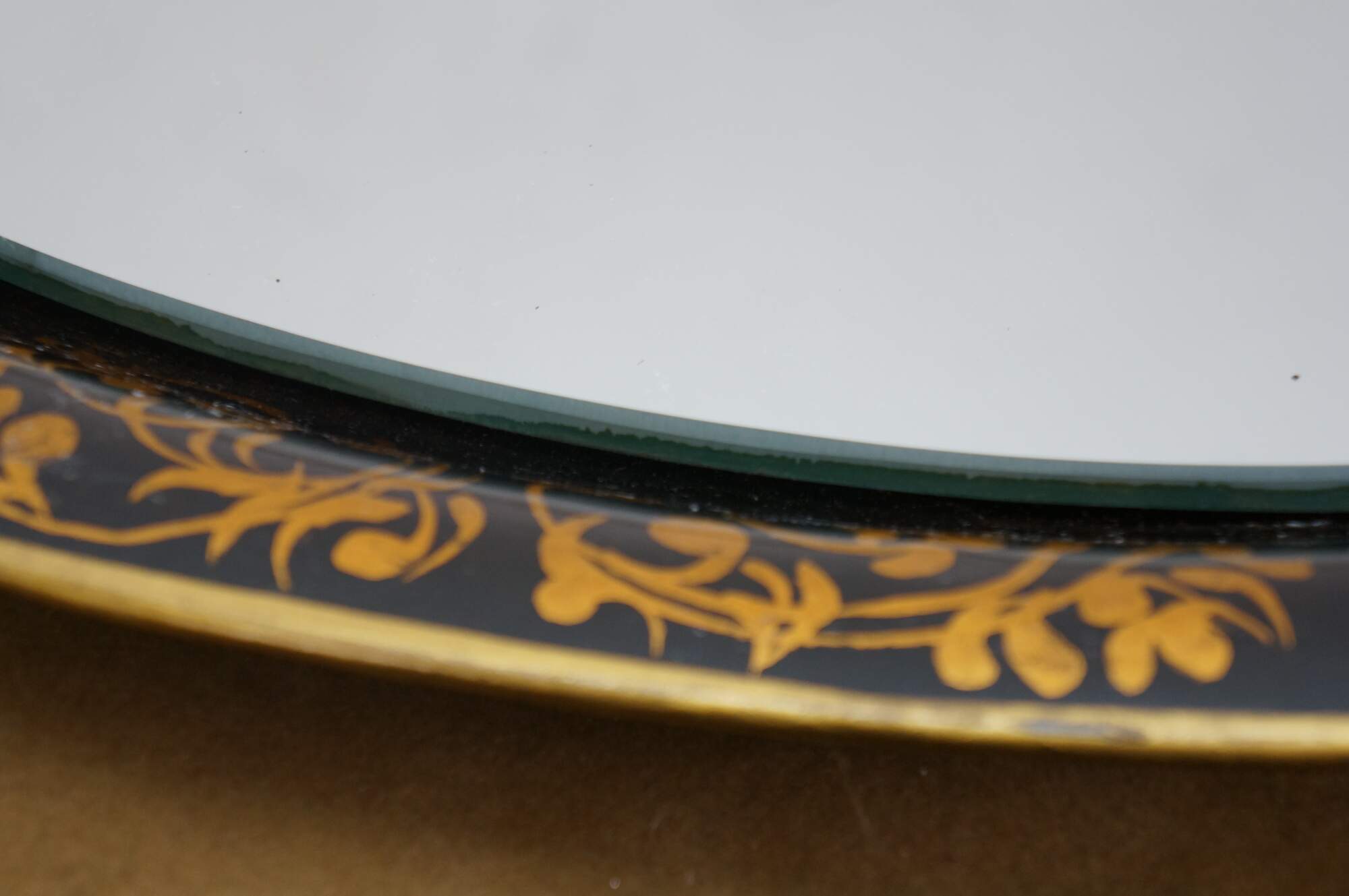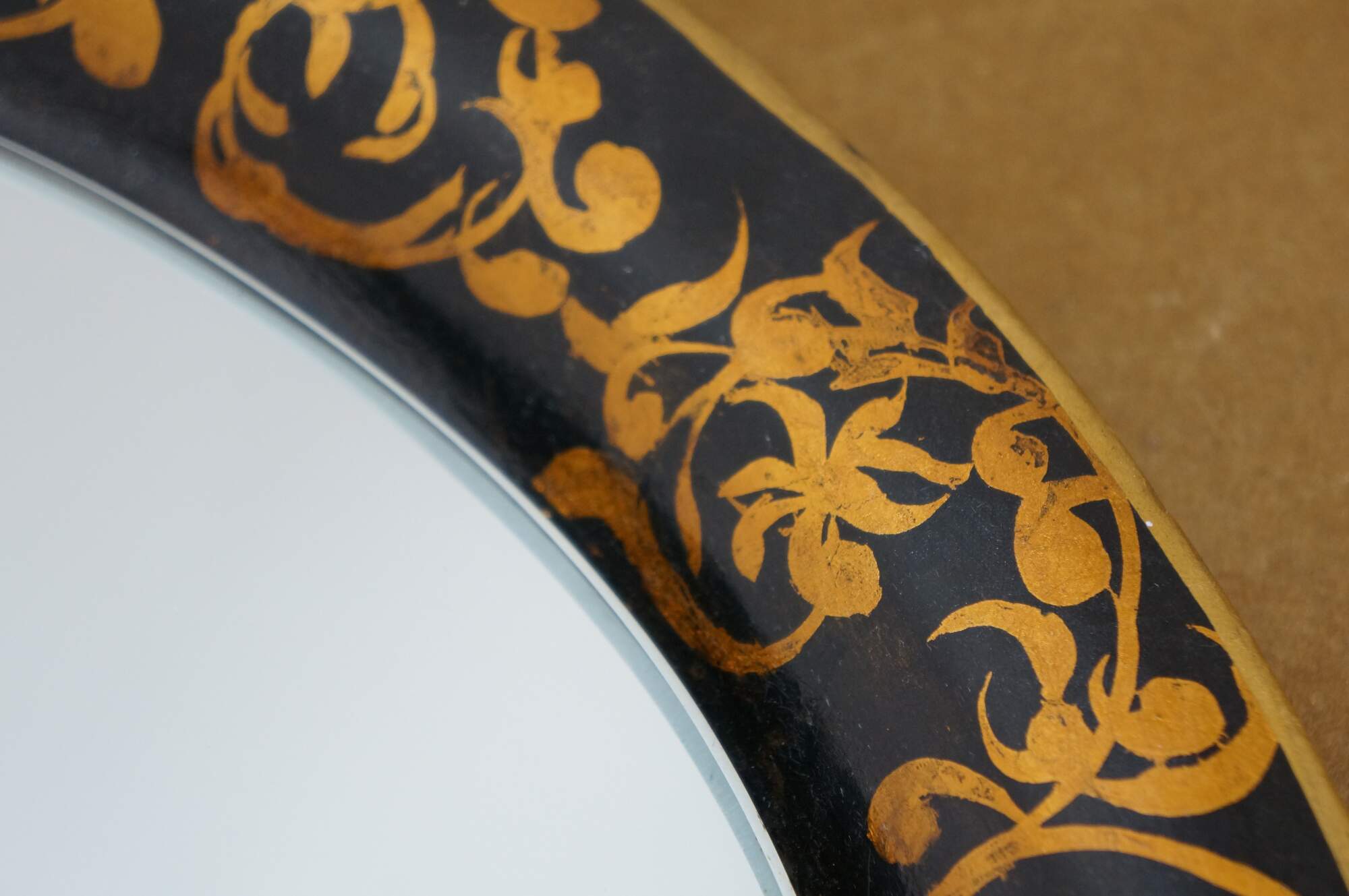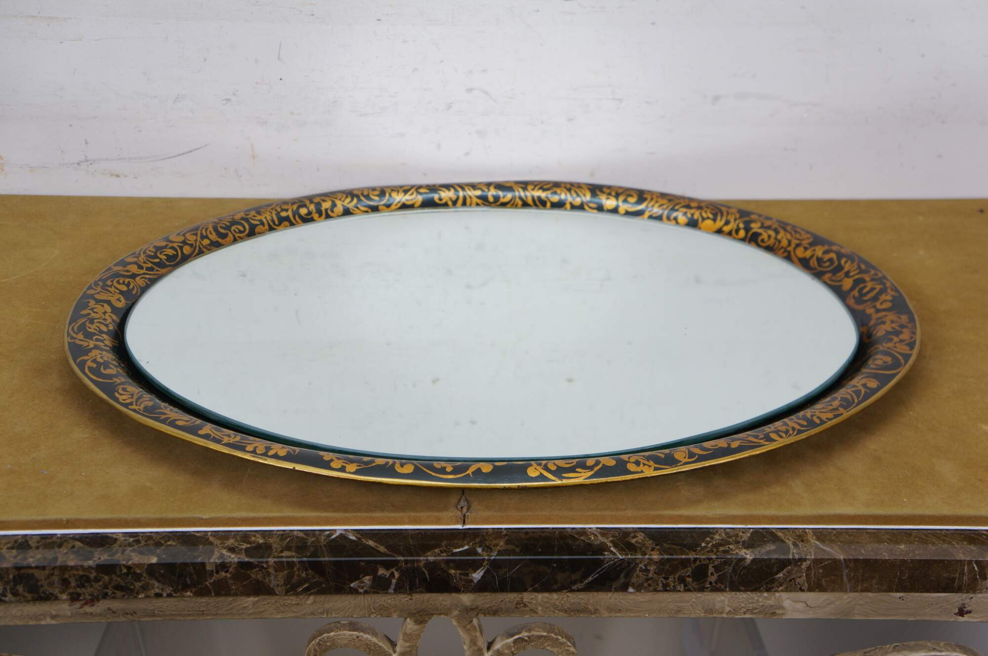 Vintage black metal tolware tray with added mirror and wire for use as a wall mirror. Oval shape with curved edge, hand painted with a swirling gold foliate design. Marked "Muriel" on reverse.