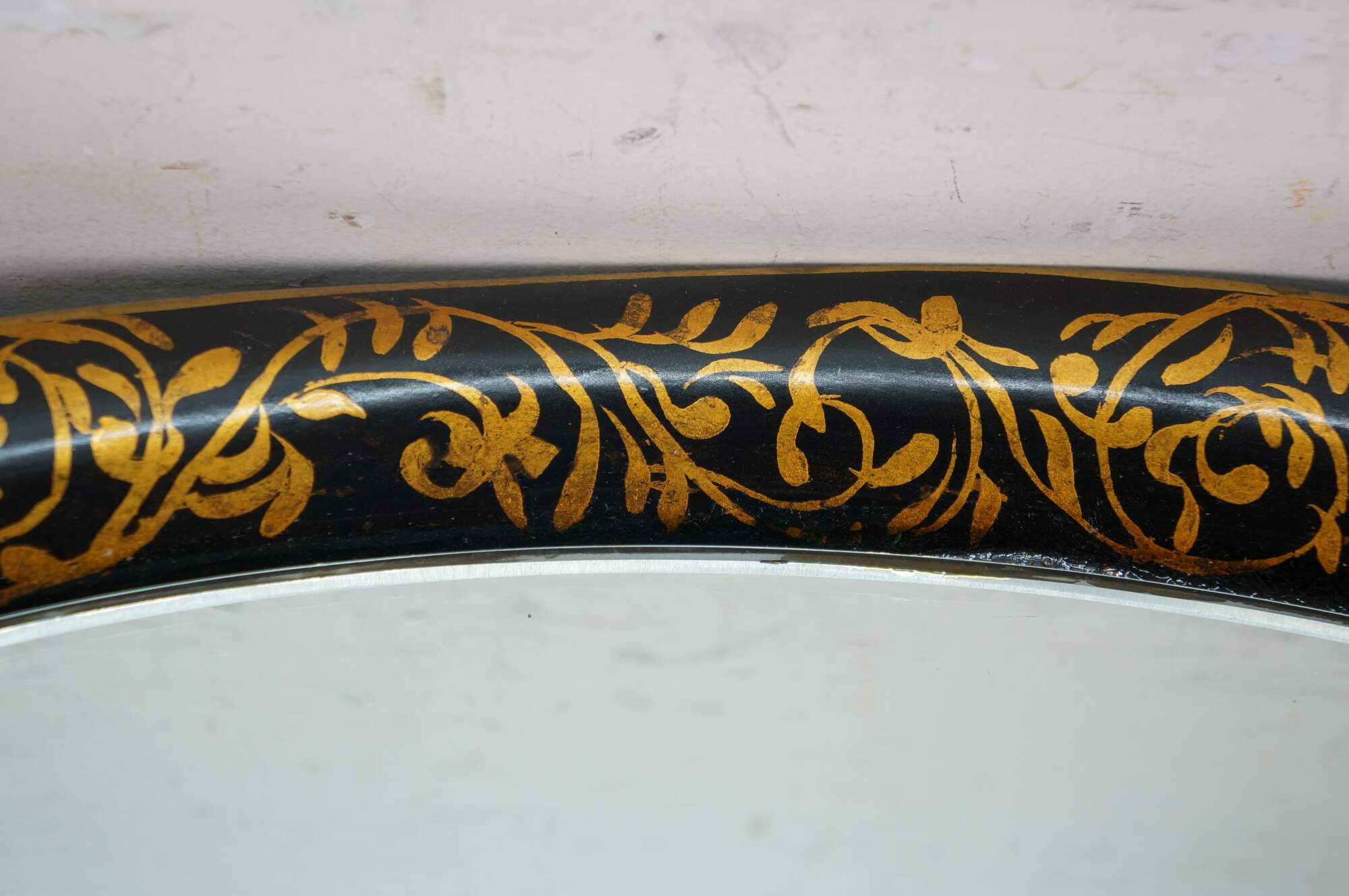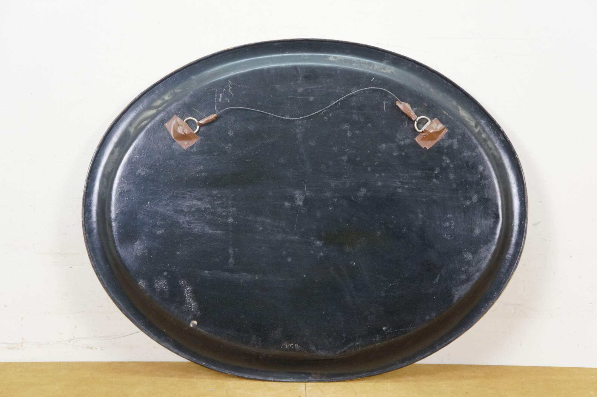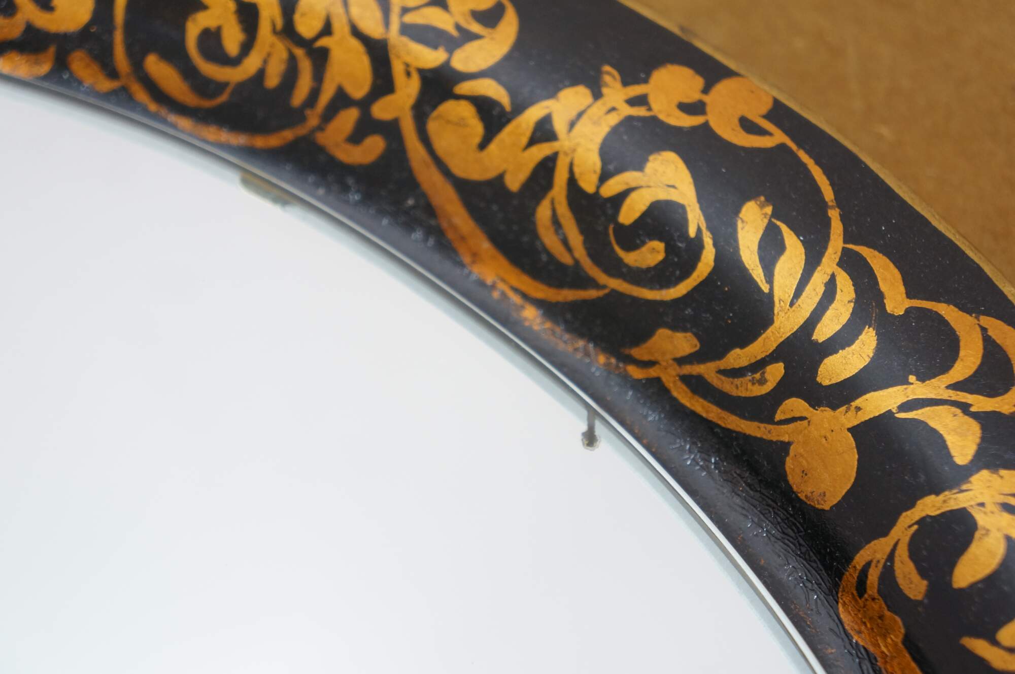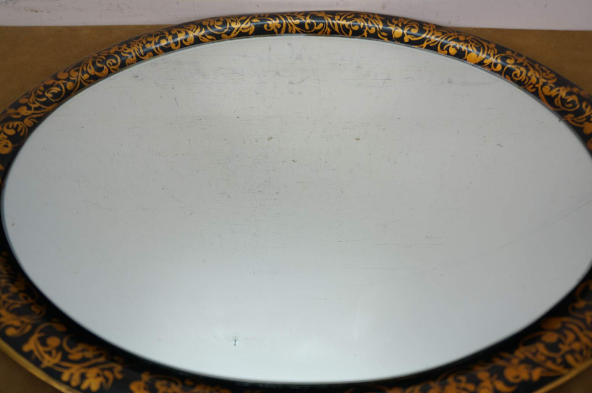 Vintage black metal tolware tray with added mirror and wire for use as a wall mirror. Oval shape with curved edge, hand painted with a swirling gold foliate design. Marked "Muriel" on reverse.