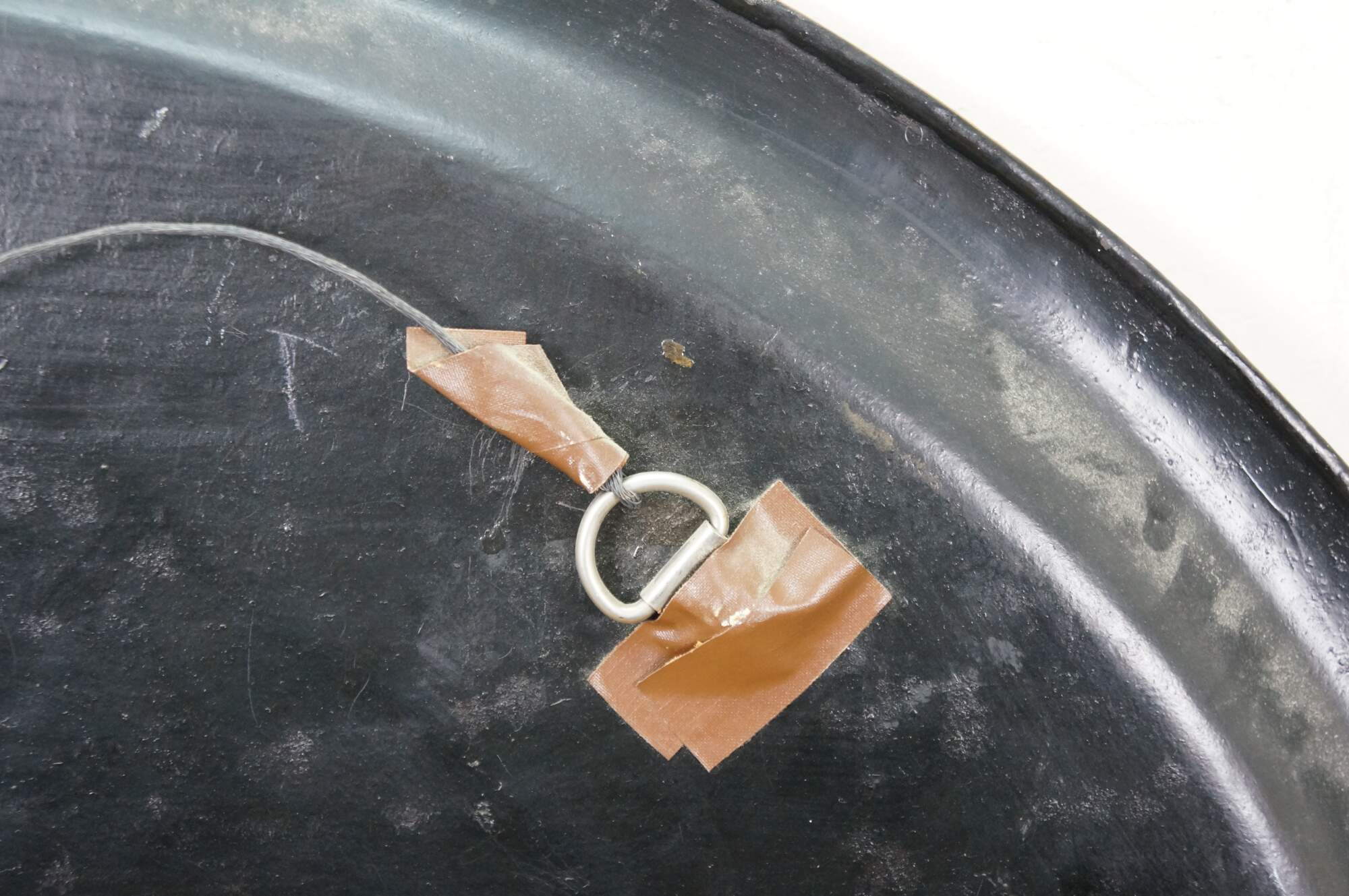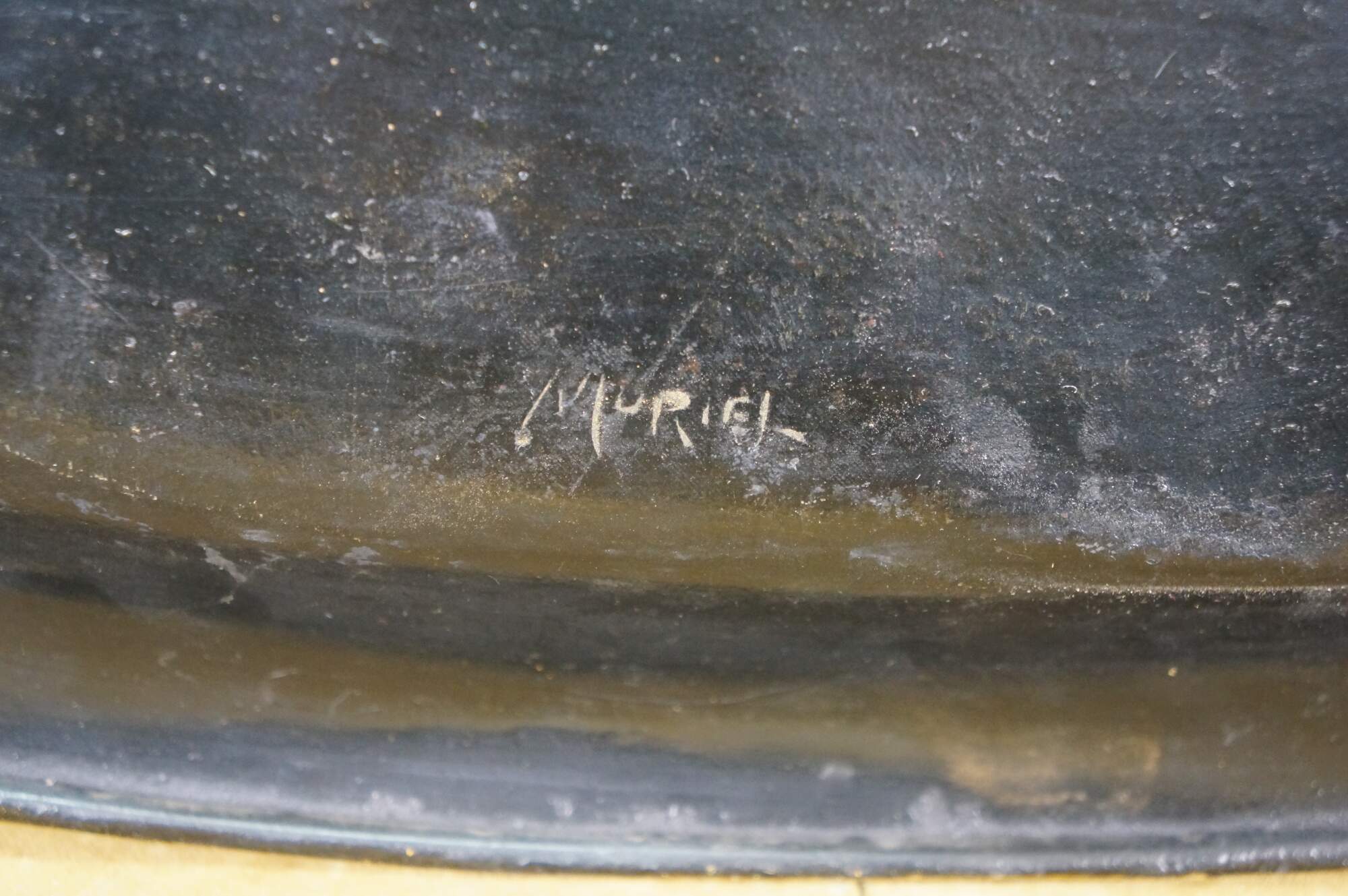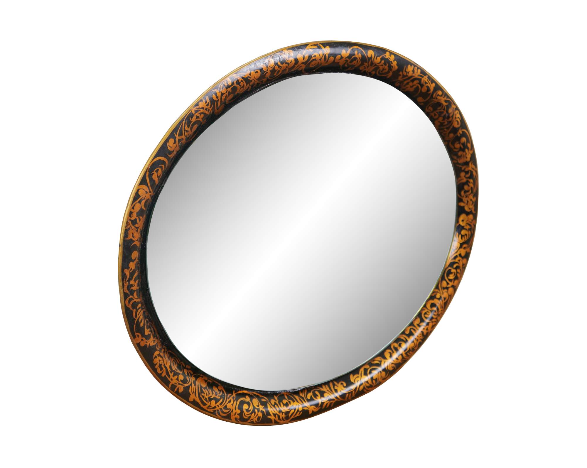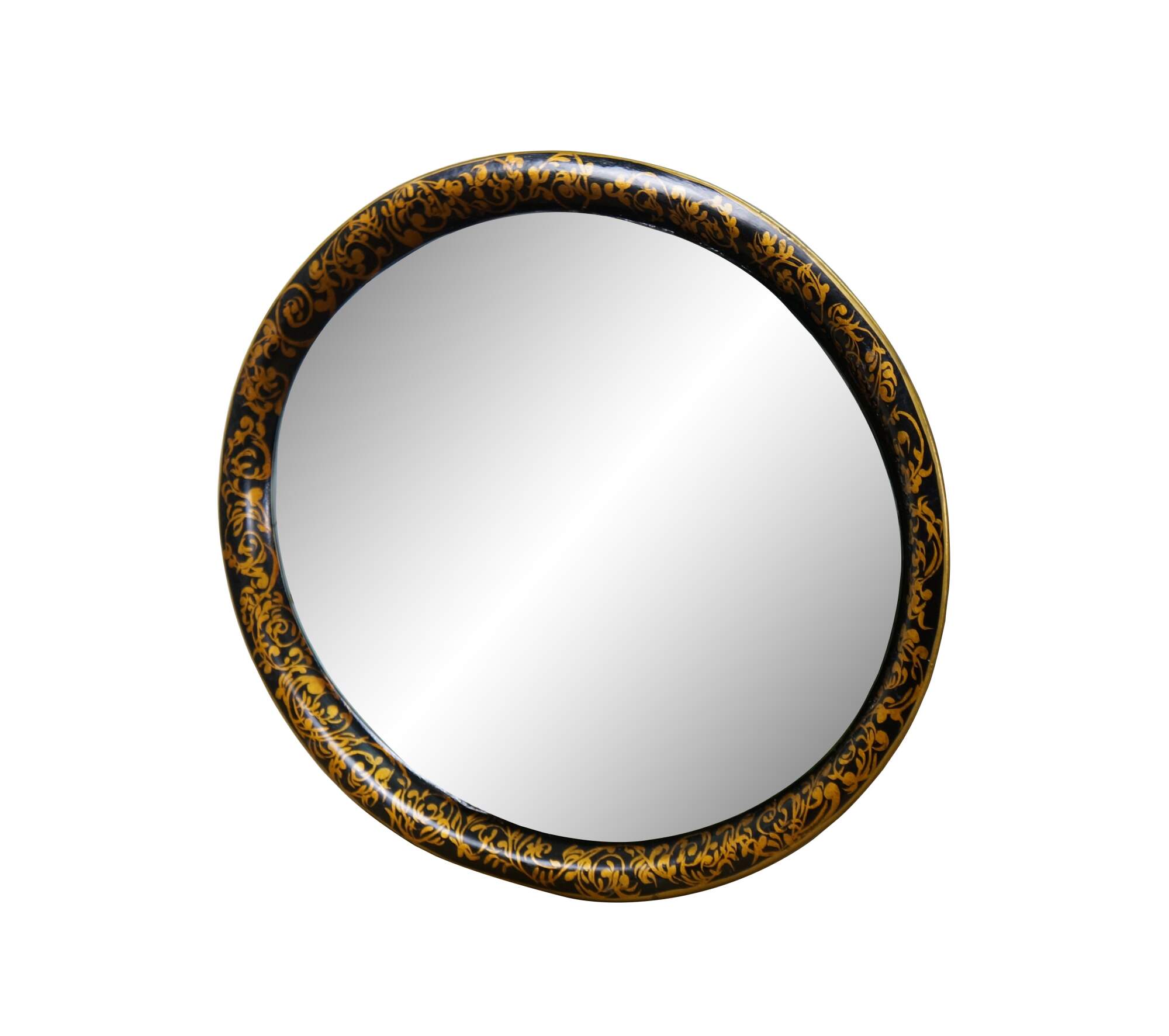 Vintage black metal tolware tray with added mirror and wire for use as a wall mirror. Oval shape with curved edge, hand painted with a swirling gold foliate design. Marked "Muriel" on reverse.