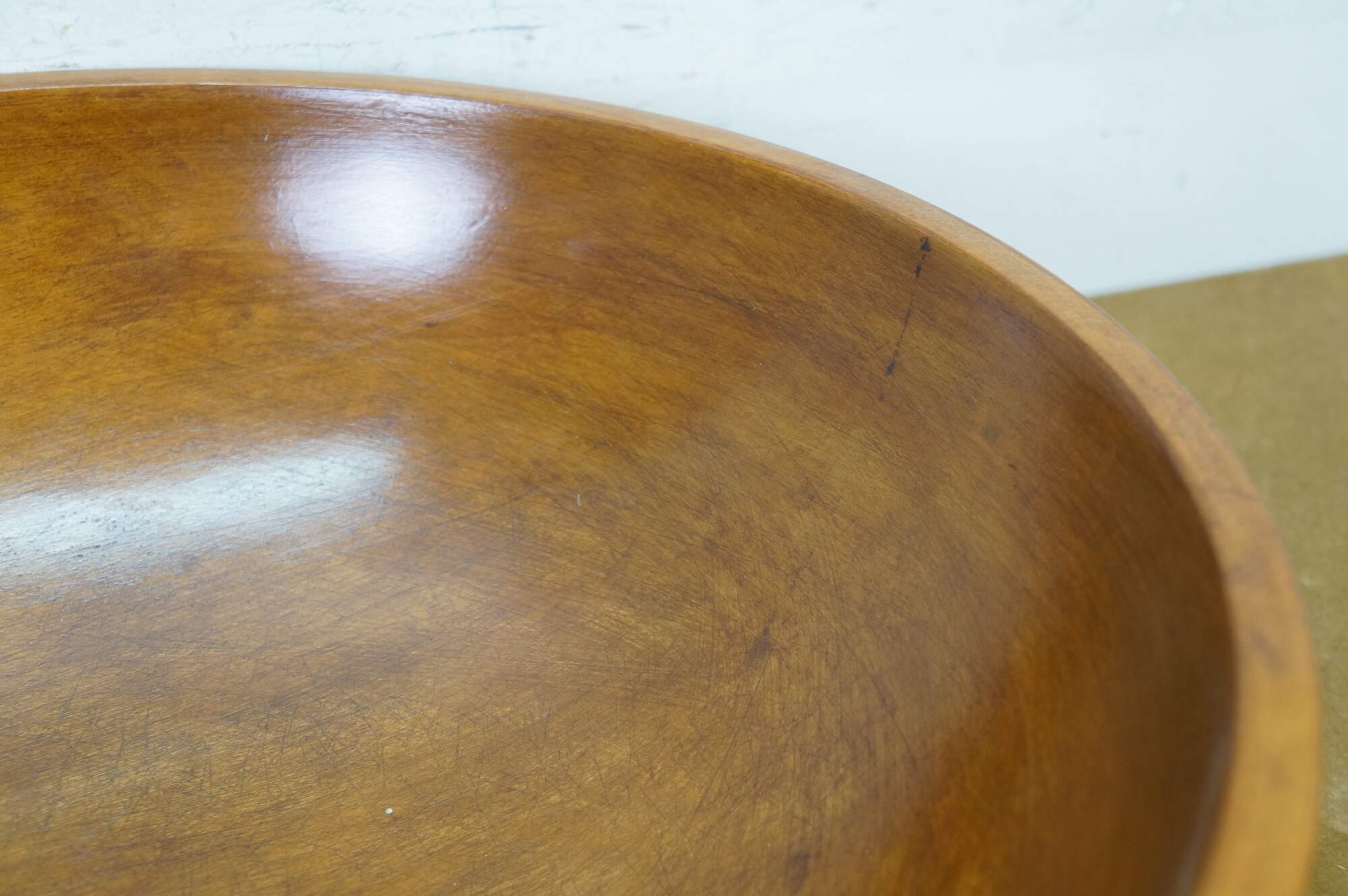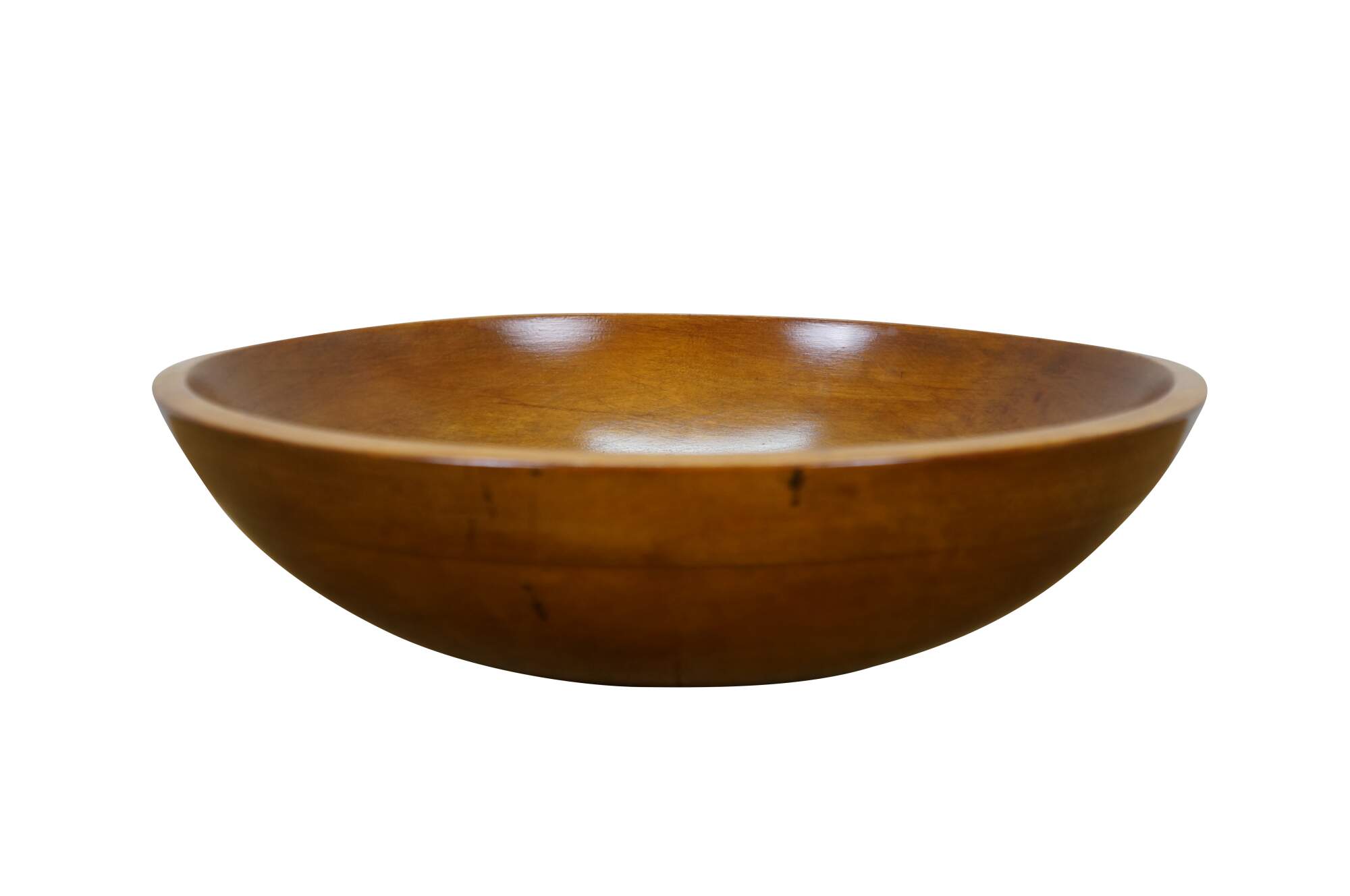 Antique folk art country farmhouse dough mixing or centerpiece fruit bowl. Made of turned maple wood featuring a slightly ovular form with banded lip and a nice, glossy finish.