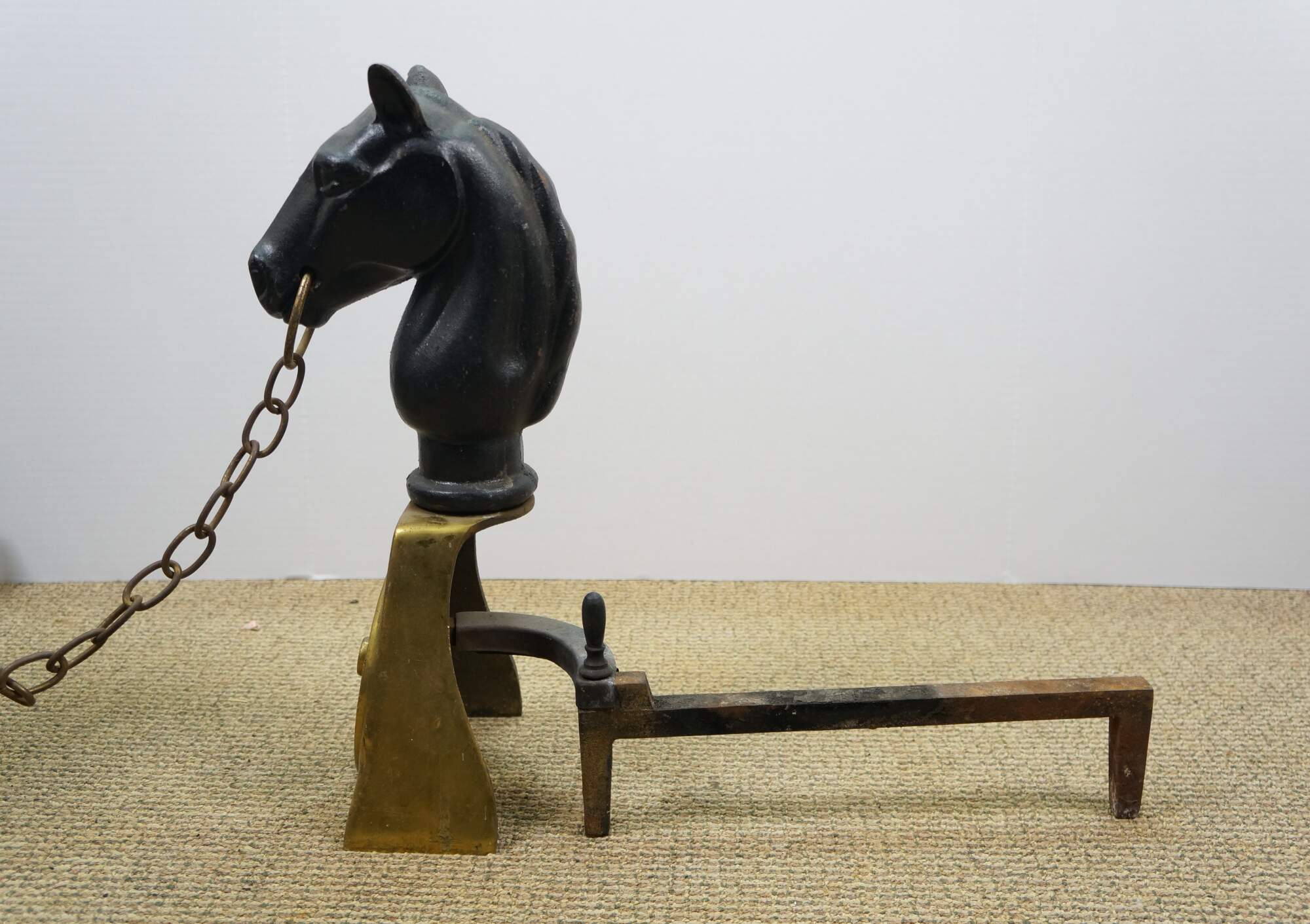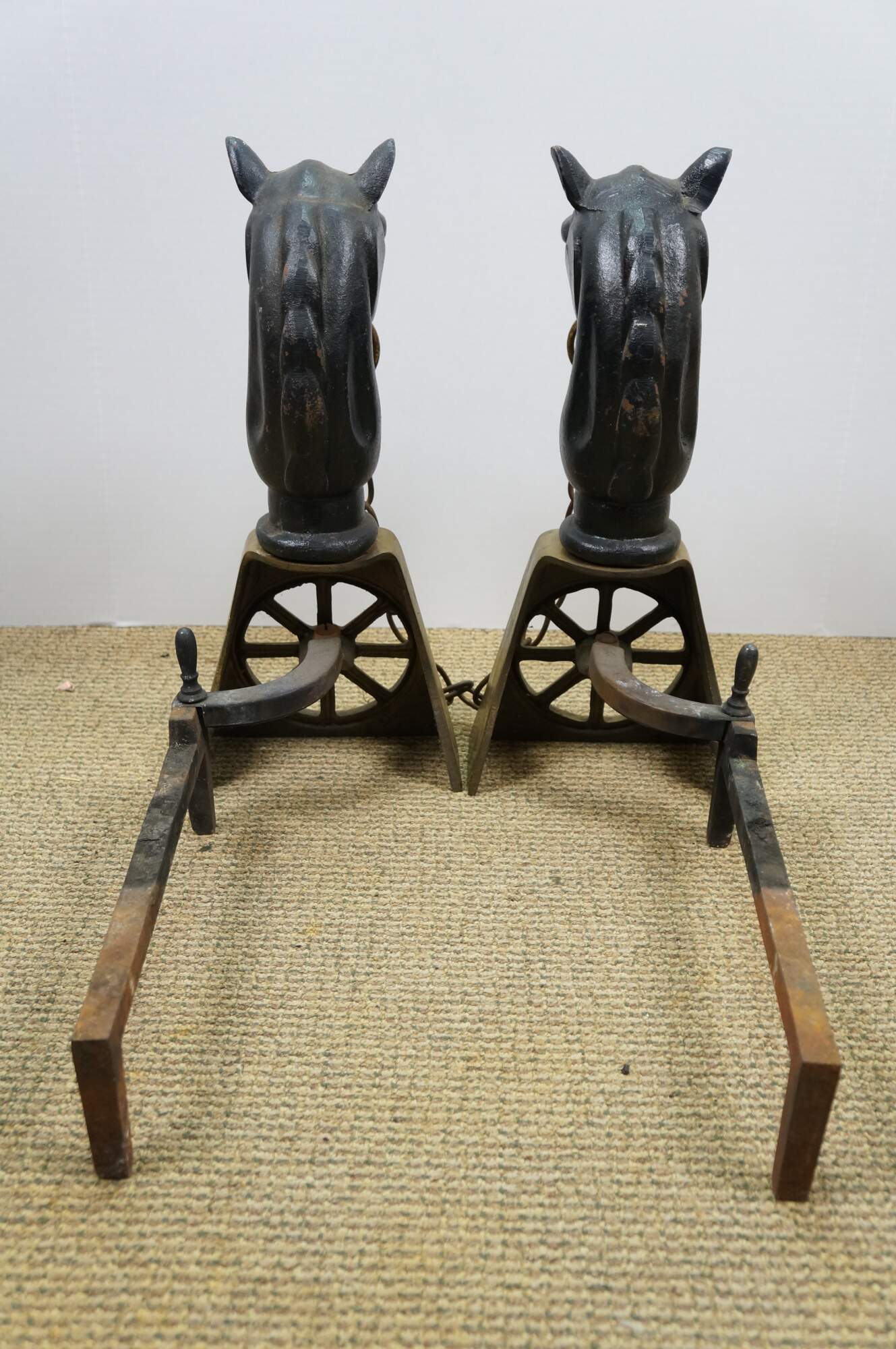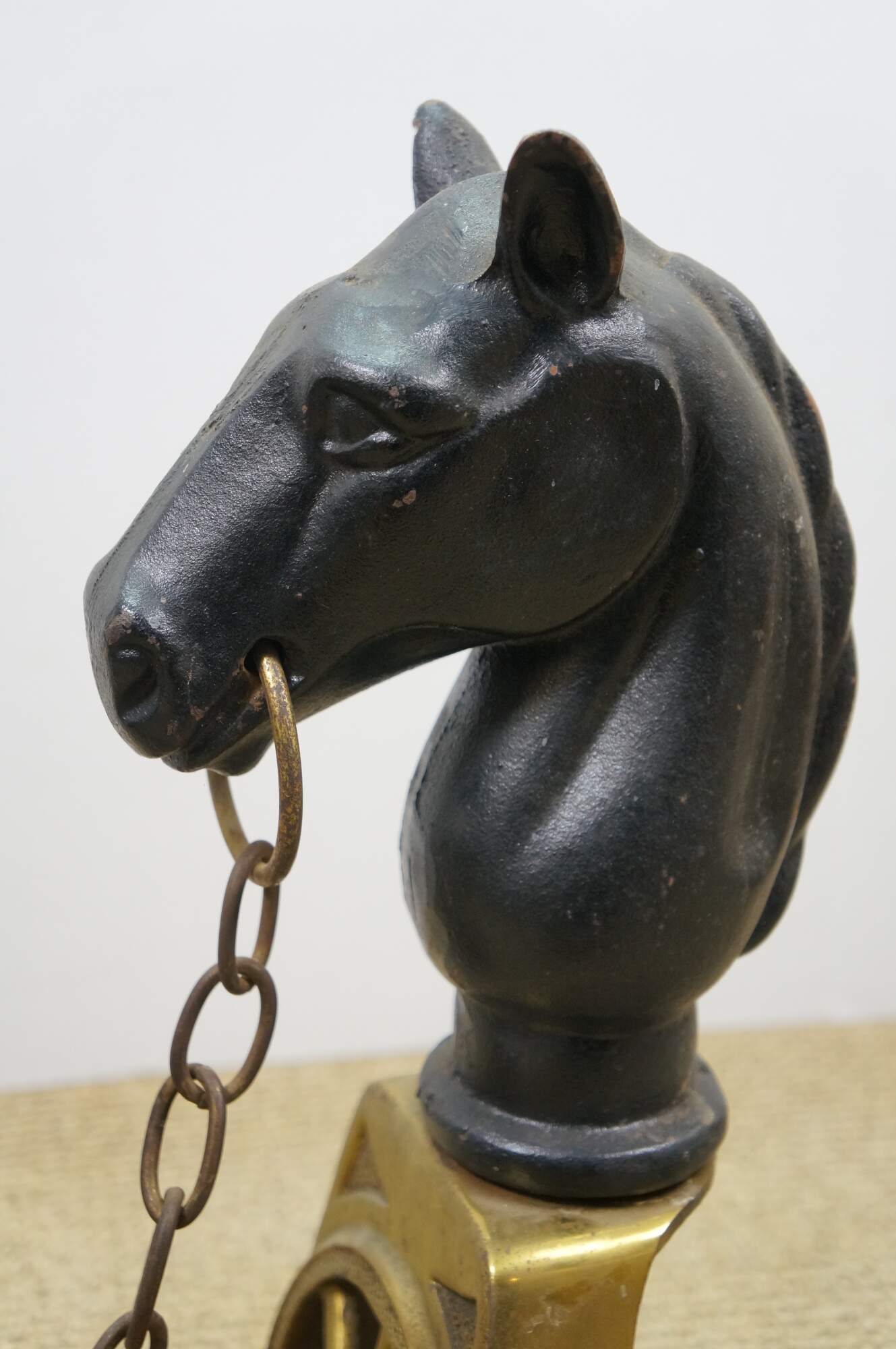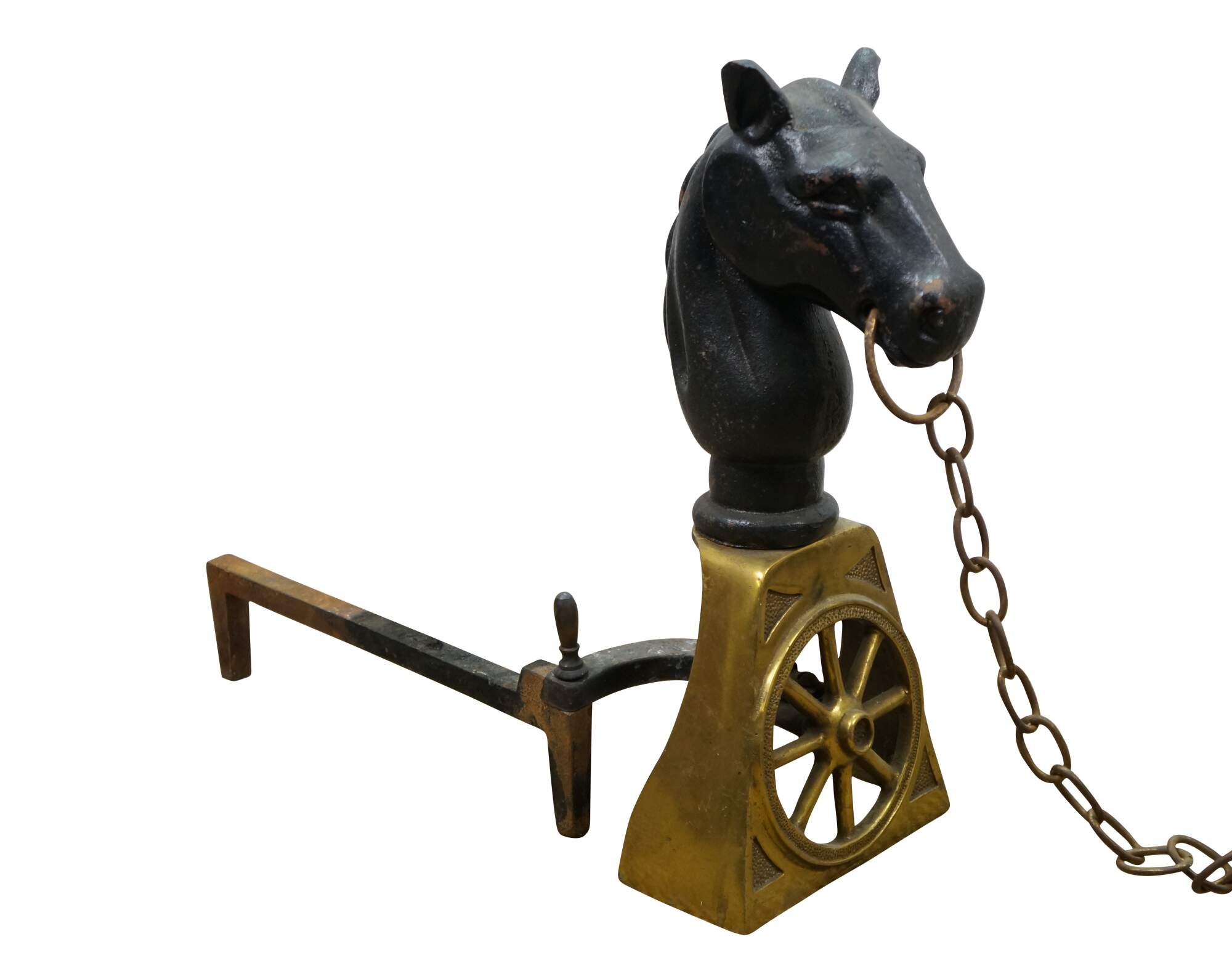 Pair of vintage fireplace andirons / fire dogs / hearthware featuring cast brass bases in the shape of wagon wheels, topped with iron horse heads, connected together with a brass horsebit chain. Ranch, Farmhouse, Stables.