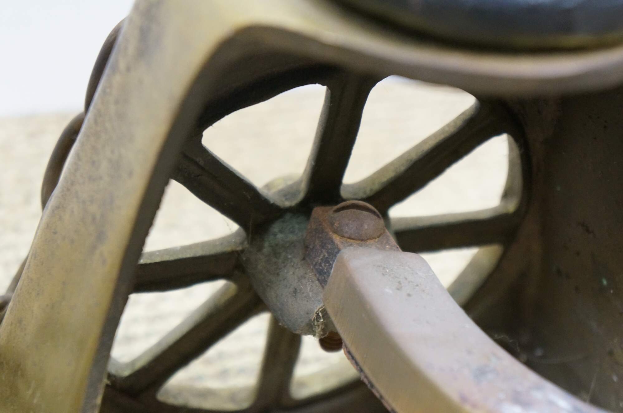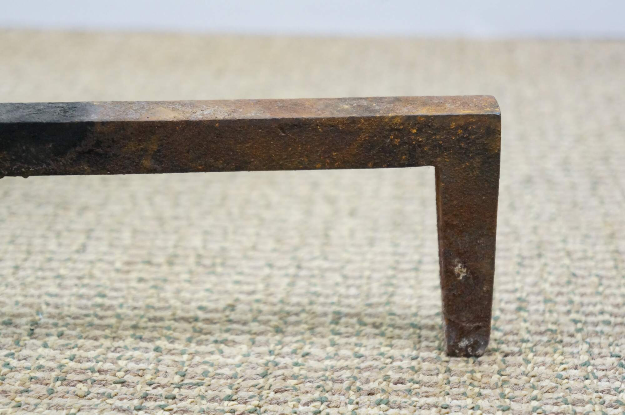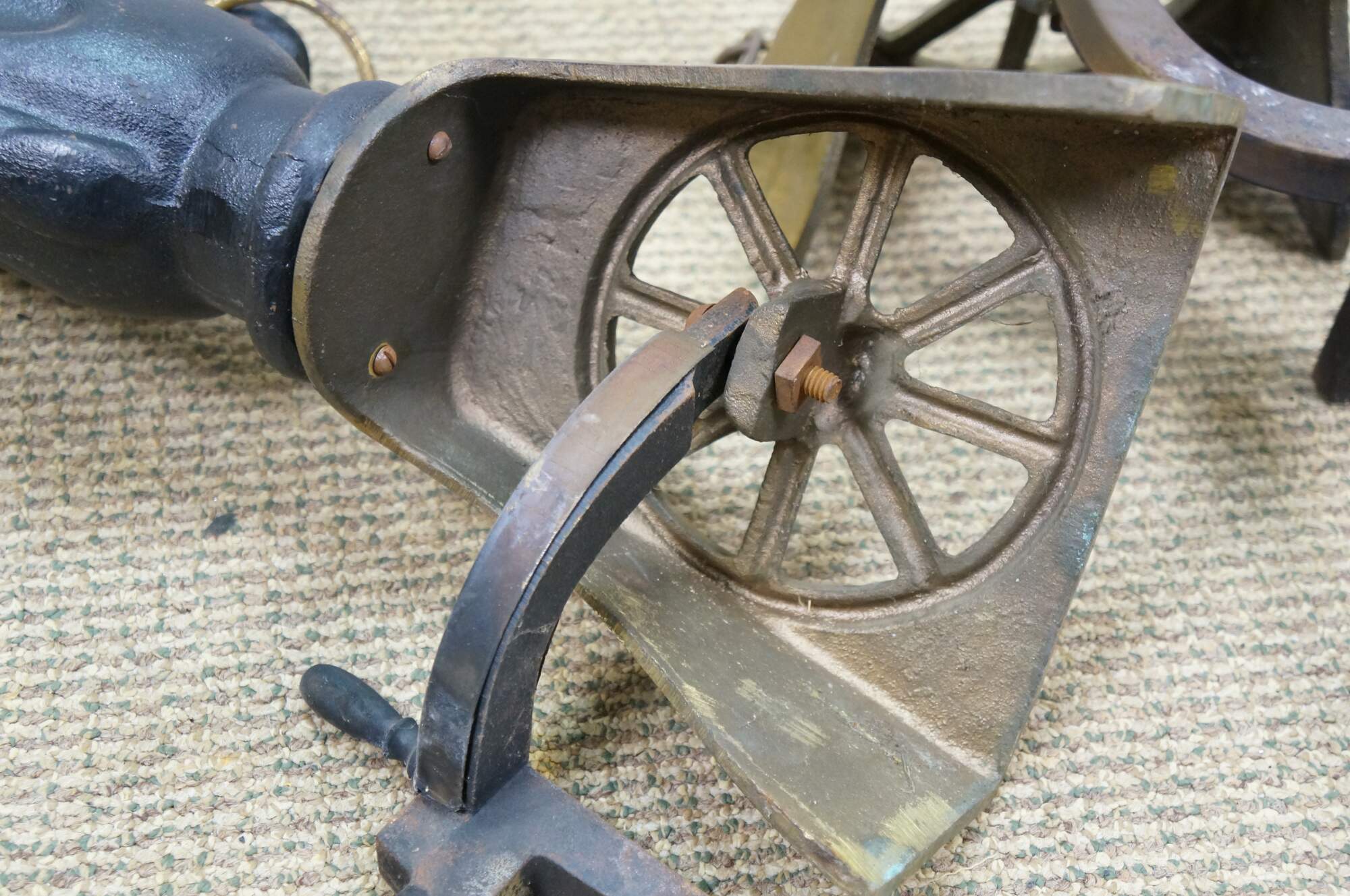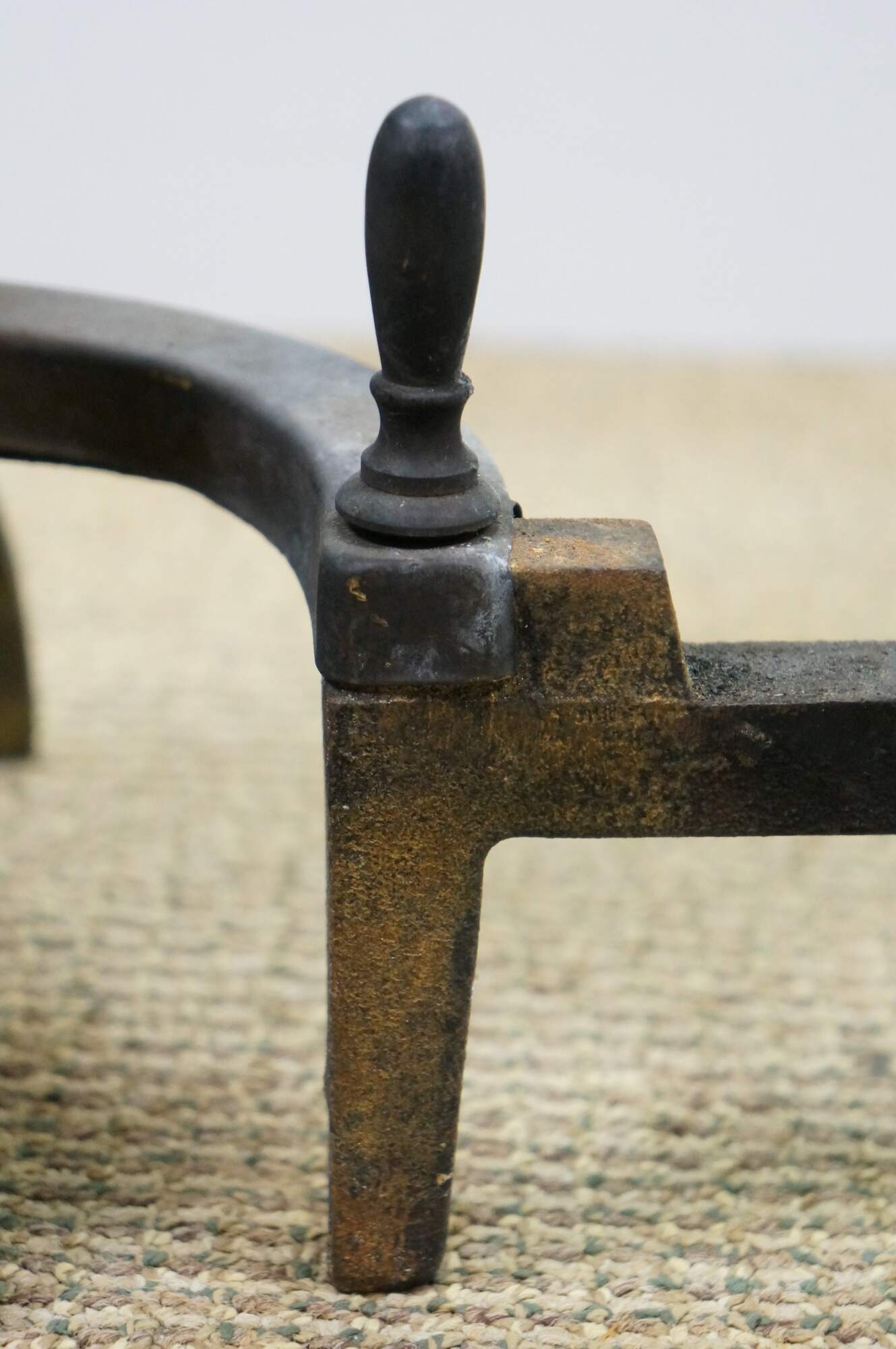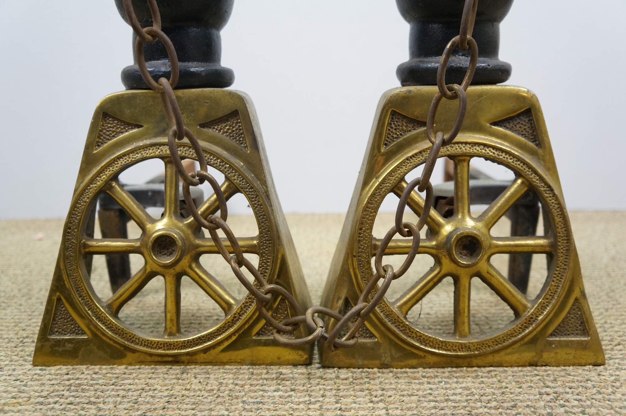 Pair of vintage fireplace andirons / fire dogs / hearthware featuring cast brass bases in the shape of wagon wheels, topped with iron horse heads, connected together with a brass horsebit chain. Ranch, Farmhouse, Stables.