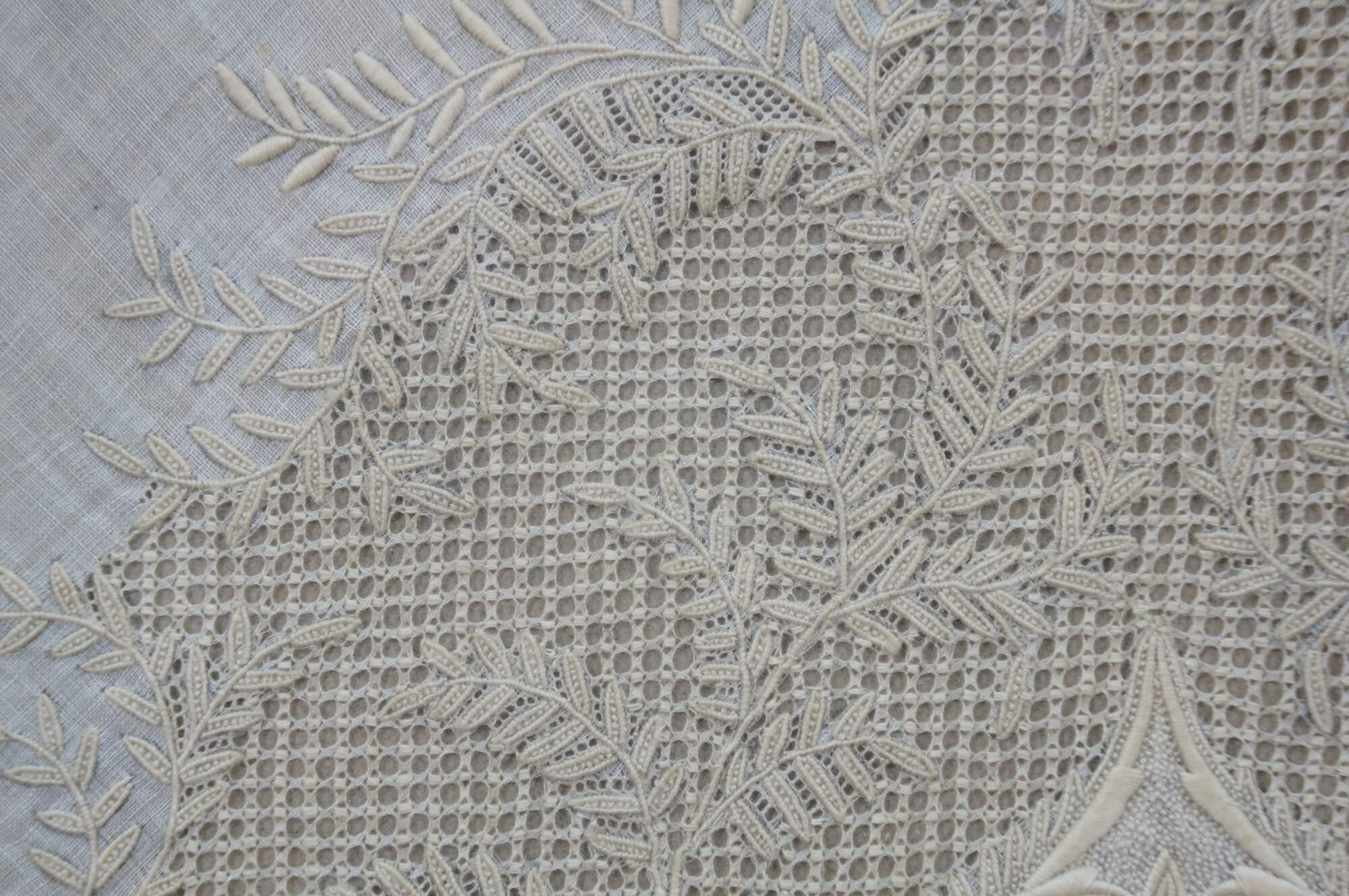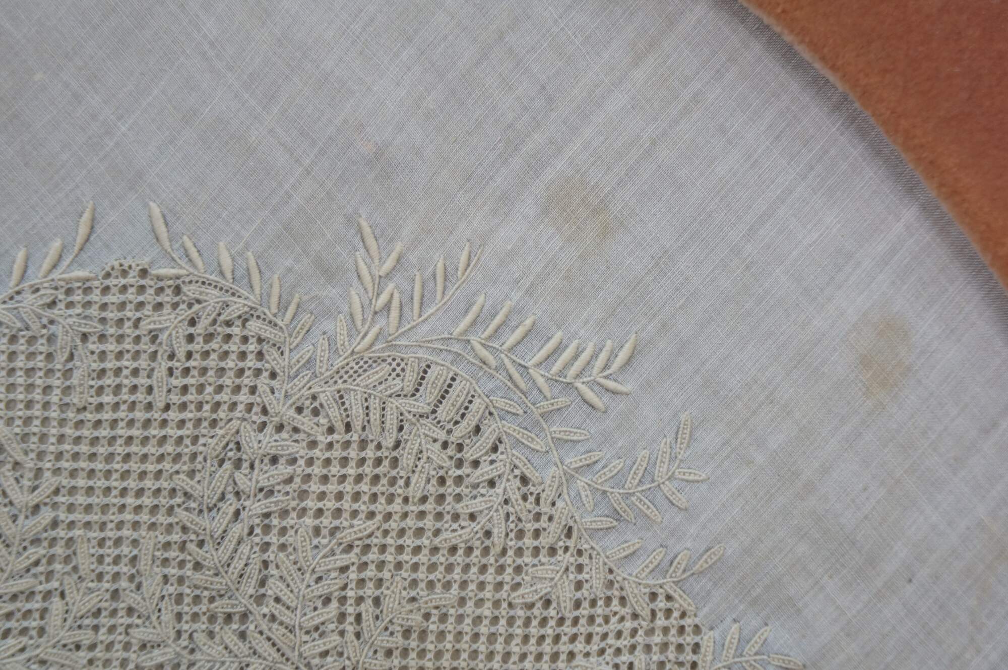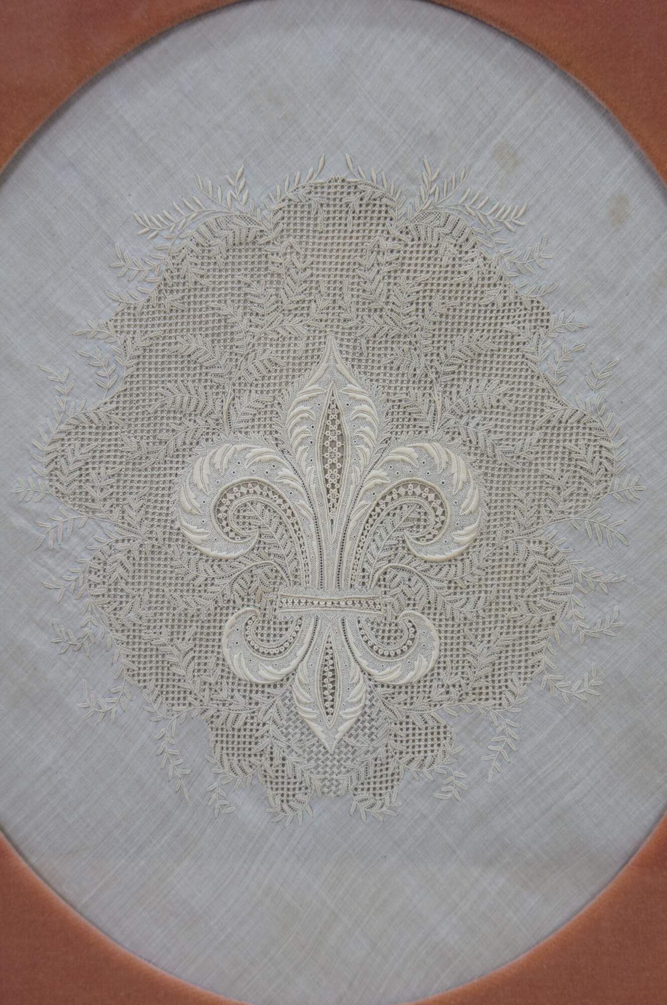 Antique framed piece of intricate lace and embroidery on white linen depicting a French fleur de lis surroundded swirling foliate leaves. Silver and gold beveled wood frame; burnt orange velvet mat.