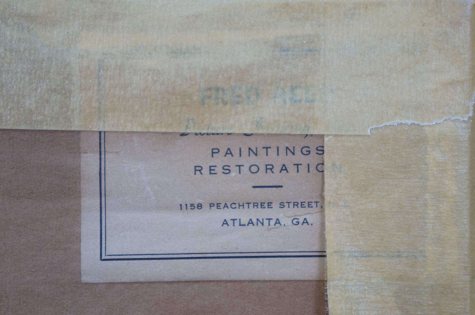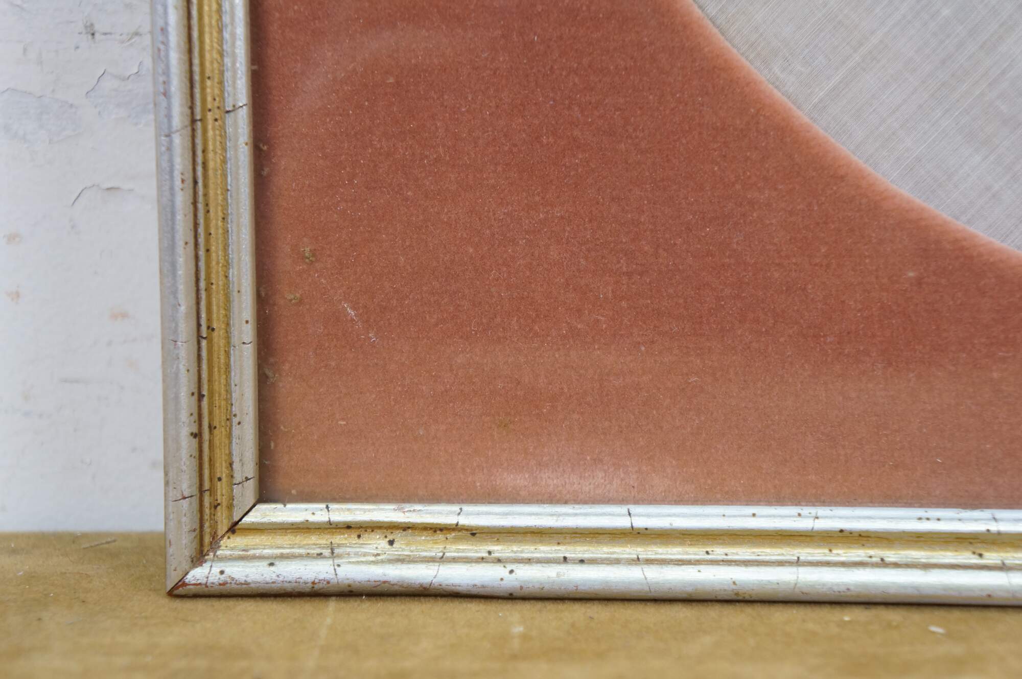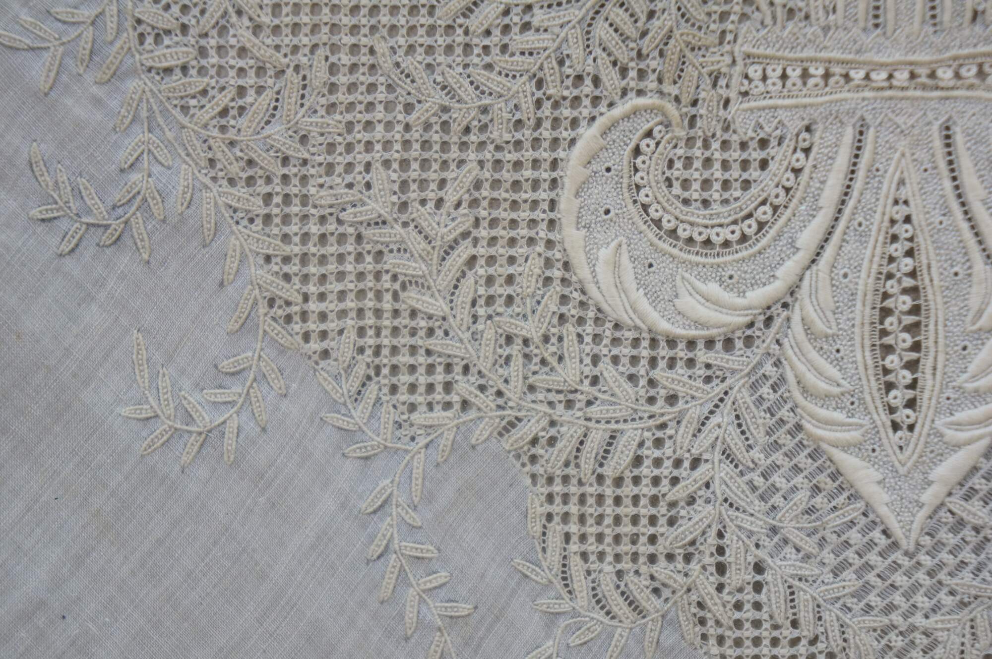 Antique framed piece of intricate lace and embroidery on white linen depicting a French fleur de lis surroundded swirling foliate leaves. Silver and gold beveled wood frame; burnt orange velvet mat.
