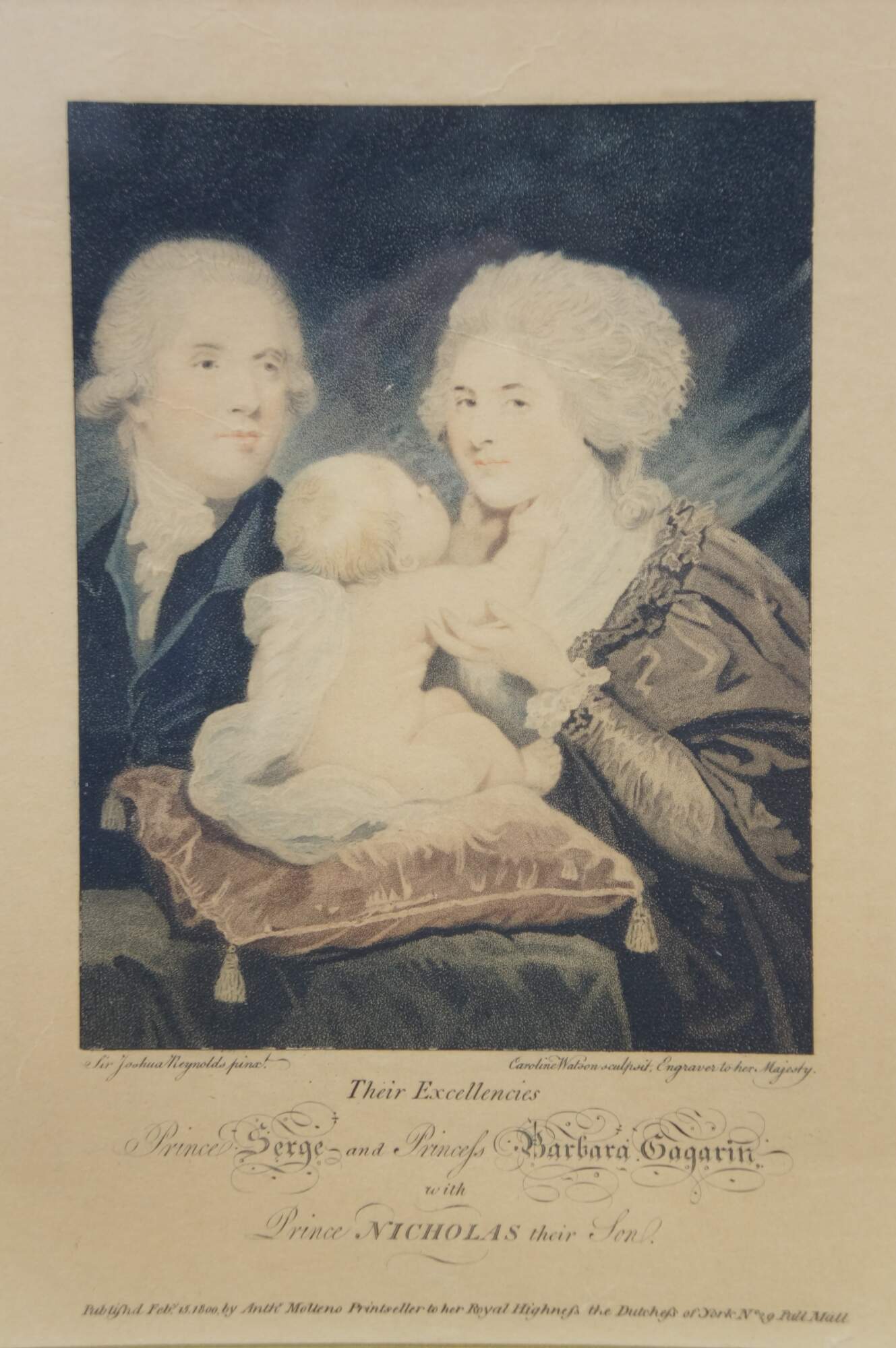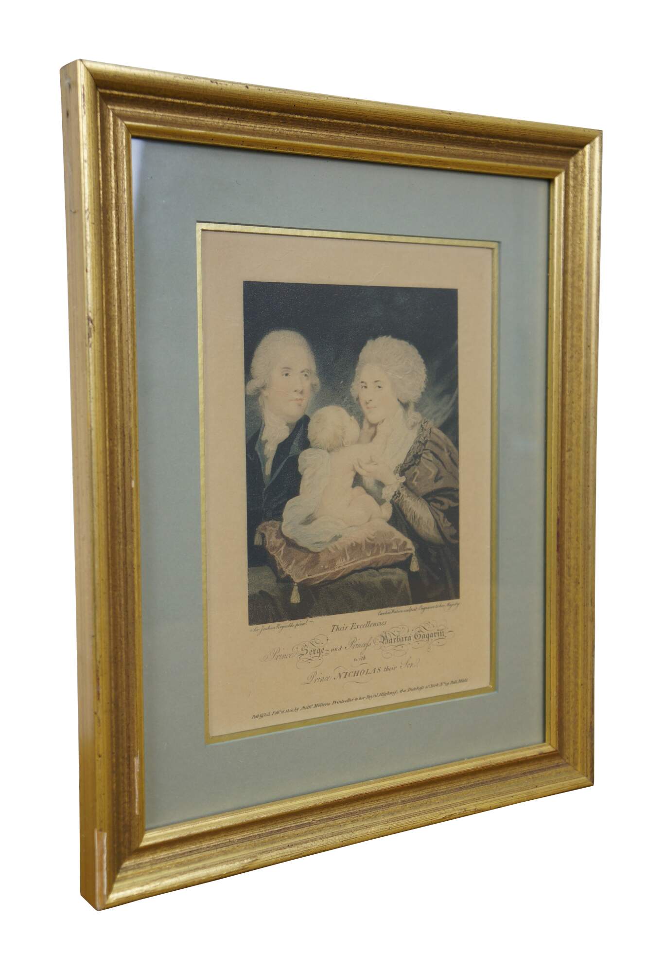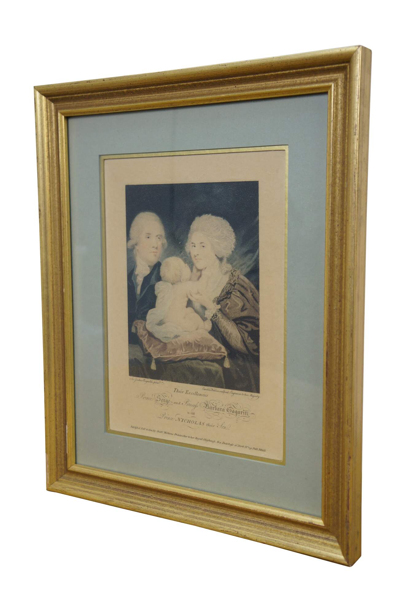 Antique circa 1800 auquatint and stipple engraving of Their Excellencies Prince Serge (Count Sergei Sergeyevich Gagarin) and Princess Barbara (Countess Varvara Nikolaevna Gagarina) with Prince Nicholas their Son, after a painting by Sir Joshua Reynolds, engraved by Caroline Watson, Engraver to her Majesty. Published Feb. 15, 1800 by Anthony Molteno, Printseller to her Royal Highness the Duchess of York, No 29 Pall Mall. Inherited from an estate and reframed in 1975. Beveled gilt wood frame; pale blue and gold layered mat.