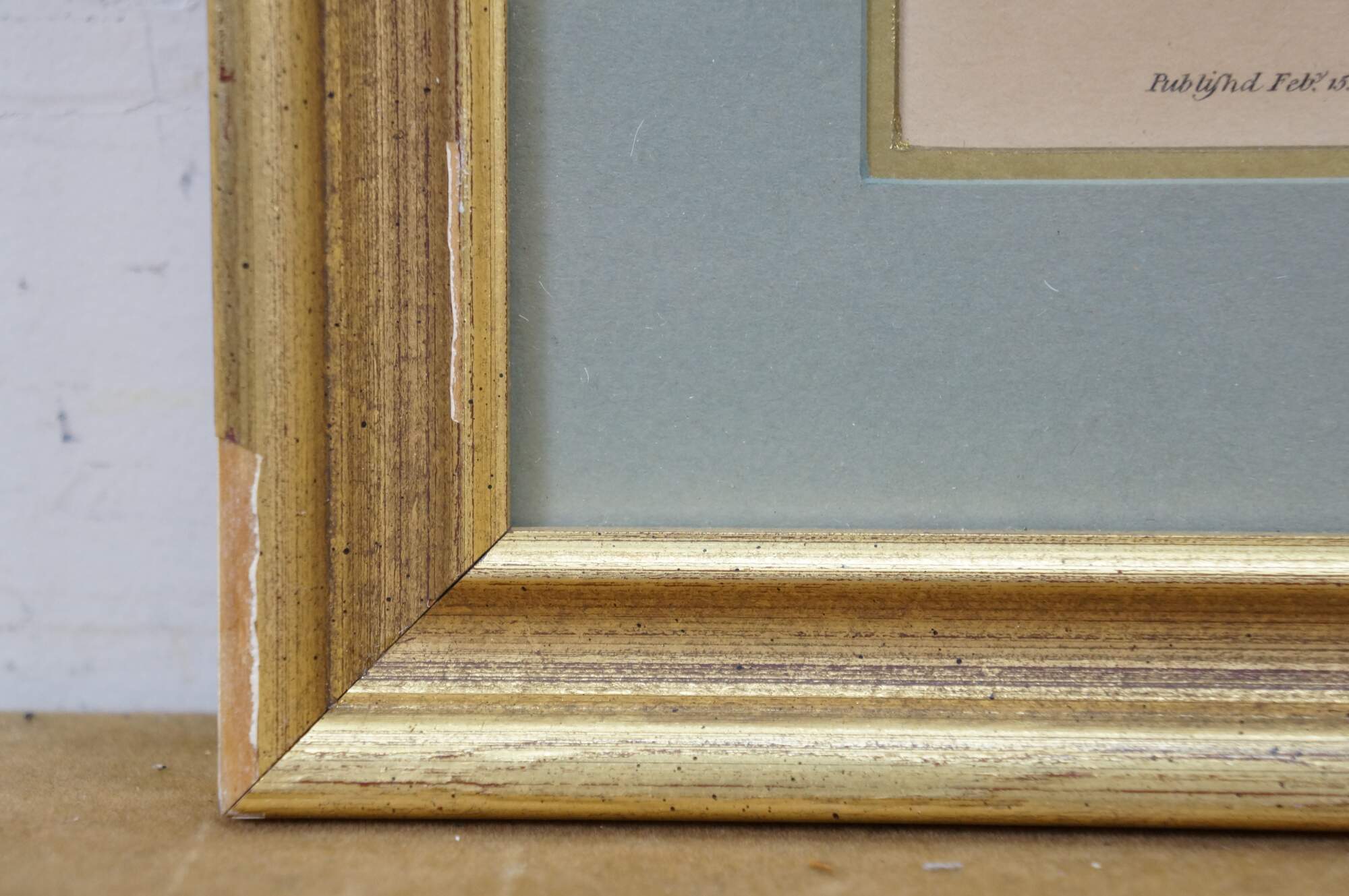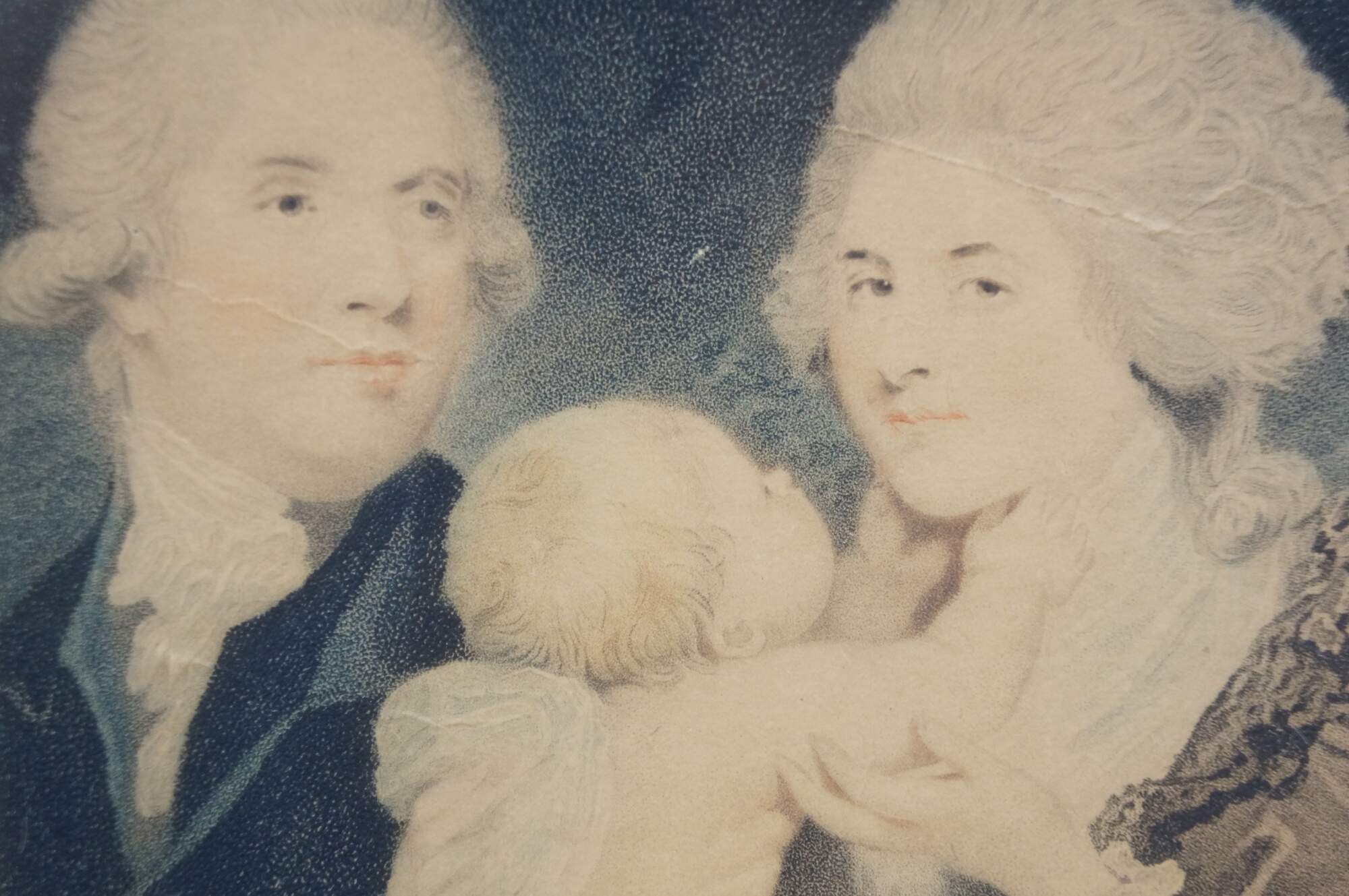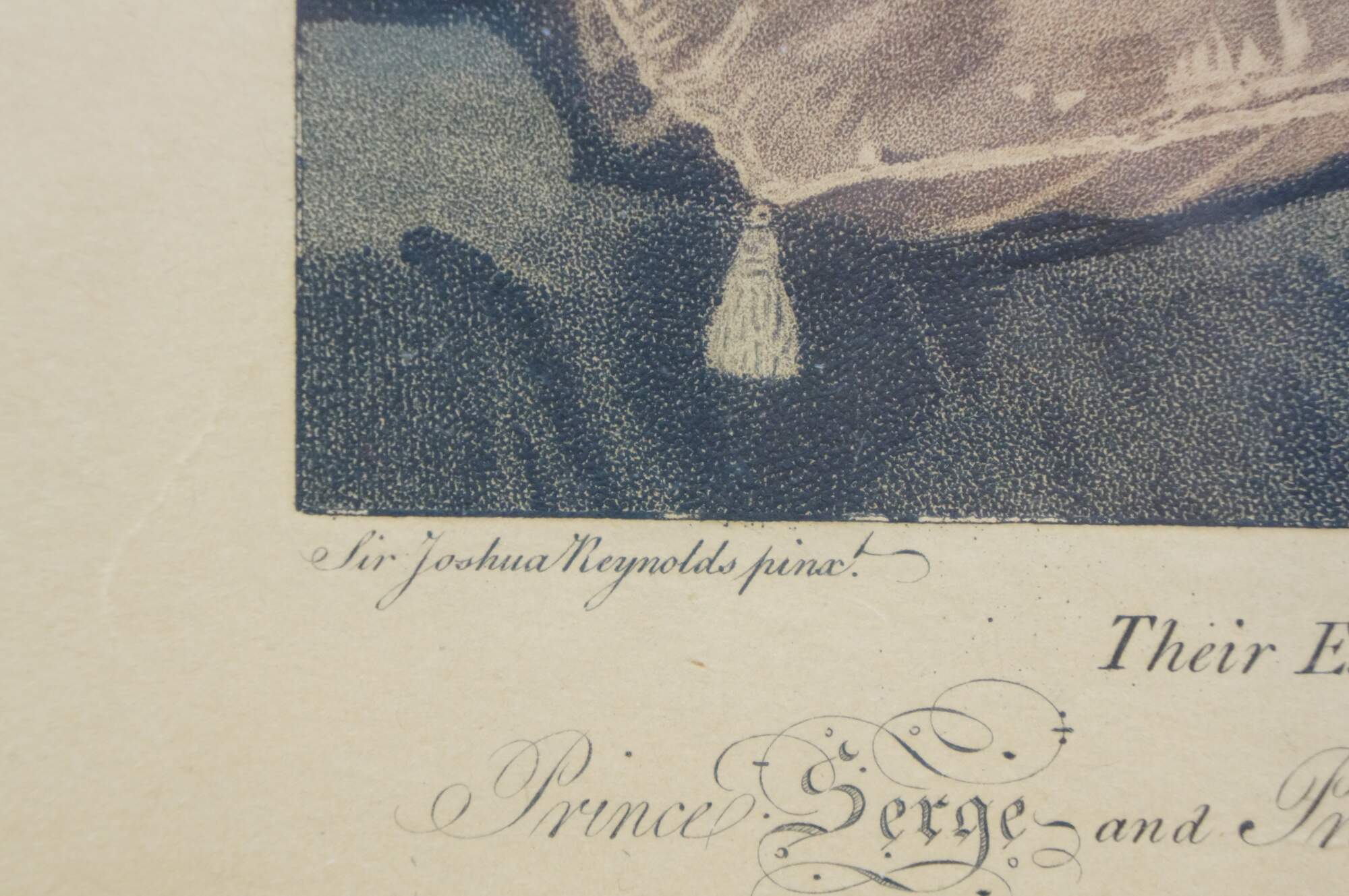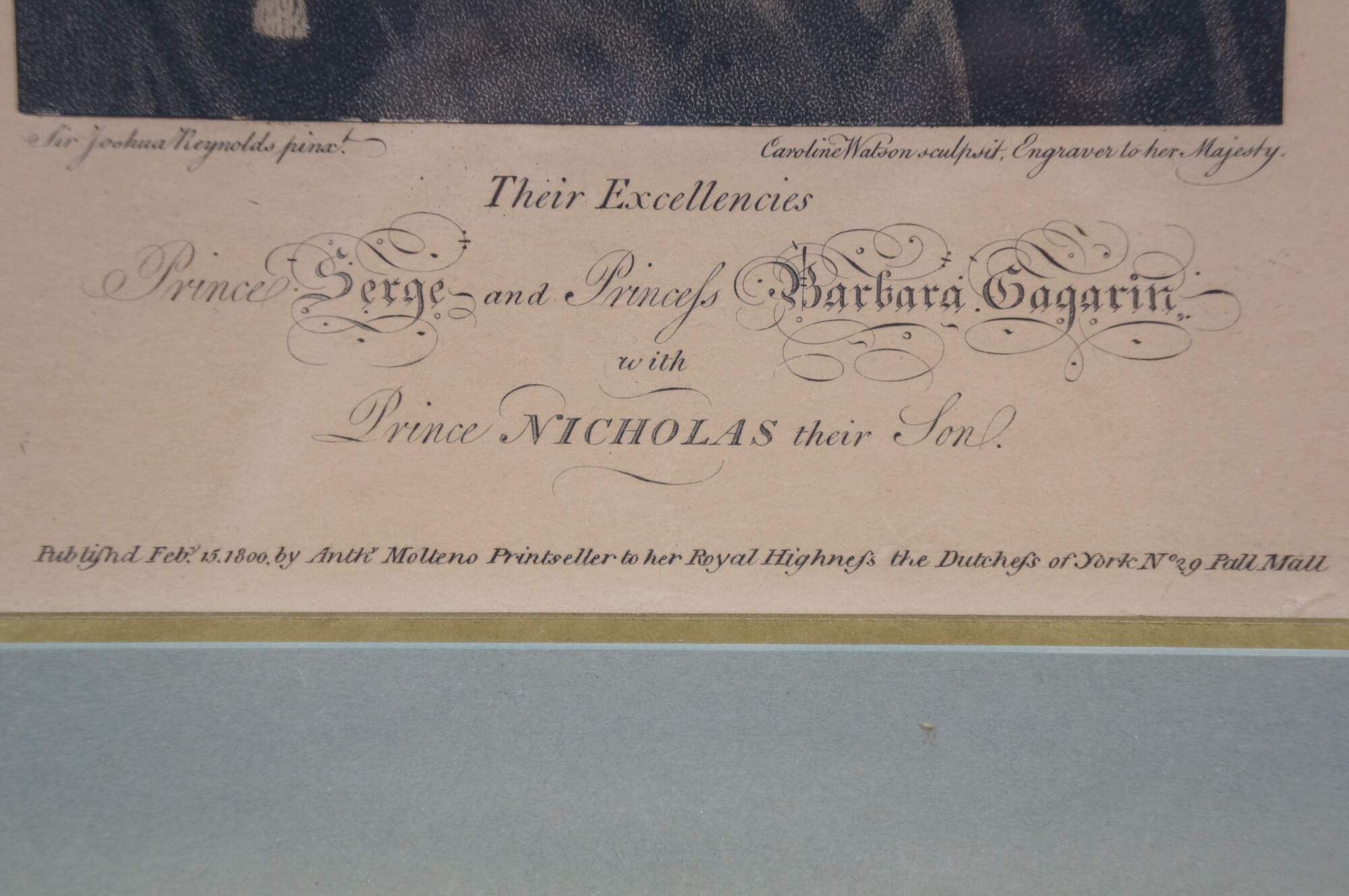 Antique circa 1800 auquatint and stipple engraving of Their Excellencies Prince Serge (Count Sergei Sergeyevich Gagarin) and Princess Barbara (Countess Varvara Nikolaevna Gagarina) with Prince Nicholas their Son, after a painting by Sir Joshua Reynolds, engraved by Caroline Watson, Engraver to her Majesty. Published Feb. 15, 1800 by Anthony Molteno, Printseller to her Royal Highness the Duchess of York, No 29 Pall Mall. Inherited from an estate and reframed in 1975. Beveled gilt wood frame; pale blue and gold layered mat.