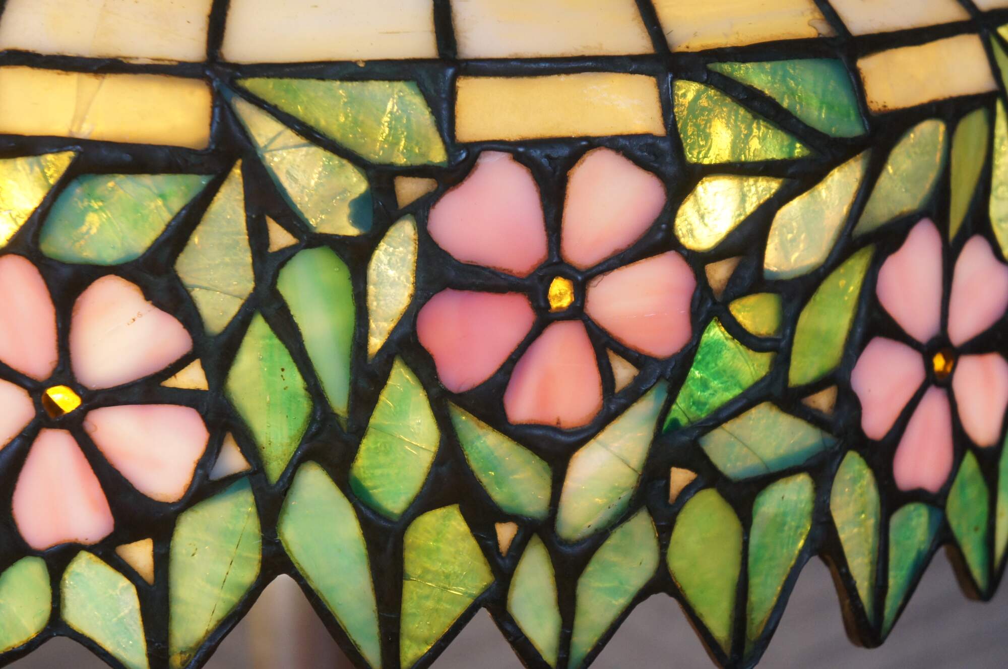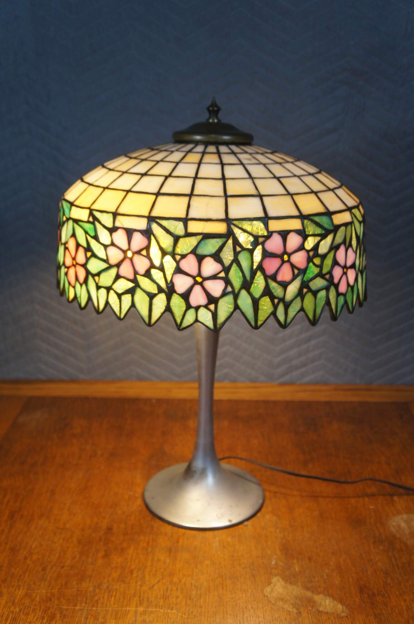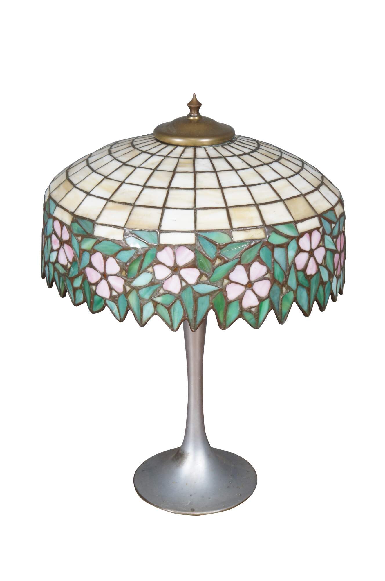 Antique mid to early 20th century two-light aluminum-based table lamp with a unique Tiffany-style stained glass shade featuring an off-white lattice / grid trimmed with drooping leaves and pink flowers.