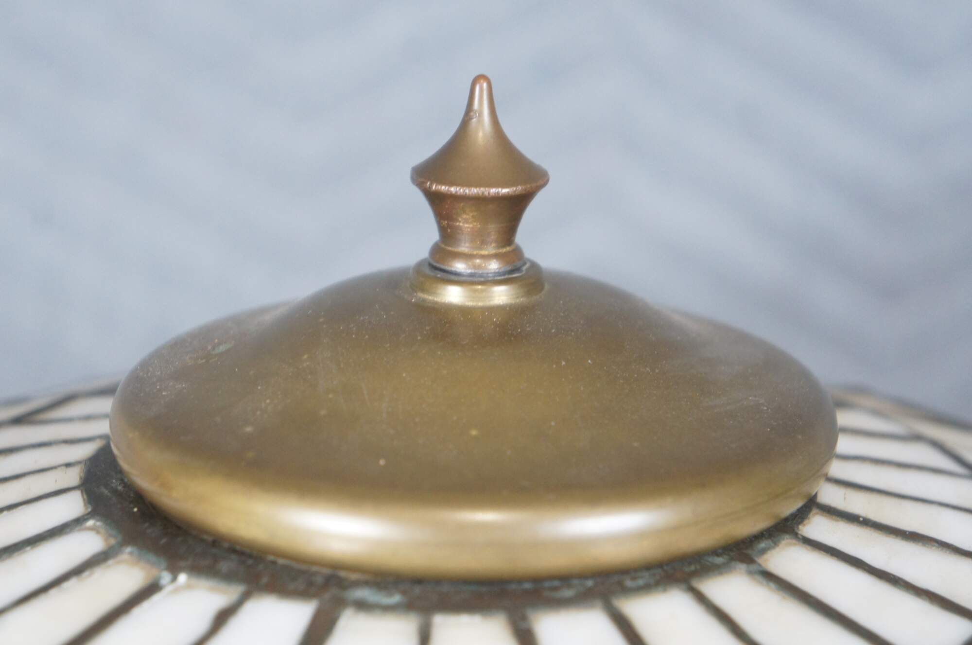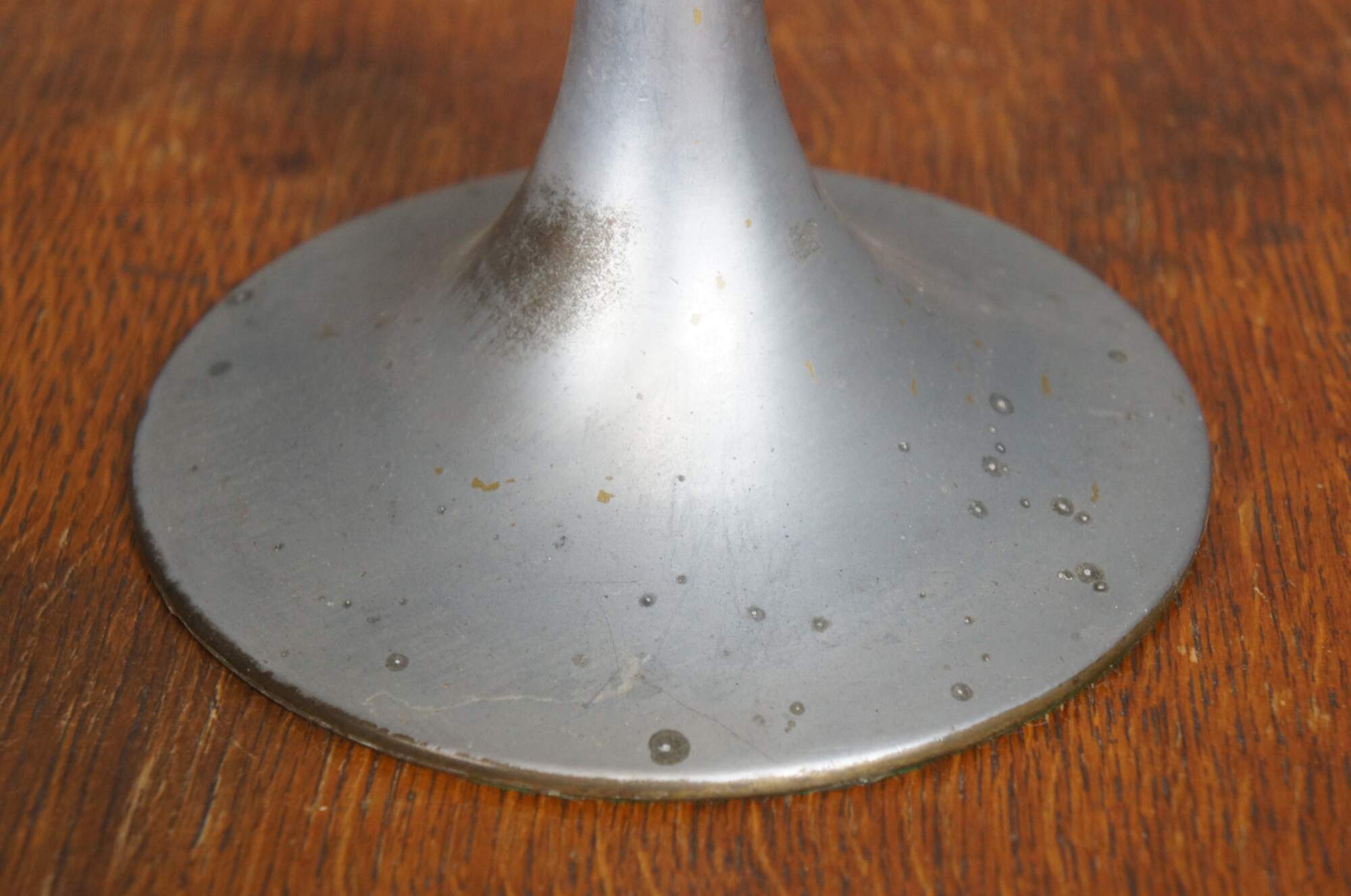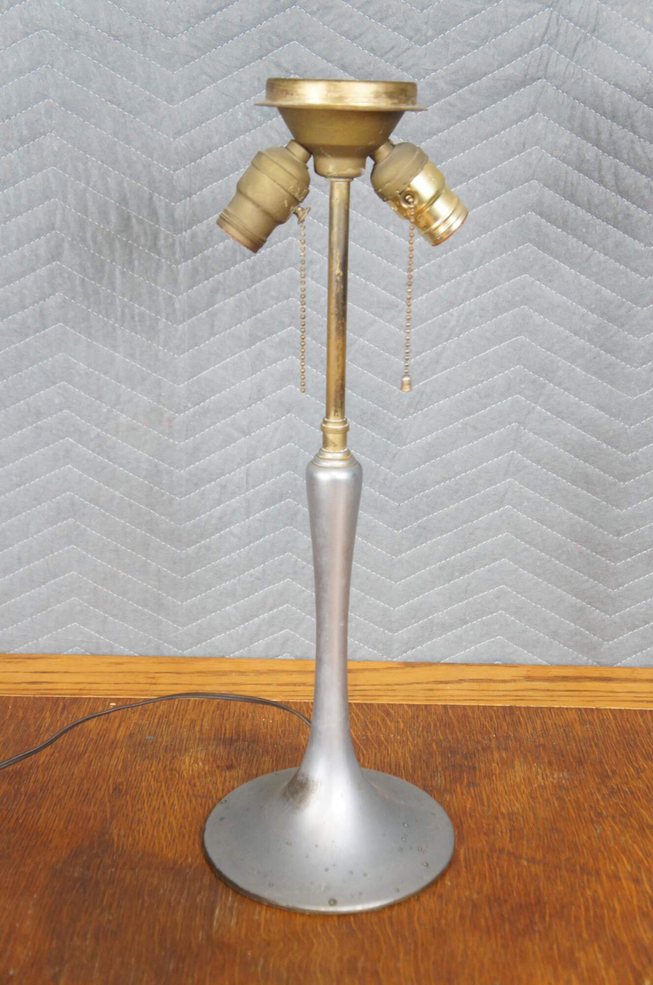 Fair condition, structurally solid, wear and distressing from age and use, warp to shade; some hairline cracks, finish loss / pitting, missing end of pull on one bulb.