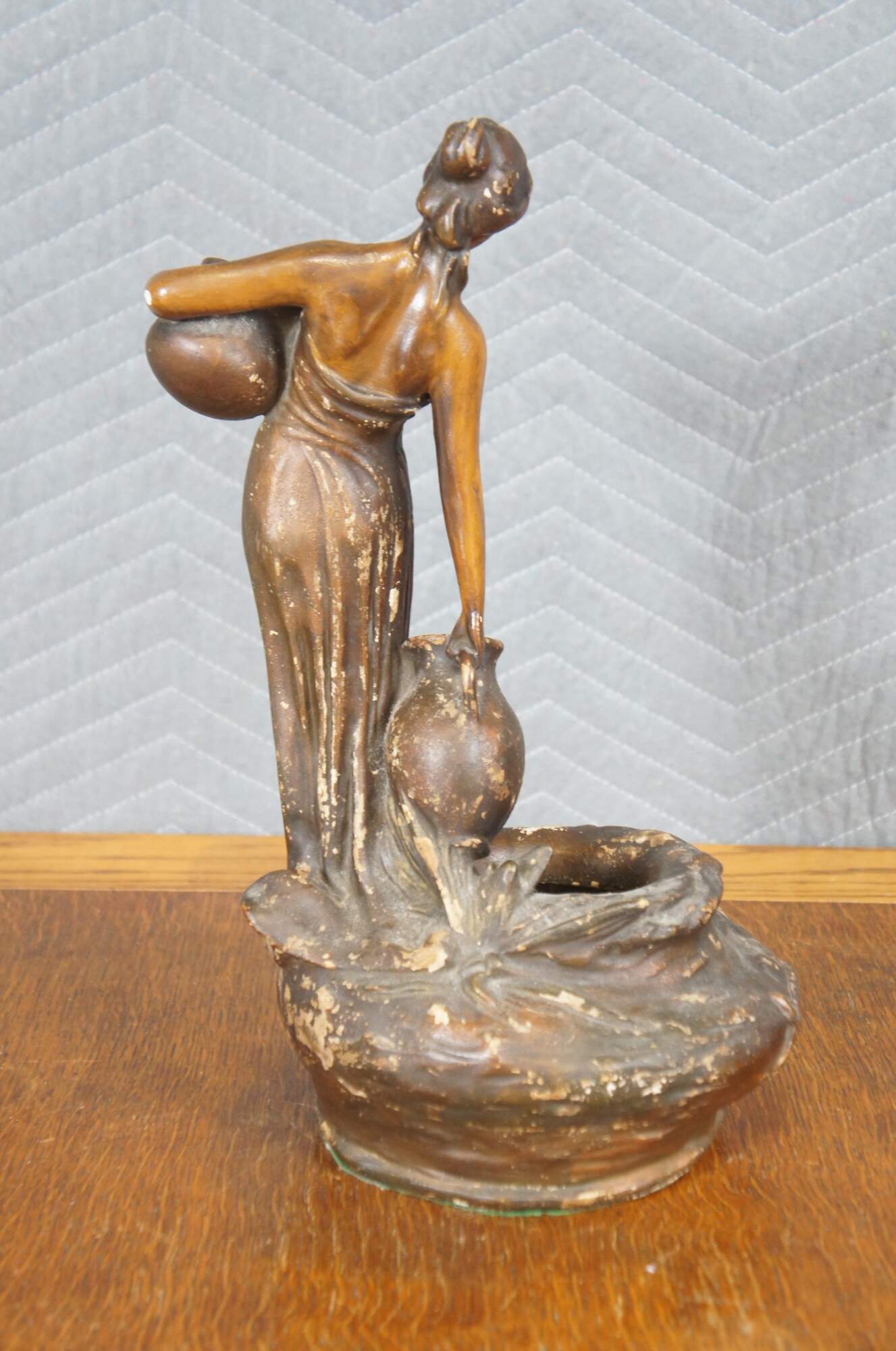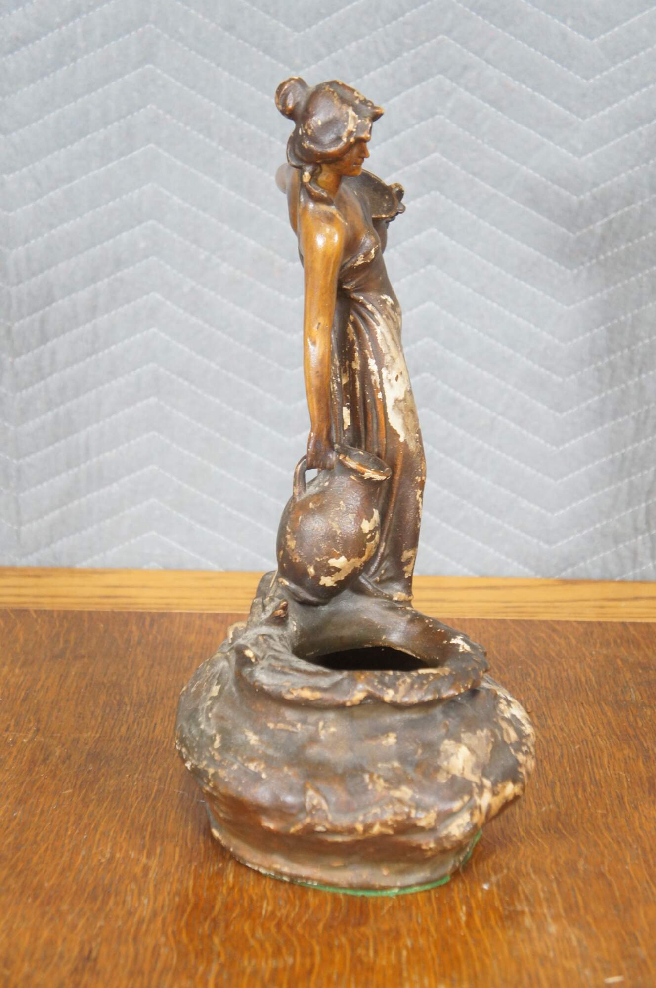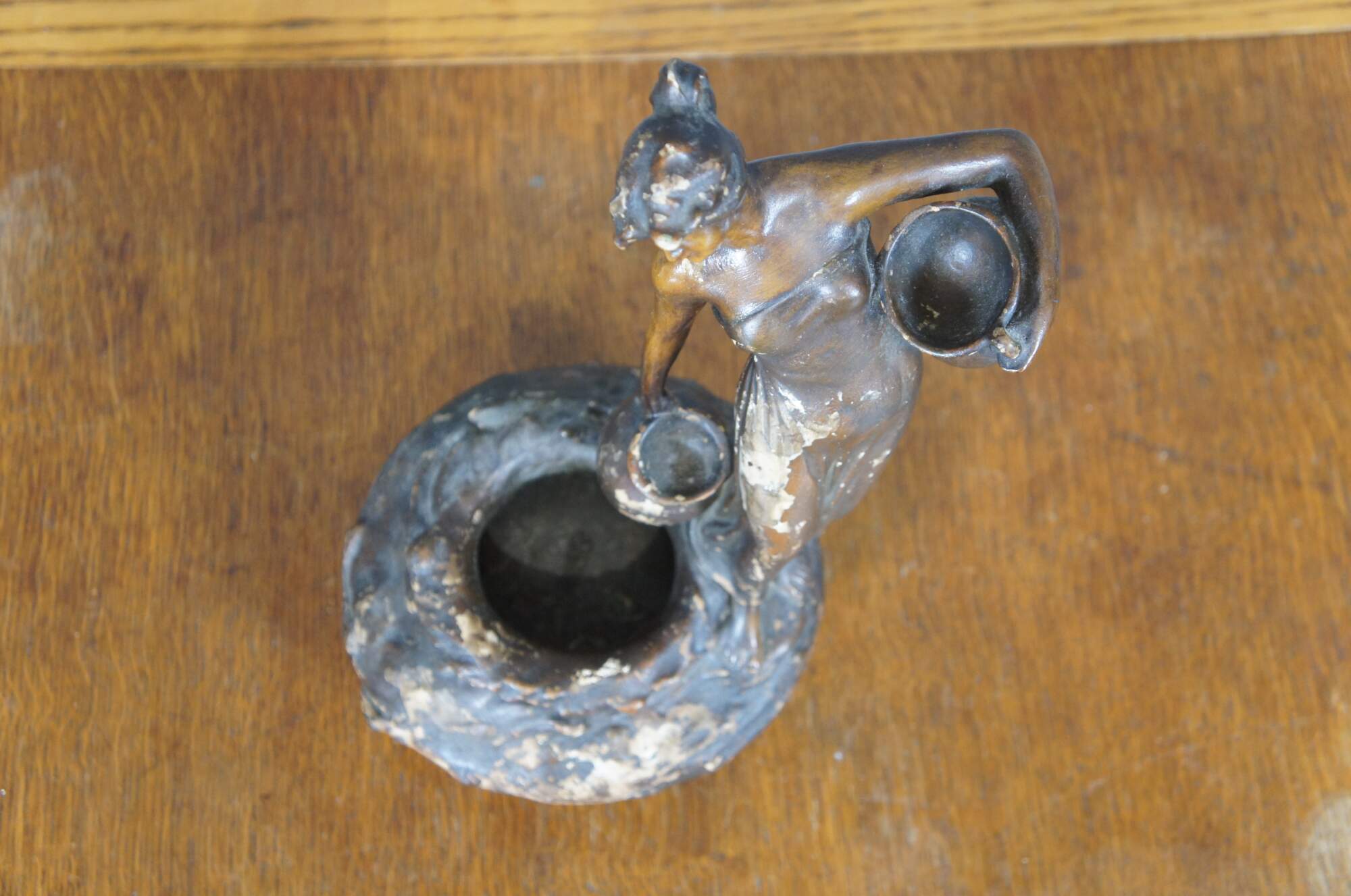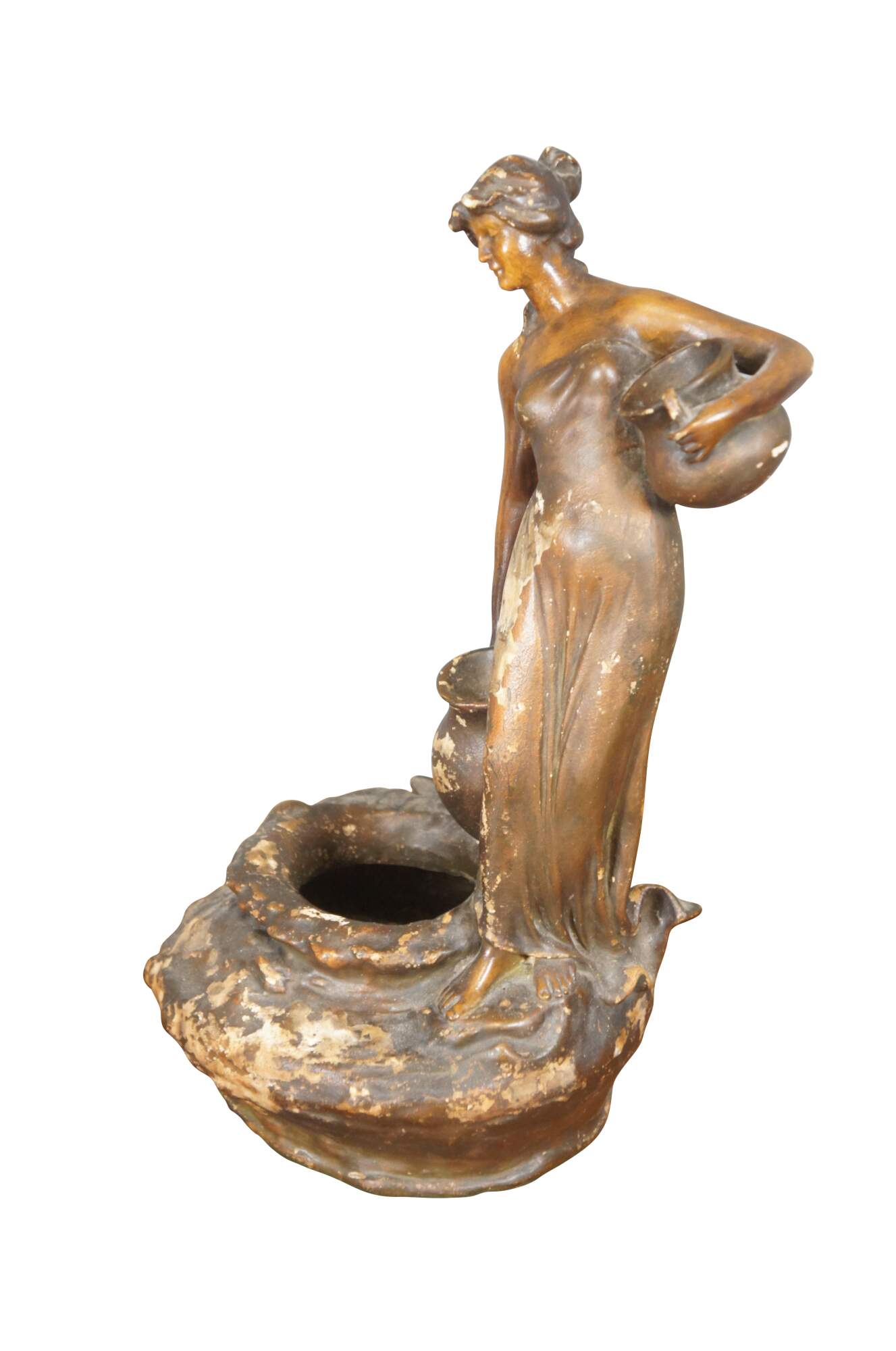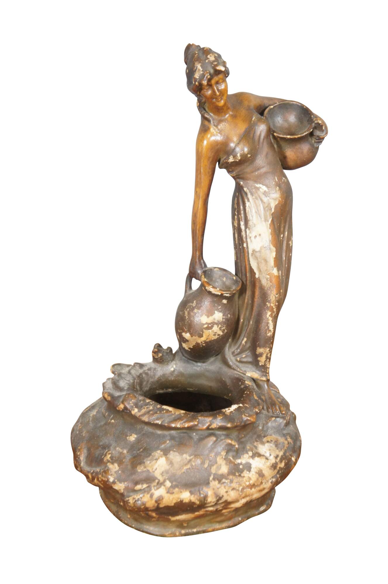 Mid to early 20th century brown painted chalkware figurine / short vase in the shape of tall neoclassical / art nouveau styled woman carrying water jugs at the edge of a well.