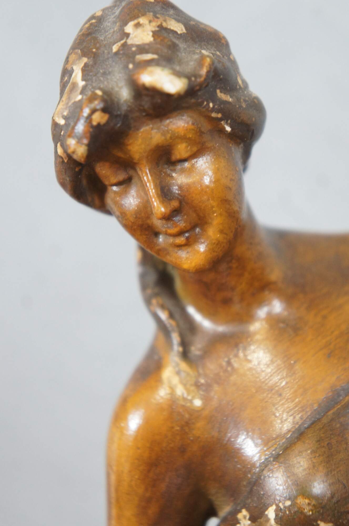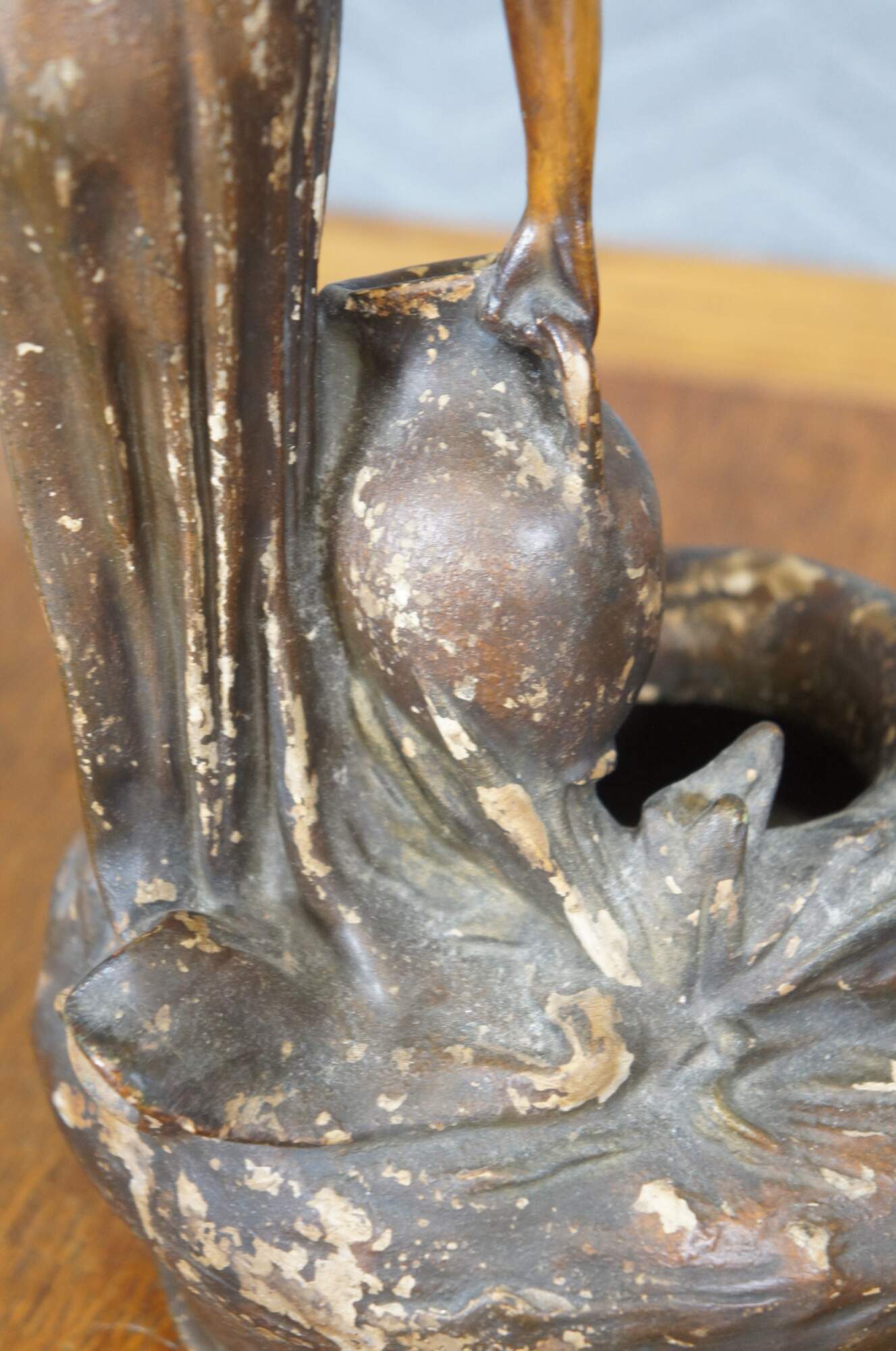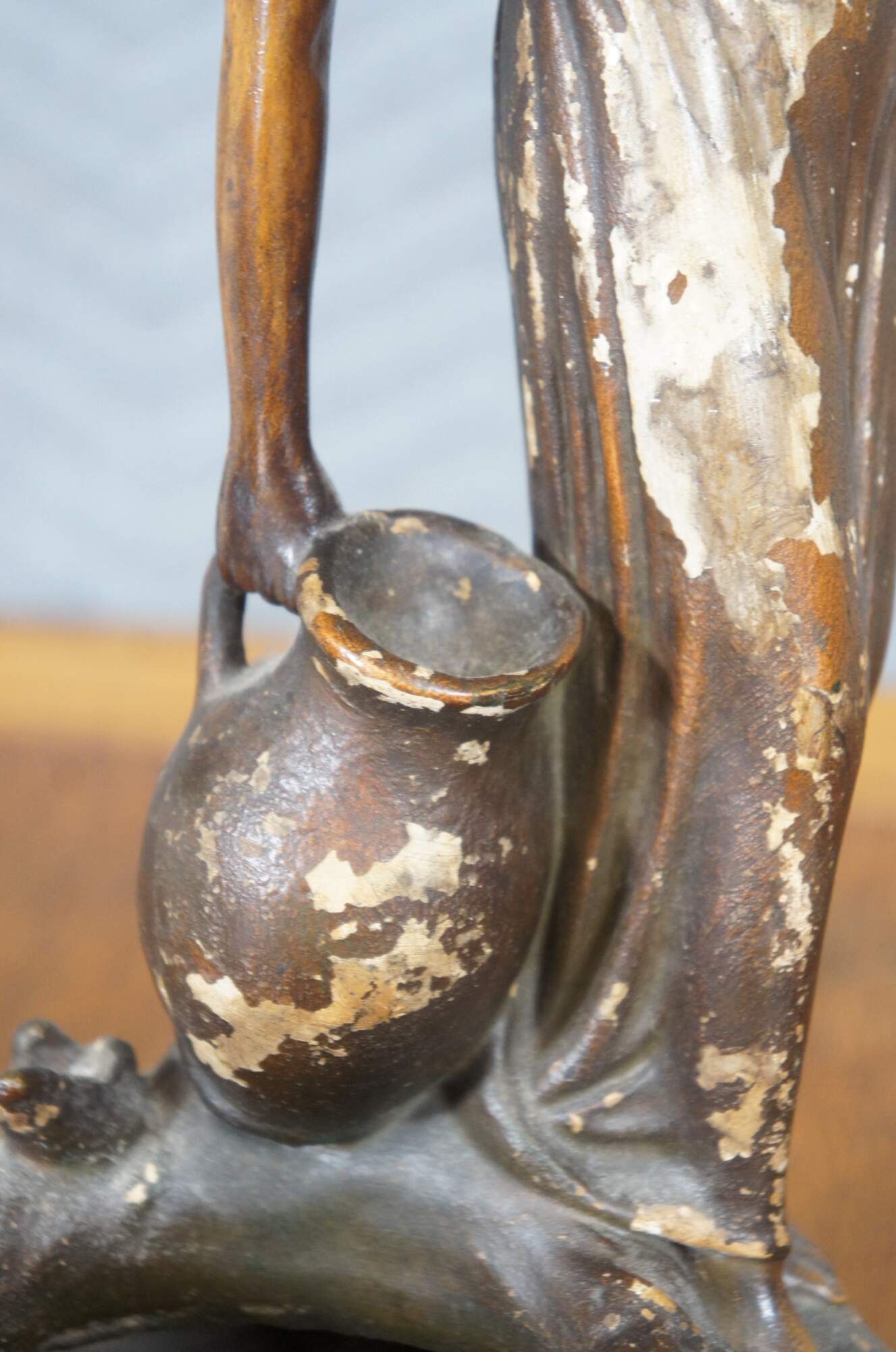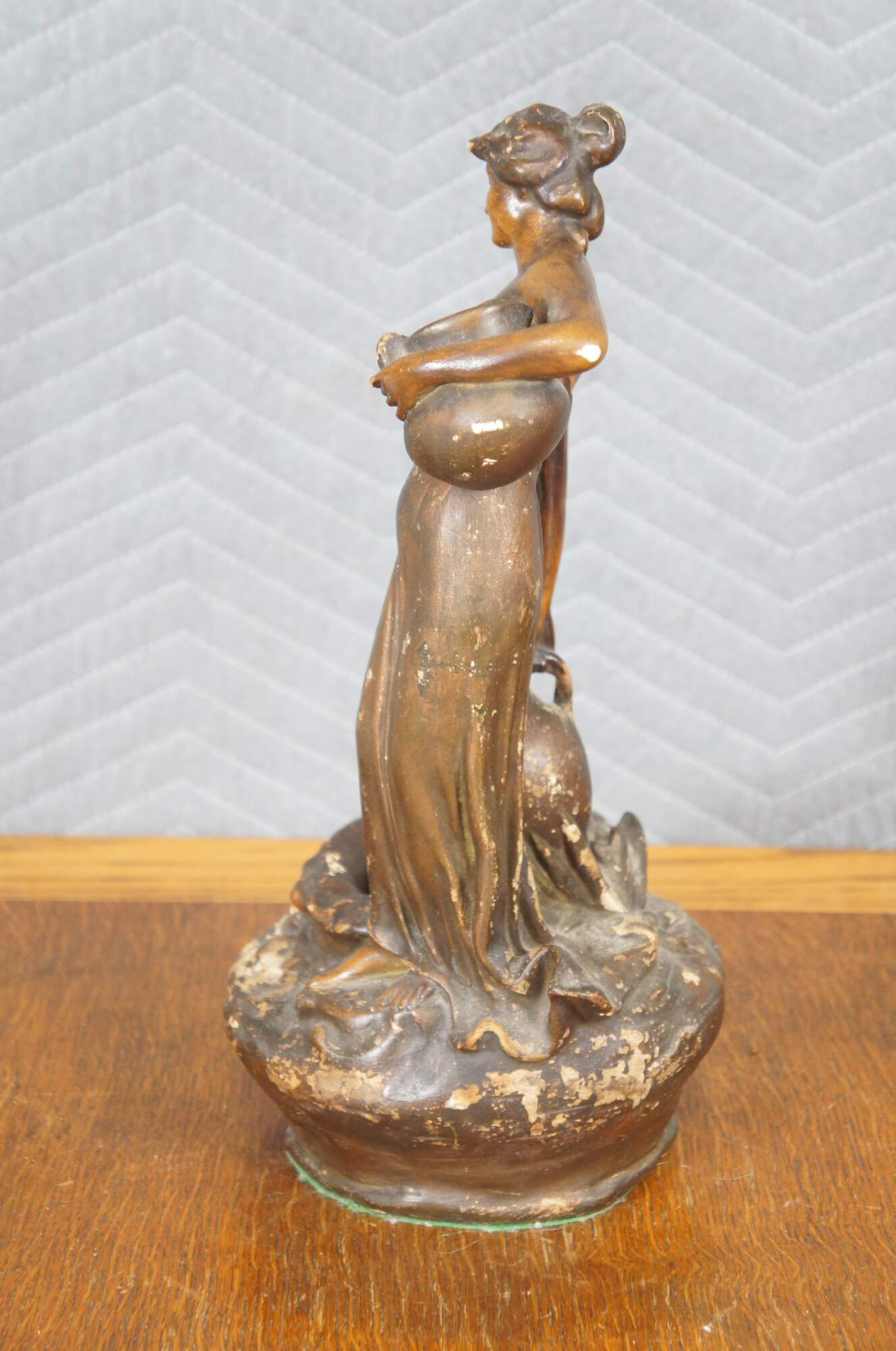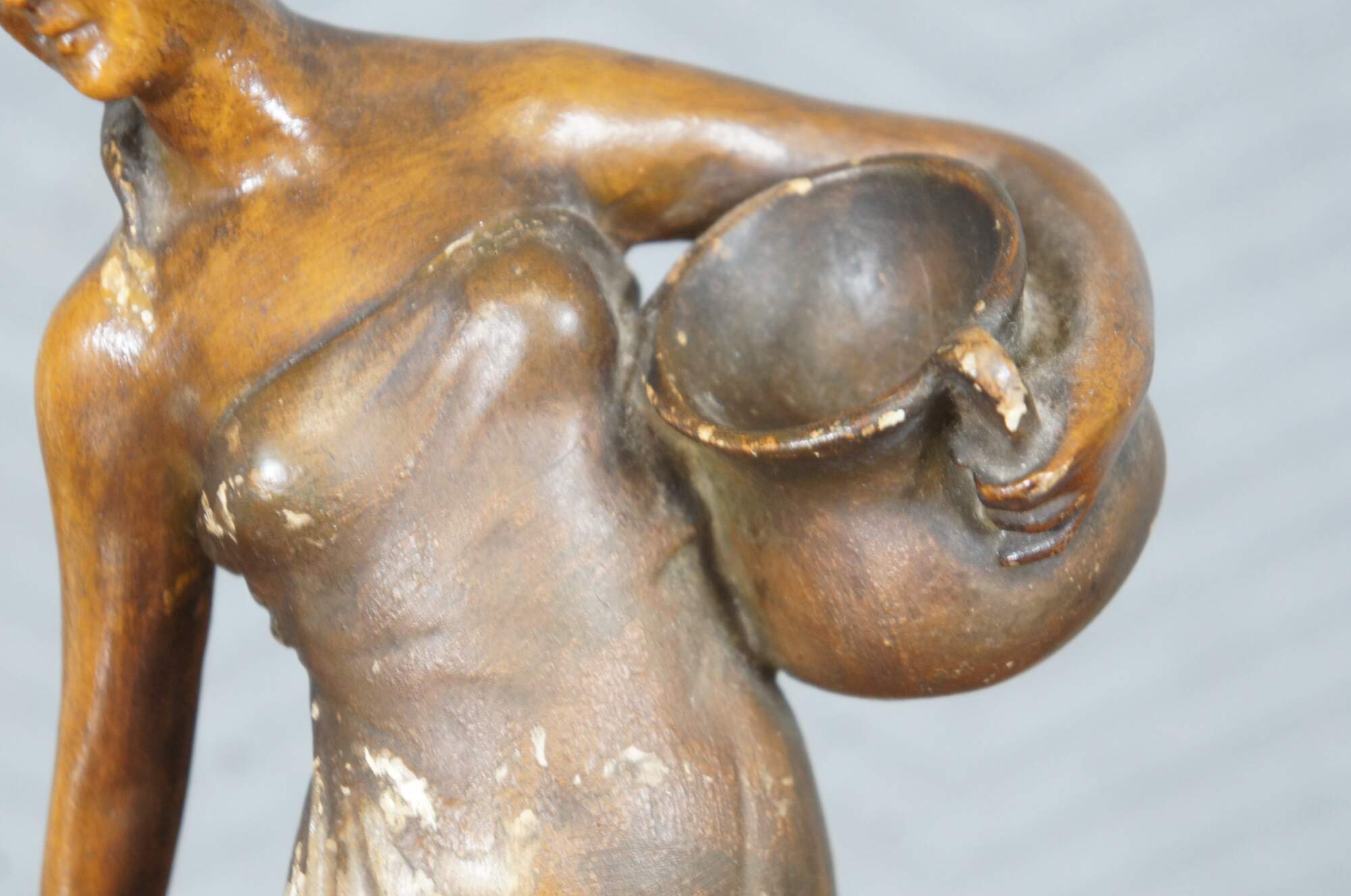 Mid to early 20th century brown painted chalkware figurine / short vase in the shape of tall neoclassical / art nouveau styled woman carrying water jugs at the edge of a well.