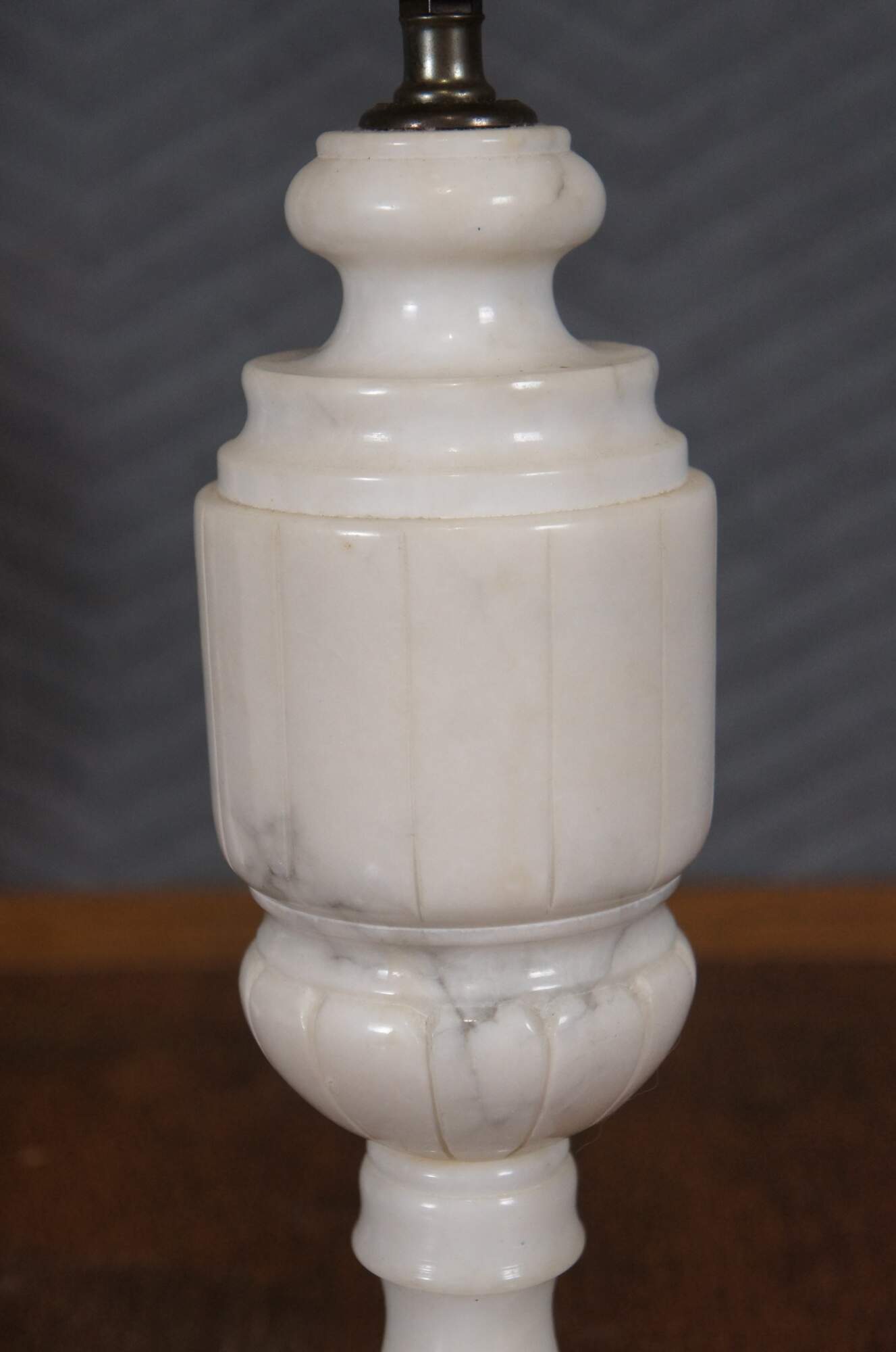 Pair of antique albaster / white marble table lamps, carved in the shape of neoclassical urns on a square base.