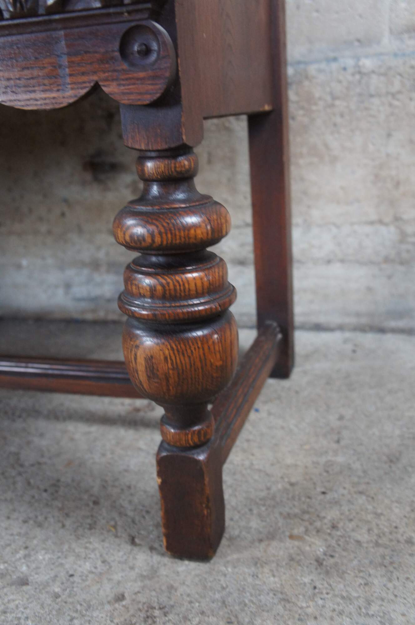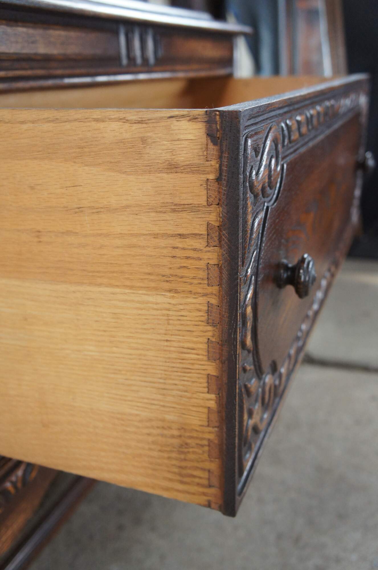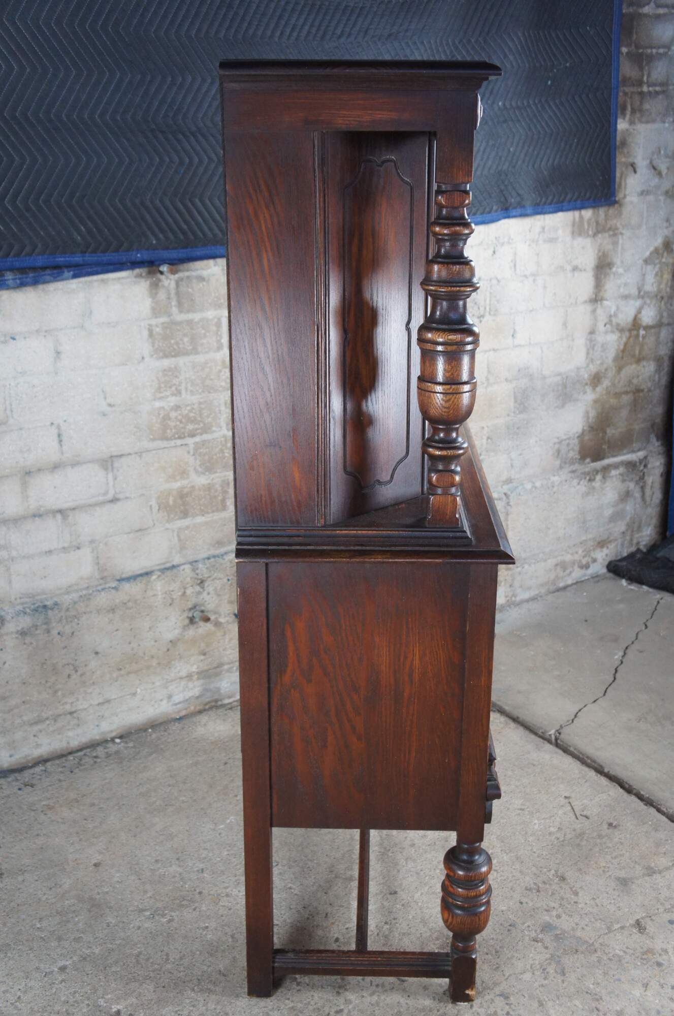 Vintage Jacobean style china hutch by Bernhardt Furniture, circa 1930-40s. The cabinet was designed to resemble a court cupboard. Features an upper hutch with one shelf flanked by baluster turned columns over a large lower dovetailed drawer for serving pieces. The cabinet is supported by baluster turned legs connected by an H stretcher. Marked Bernhardt Furniture Company Lenoir, North Carolina along the back.