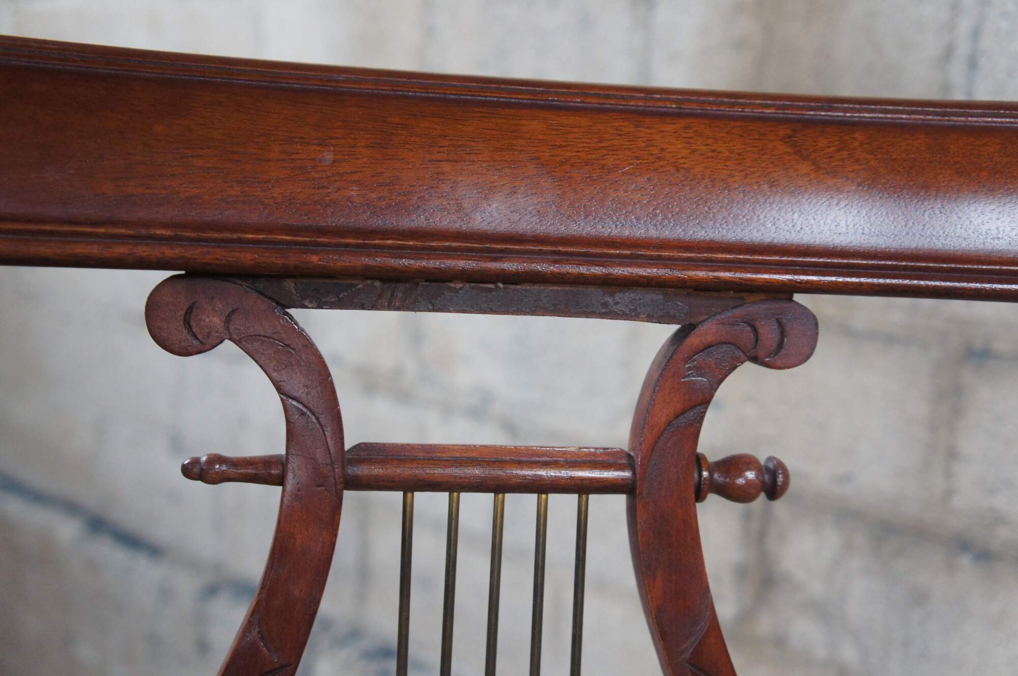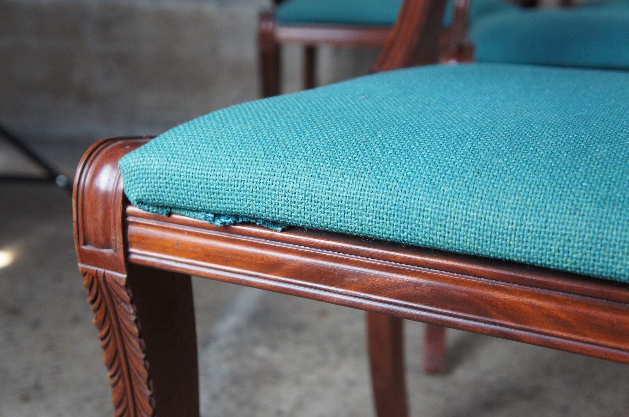 Good Condition; General use-related wear. A few seats show staining/discoloration. One of the harp backs is missing trim along the top.