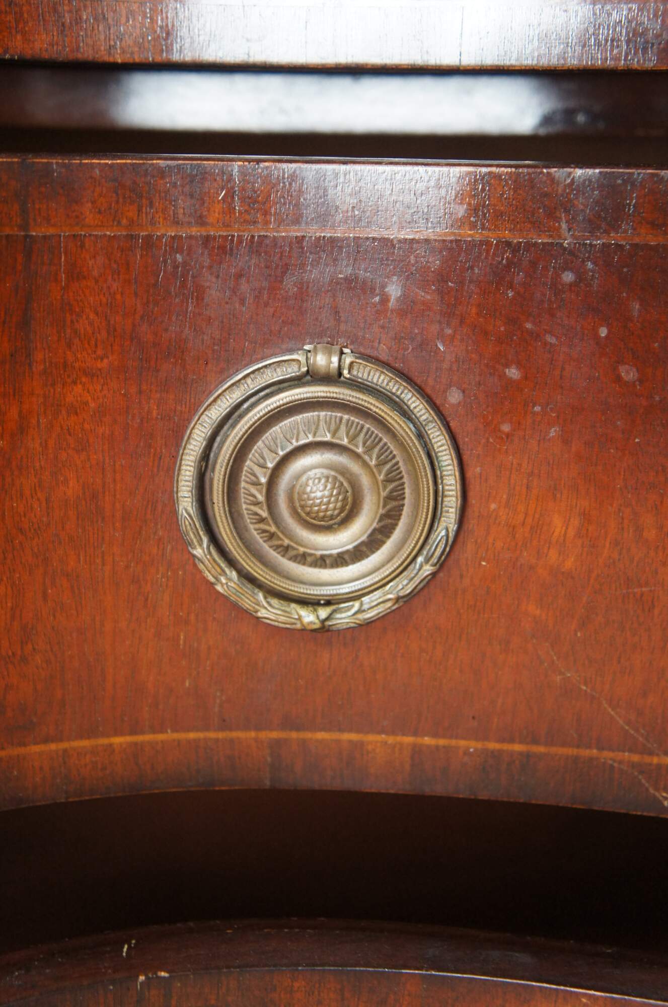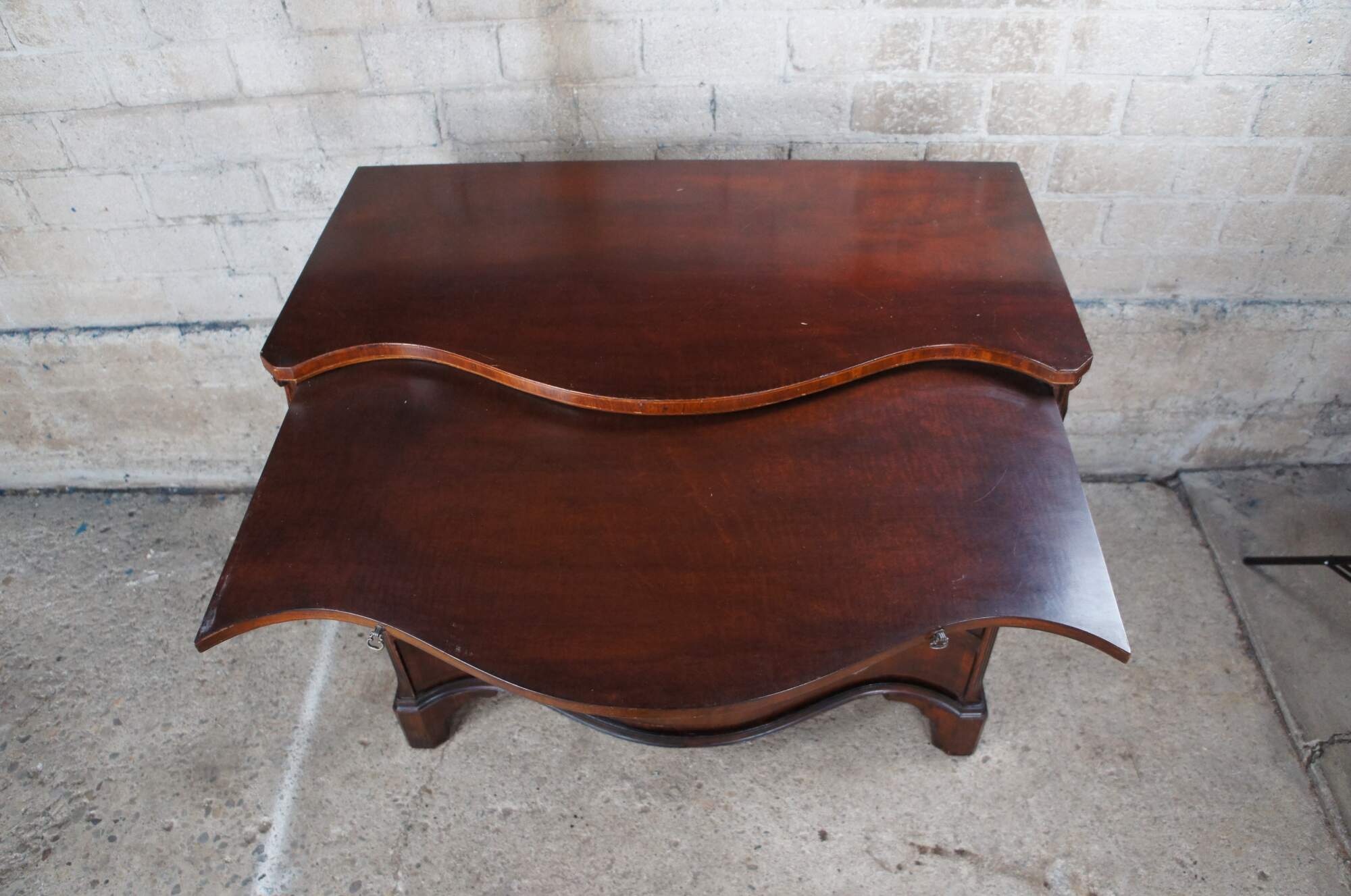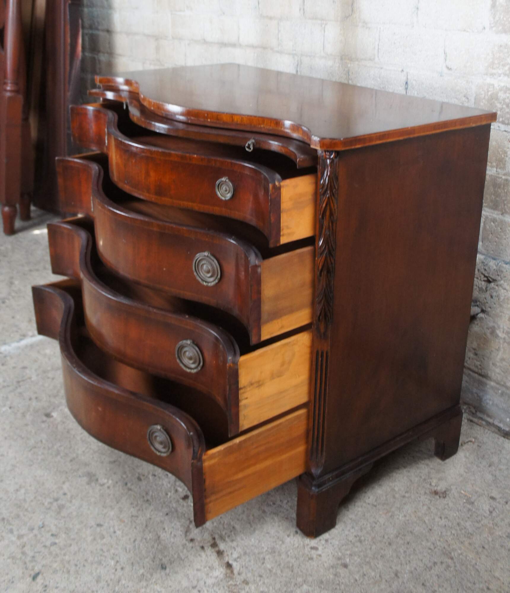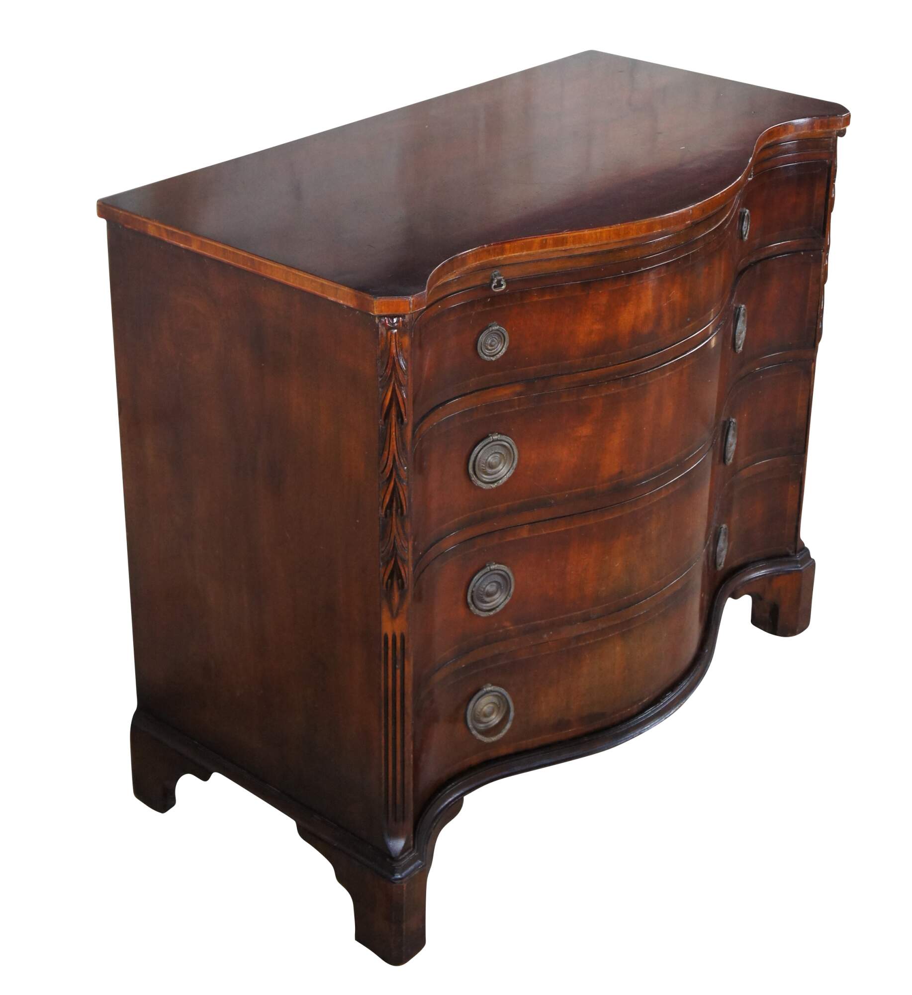 An exceptional Bachelors Chest, Buffet, or Dresser by Union National, circa 1940s. Designed in George III styling with a dramatic serpentine mahogany case featuring four sliding dovetailed drawers and a pull-out tray for service. The chamfered stiles of the chest showcase foliate carving along the top and fluting towards the base. Drawers are accented by cross banding and inlay. Drawer pulls are made from brass with an ornate central pineapple plate and neoclassical ribboned knocker. The dresser is supported by bracket feet. Maker’s mark along the inside of the top drawer.