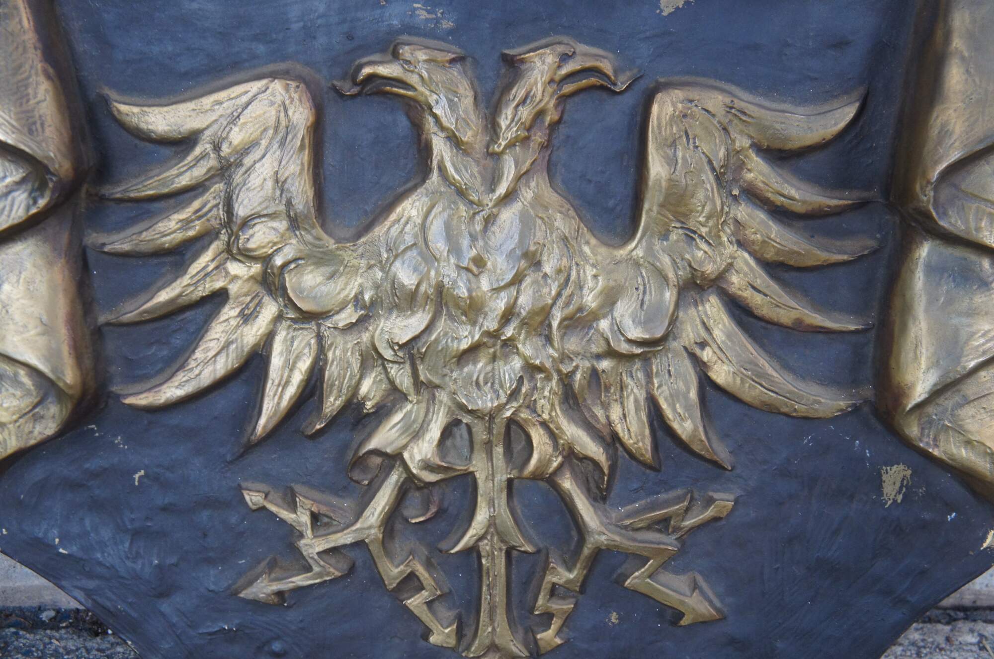 Art Deco era double-headed eagle heraldic wall plaque by the world-renowned sculptor Erik Cohrt. Beautifully cast in bronze with a dazzling double-headed eagle in gold at the center over a black background. The eagle is set on a shield beneath a gold helmet with drapery swags. Signed along the lower right, Circa 1925. Includes a chain for hanging.