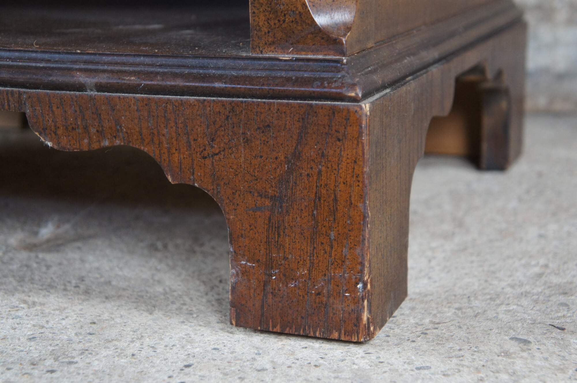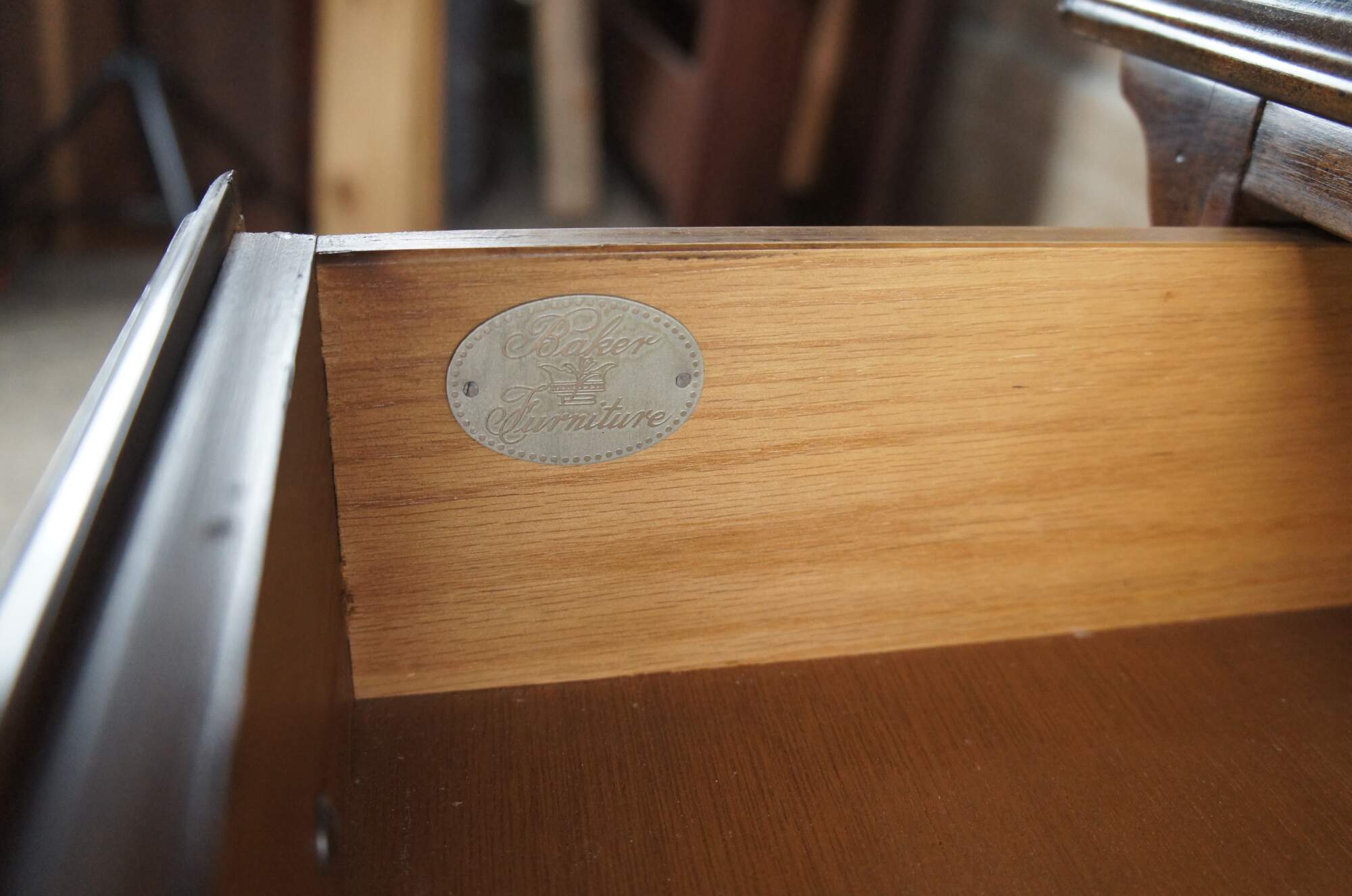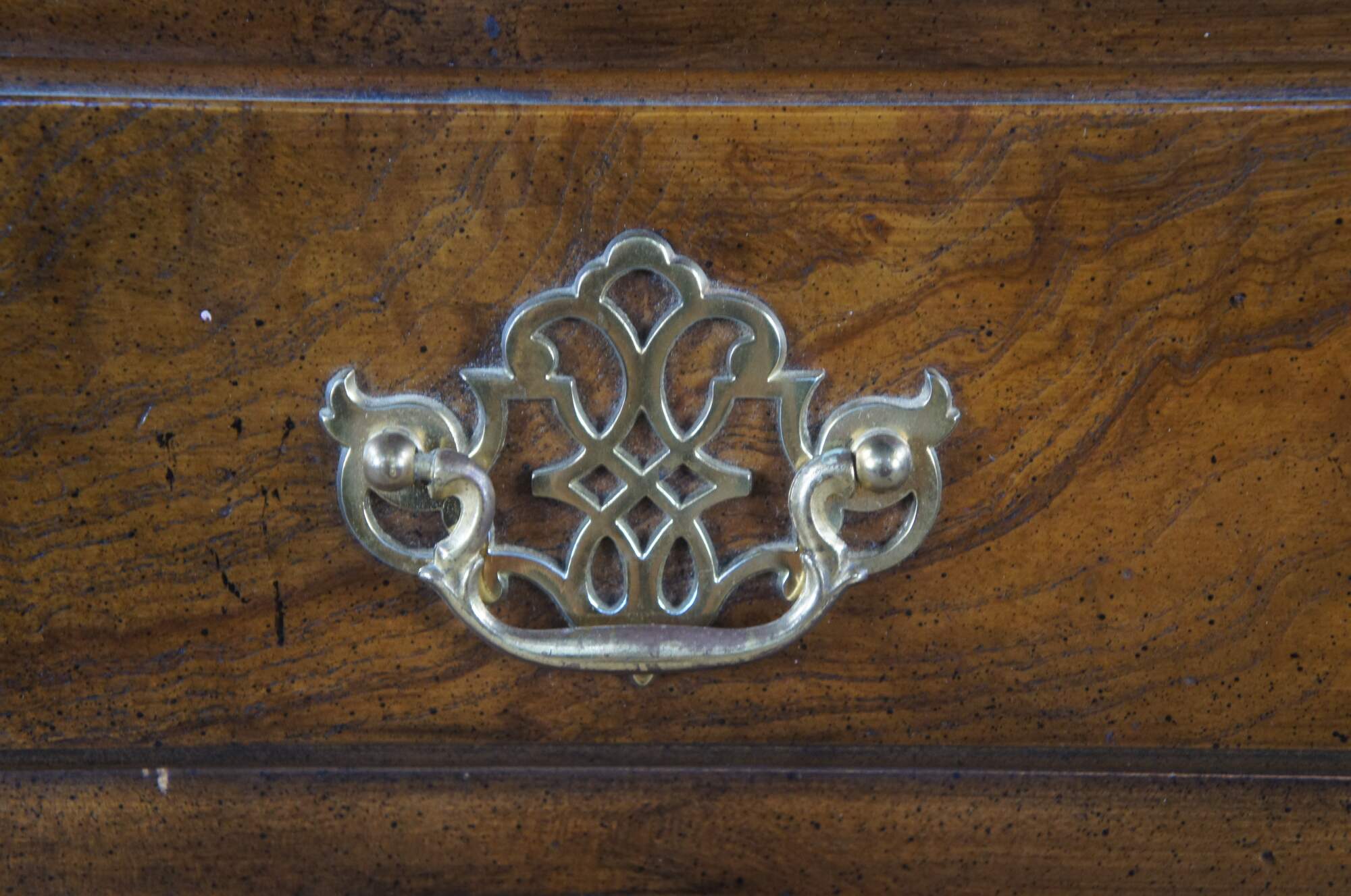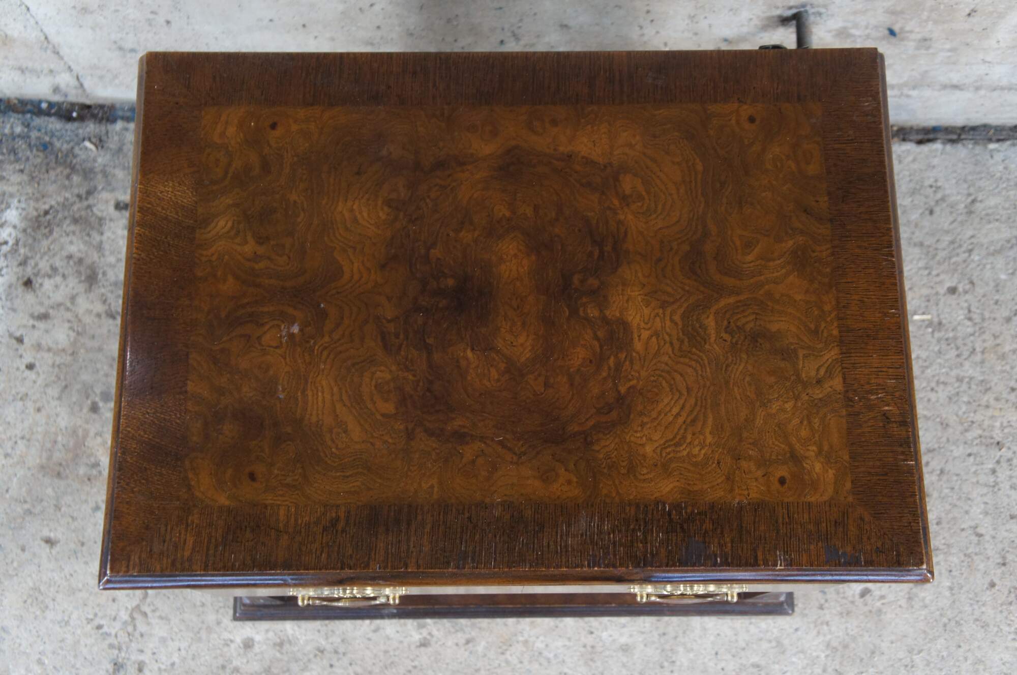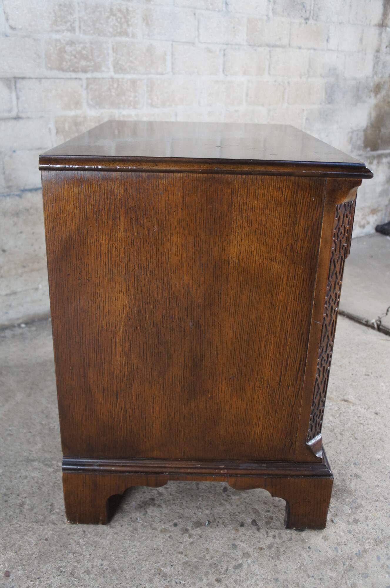 1980s Baker Furniture Chippendale nightstand or side table. Features a rectangular form made from walnut with a crossbanded and burled top. There is one dovetailed drawer with interlaced brass bale hardware over a lower cubby for storage. The chest showcases chamfered stiles with beautiful fretwork terminating along the top and bottom into rams’ tongues. The chest is supported by bracket feet. Marked Baker along the inside of the drawer. 1510 | 4050