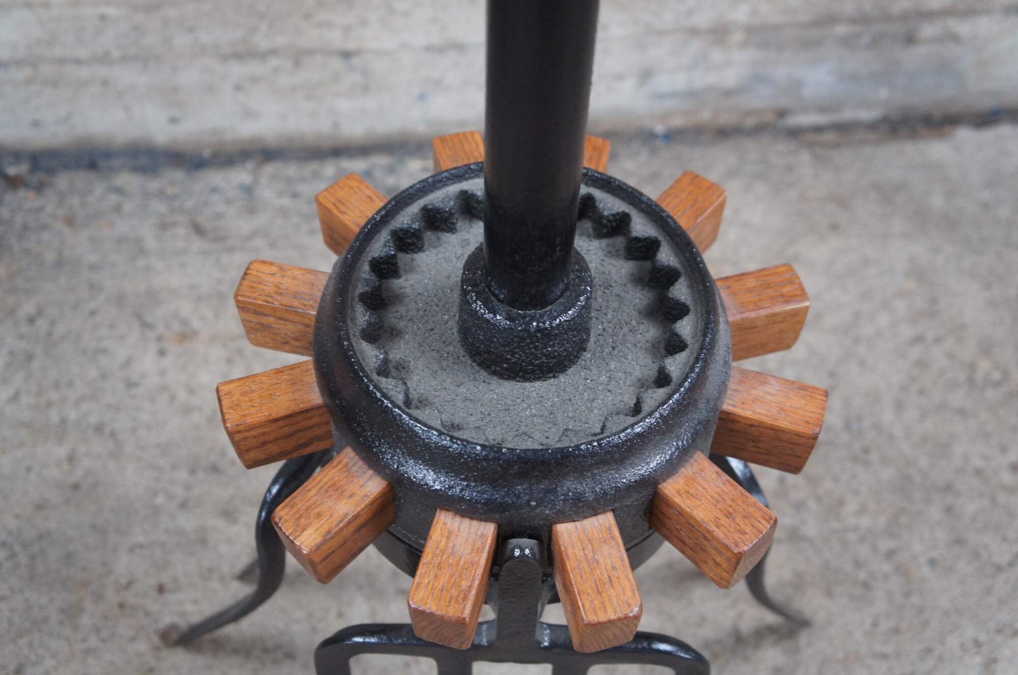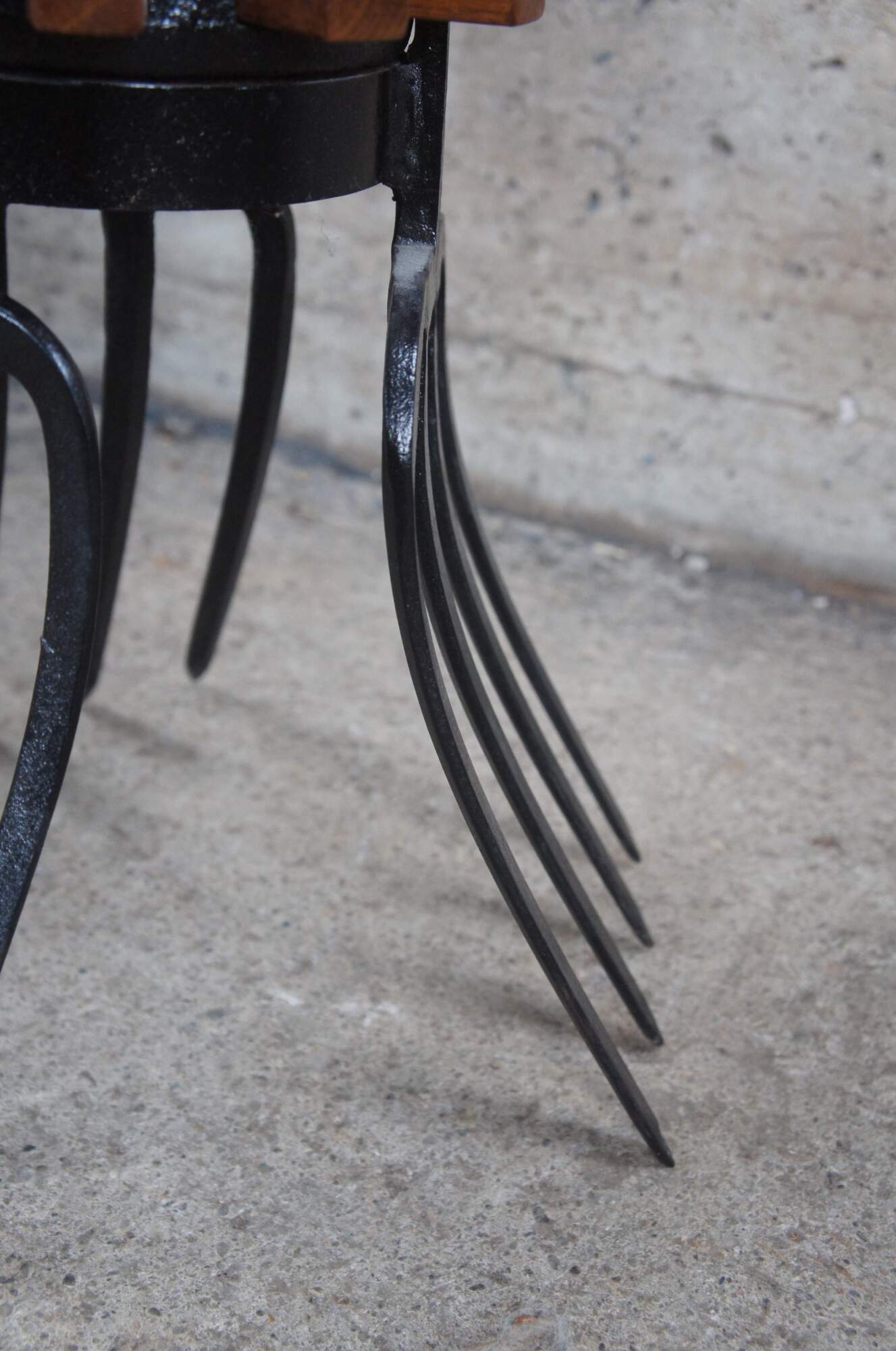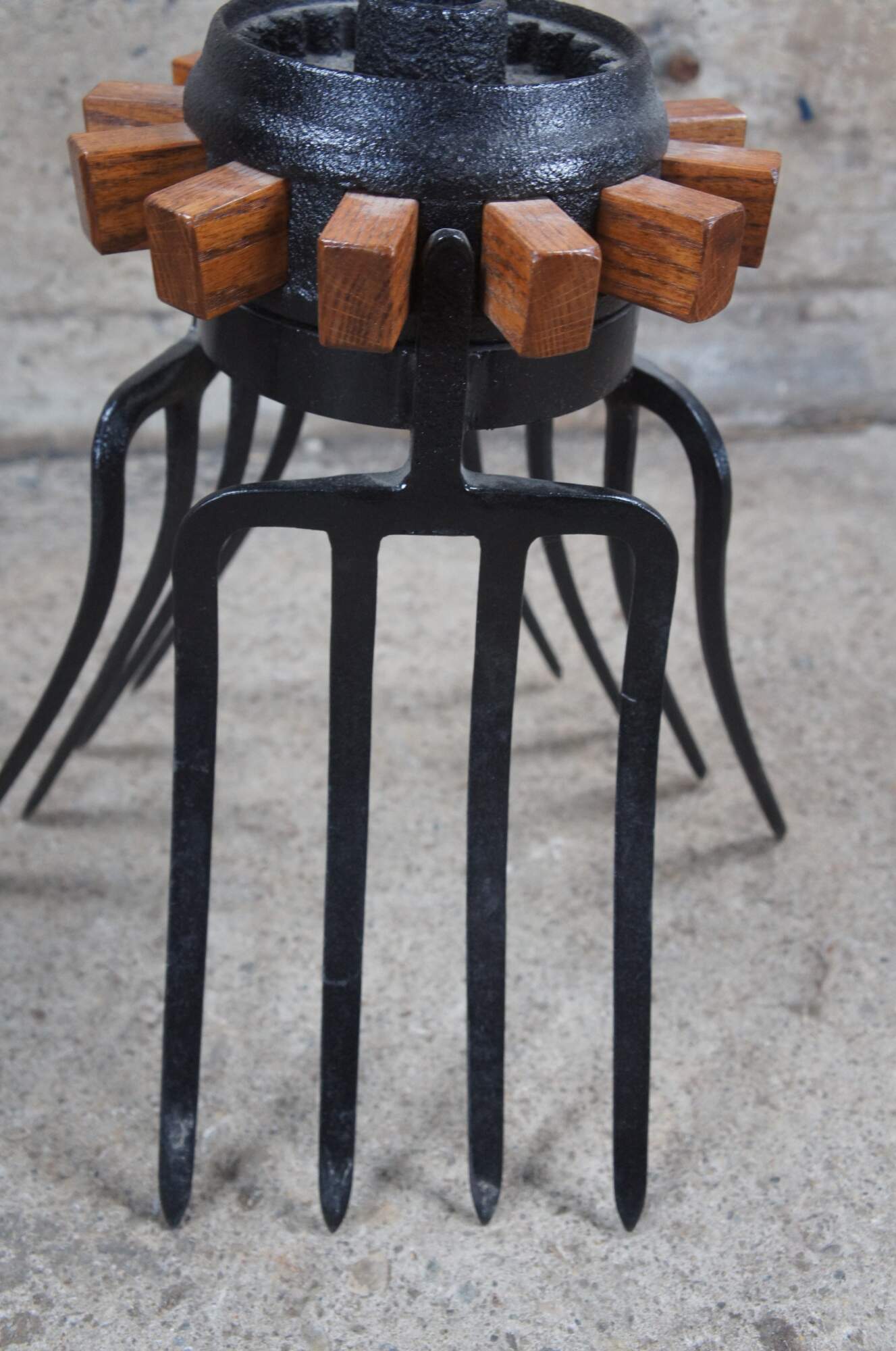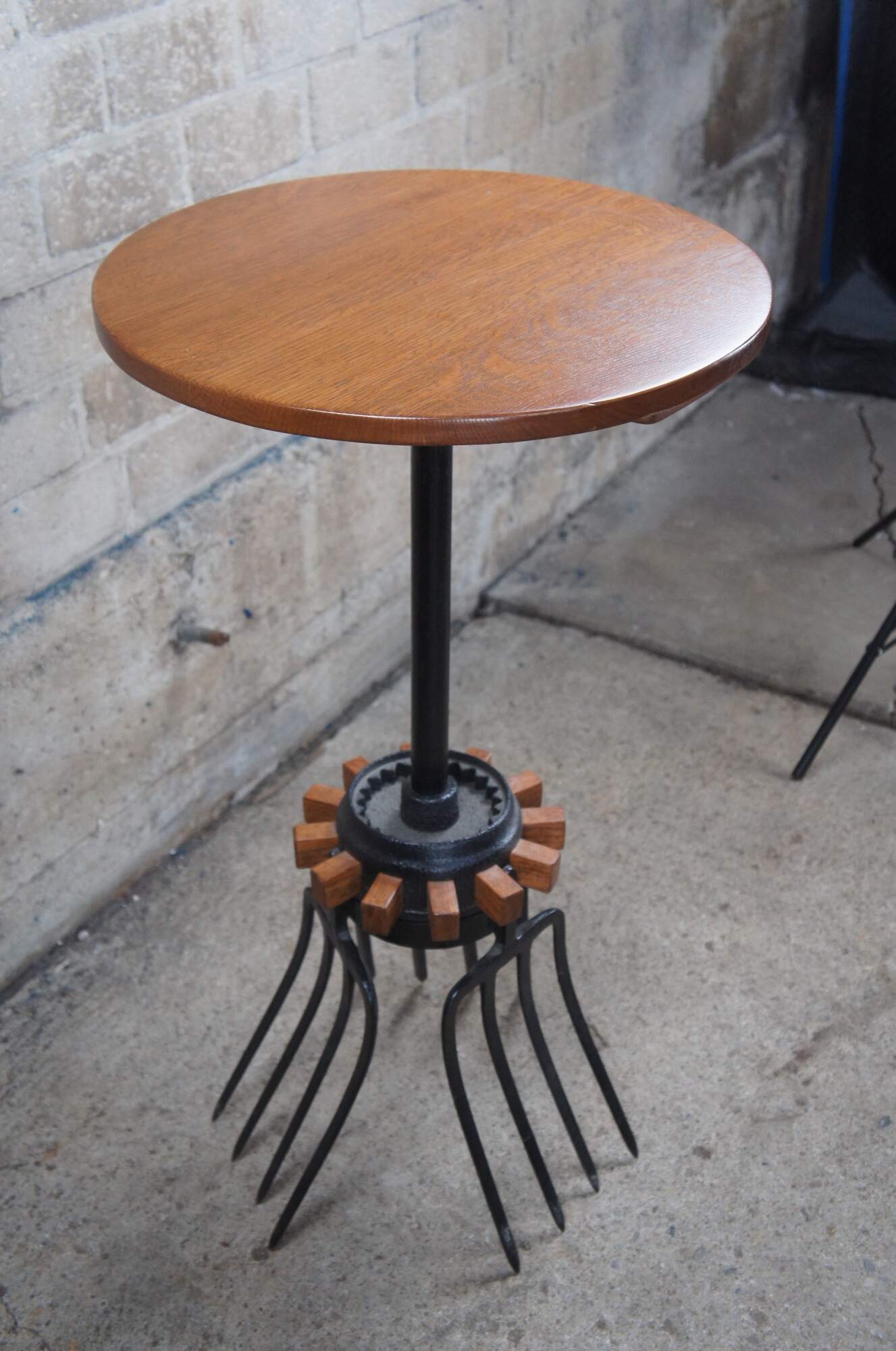 Late 20th Century industrial farmhouse bistro side or end table. Features an oak top over a cast iron wagon wheel and tripod pitchfork base. A fun addition to any space.