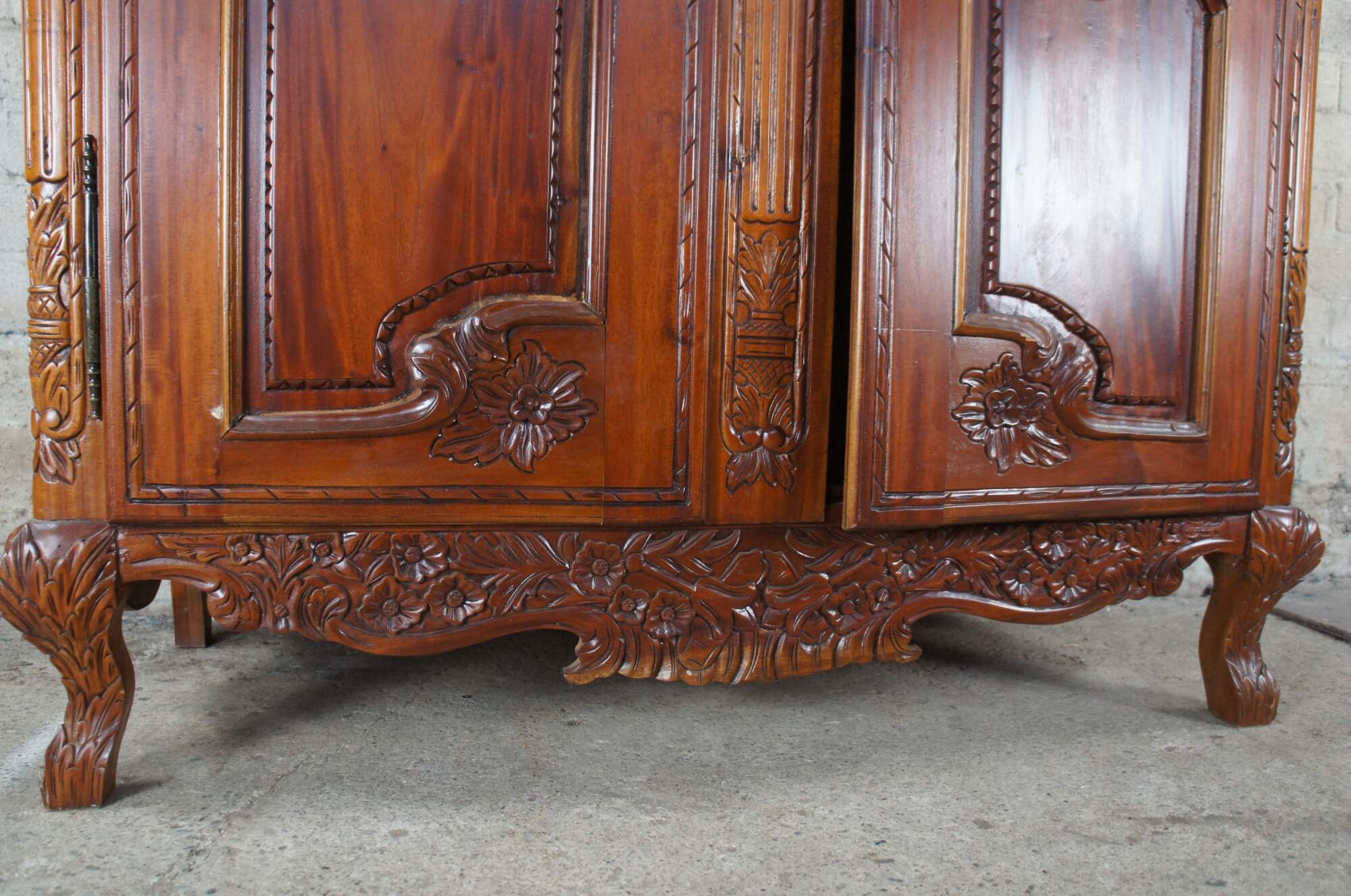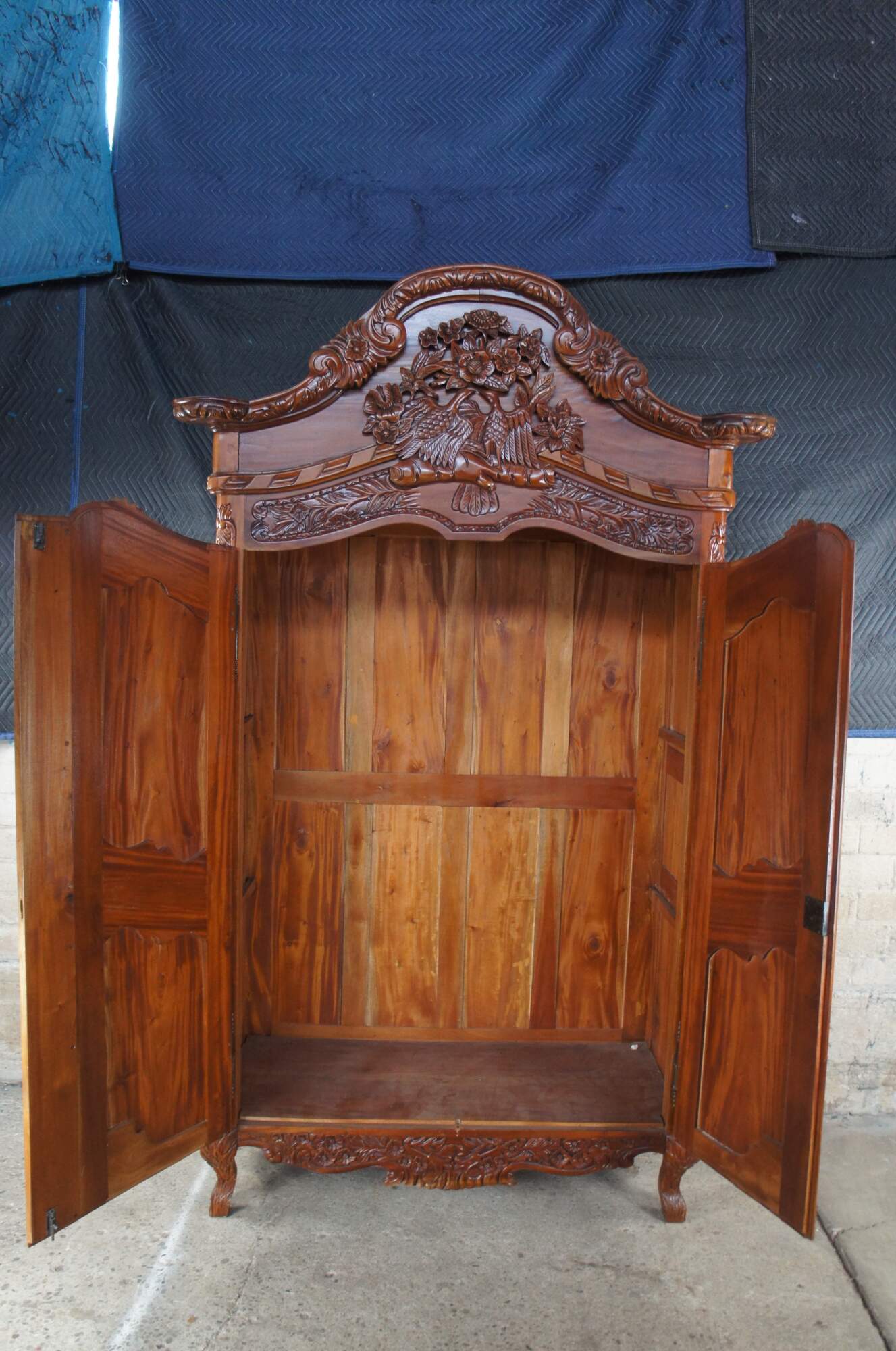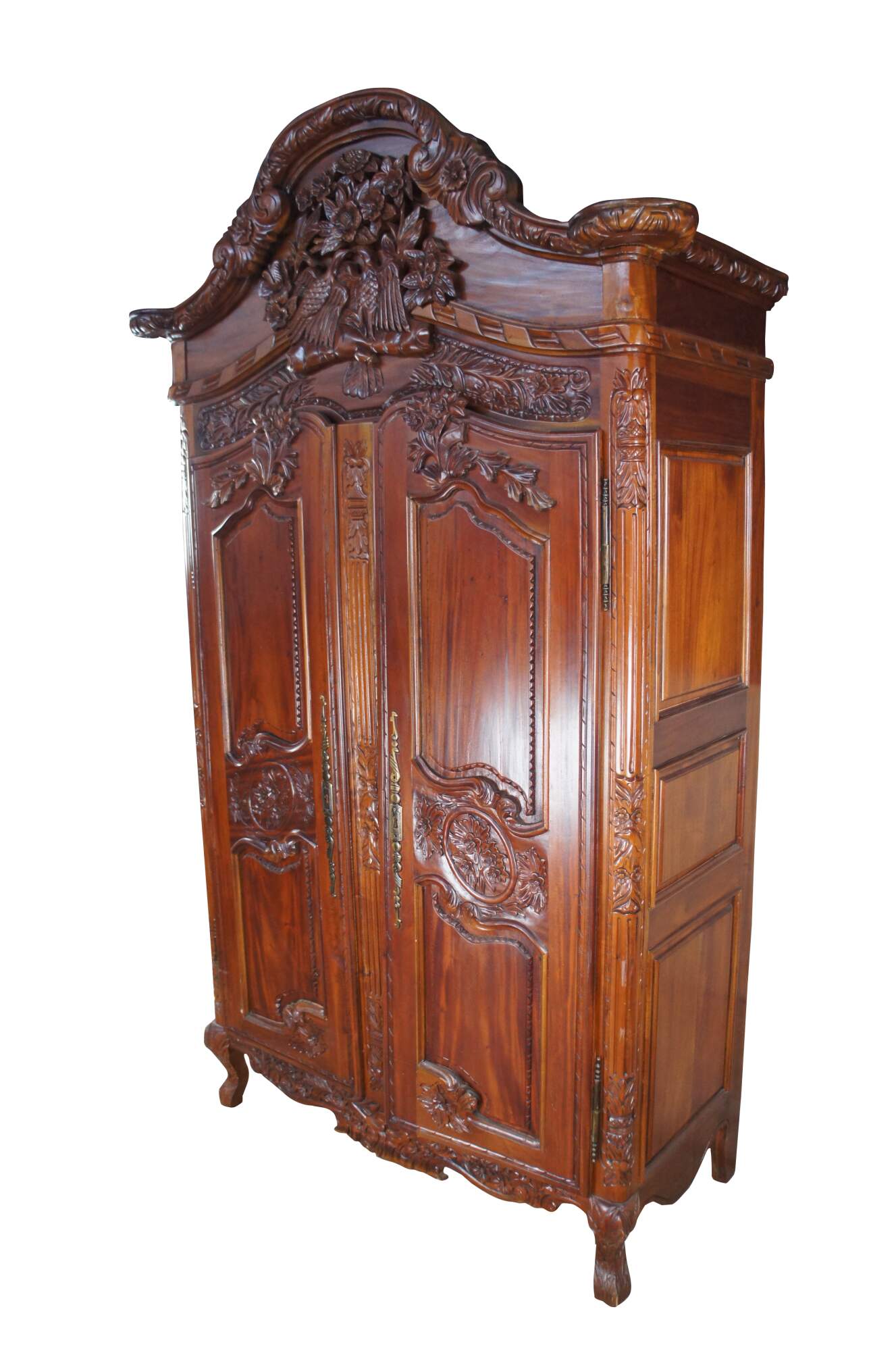 Vintage French Louis XV / Provincial style wedding armoire or wardrobe, circa last quarter of the 20th century. Made of mahogany featuring baroque styling with a foliate carved bonnet top crown over a floral bird theme. The armoire has paneled doors set around oval carved floral cartouches with flower baskets and fruit and berries designs. Interior opens to a space for hanging garments. Shelves could be added if preferred. The cabinet rests on foliate carved cabriole legs that are set between a floral carved apron.