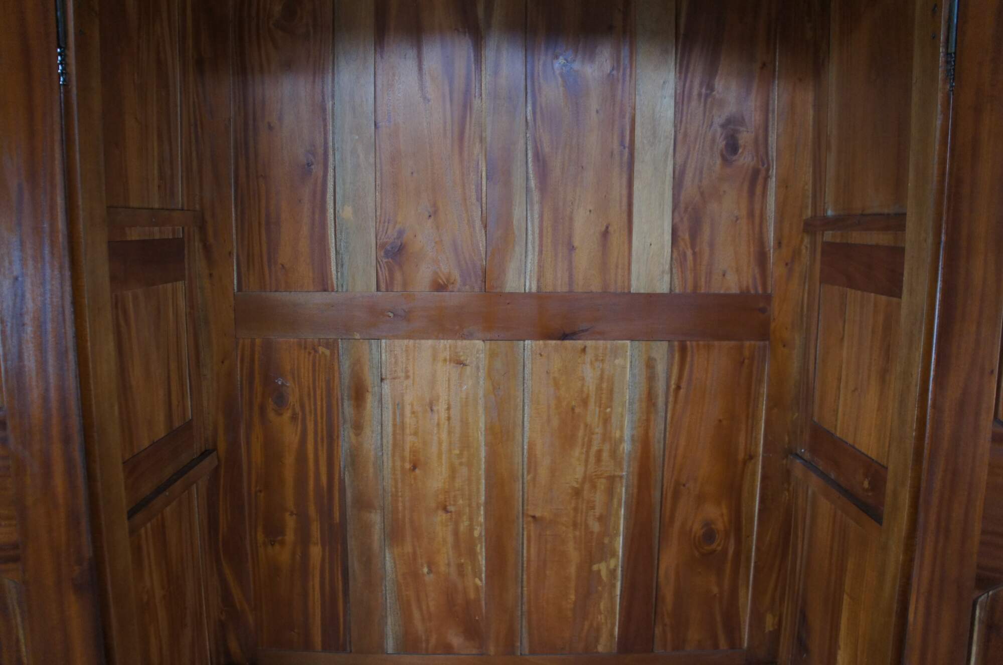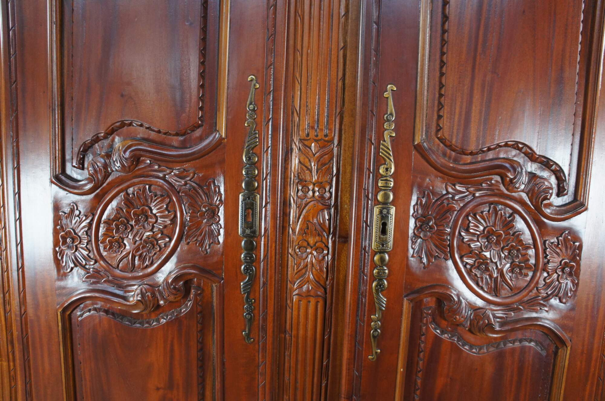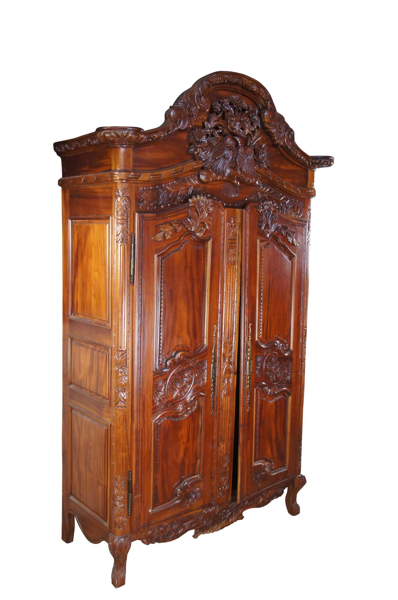 Vintage French Louis XV / Provincial style wedding armoire or wardrobe, circa last quarter of the 20th century. Made of mahogany featuring baroque styling with a foliate carved bonnet top crown over a floral bird theme. The armoire has paneled doors set around oval carved floral cartouches with flower baskets and fruit and berries designs. Interior opens to a space for hanging garments. Shelves could be added if preferred. The cabinet rests on foliate carved cabriole legs that are set between a floral carved apron.