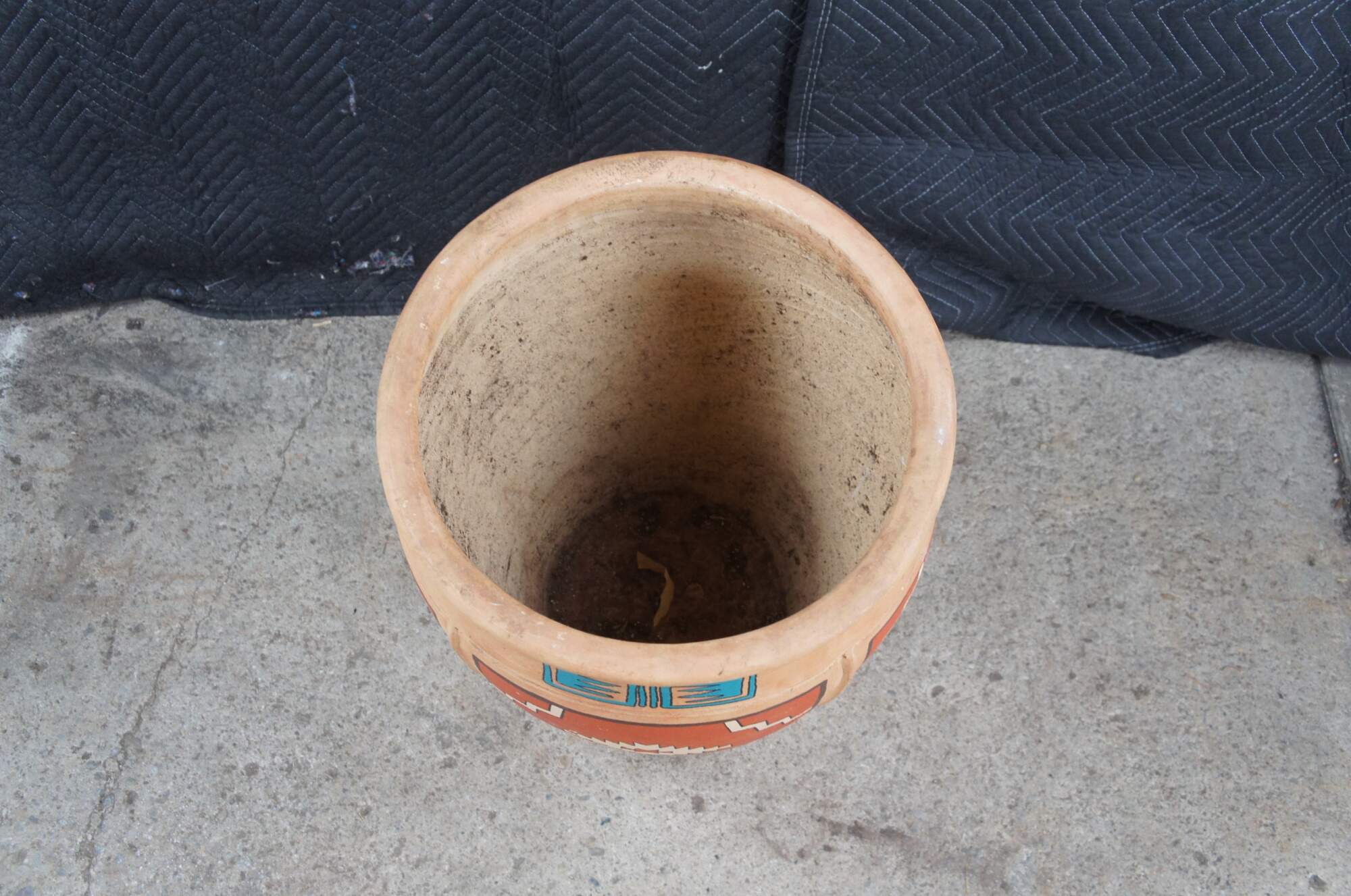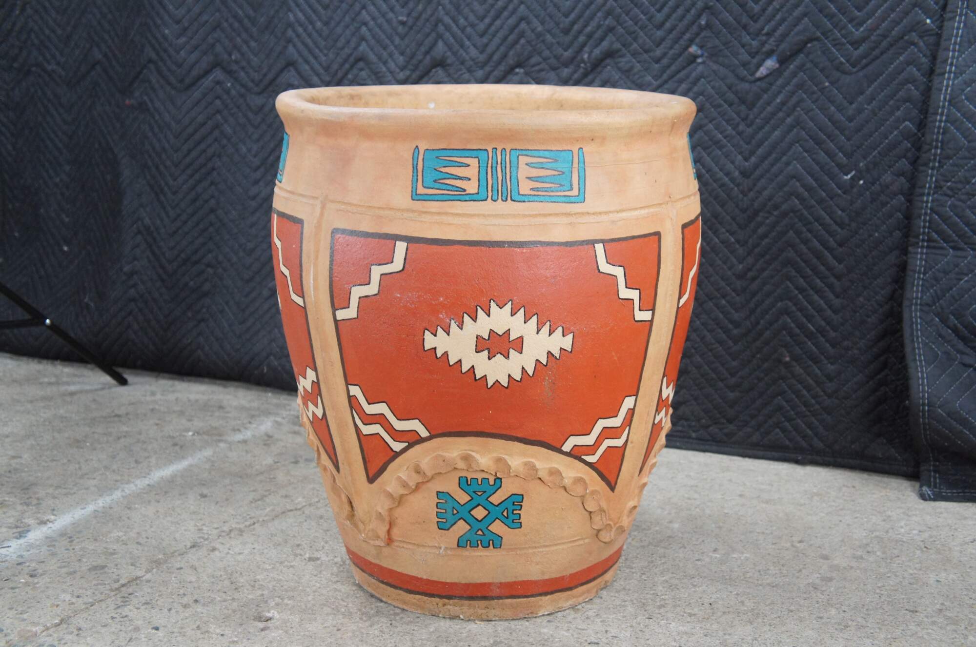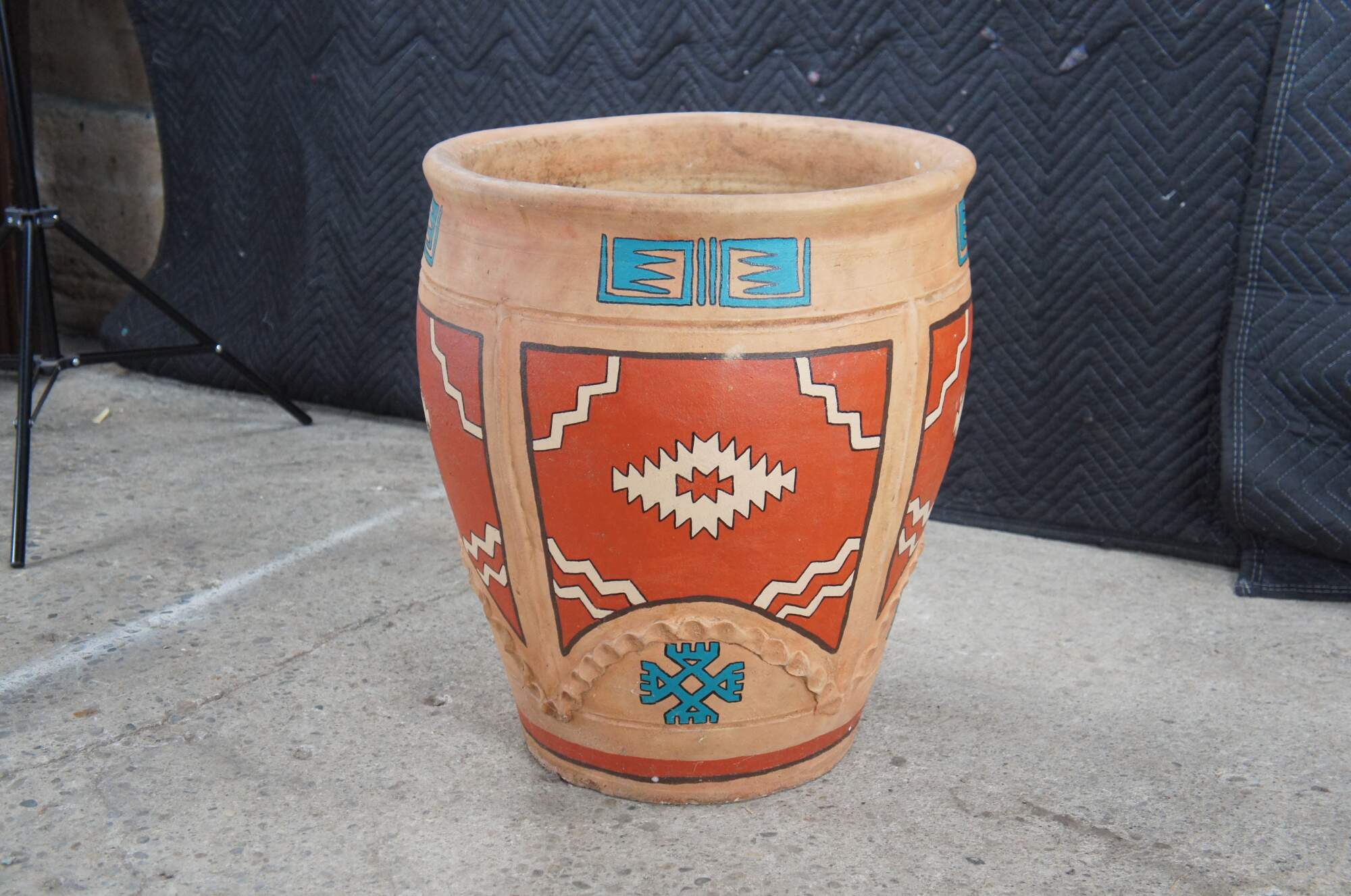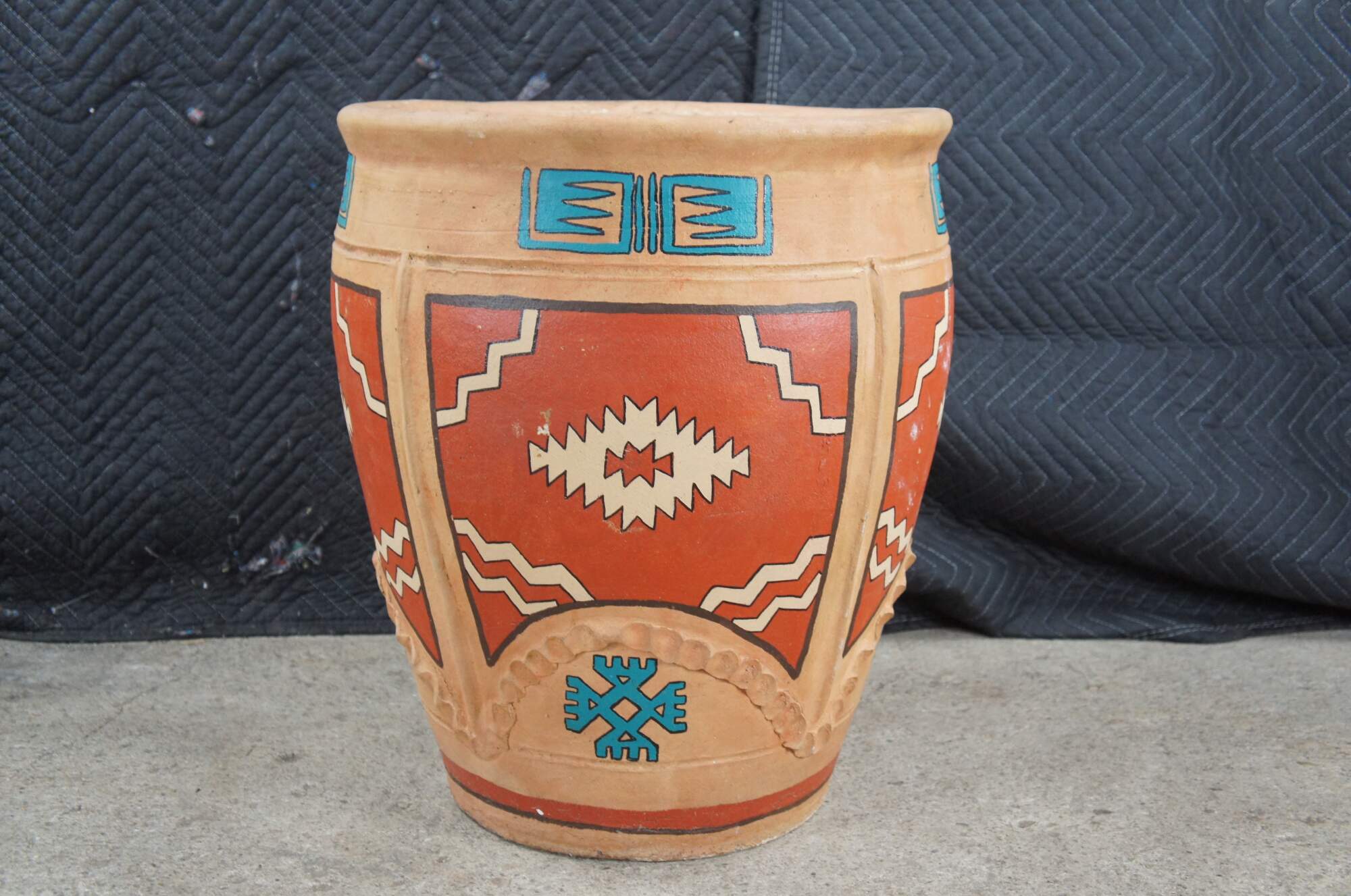 Hand Painted Naitive American Style Terraotta vessel, vase or garden planter. Features an urn form with geometric designs in red and turquoise with black outlines. The vase is unmarked.