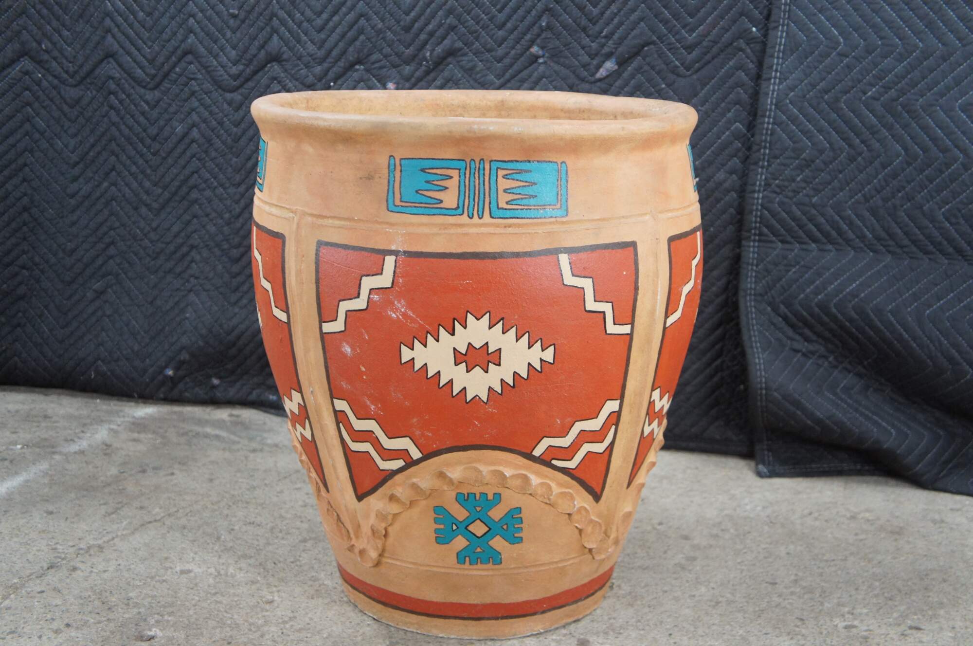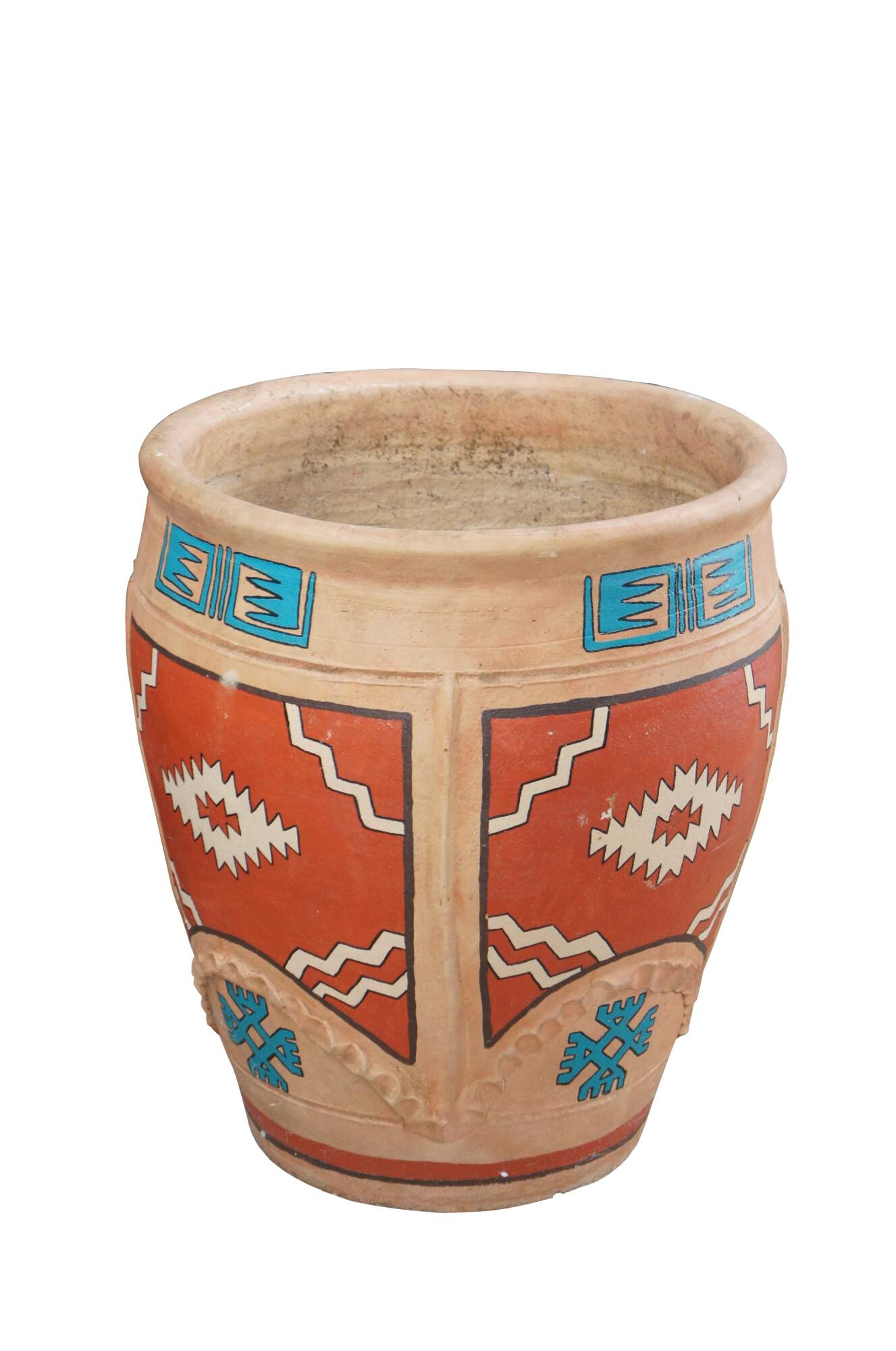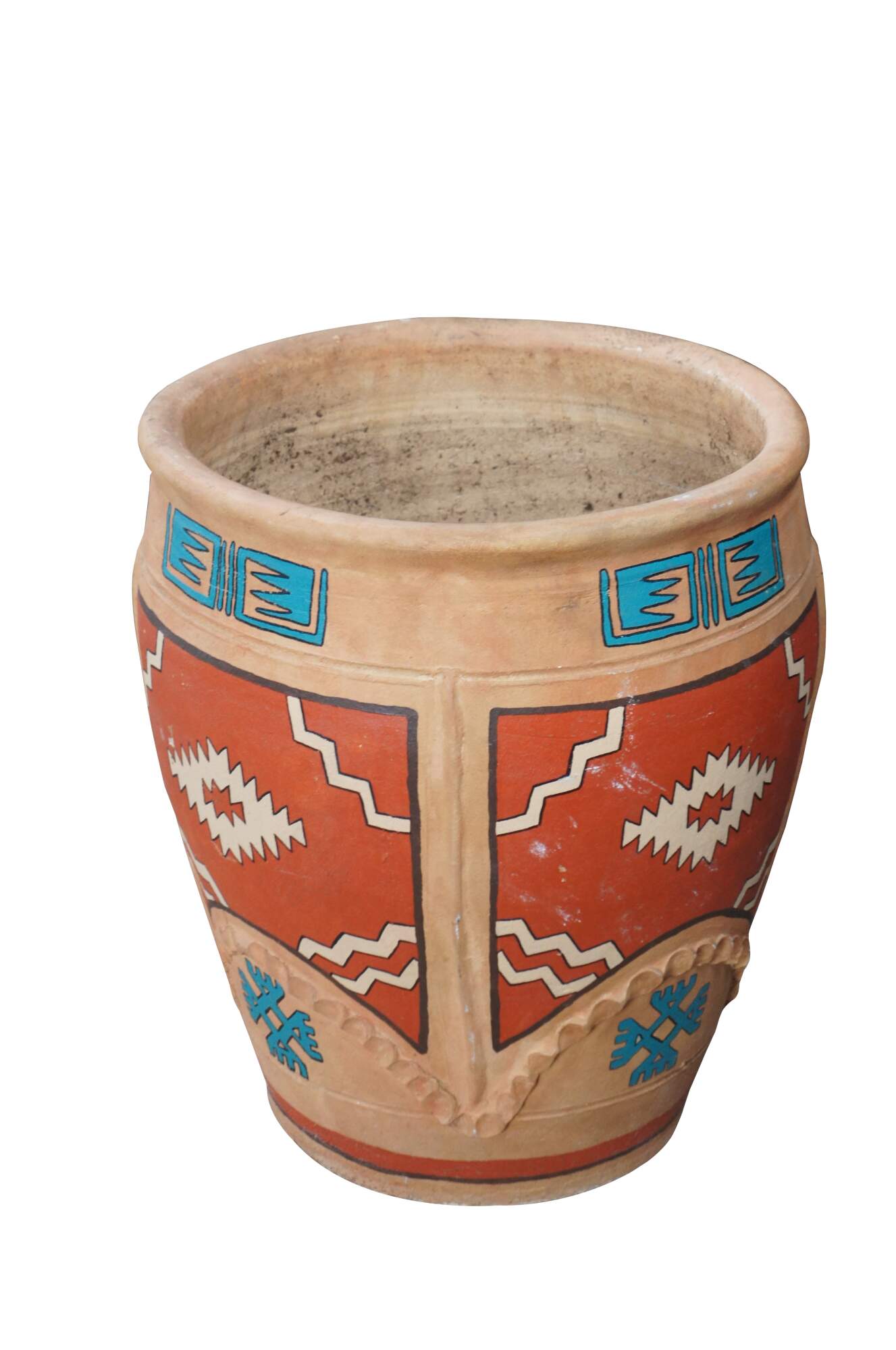 Hand Painted Naitive American Style Terraotta vessel, vase or garden planter. Features an urn form with geometric designs in red and turquoise with black outlines. The vase is unmarked.
