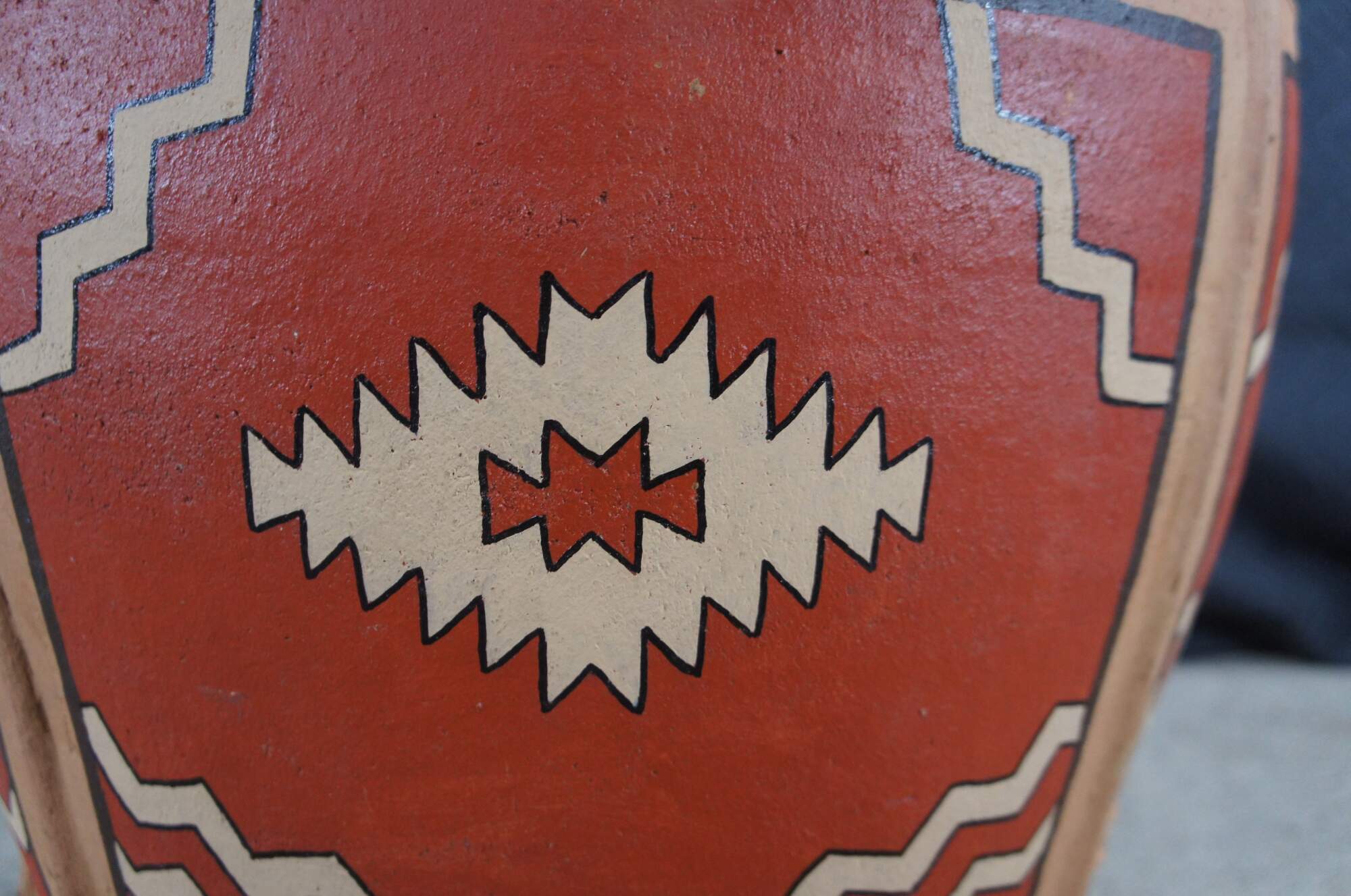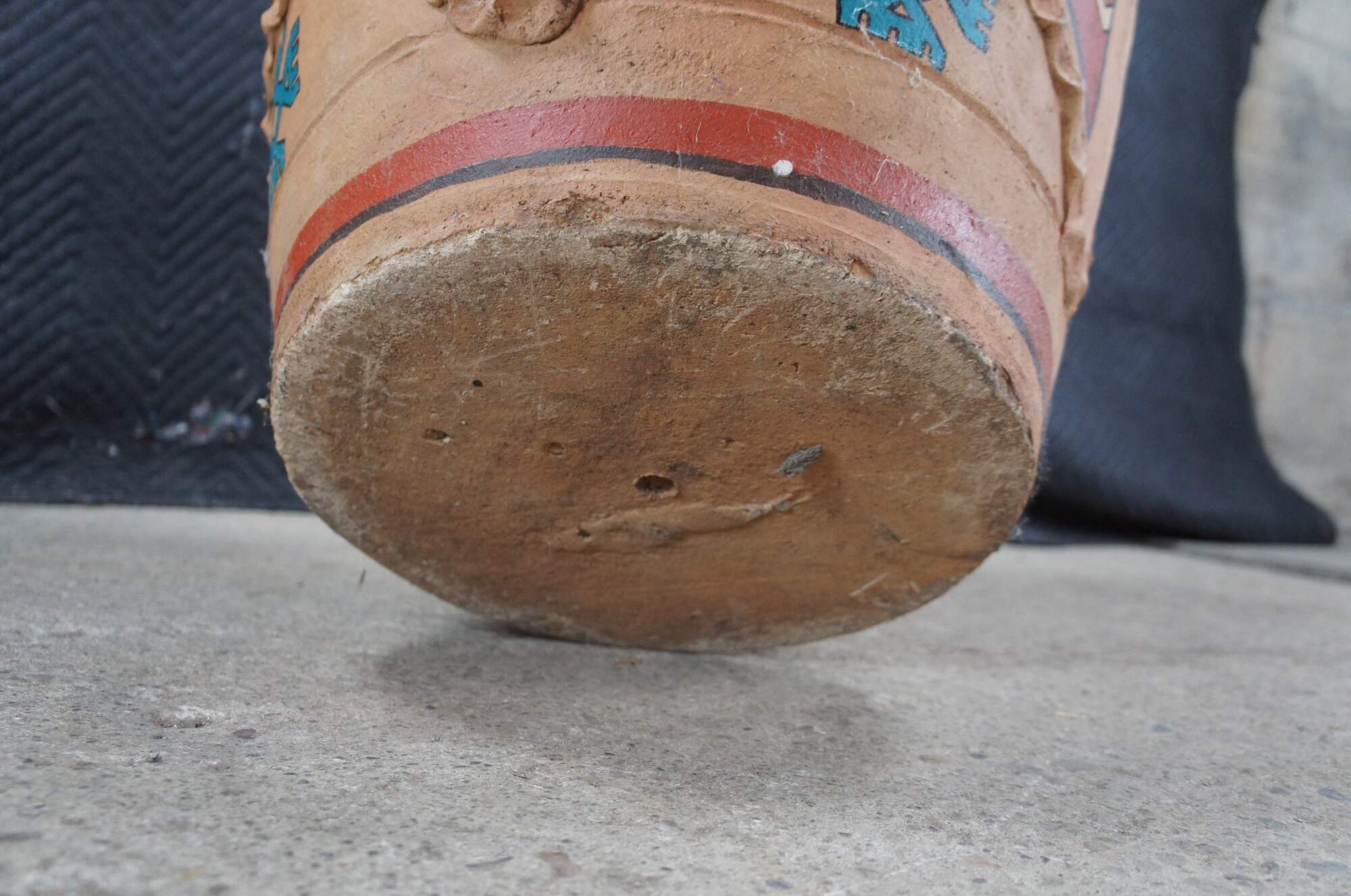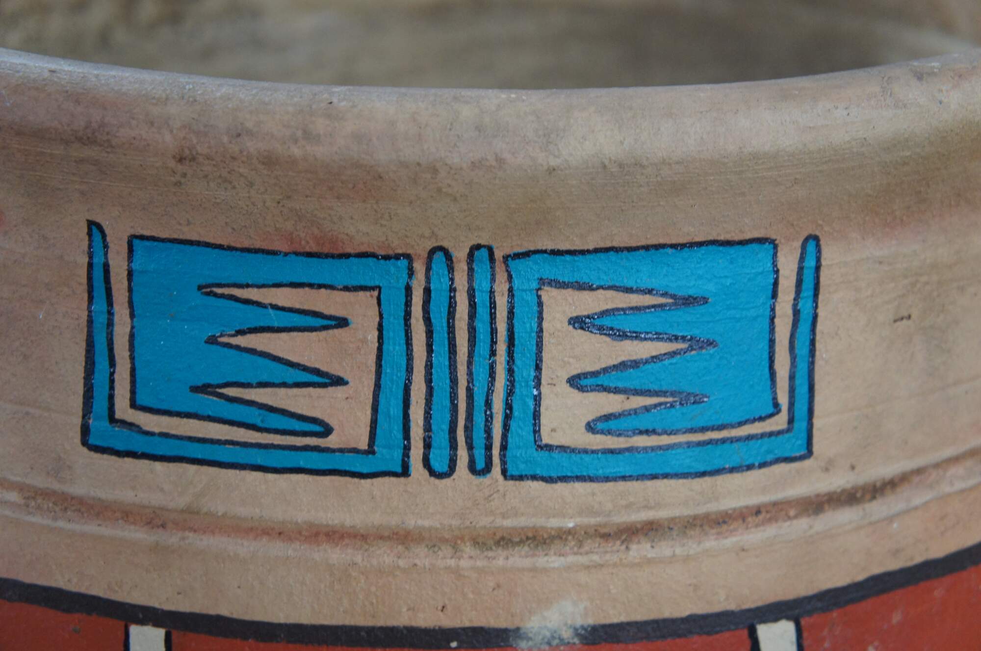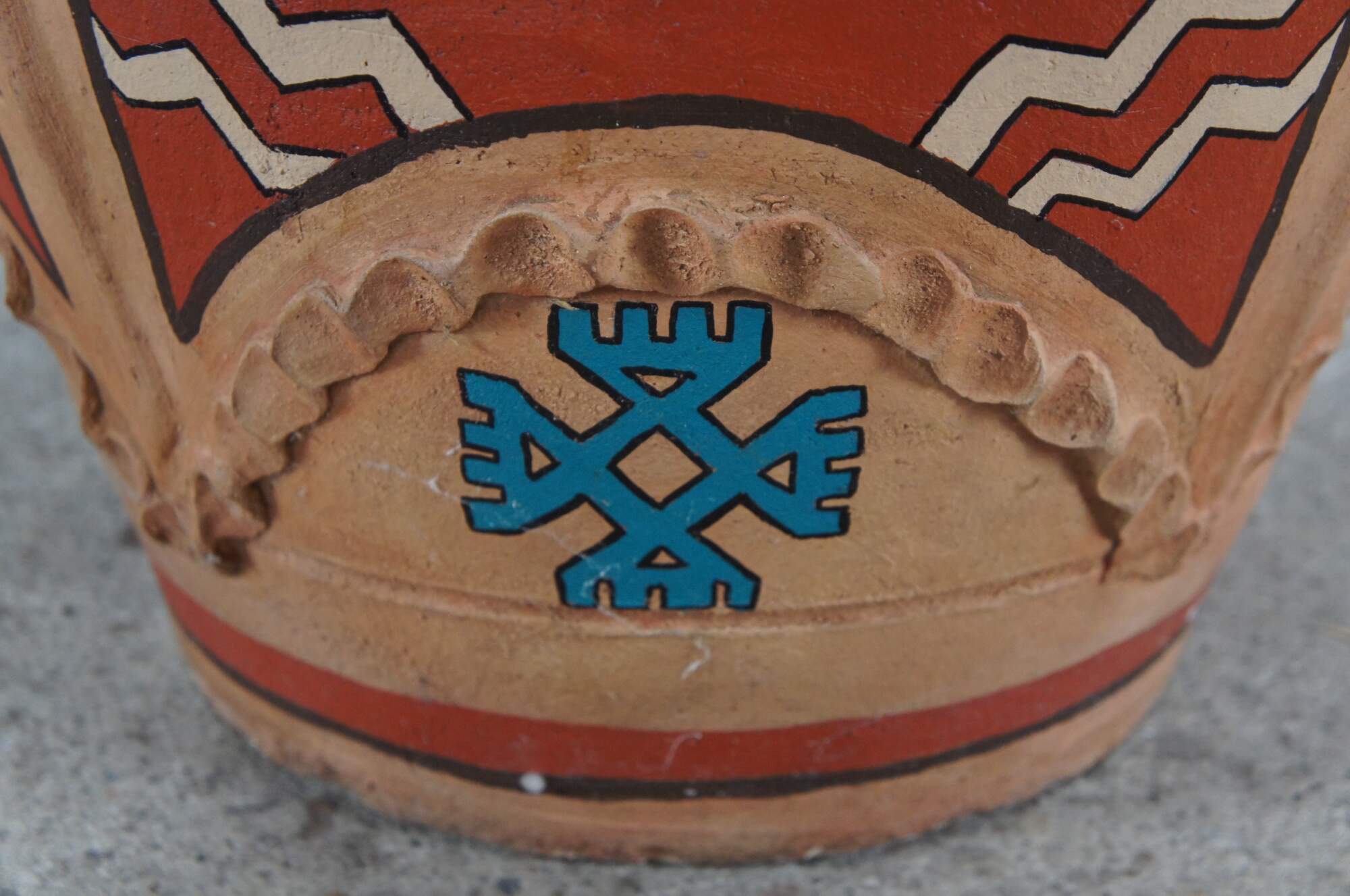 Hand Painted Naitive American Style Terraotta vessel, vase or garden planter. Features an urn form with geometric designs in red and turquoise with black outlines. The vase is unmarked.
