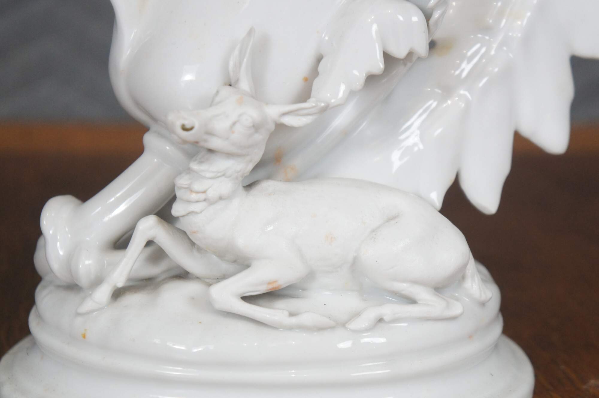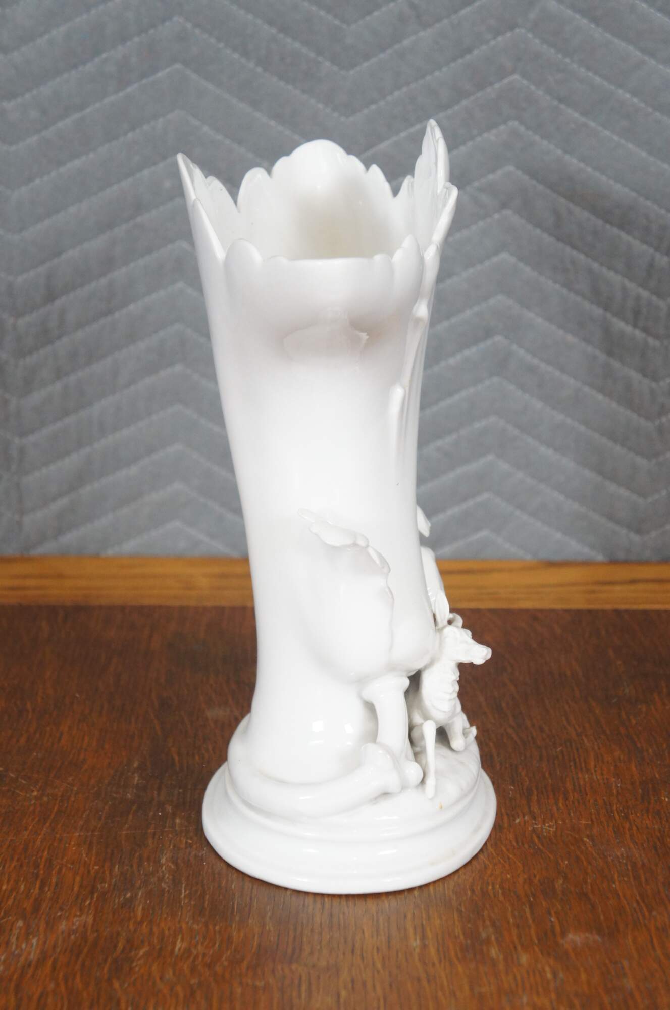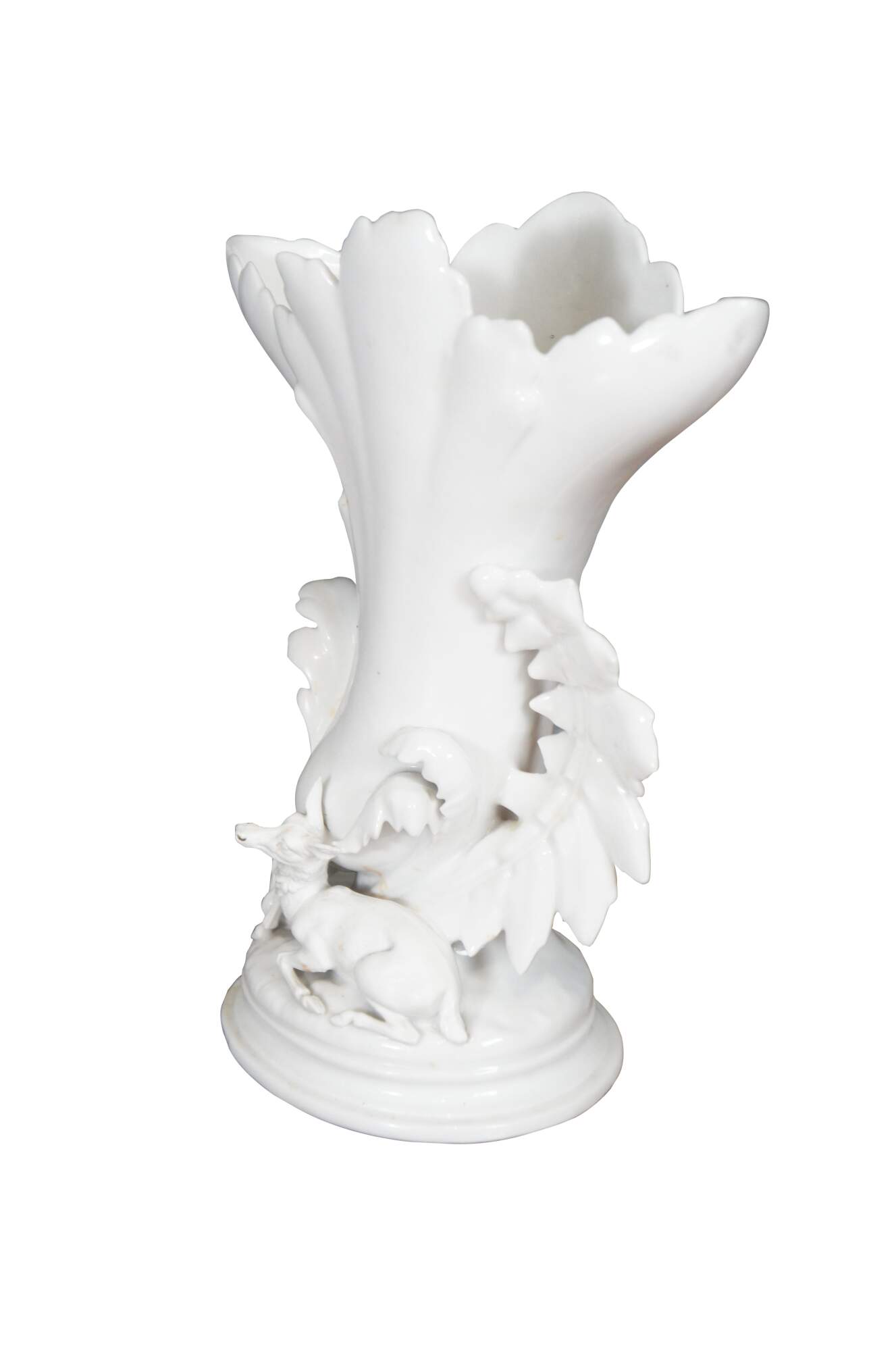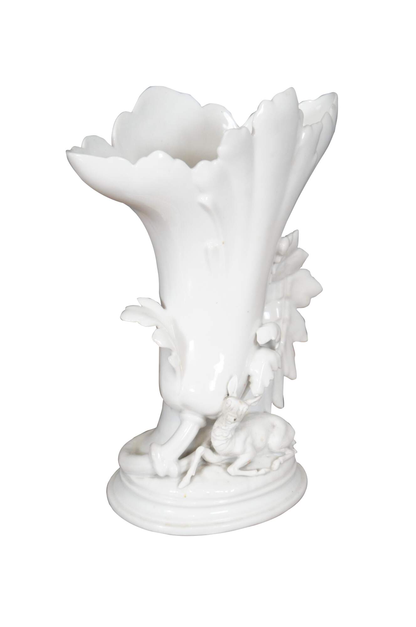 Antique white porcelain spill / flower vase with a broad flared leaf shaped top and a deer / elk reclining on an oval plinth base trimmed with oversized leaves. Impressed on base 1432.