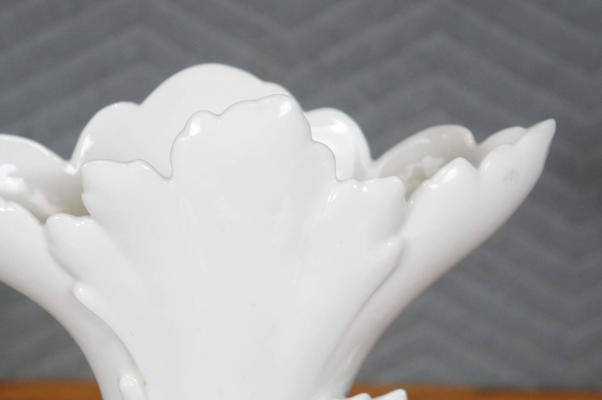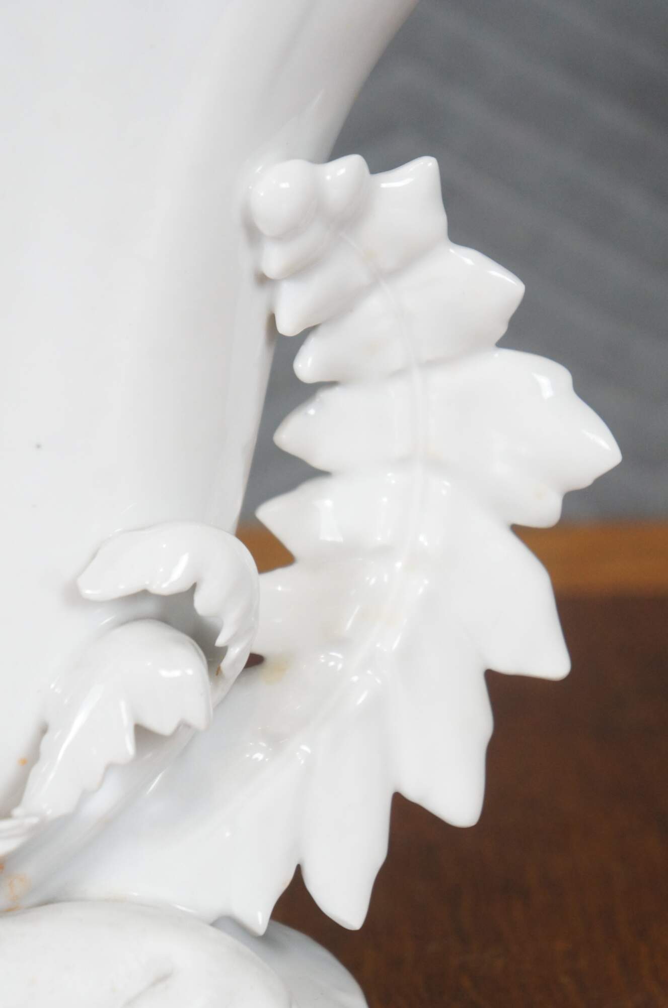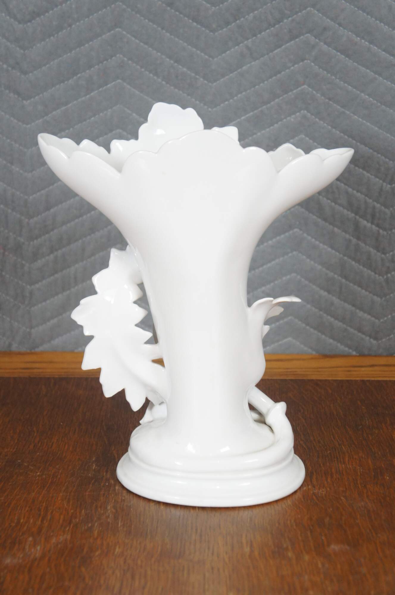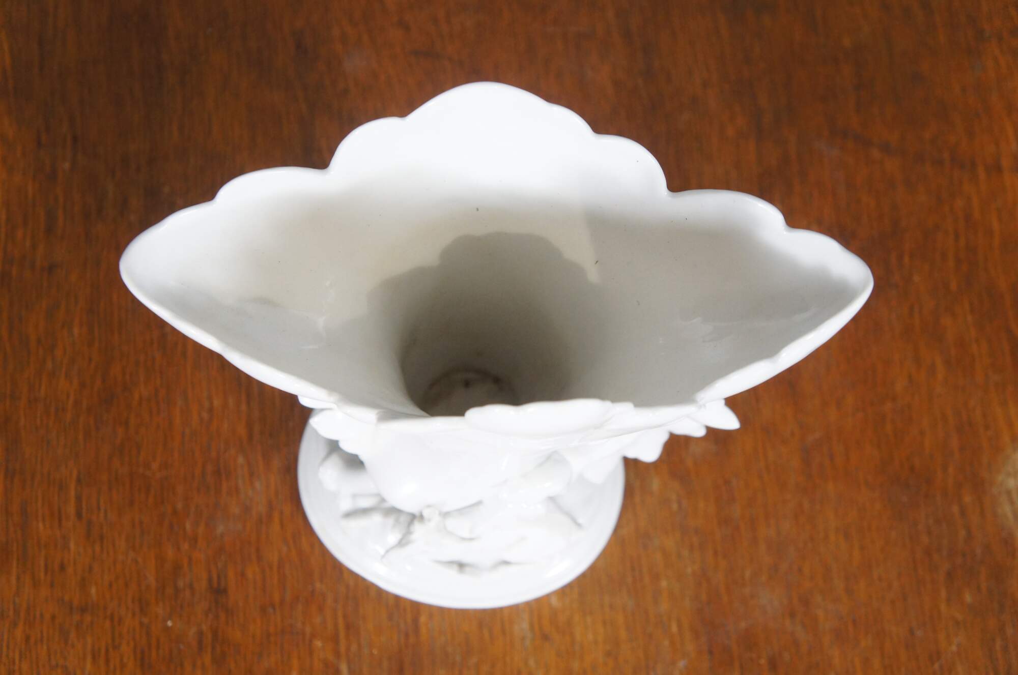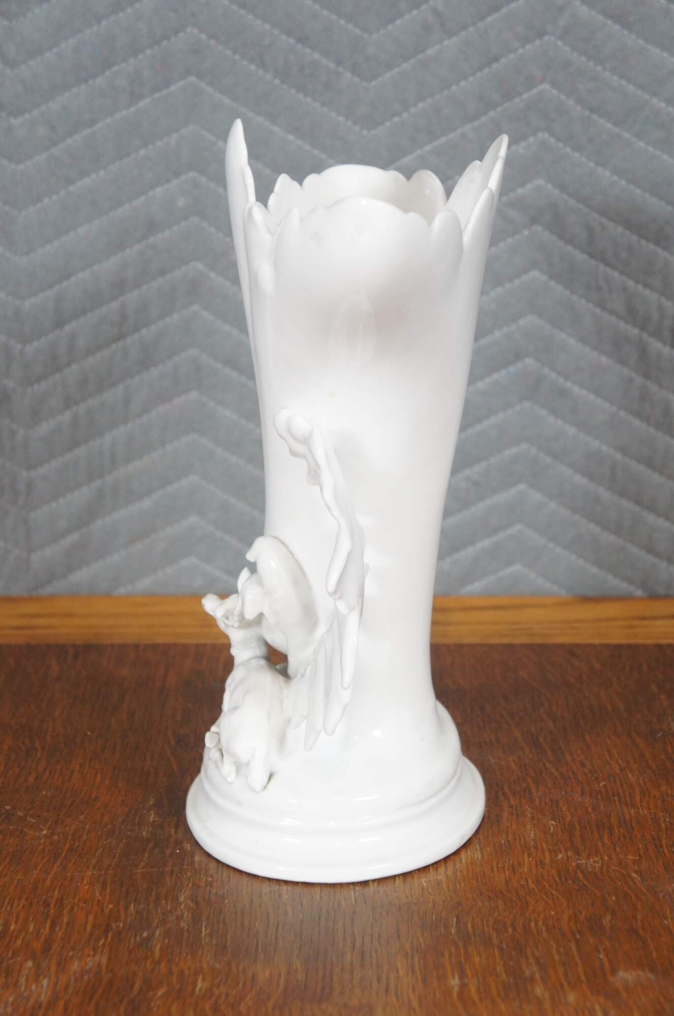 Antique white porcelain spill / flower vase with a broad flared leaf shaped top and a deer / elk reclining on an oval plinth base trimmed with oversized leaves. Impressed on base 1432.