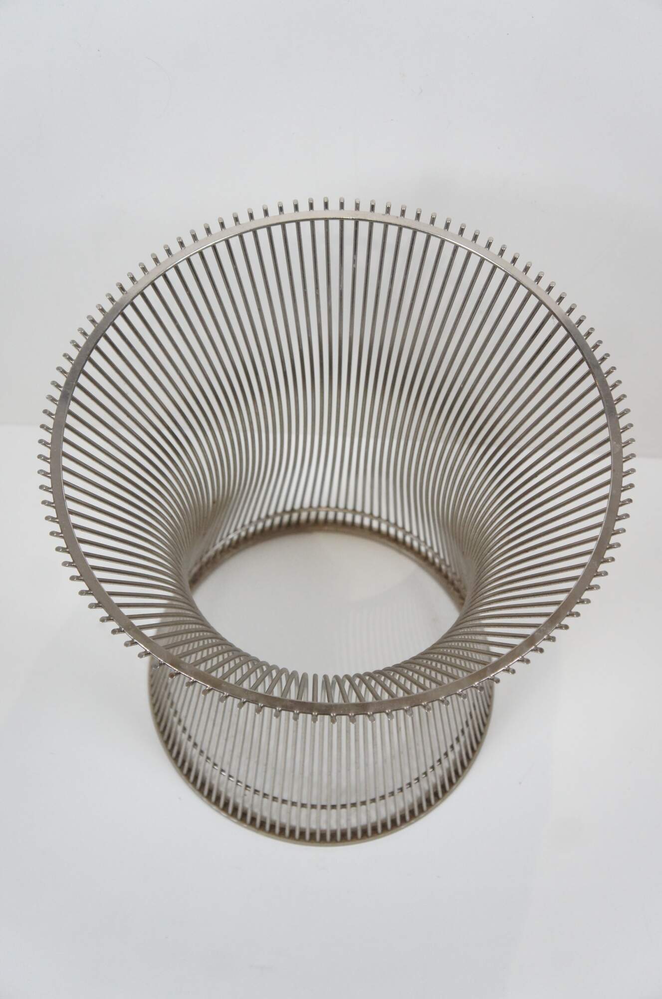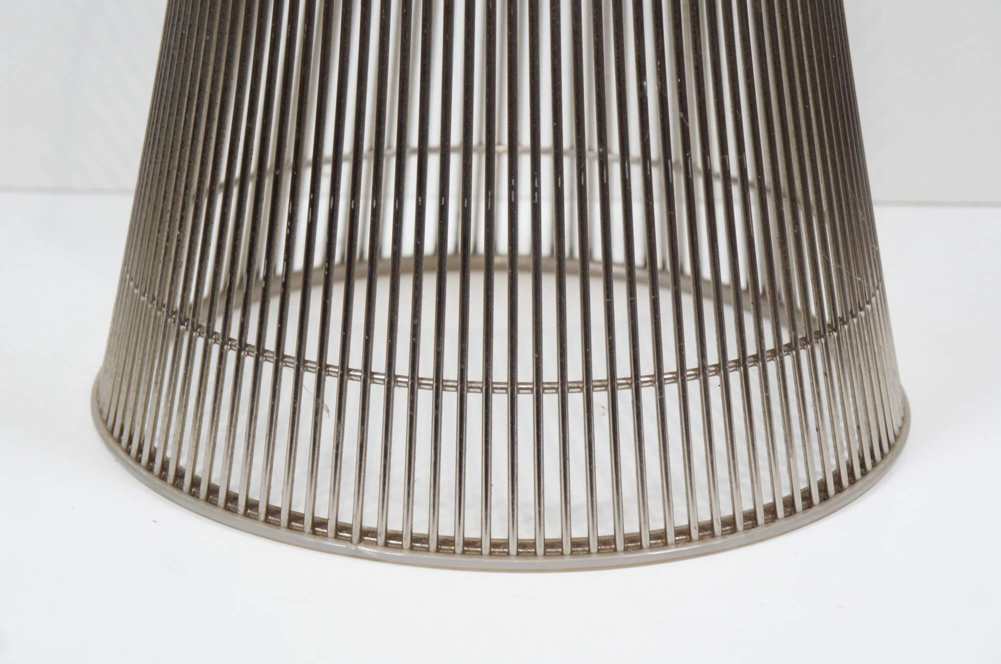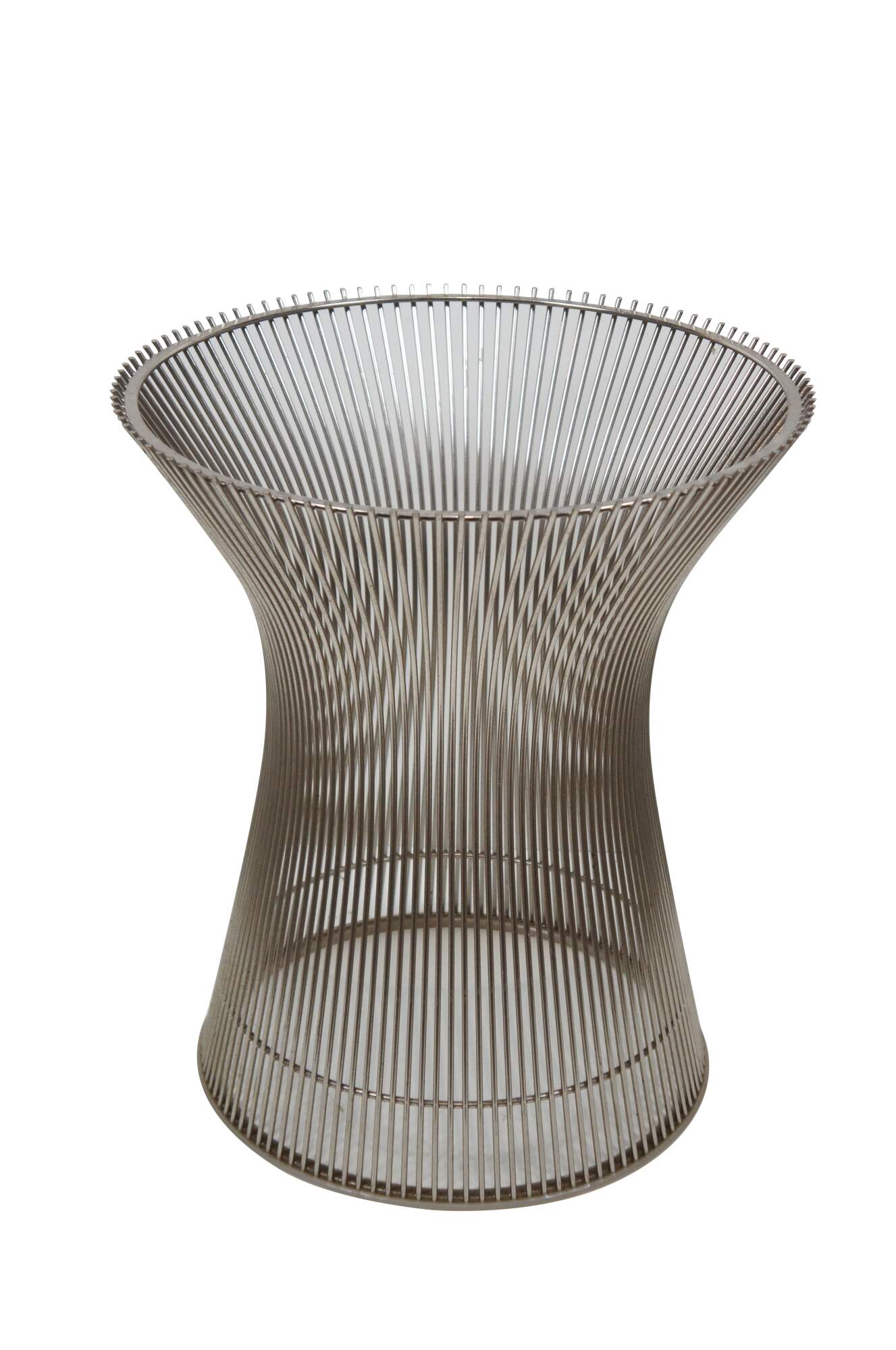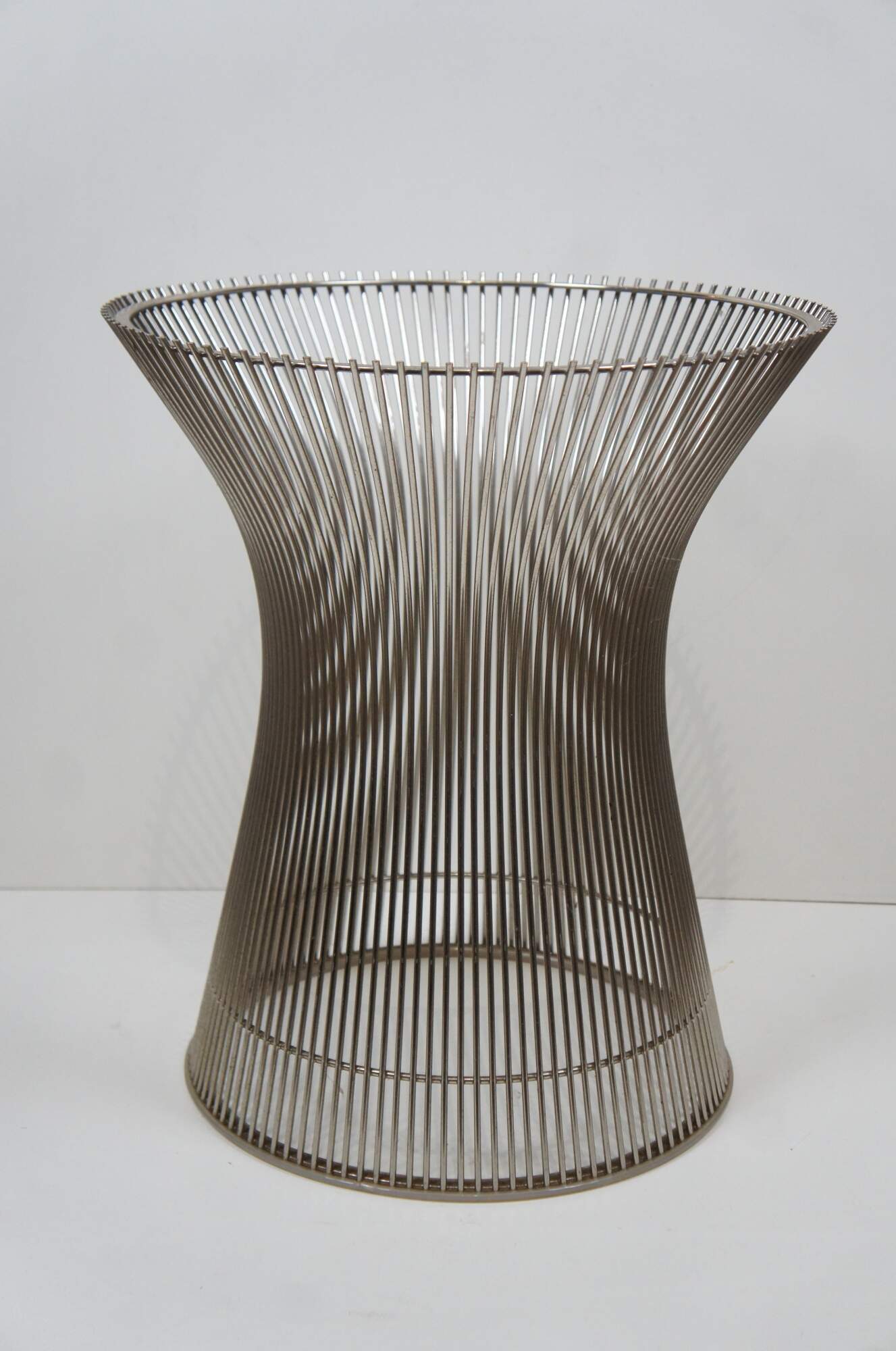 Pair of Knoll wire side / end table bases designed by Warren Platner. Airy steel wire rod construction in a drum-like shape with a plastic ring to protect floors. Mid centruy modern styling. Polished nickel finish. 3710T
