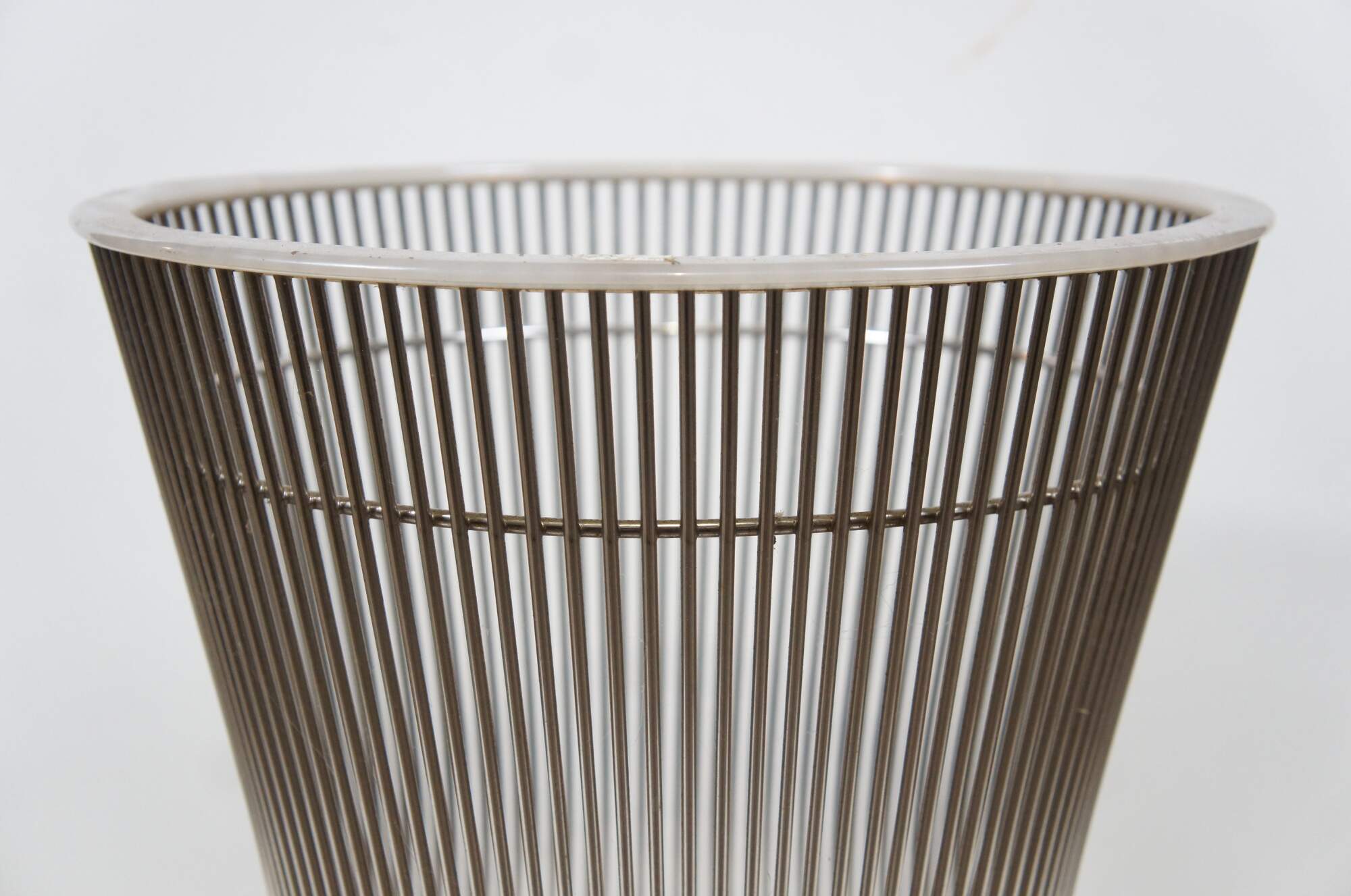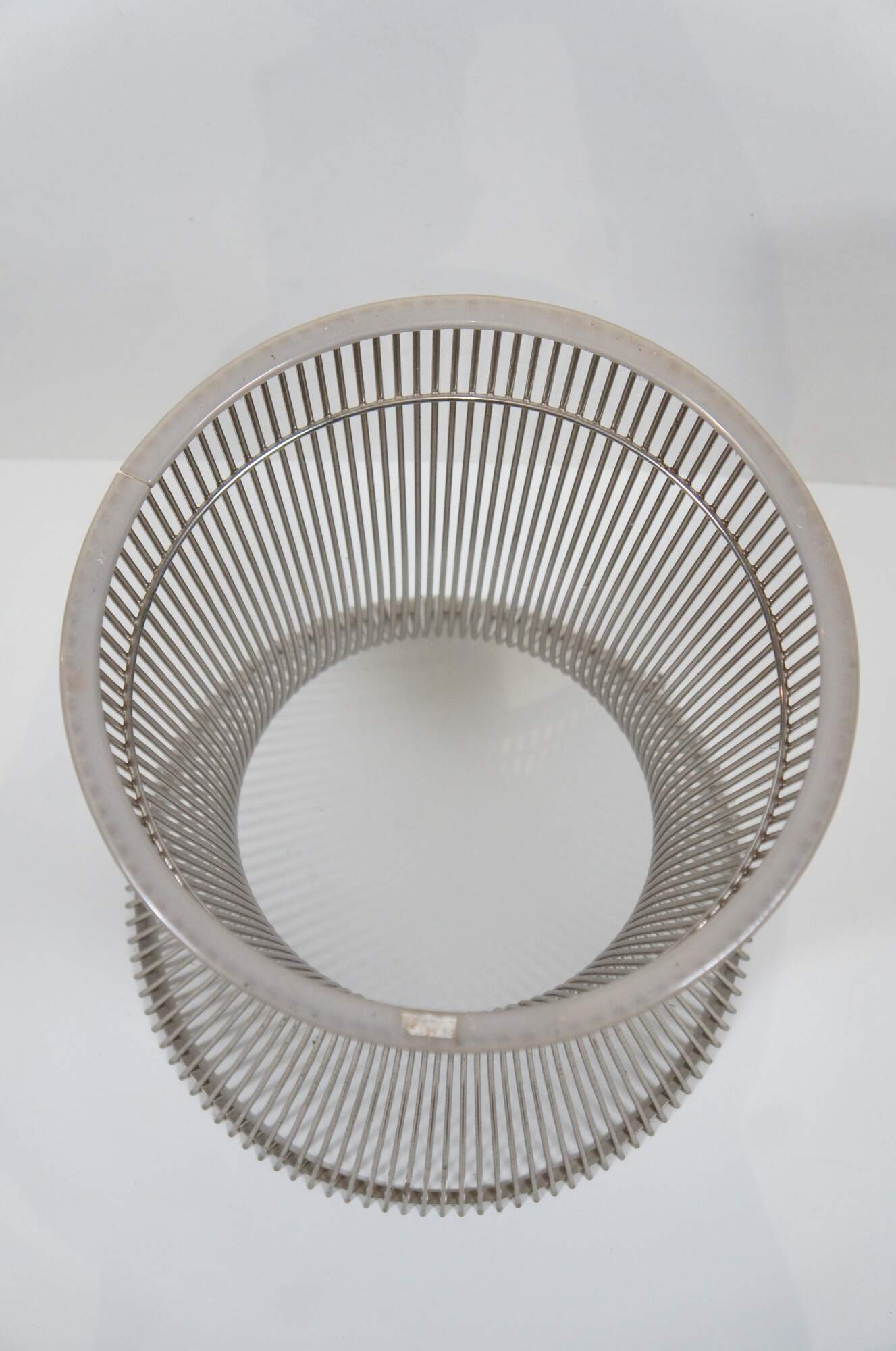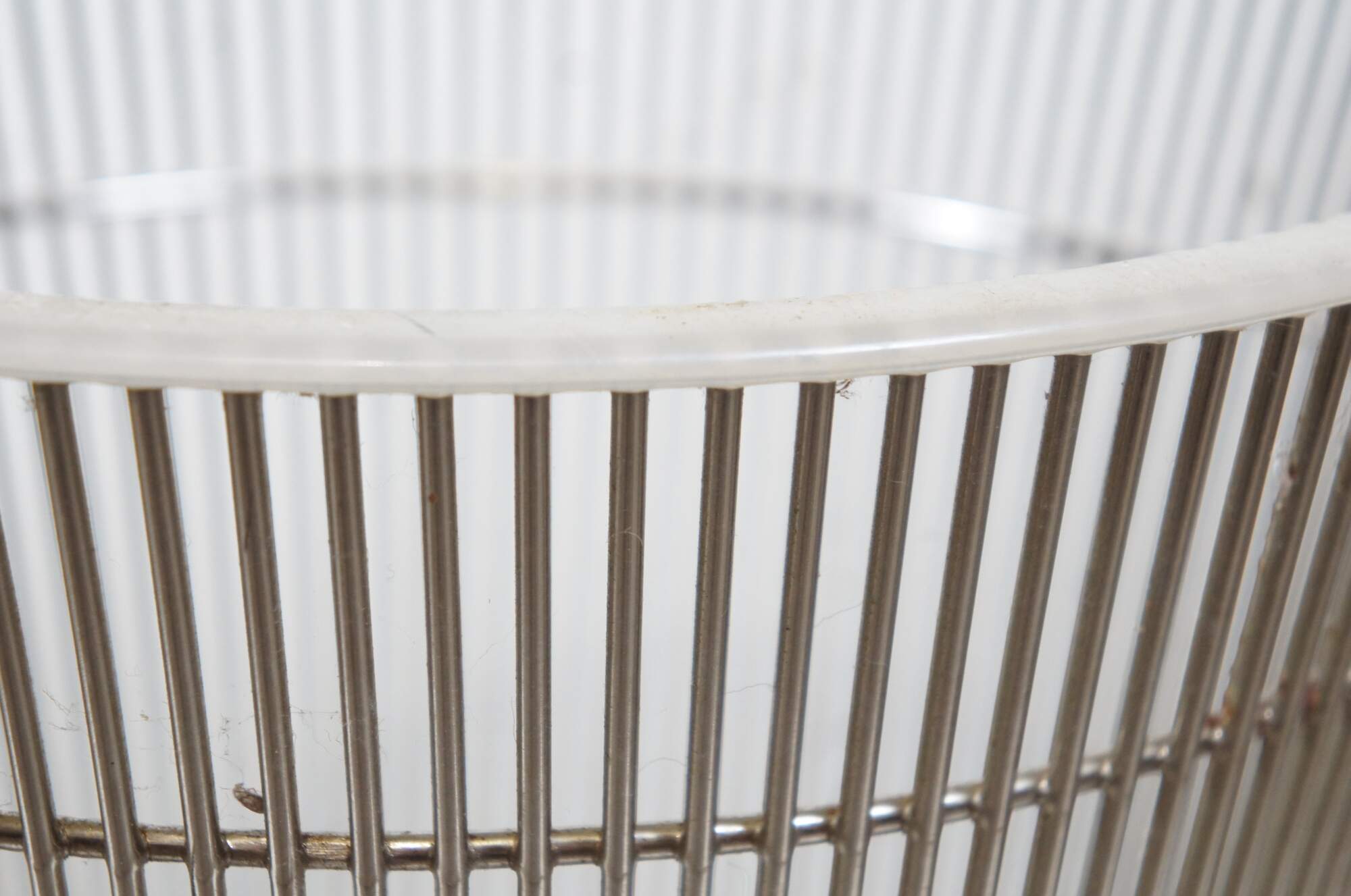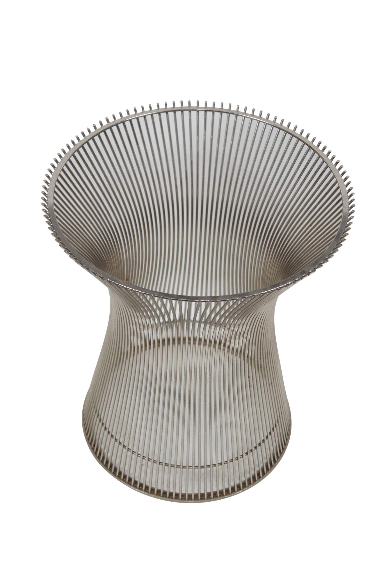 Pair of Knoll wire side / end table bases designed by Warren Platner. Airy steel wire rod construction in a drum-like shape with a plastic ring to protect floors. Mid centruy modern styling. Polished nickel finish. 3710T