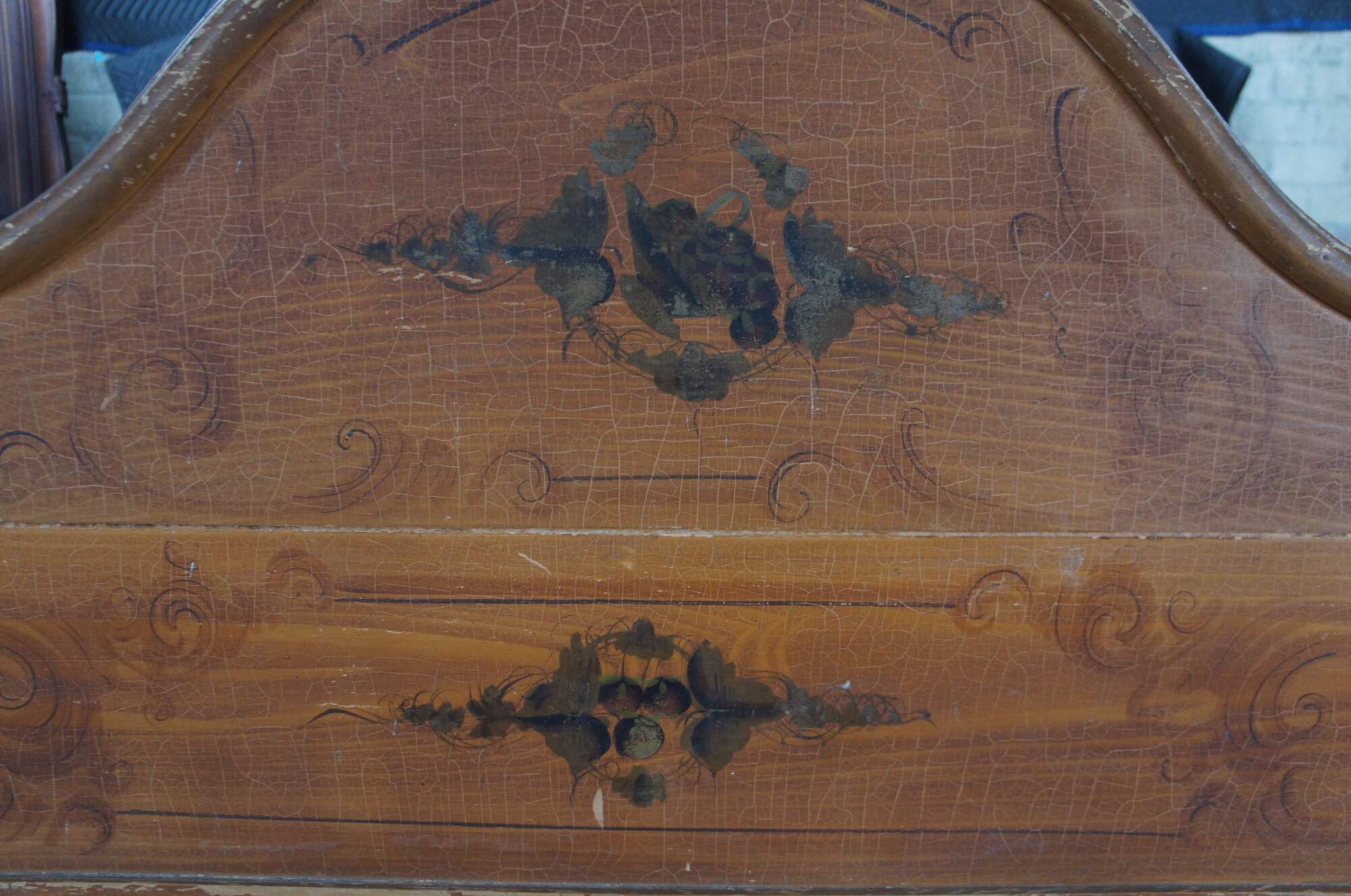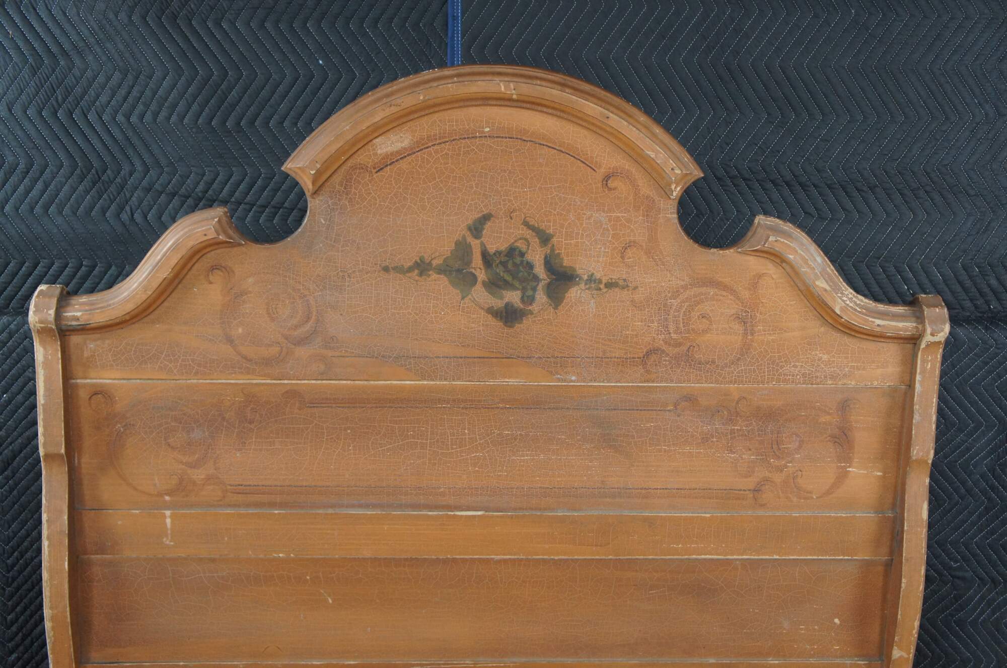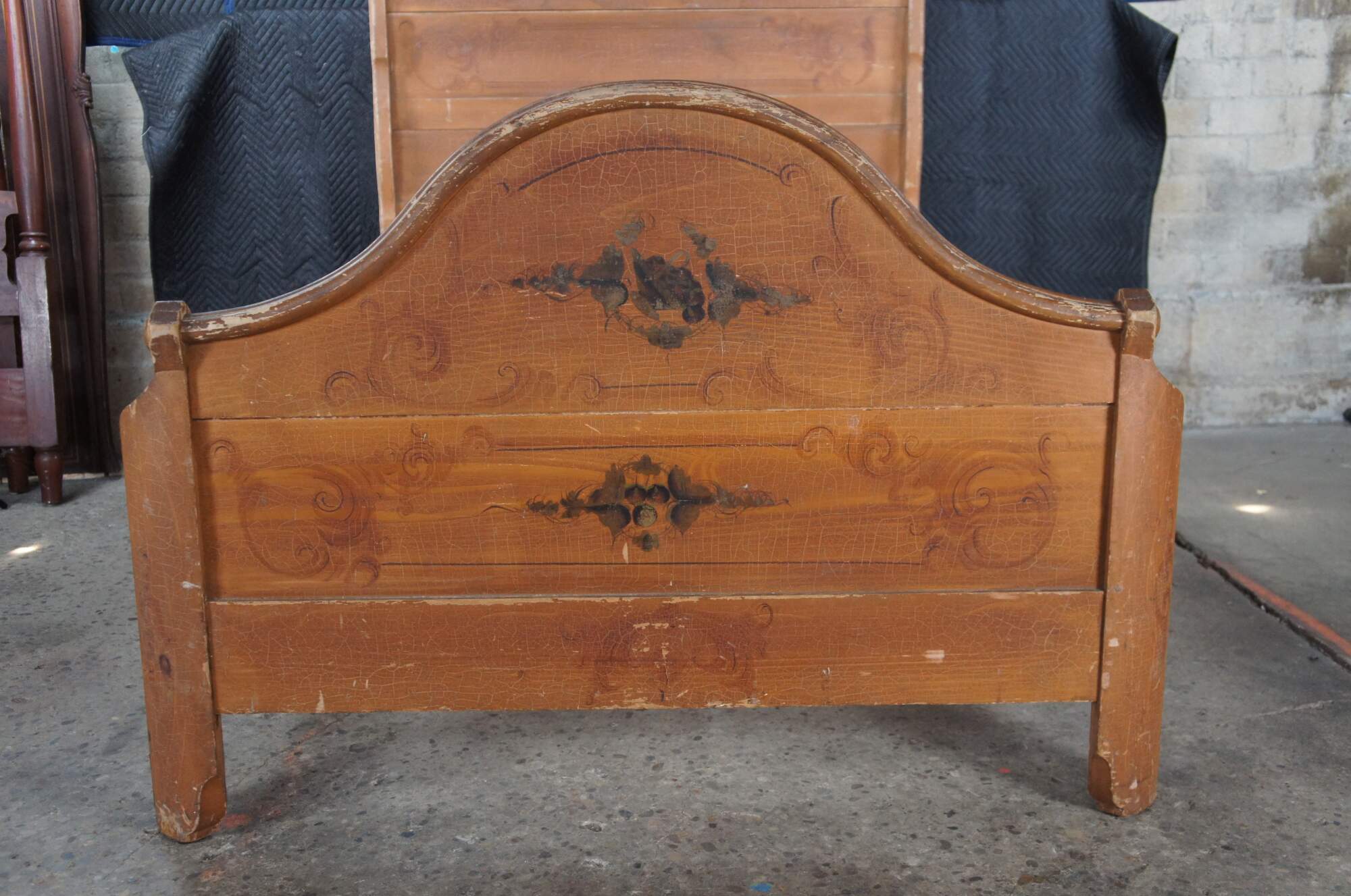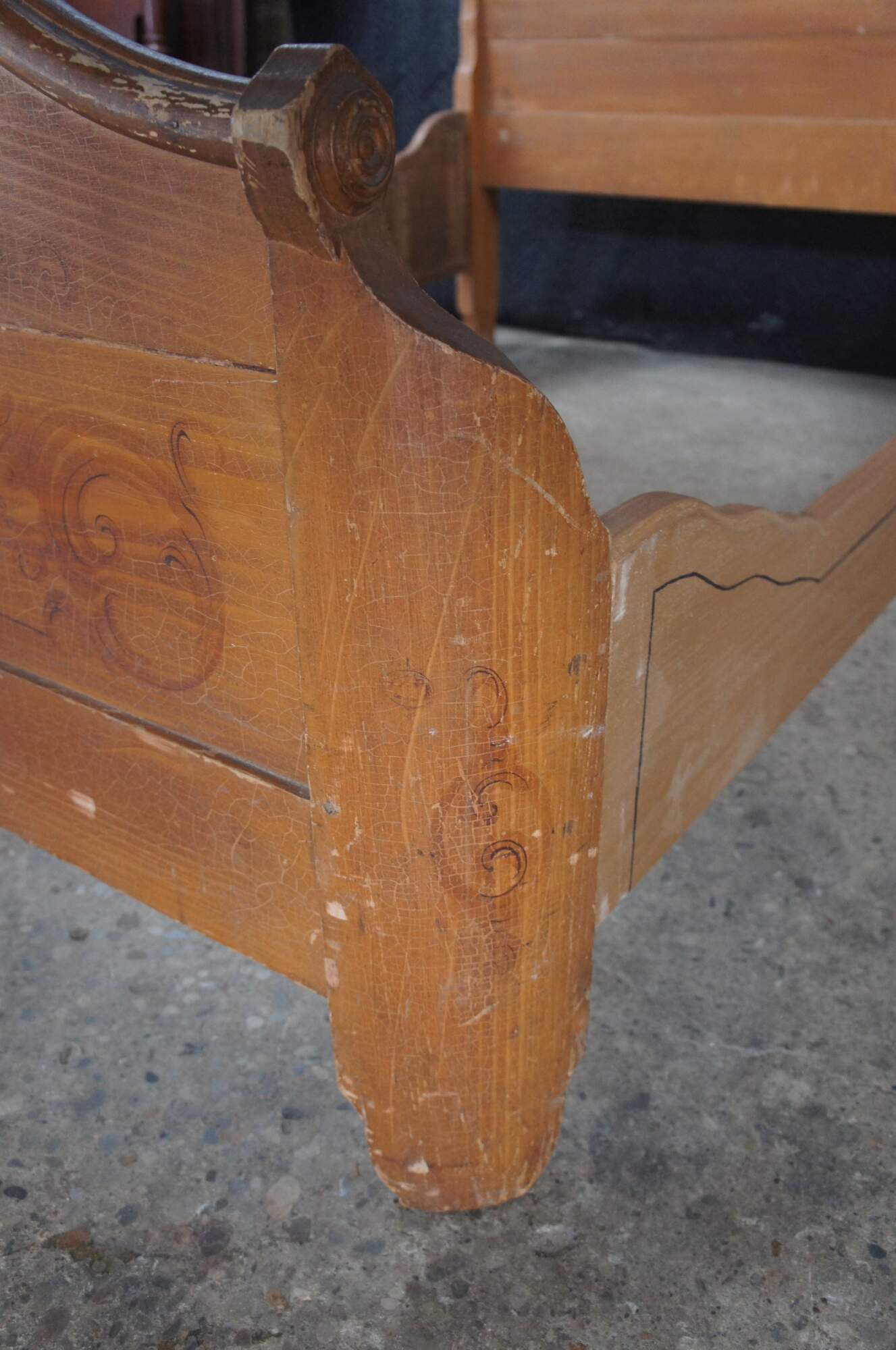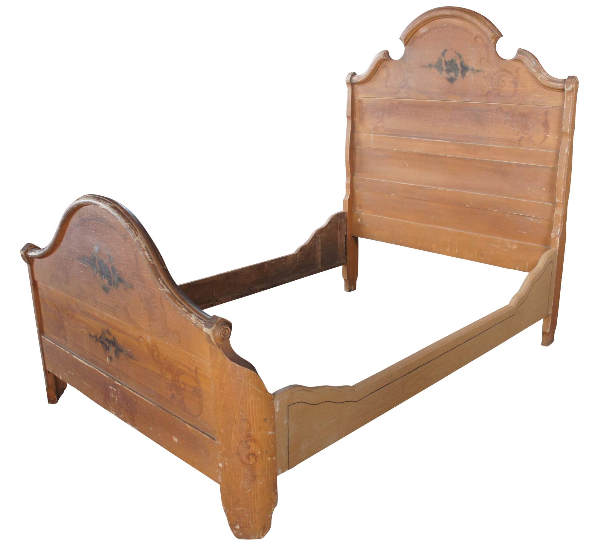 A lovely antique Victorian Era bed frame. Features a paneled pine frame with floral painted accents and scrollwork.