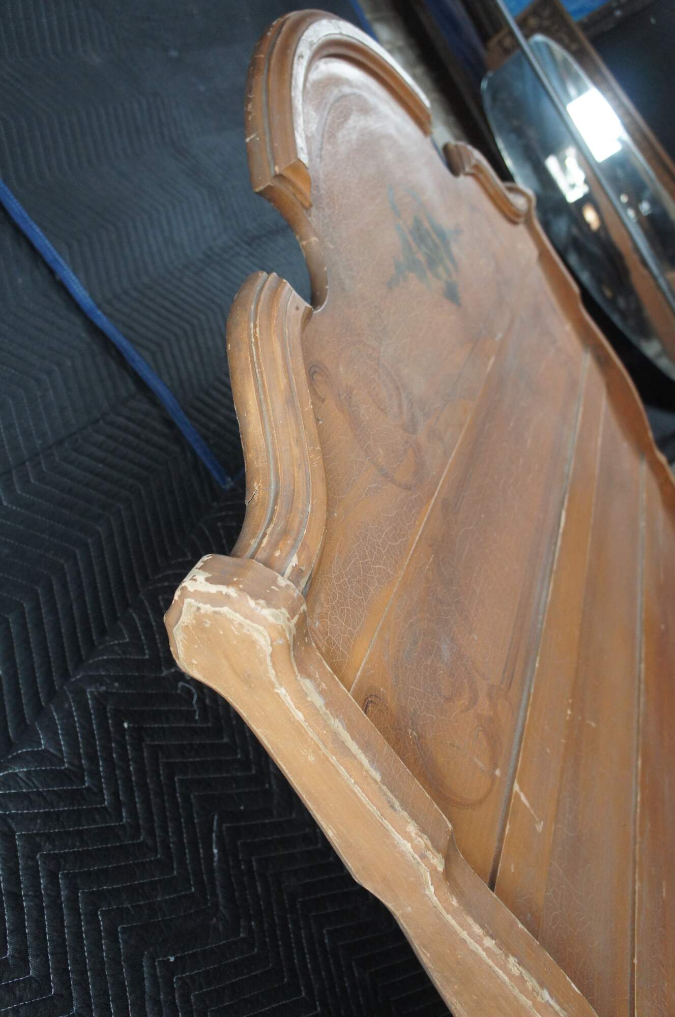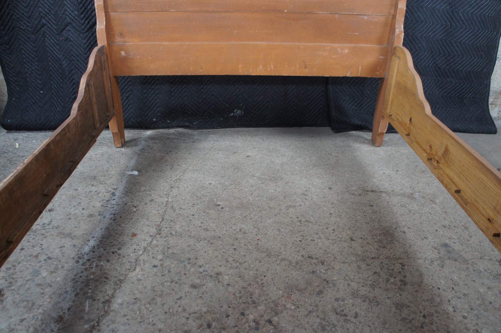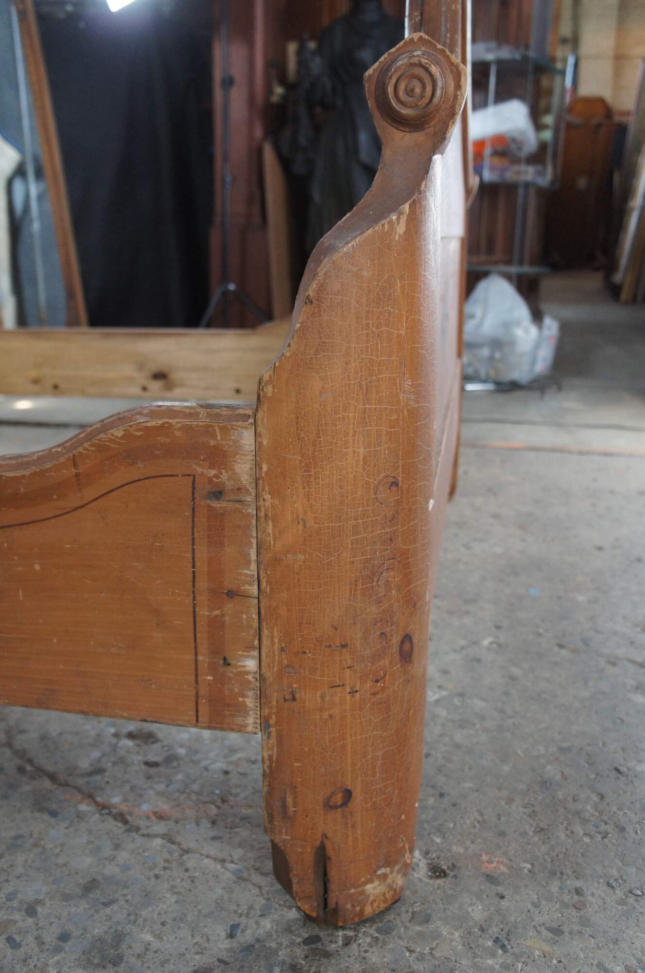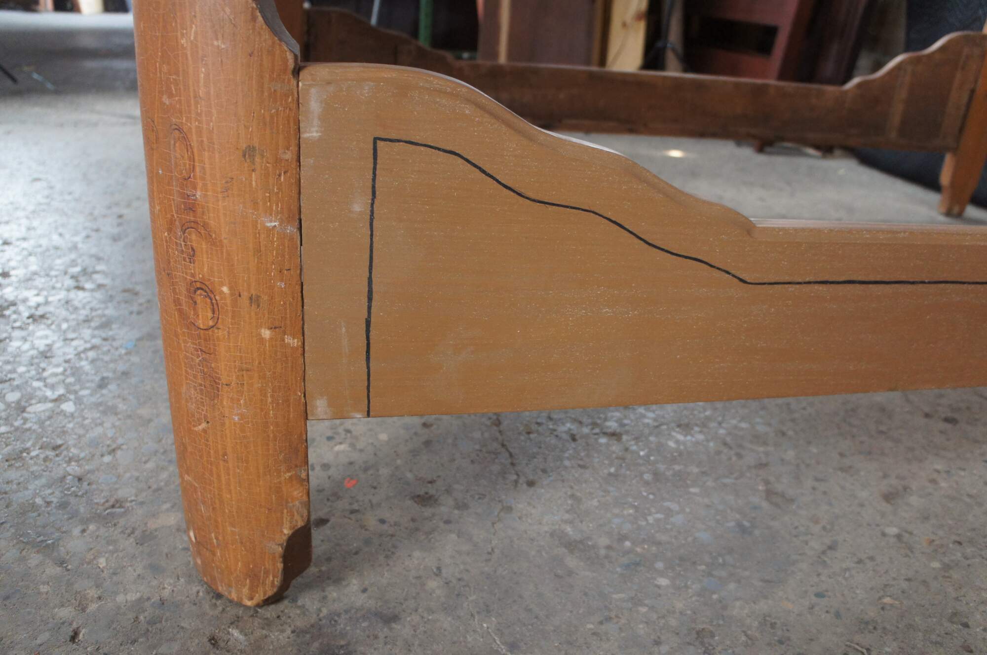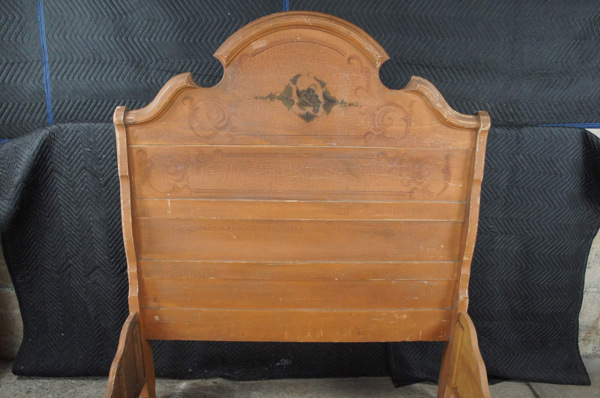 A lovely antique Victorian Era bed frame. Features a paneled pine frame with floral painted accents and scrollwork.