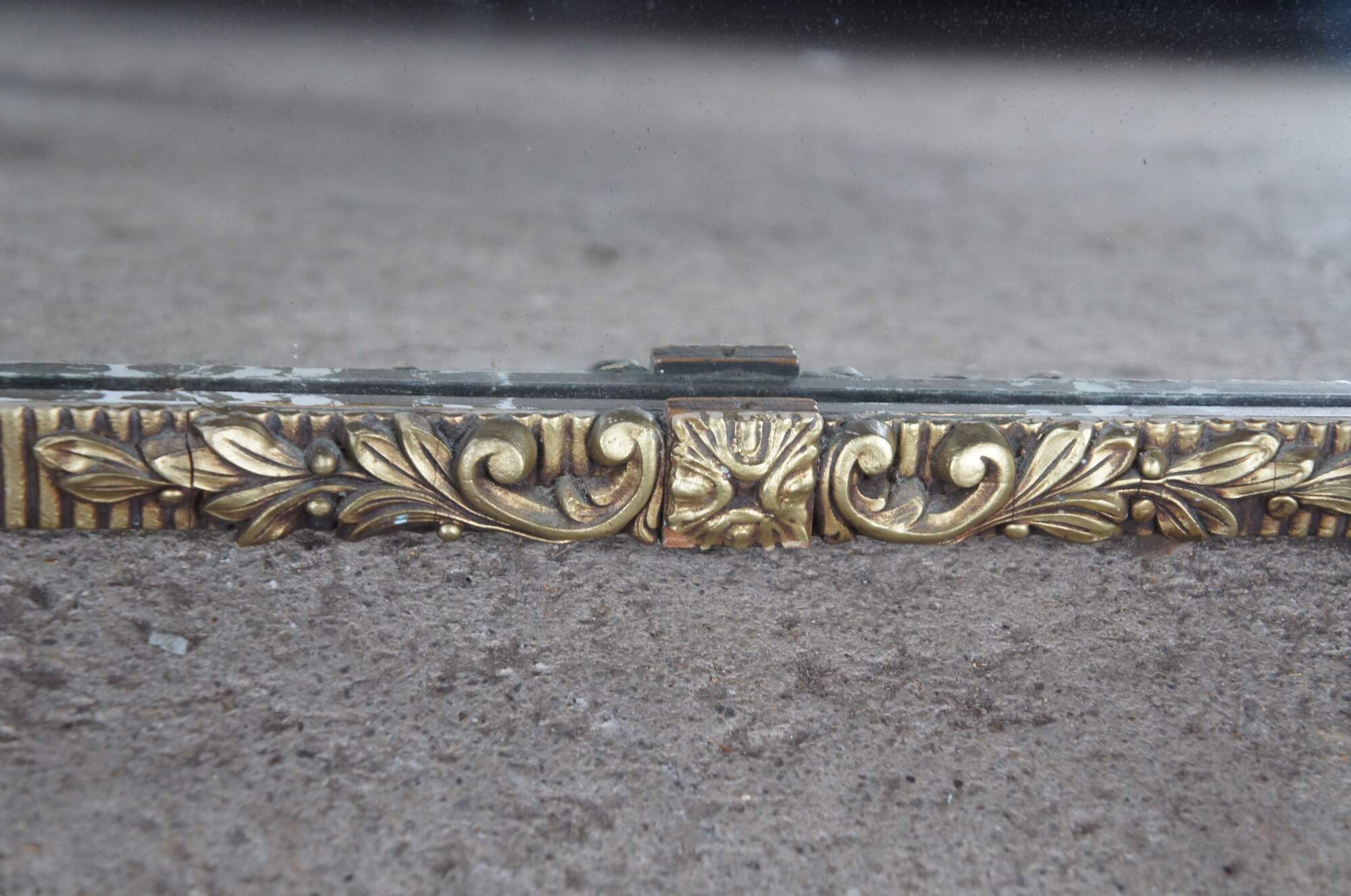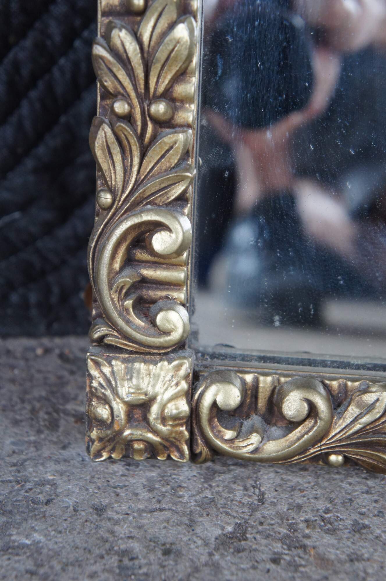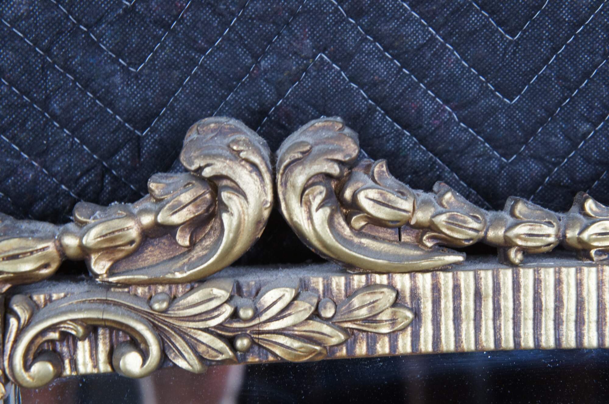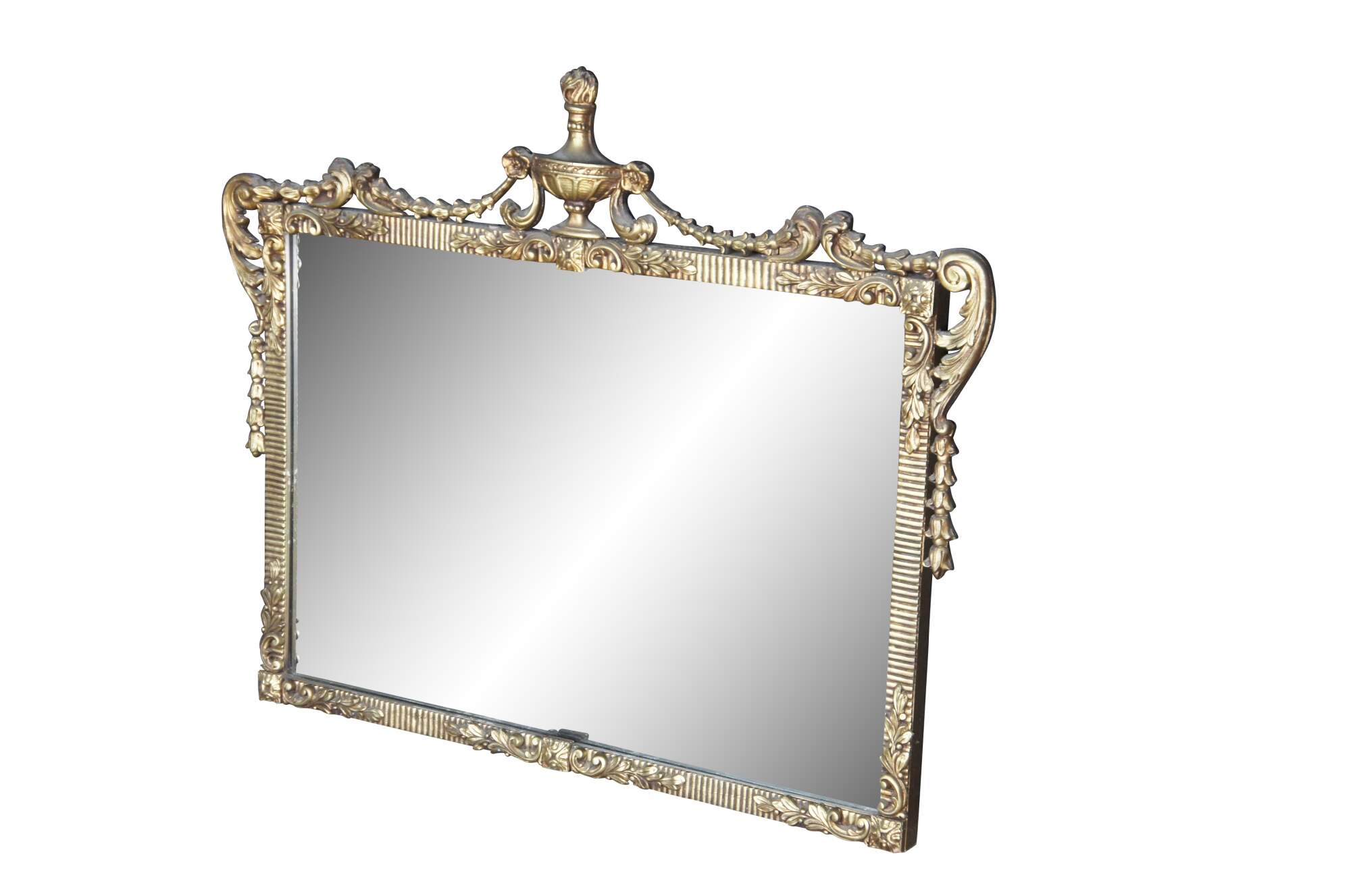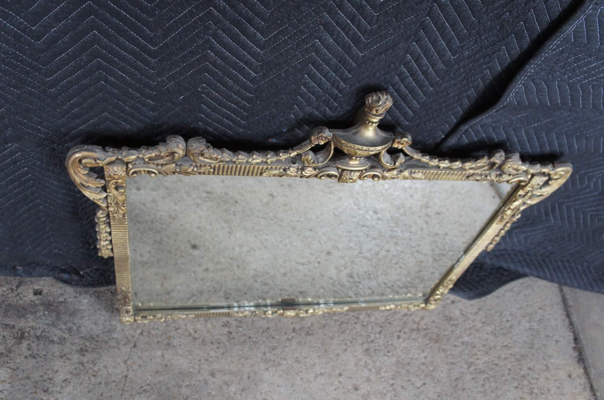 A charming early 20th-century French Neoclassical-inspired mirror. Features a Greek urn-shaped crown with Neoclassical swags and foliate detail. The rectangular frame showcases French medallions, foliate vine detail, 'C' scrolled accents, and ribbing.