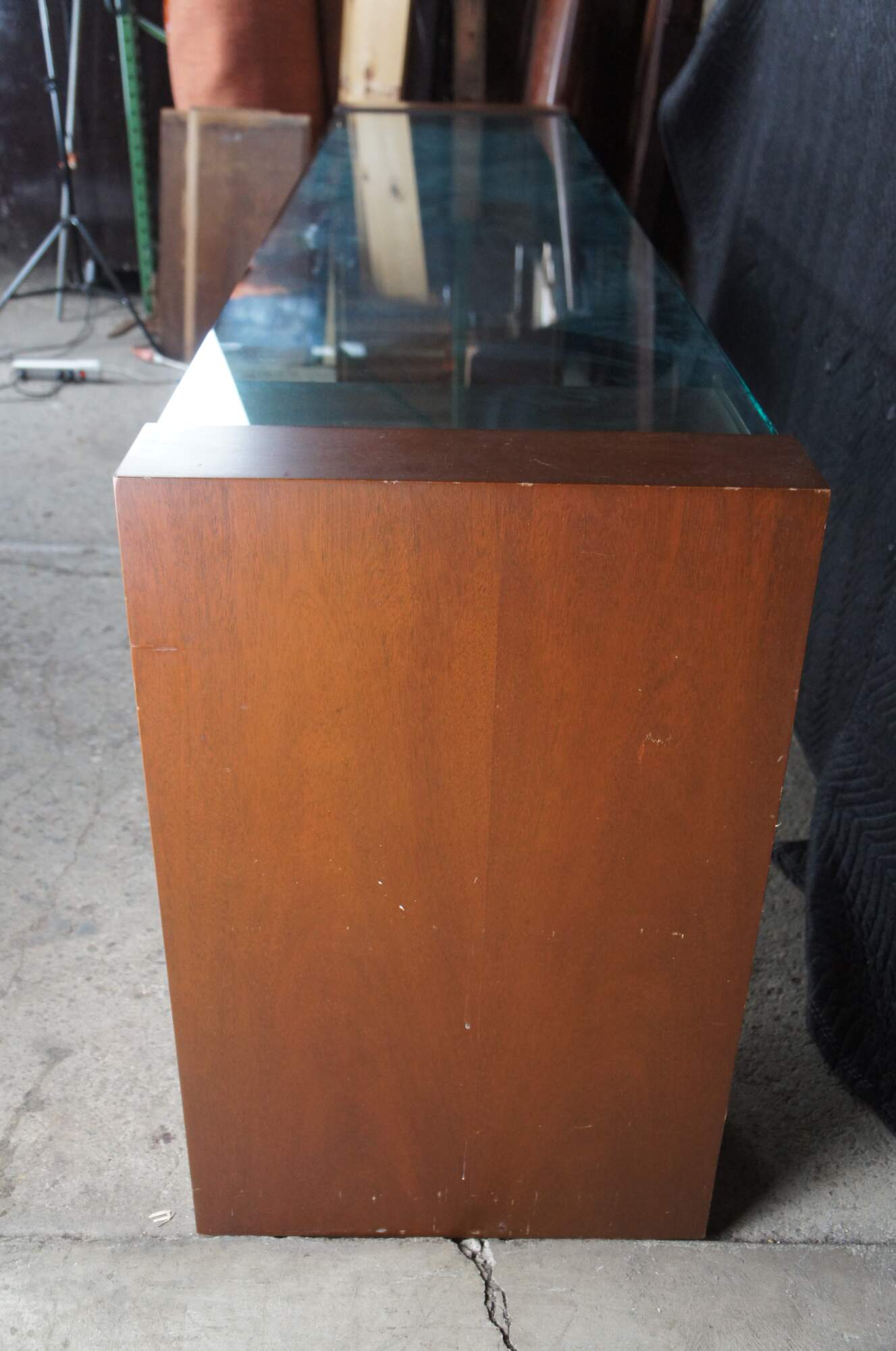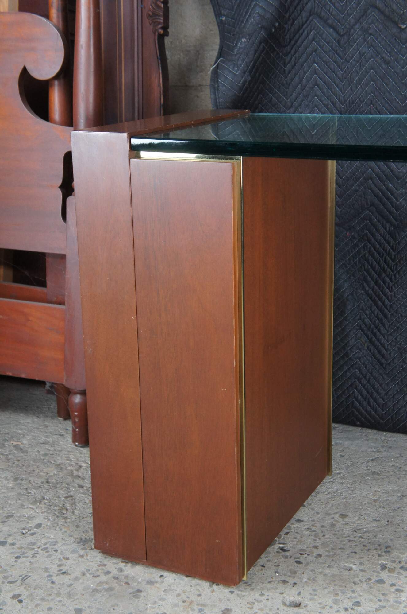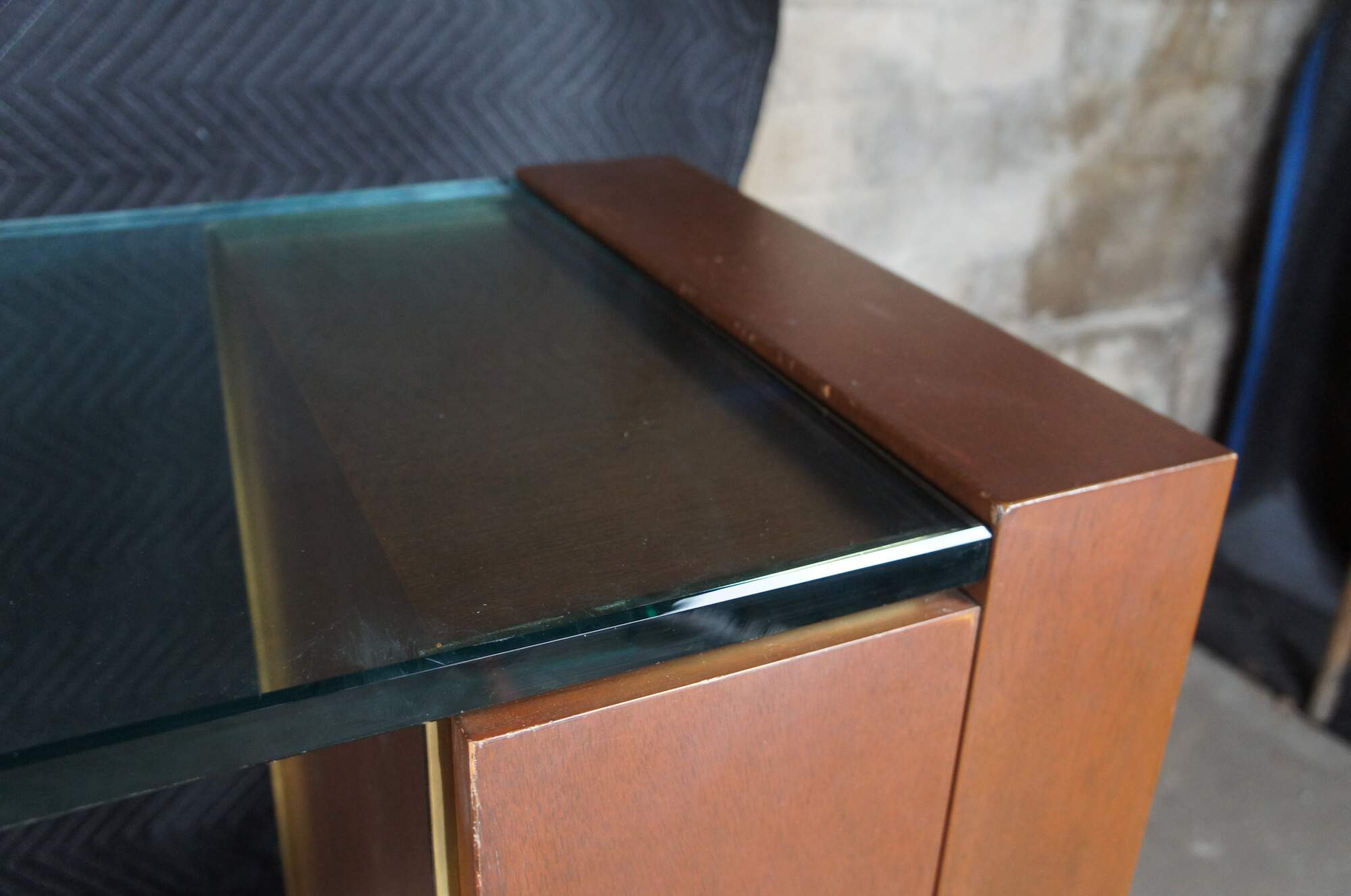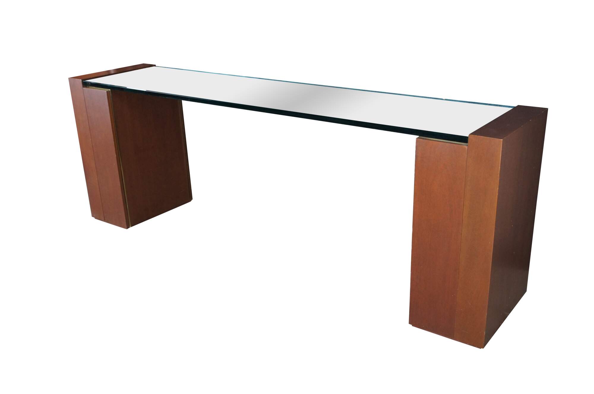 1980s Post Modern Console, Sideboard, Server or Drybar. Features a large pencil polished glass surface centered between two mahogany pedestals. Each pedestal is trimmed in brass along the top and insides