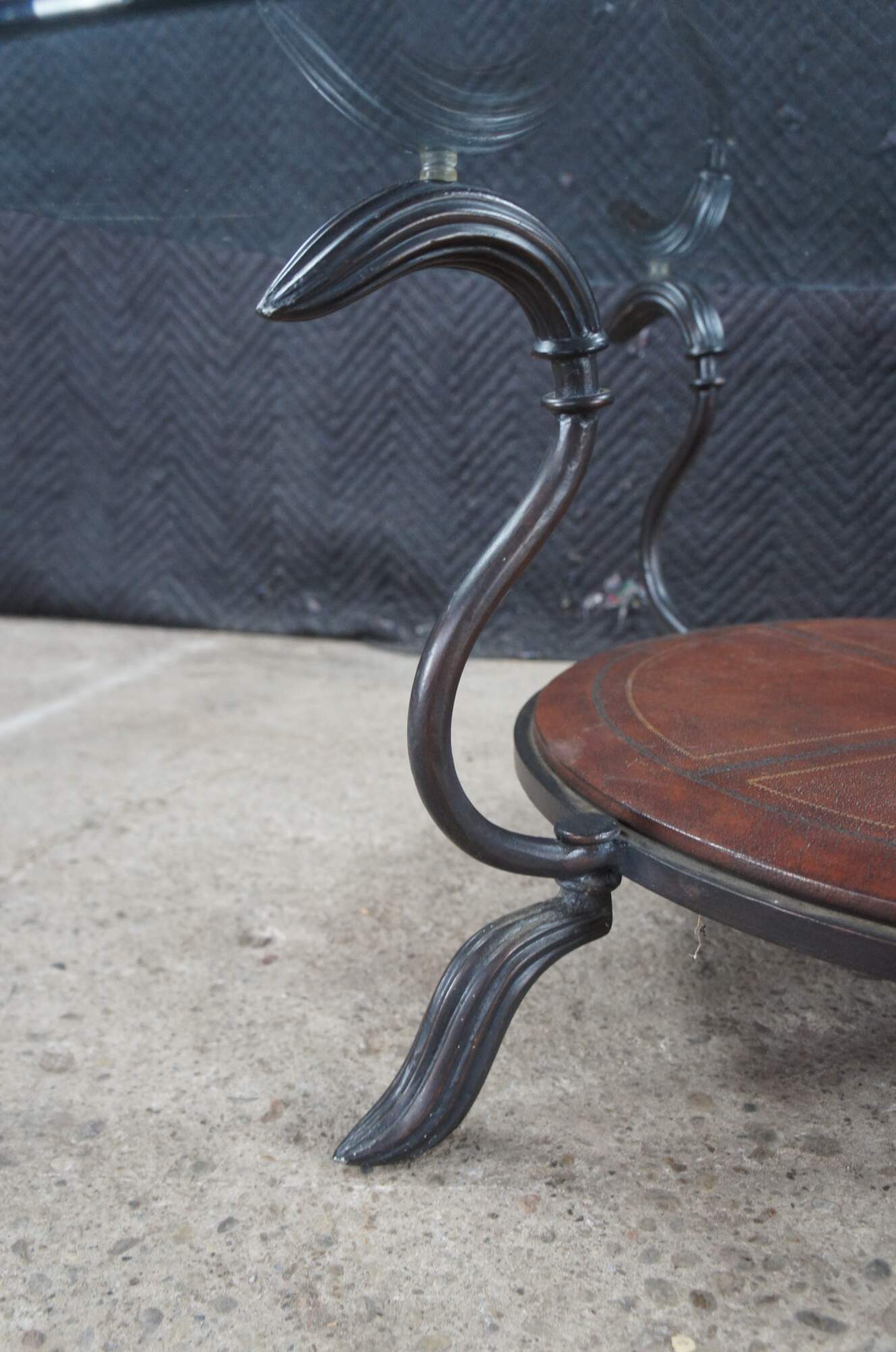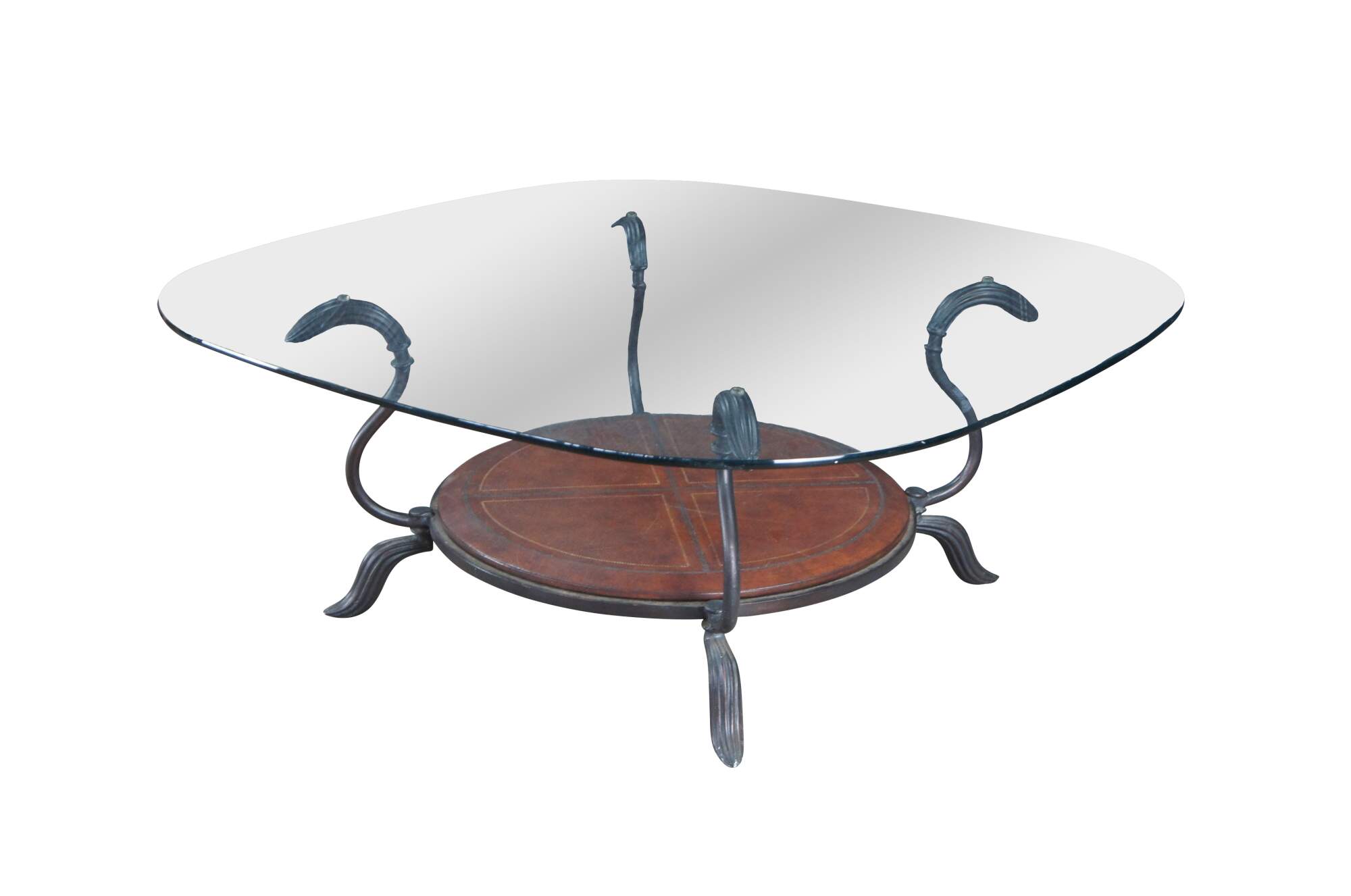 A contemporary coffee table by LaBarge, circa 1990s. Features a pencil polished glass top over a swooping iron base with tooled leather lower tier.