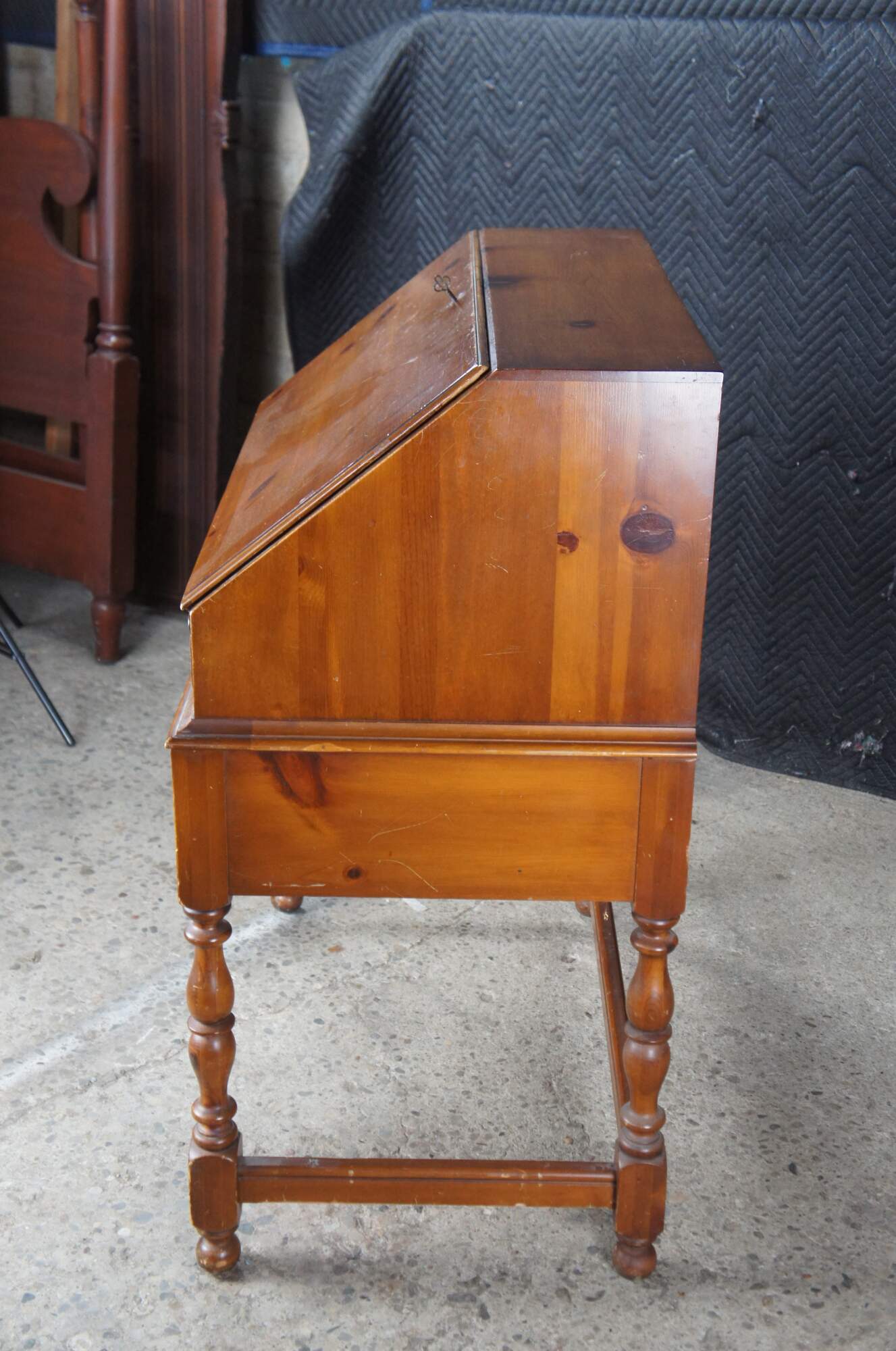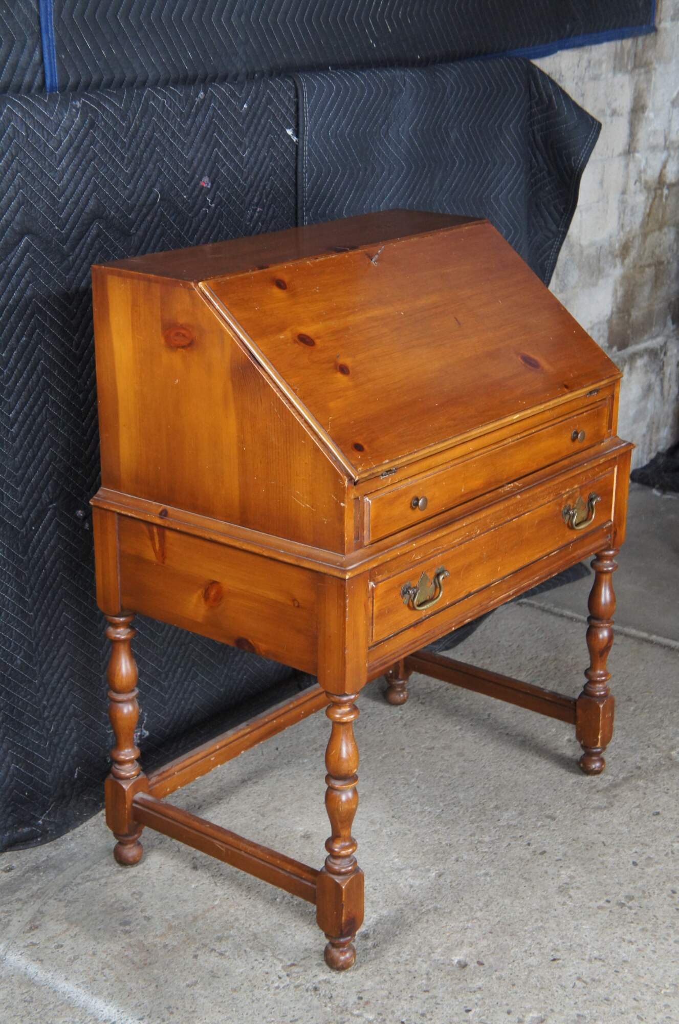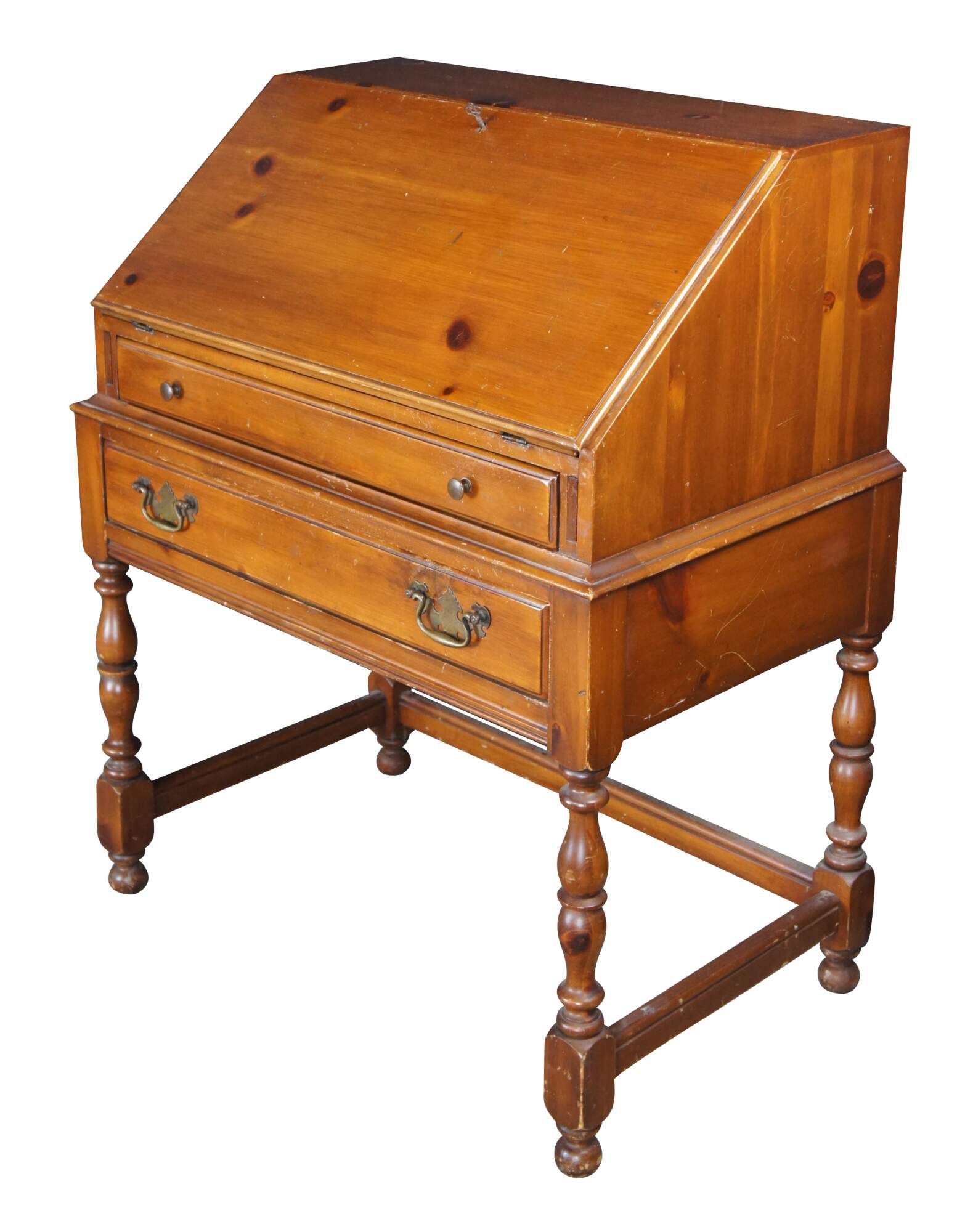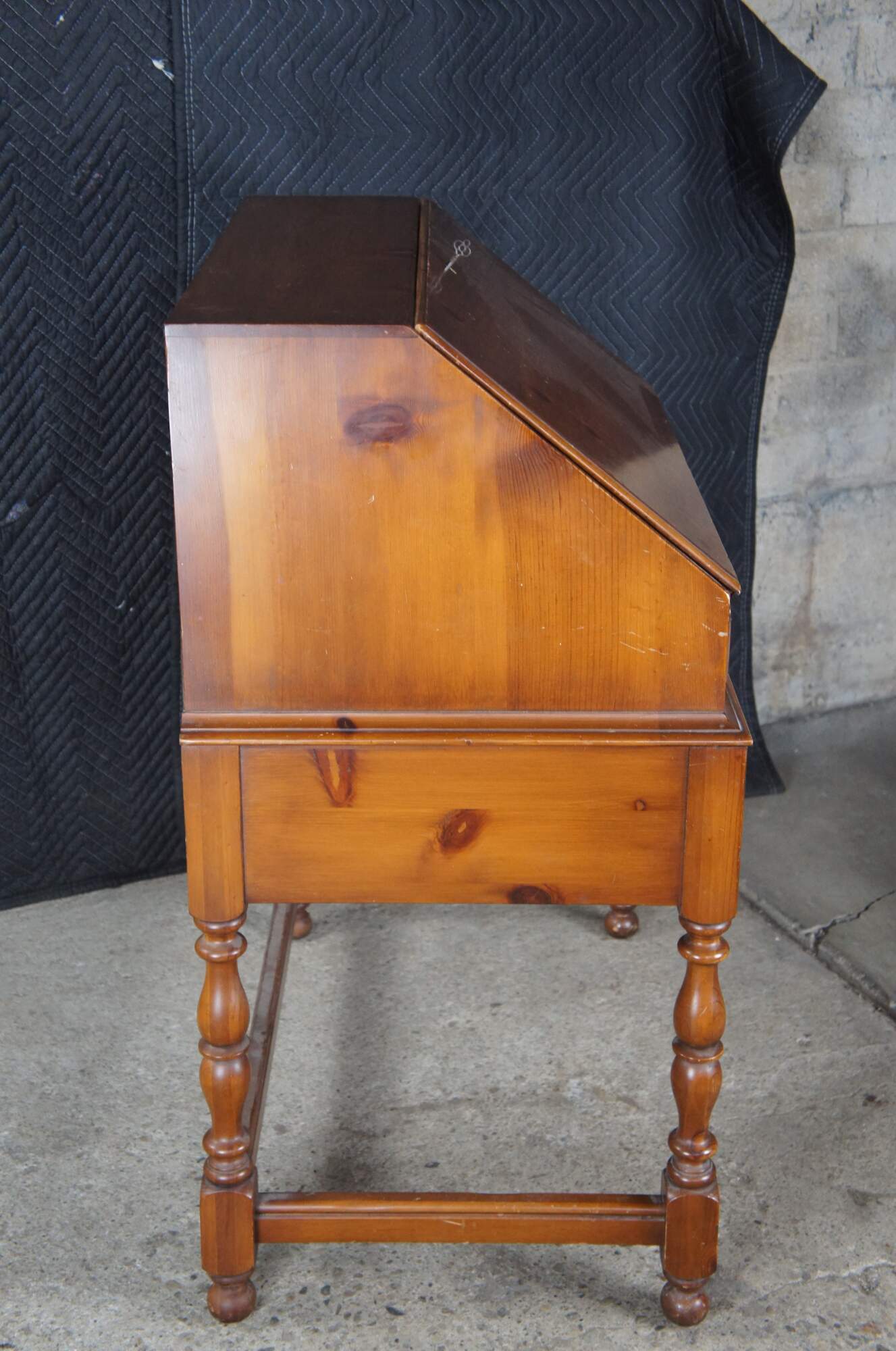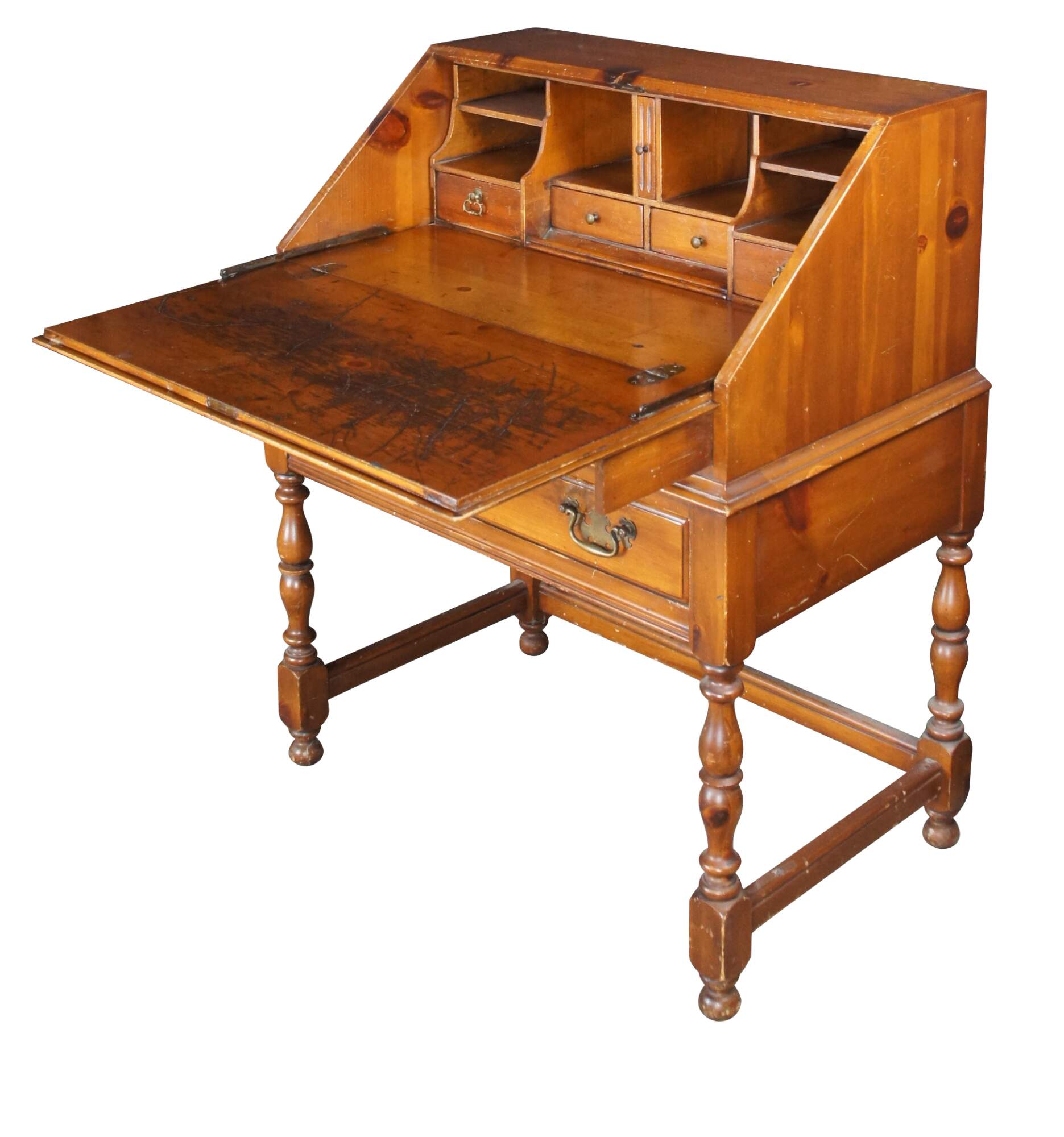 Davis Cabinet Company Secretary Desk, no 376 circa 1950s. Made from American pine with a lockable slant top that opens to a writing surface, with four rabbet jointed drawers and pigeon holes. The secretary is set over two large dovetailed drawers for accessory storage and supported by turned legs with bun feet. Finish Antique Pine.