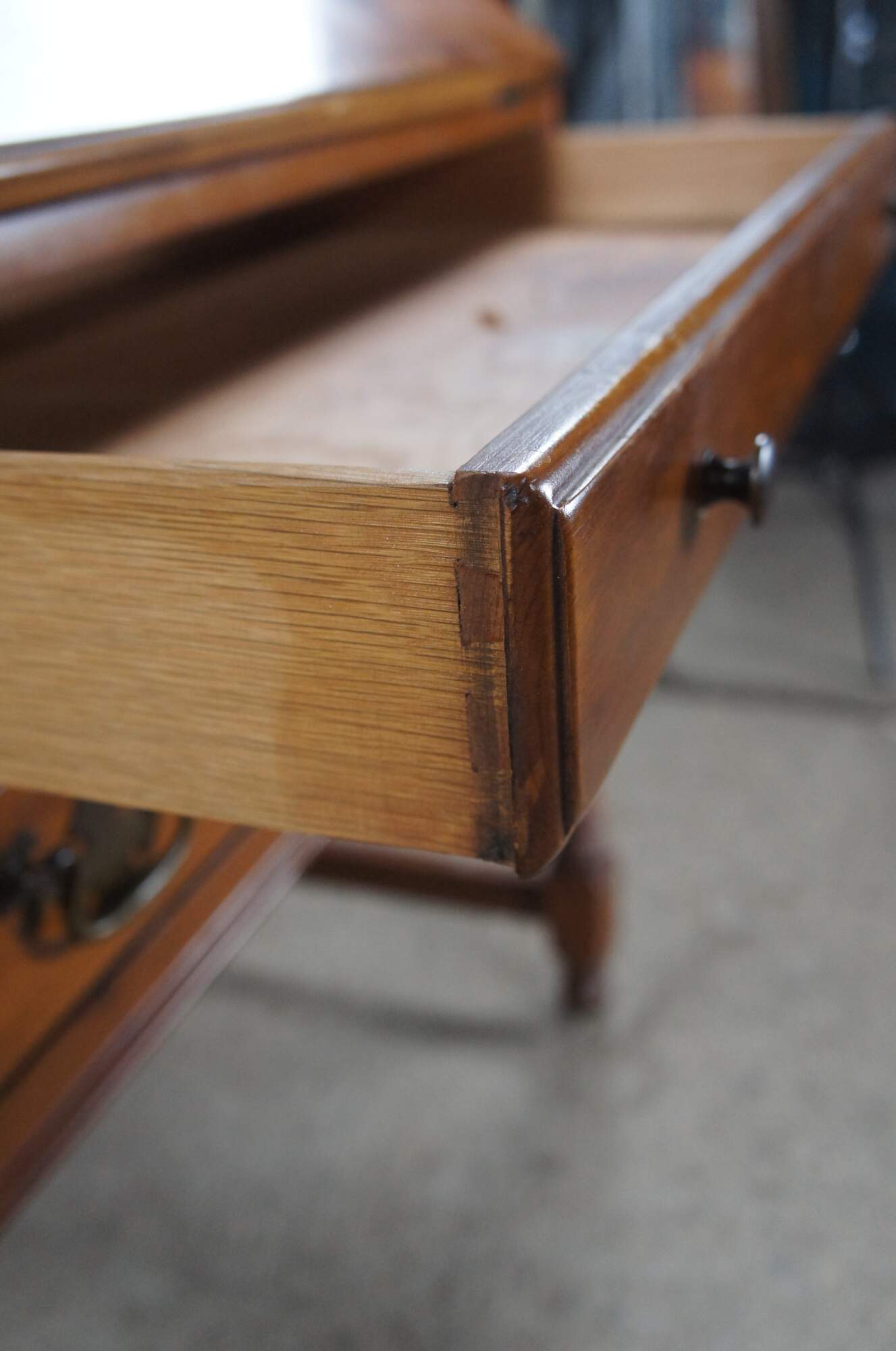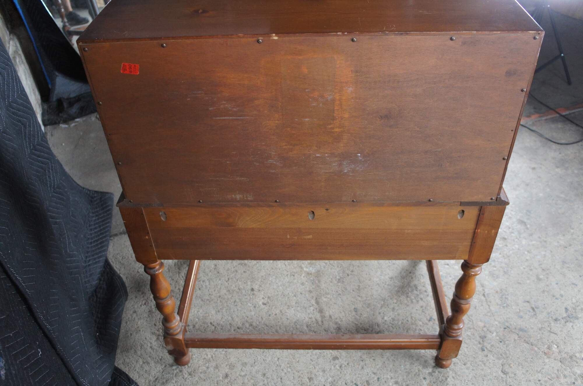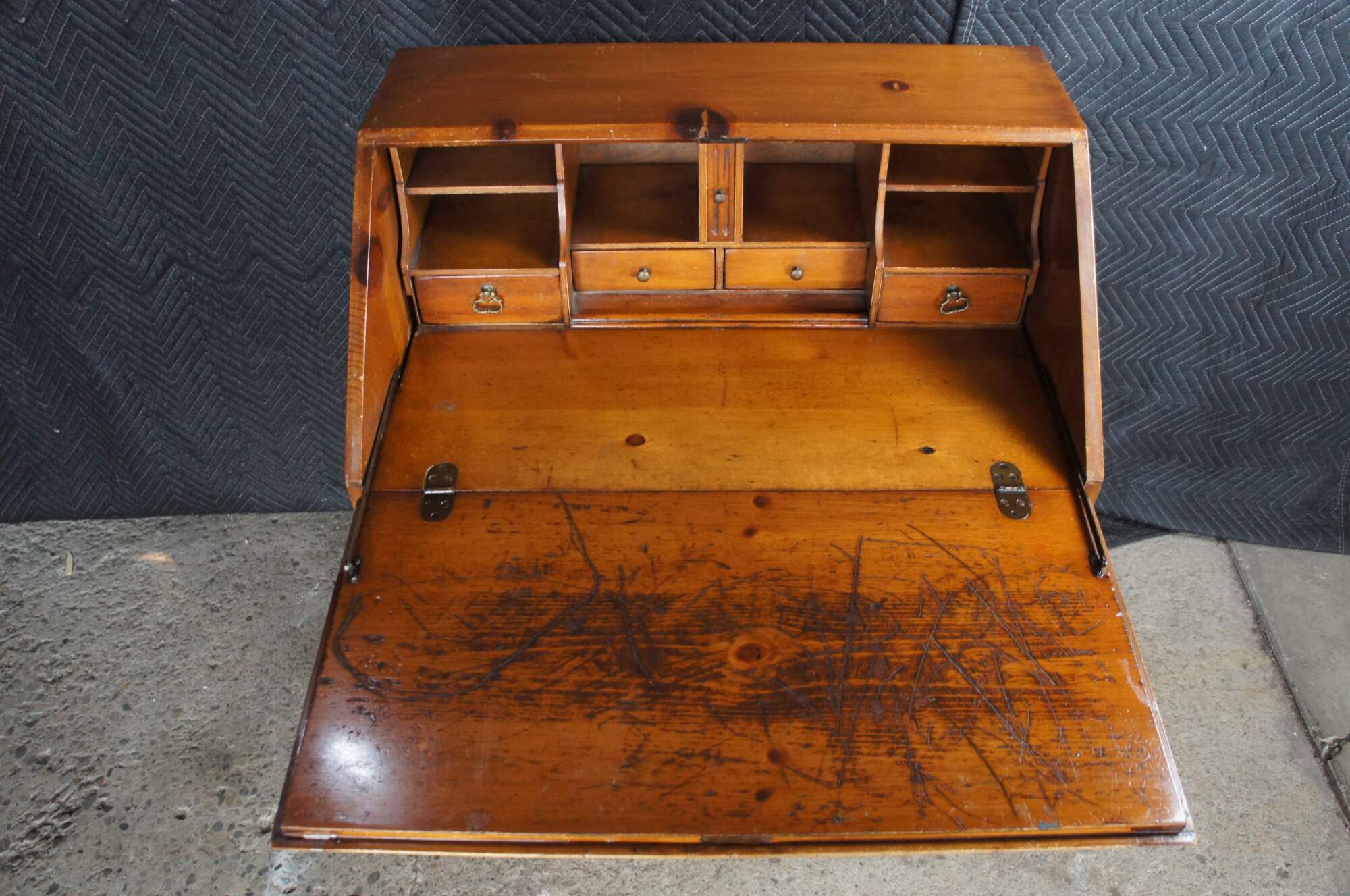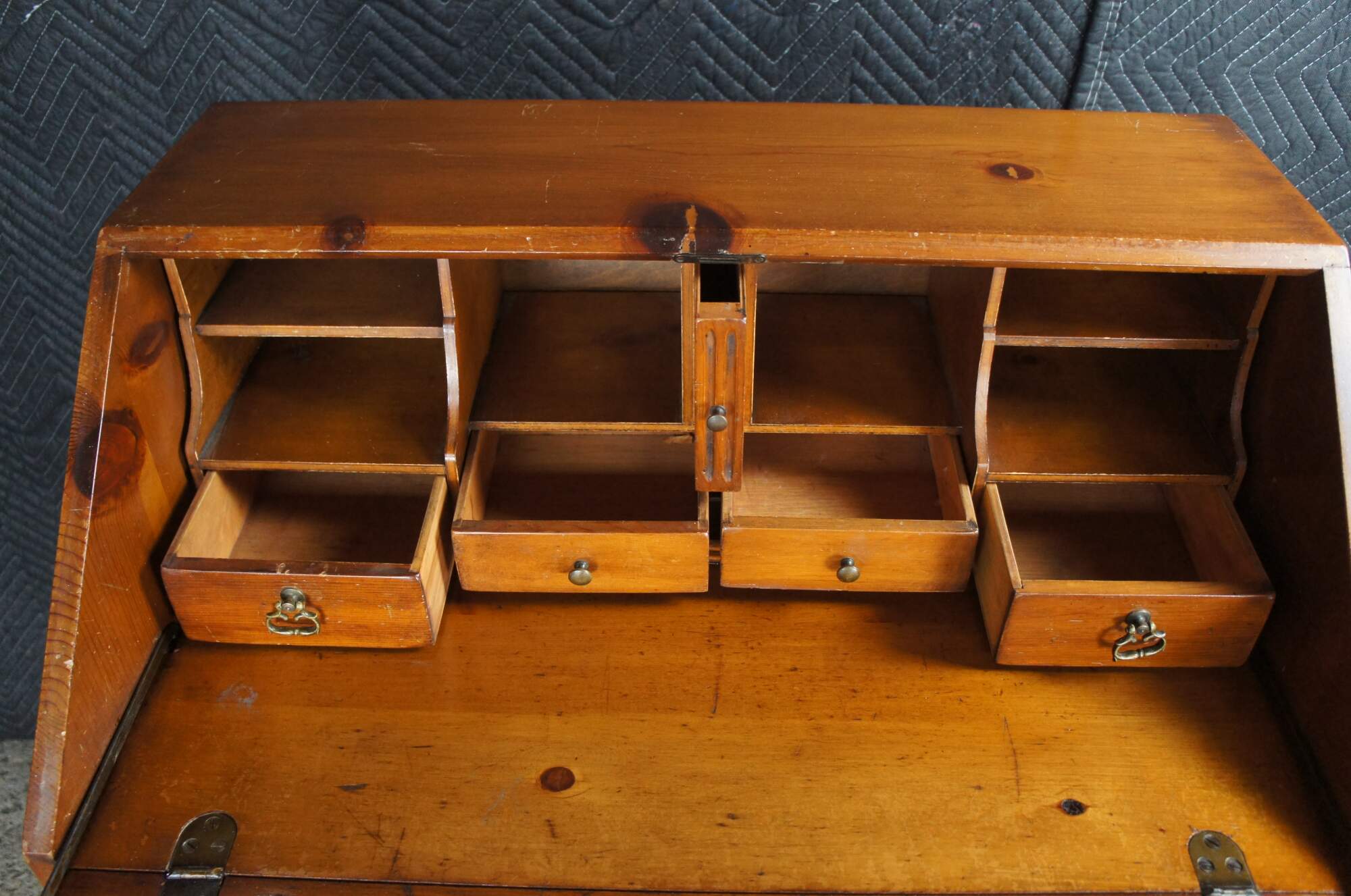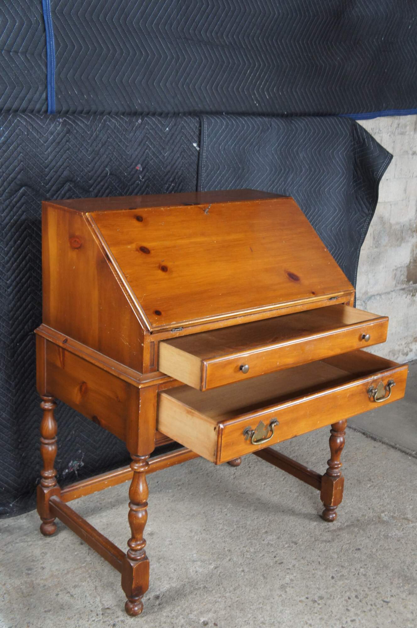 Davis Cabinet Company Secretary Desk, no 376 circa 1950s. Made from American pine with a lockable slant top that opens to a writing surface, with four rabbet jointed drawers and pigeon holes. The secretary is set over two large dovetailed drawers for accessory storage and supported by turned legs with bun feet. Finish Antique Pine.