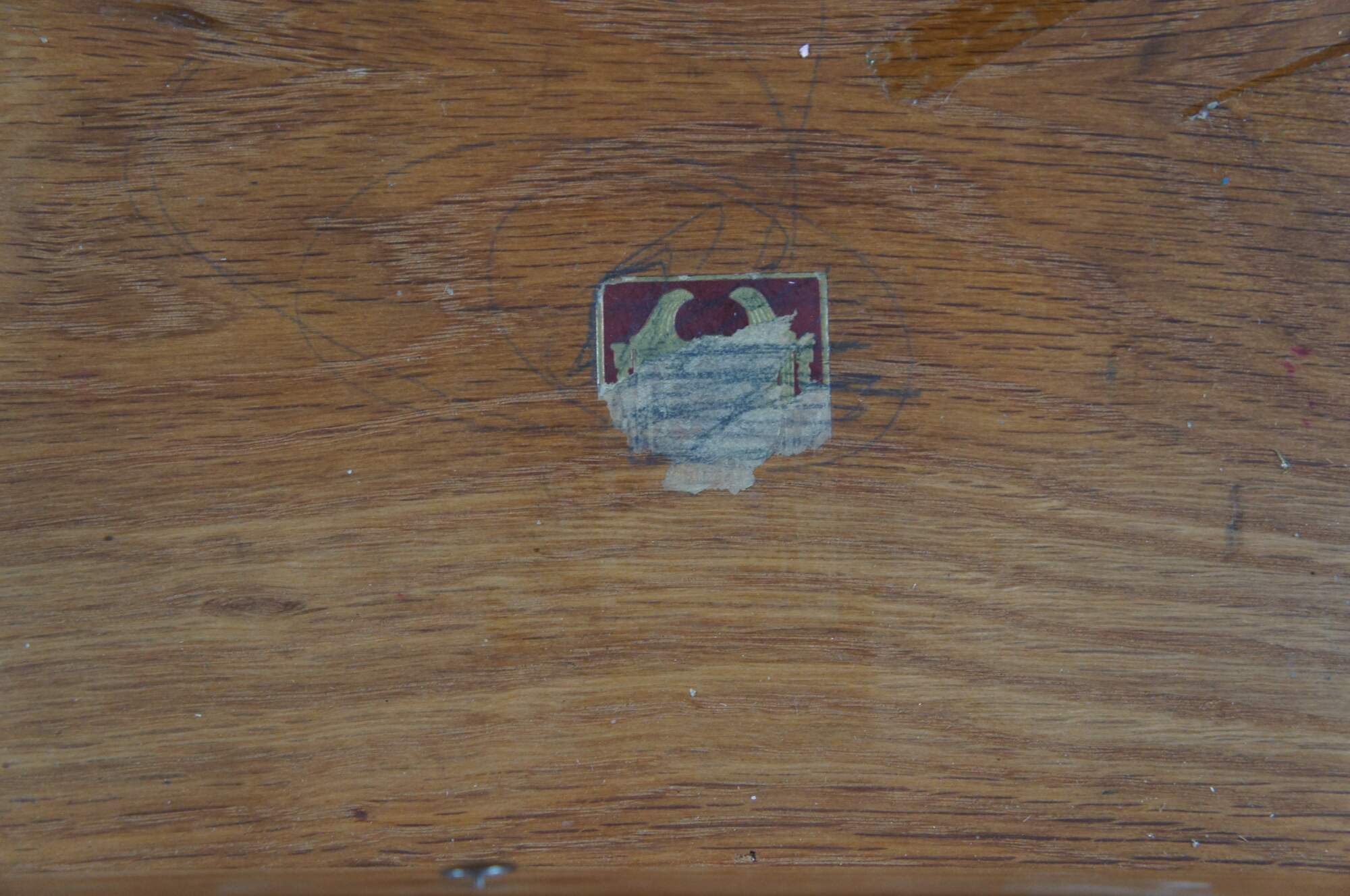 Fair / Distressed, structurally sound. Heavy scratching and marking to the writing surface. Edge wear. Pencil marks inside drawer. The Davis Cabinet Co label is mostly torn.