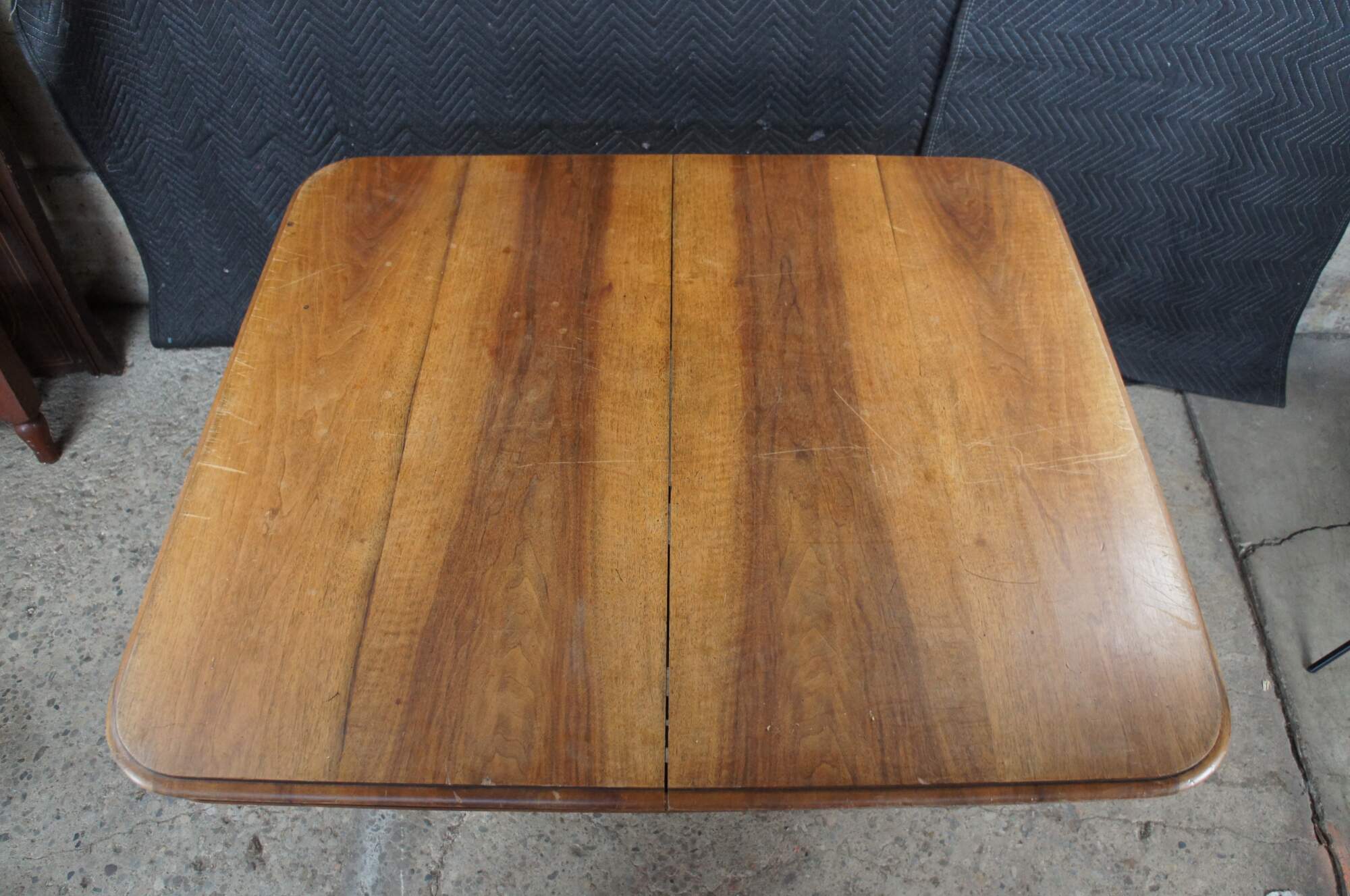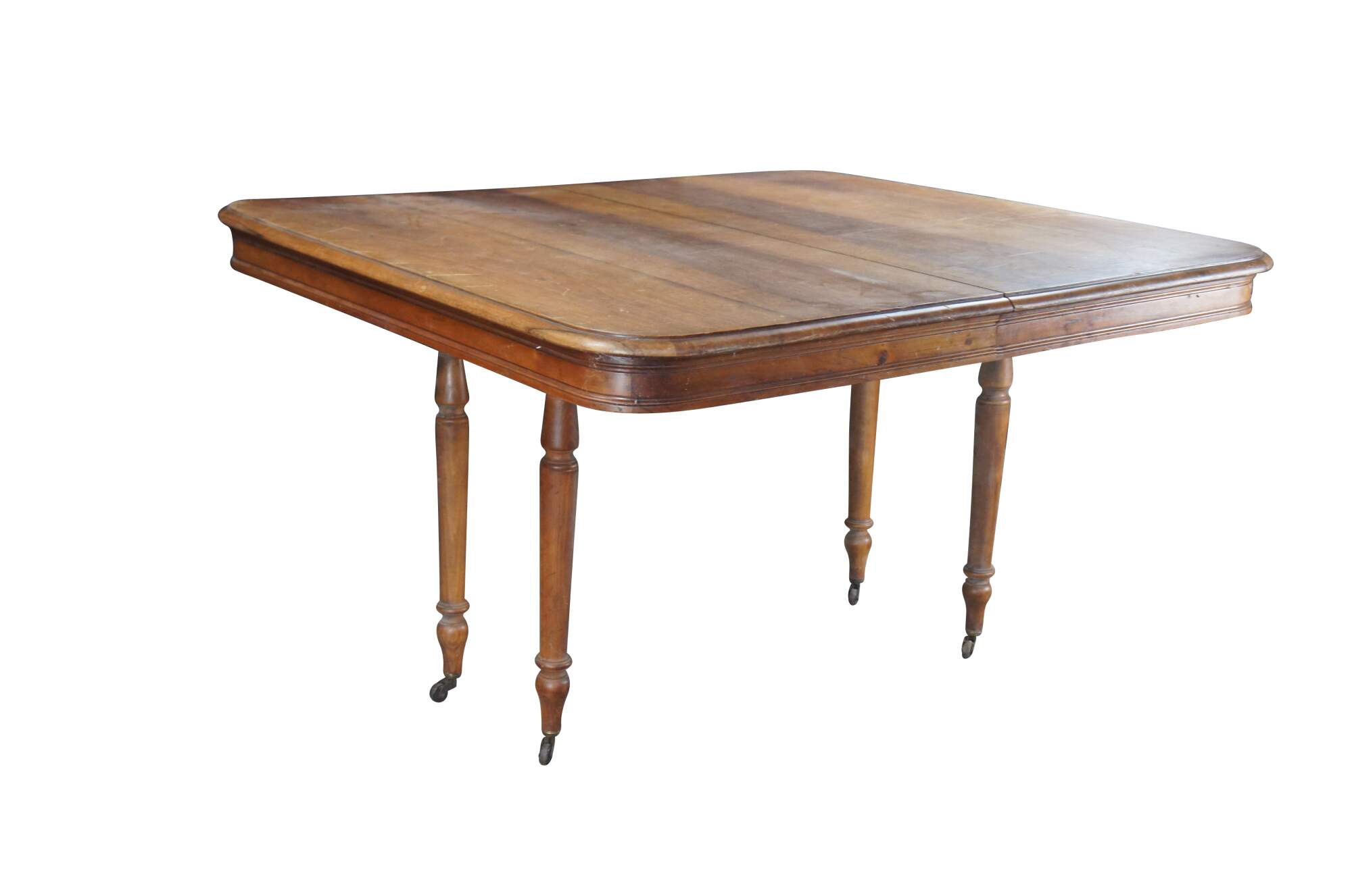 Late Victorian American Walnut Dining Table. Features a rectangular frame with rounded corners over turned legs. The base is foldable allowing the table to be stowed away .