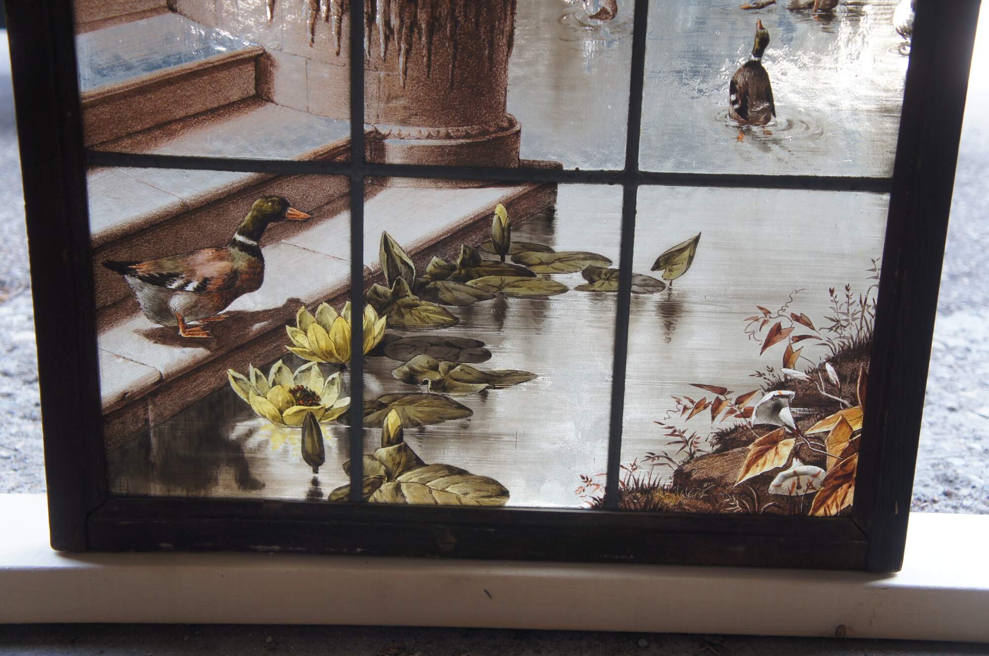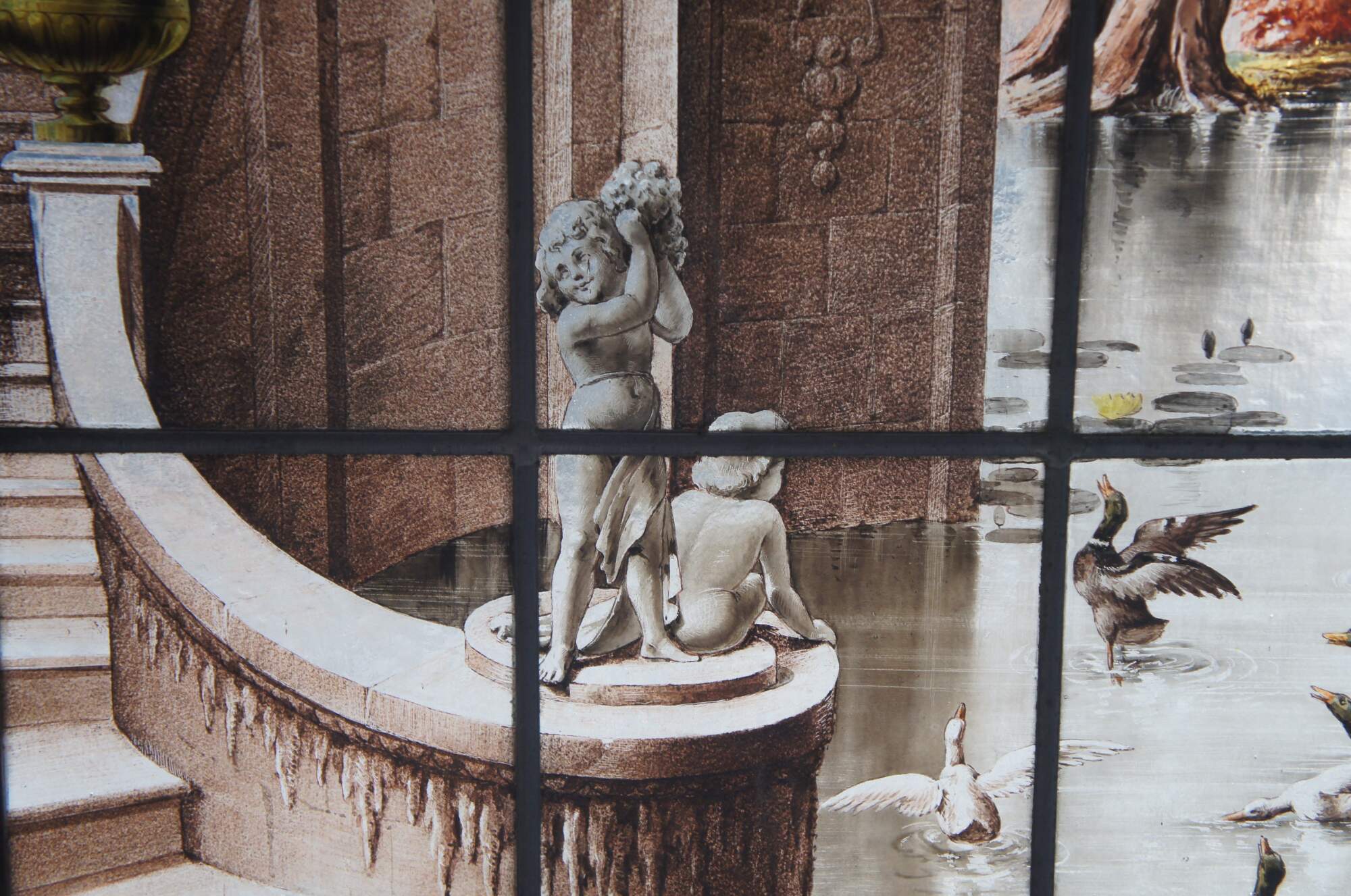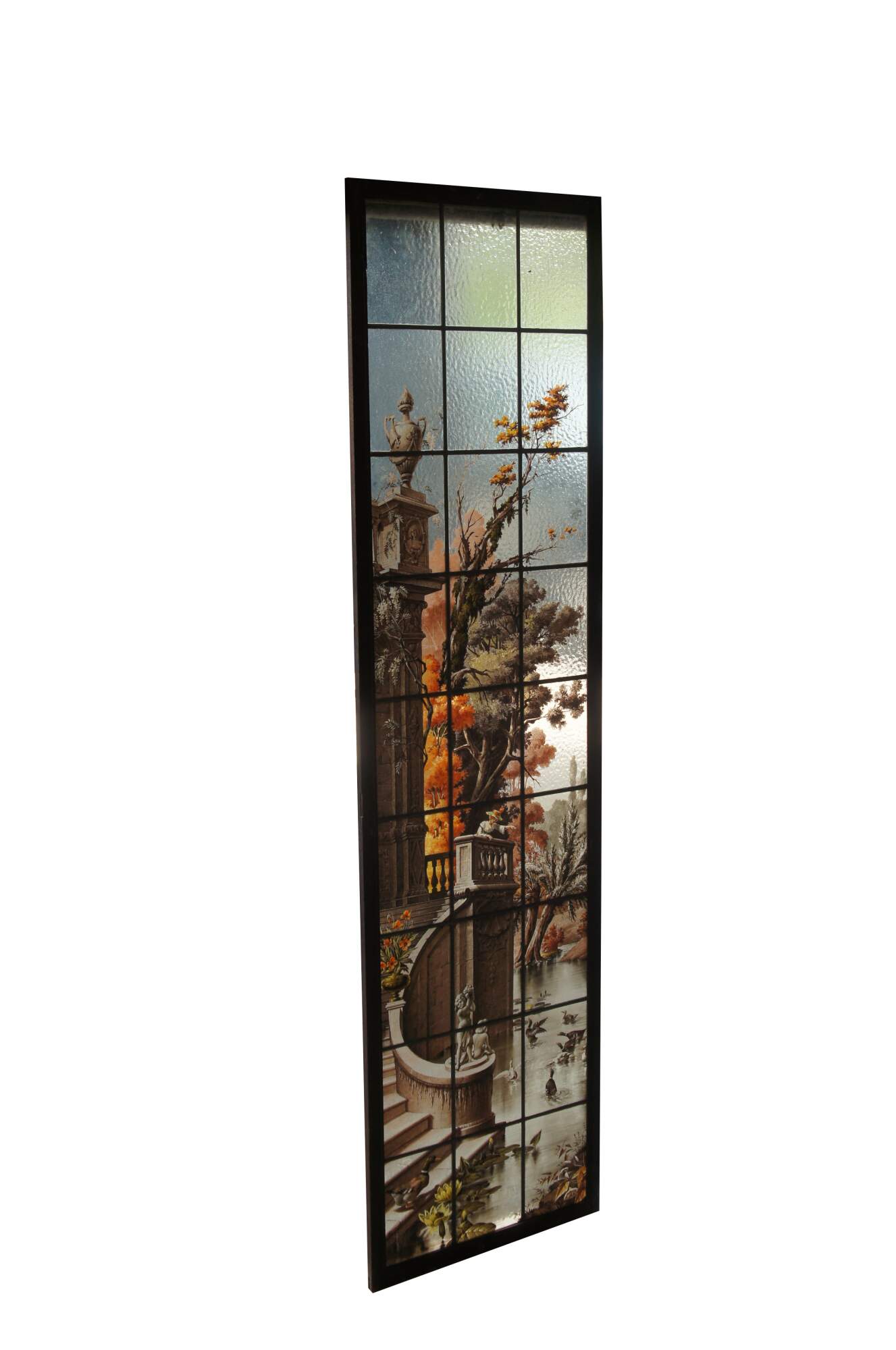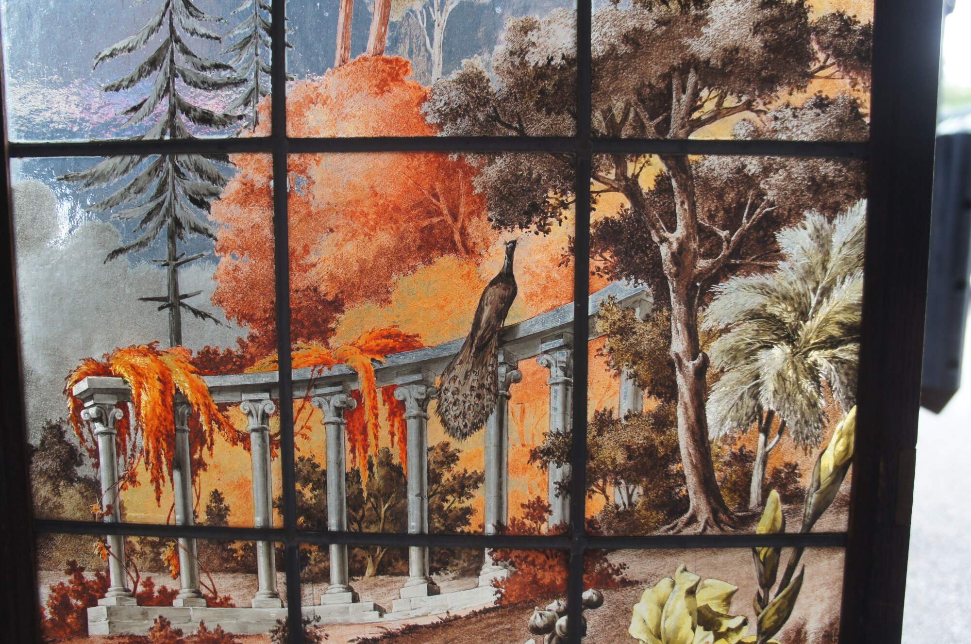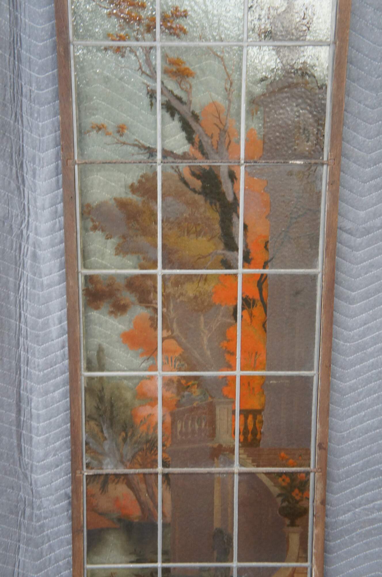 2 Vintage large French painted and fired stained glass windows. Features Neoclassical scenes with flowers, birds and architecture. Signed Couet Paris along lower right side of one.