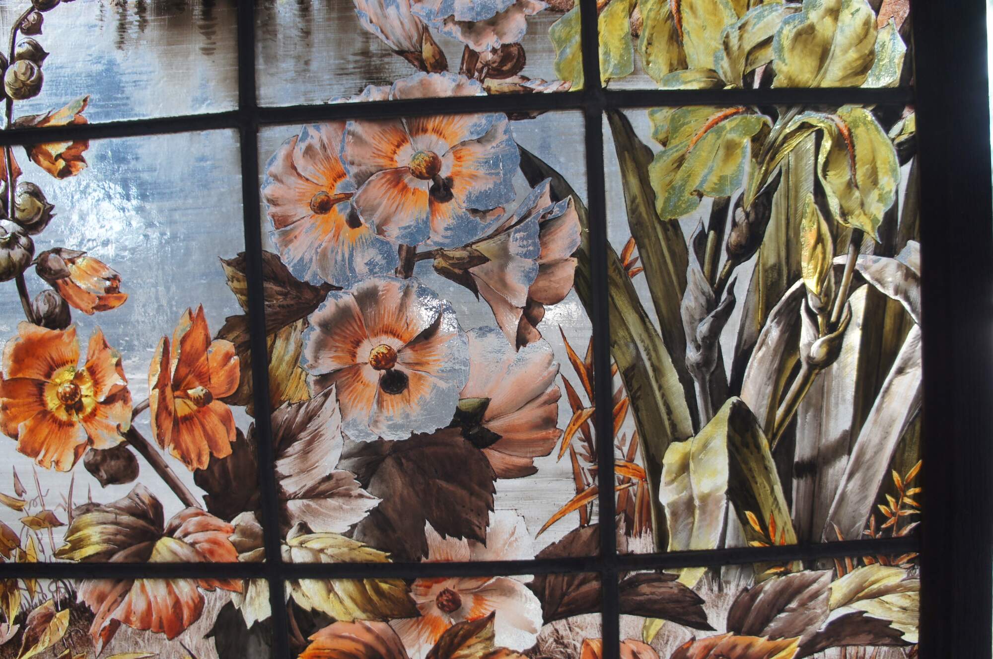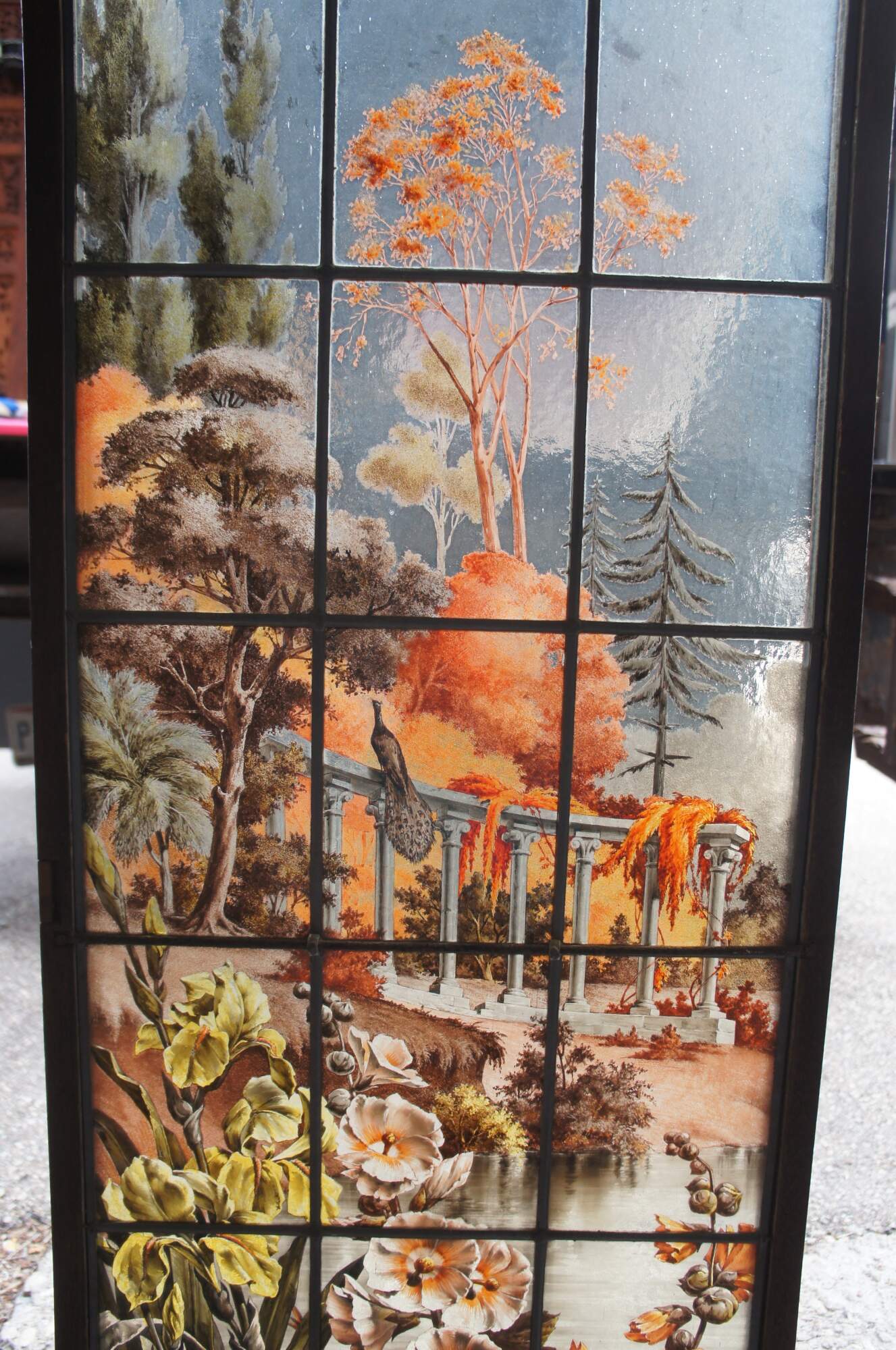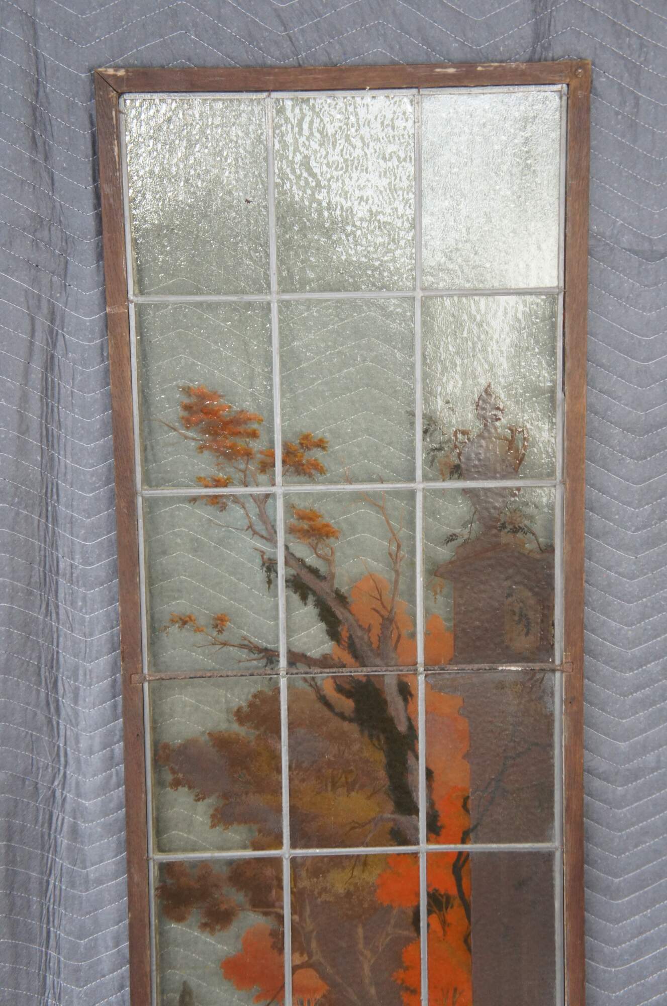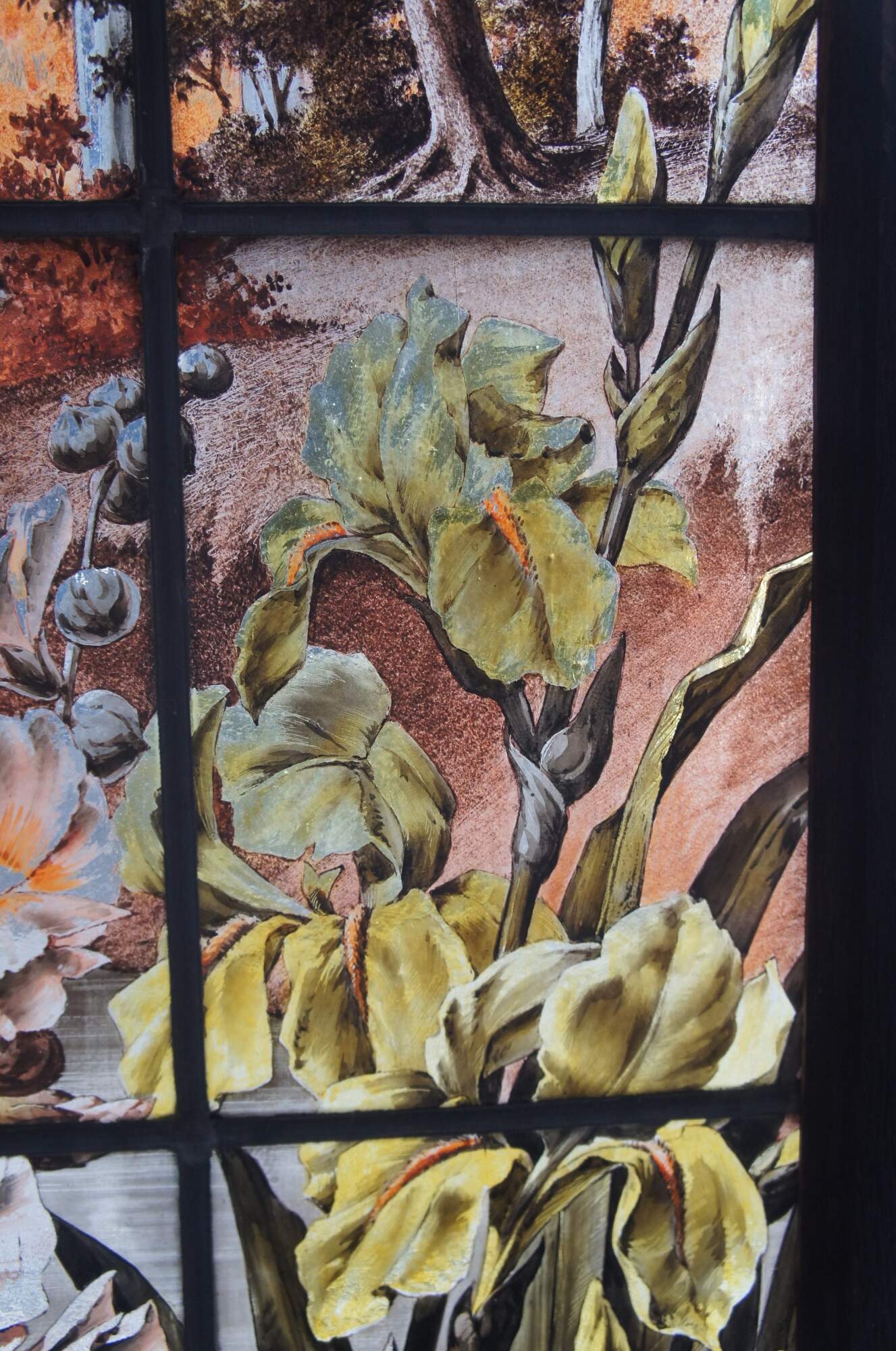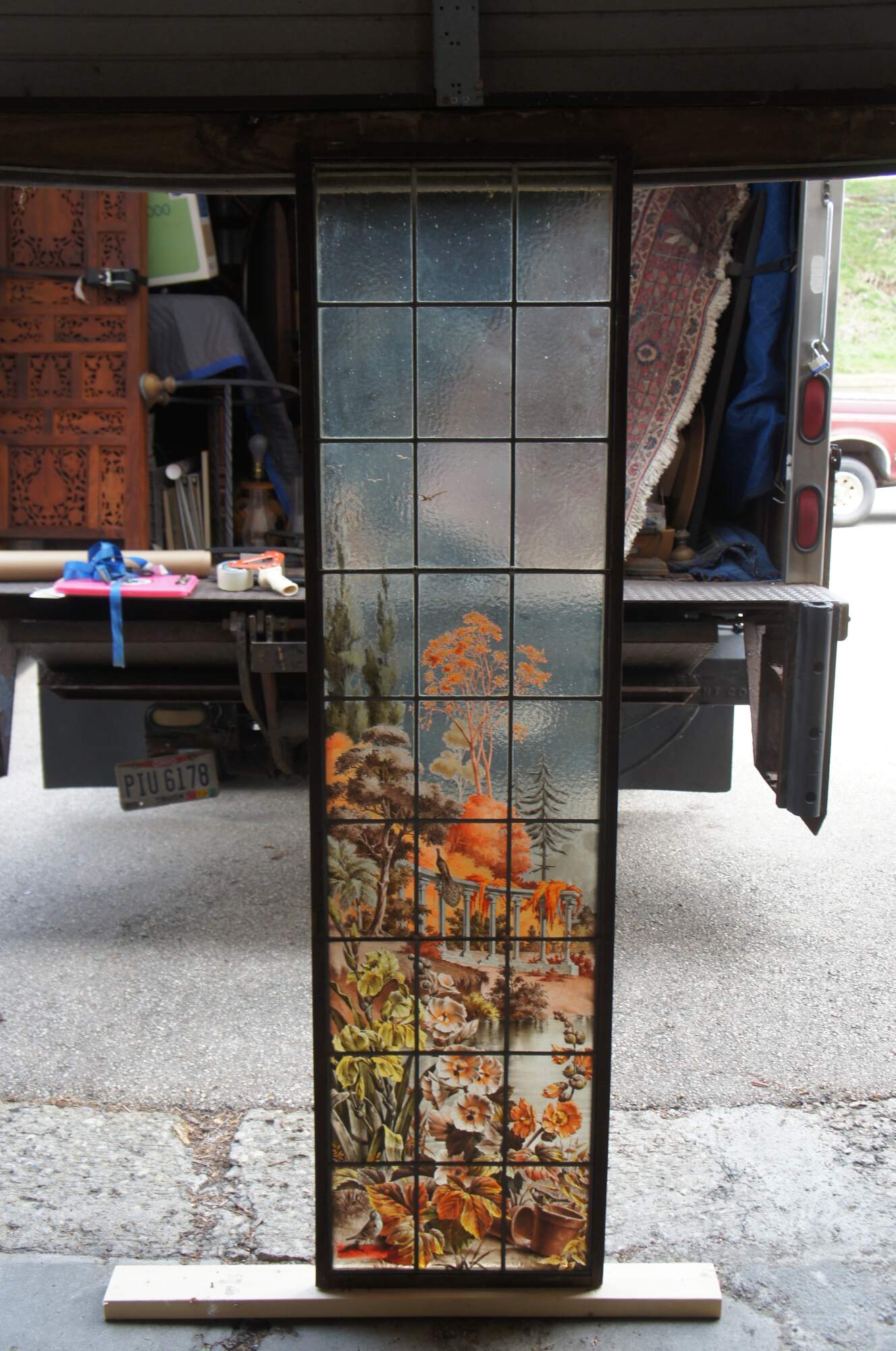 2 Vintage large French painted and fired stained glass windows. Features Neoclassical scenes with flowers, birds and architecture. Signed Couet Paris along lower right side of one.